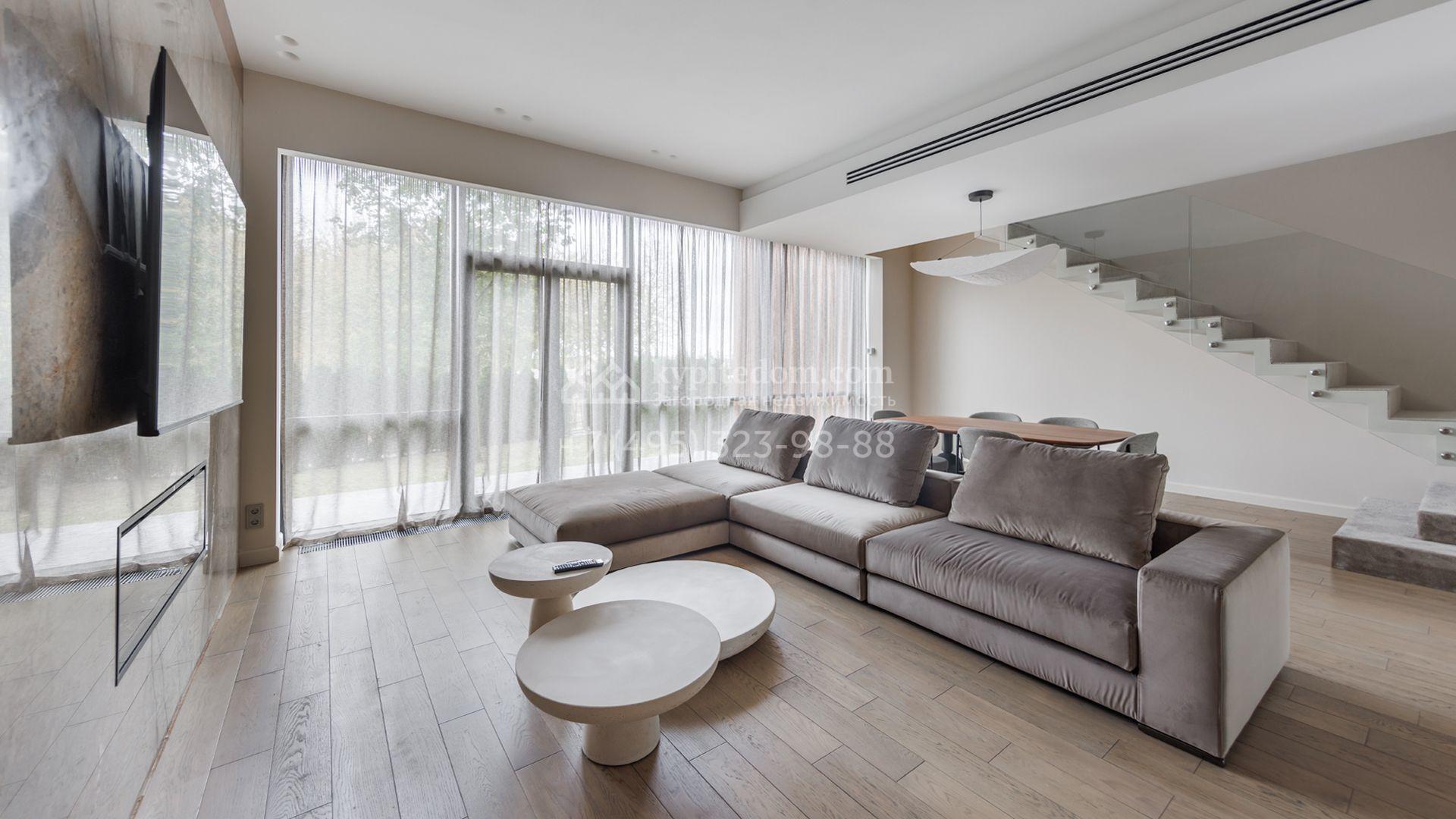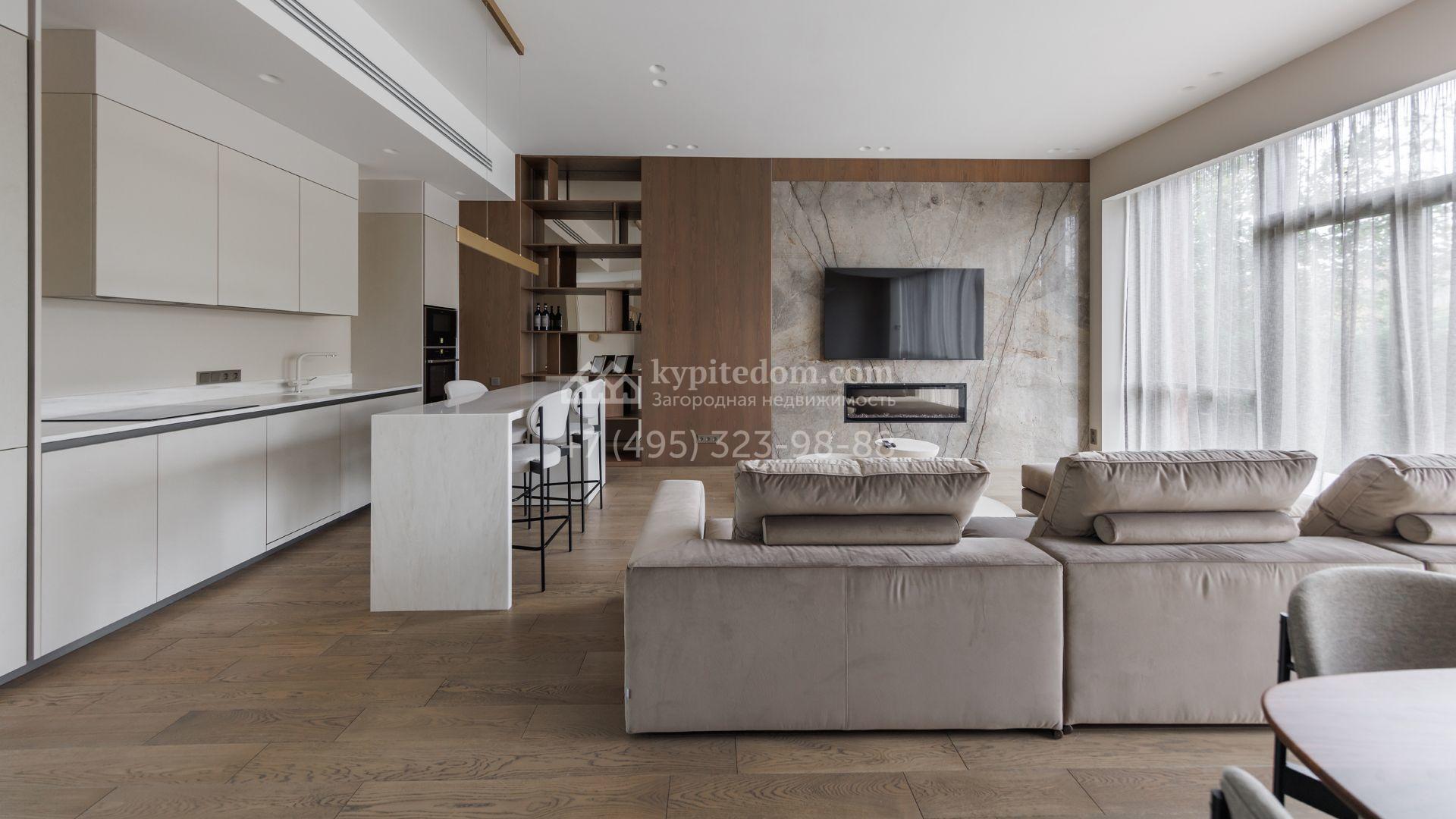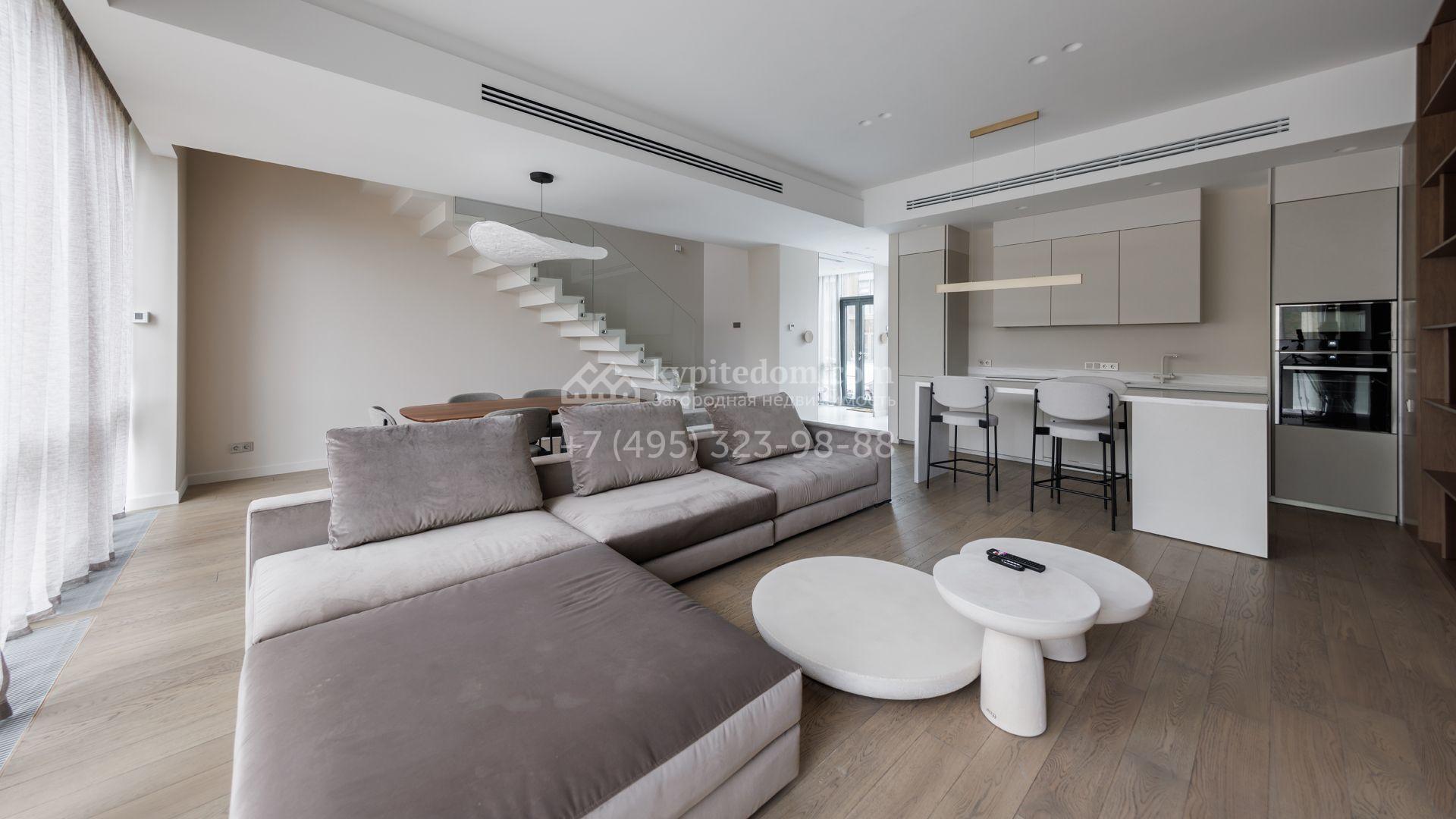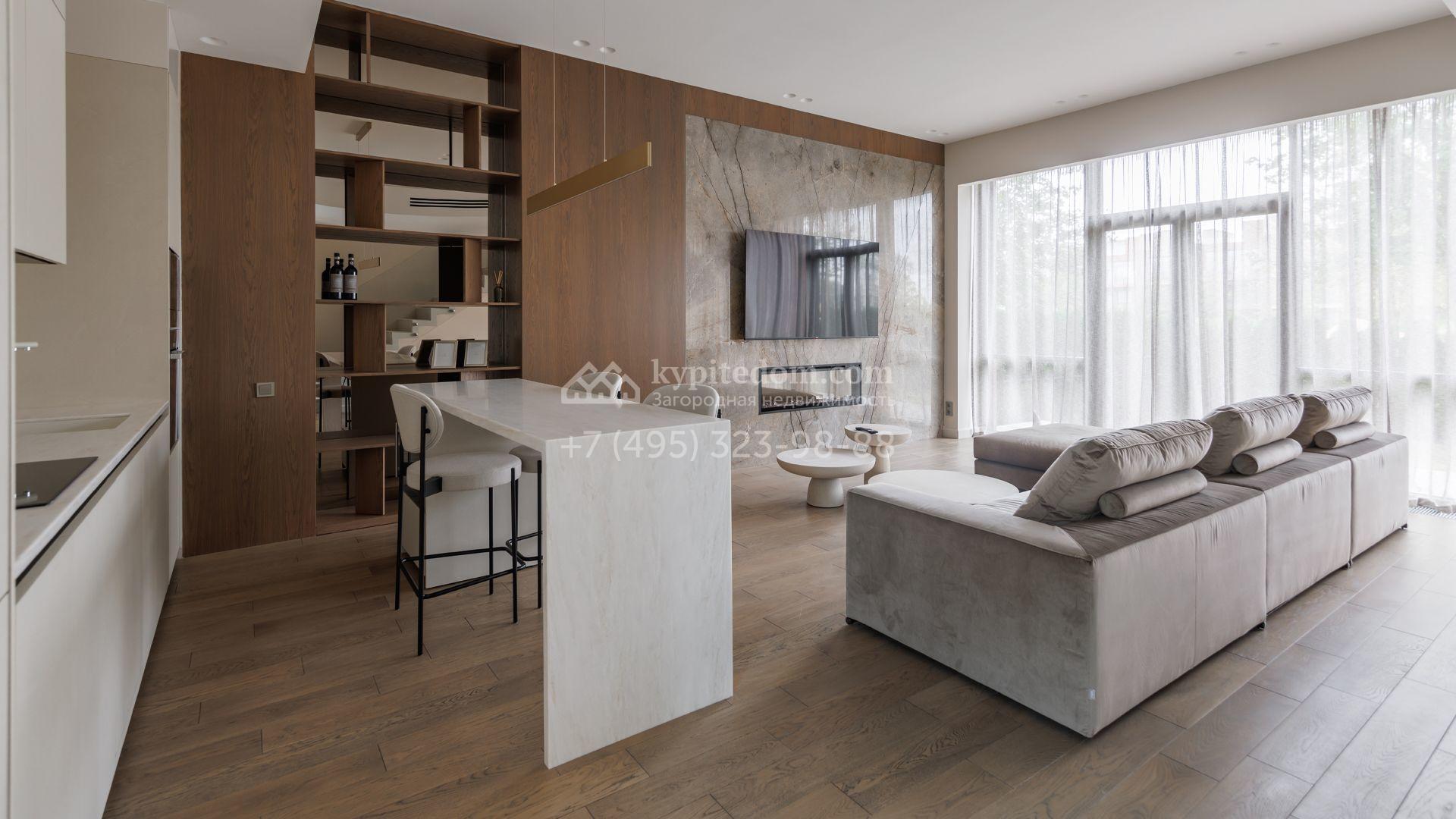 Таунхаус площадью 240 м² расположен в середине секции на участке 3,5 сотки. Современный фасад здания выполнен из австрийских панелей, имитирующих дерево, и изготовлен из высокопрочного пластика. Внутреннее оформление демонстрирует эстетику минимализма и выдержано в светлых нейтральных оттенках. Мебель в серо-кремовых тонах от итальянских брендов органично сочетается с натуральными текстурами дерева и мрамора. Широкоформатные панорамные окна и тщательно продуманные сценарии освещения завершают композицию.