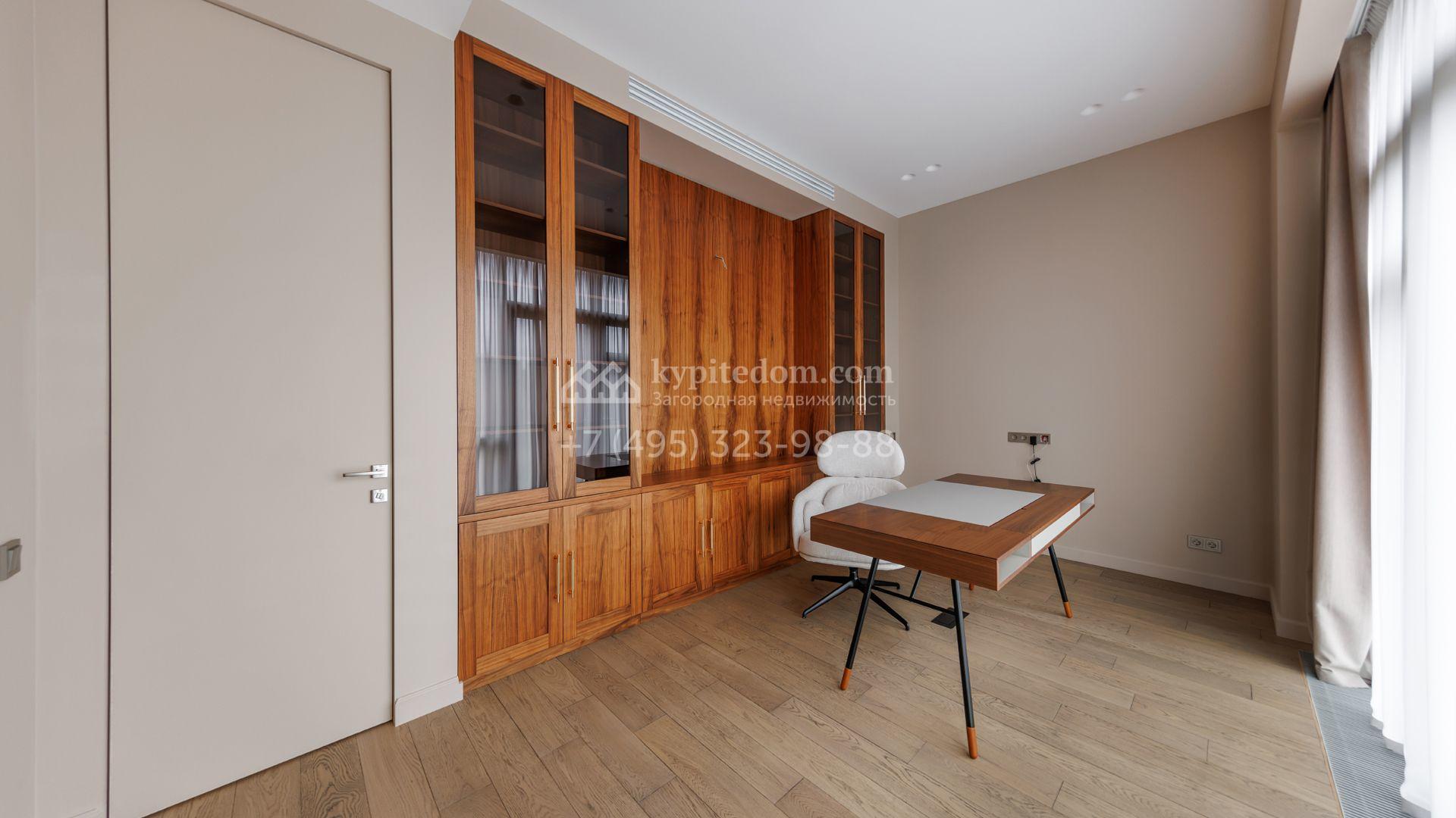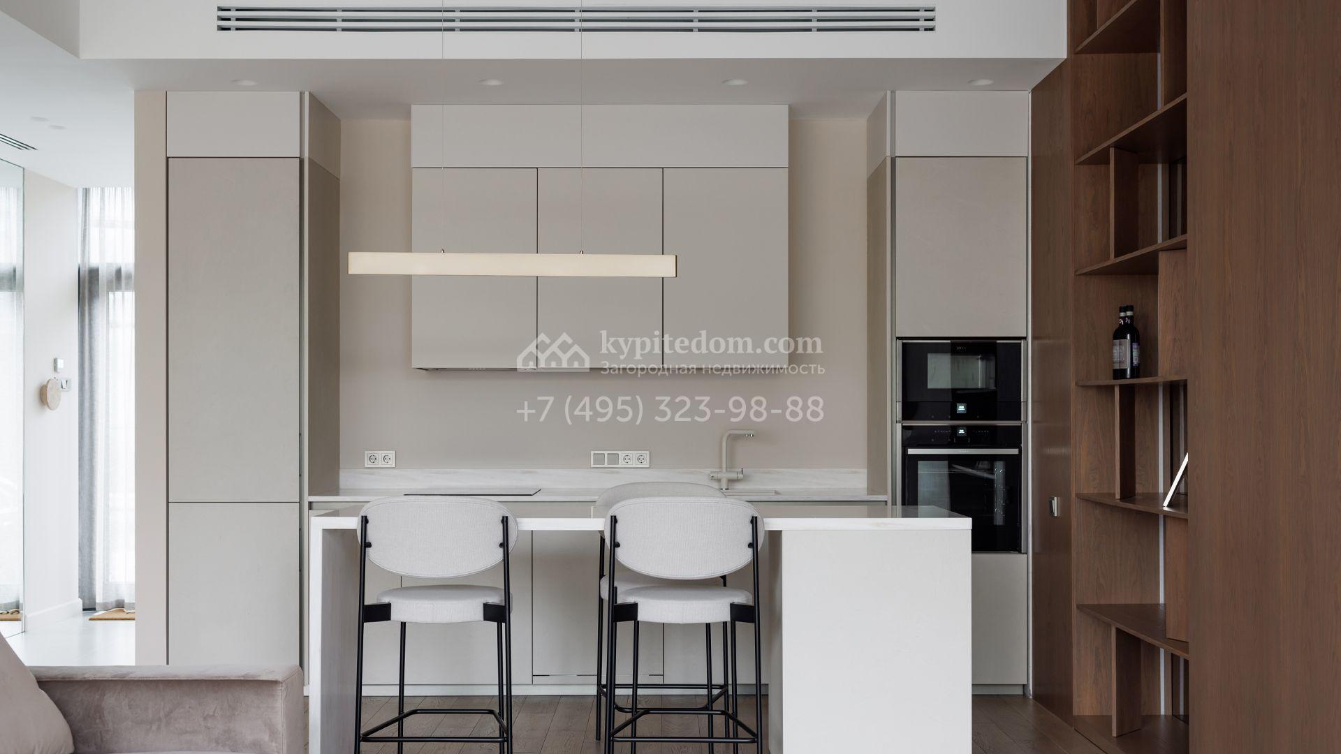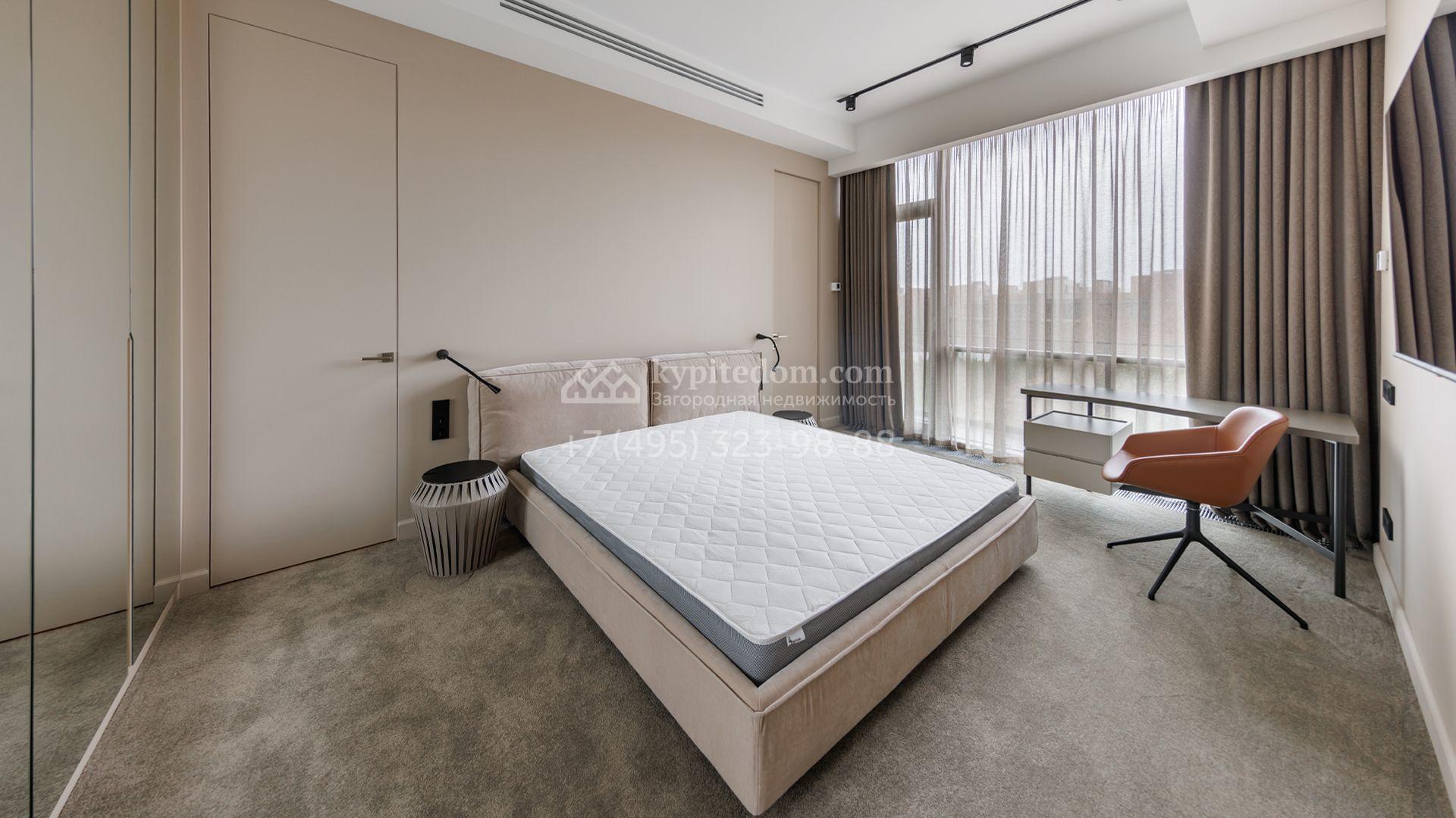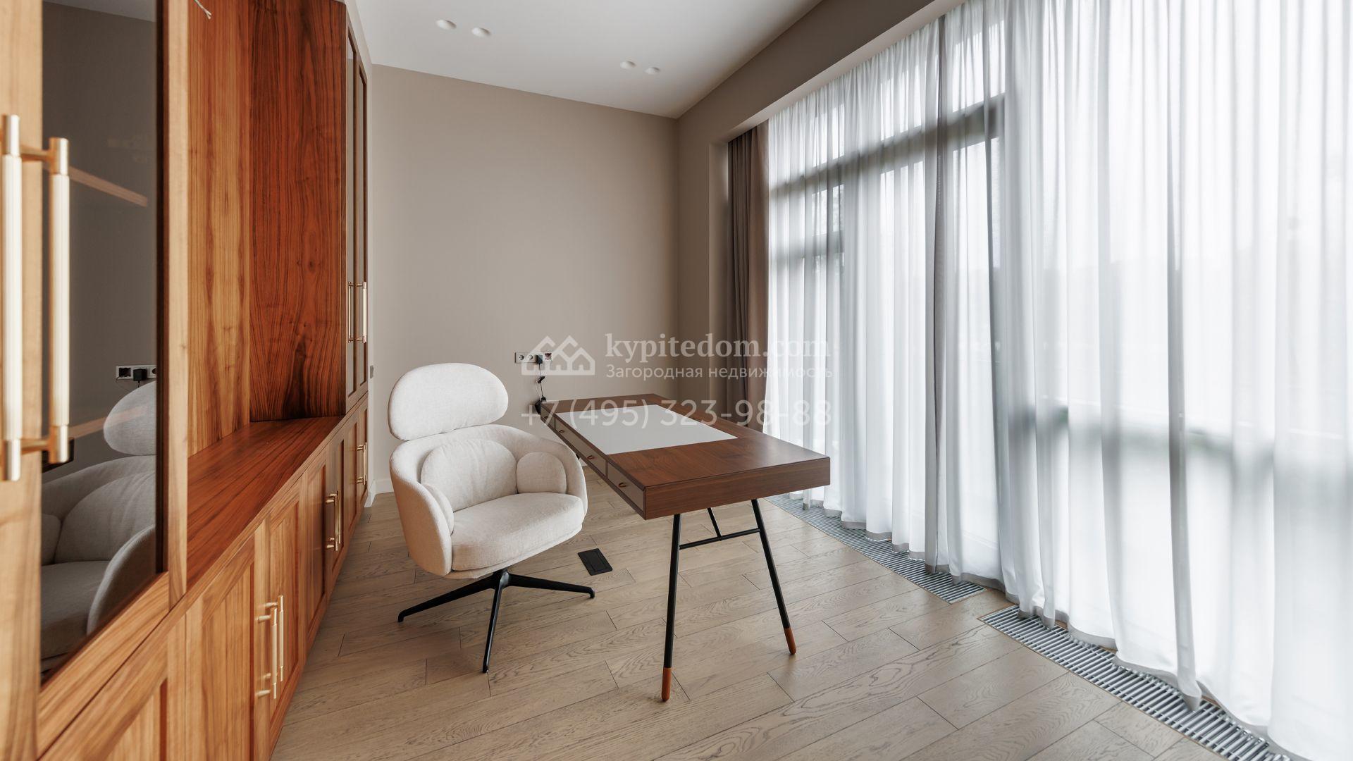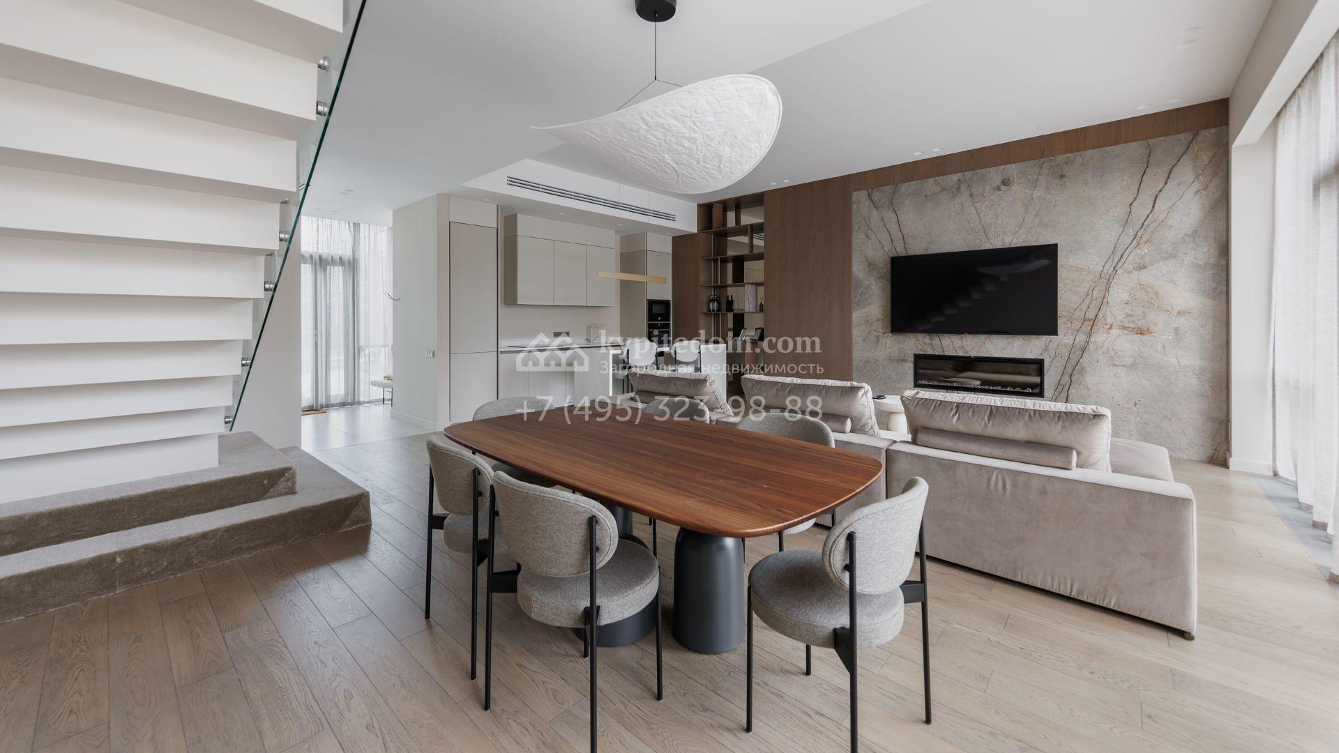 Таунхаус площадью 240 м² расположен в середине секции на участке 3,5 сотки. Современный фасад здания выполнен из австрийских панелей, имитирующих дерево, и изготовлен из высокопрочного пластика. Внутреннее оформление демонстрирует эстетику минимализма и выдержано в светлых нейтральных оттенках. Мебель в серо-кремовых тонах от итальянских брендов органично сочетается с натуральными текстурами дерева и мрамора. Широкоформатные панорамные окна и тщательно продуманные сценарии освещения завершают композицию.