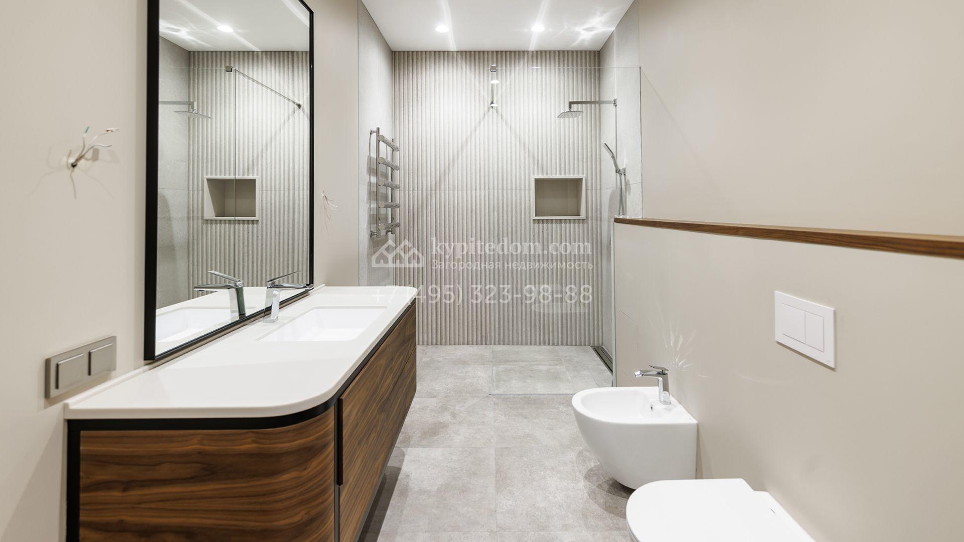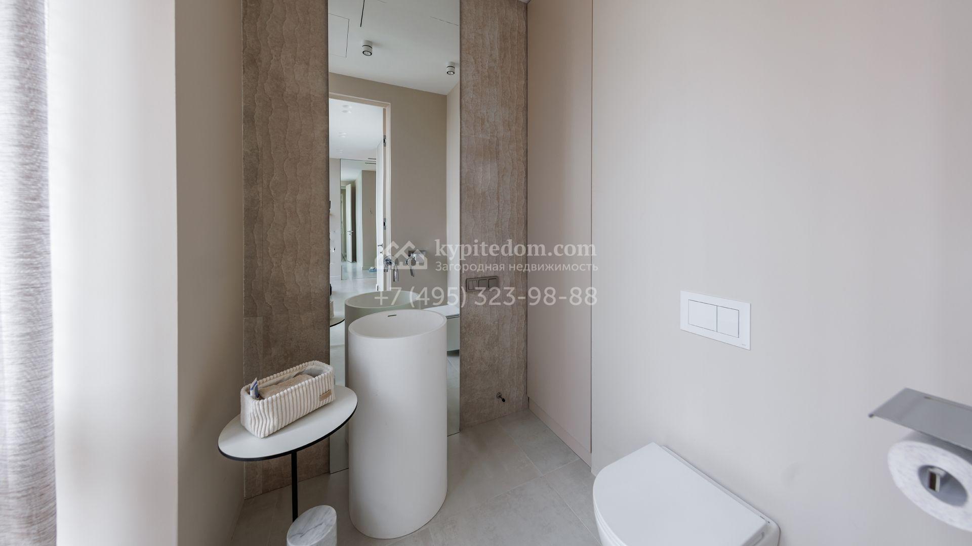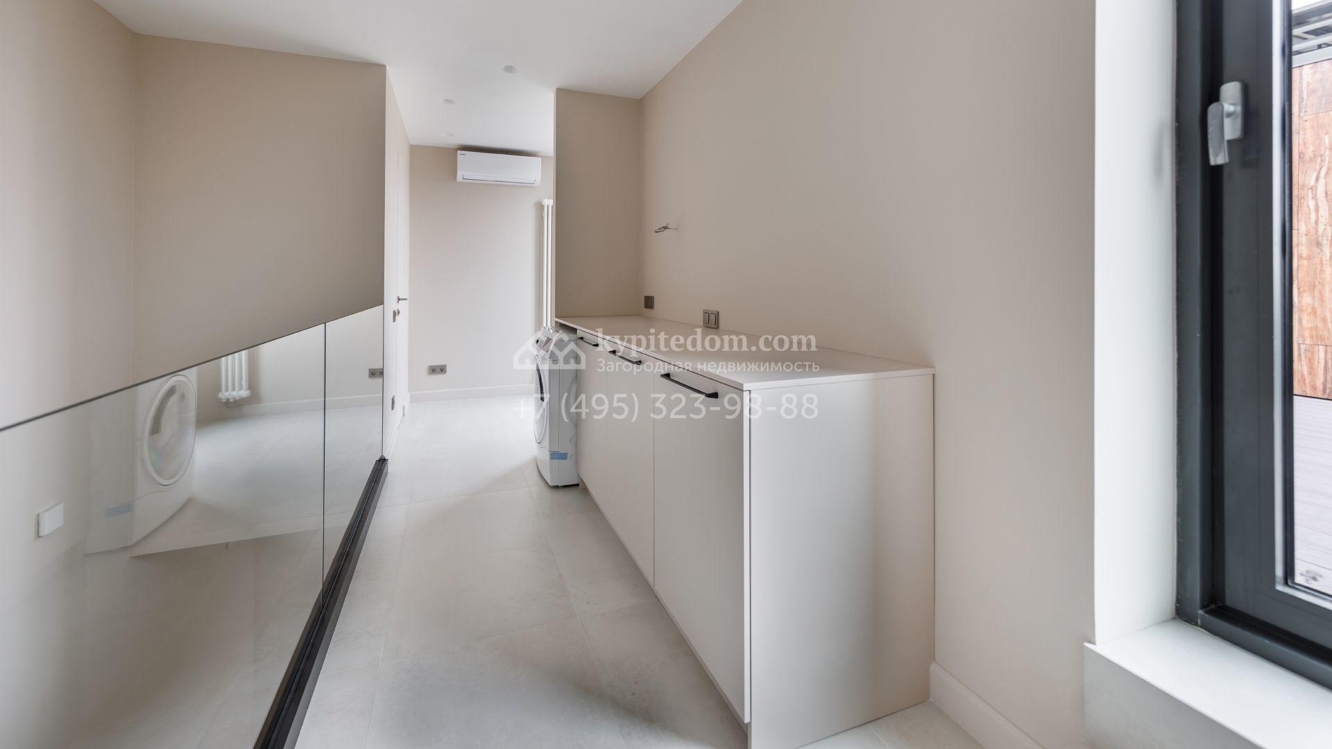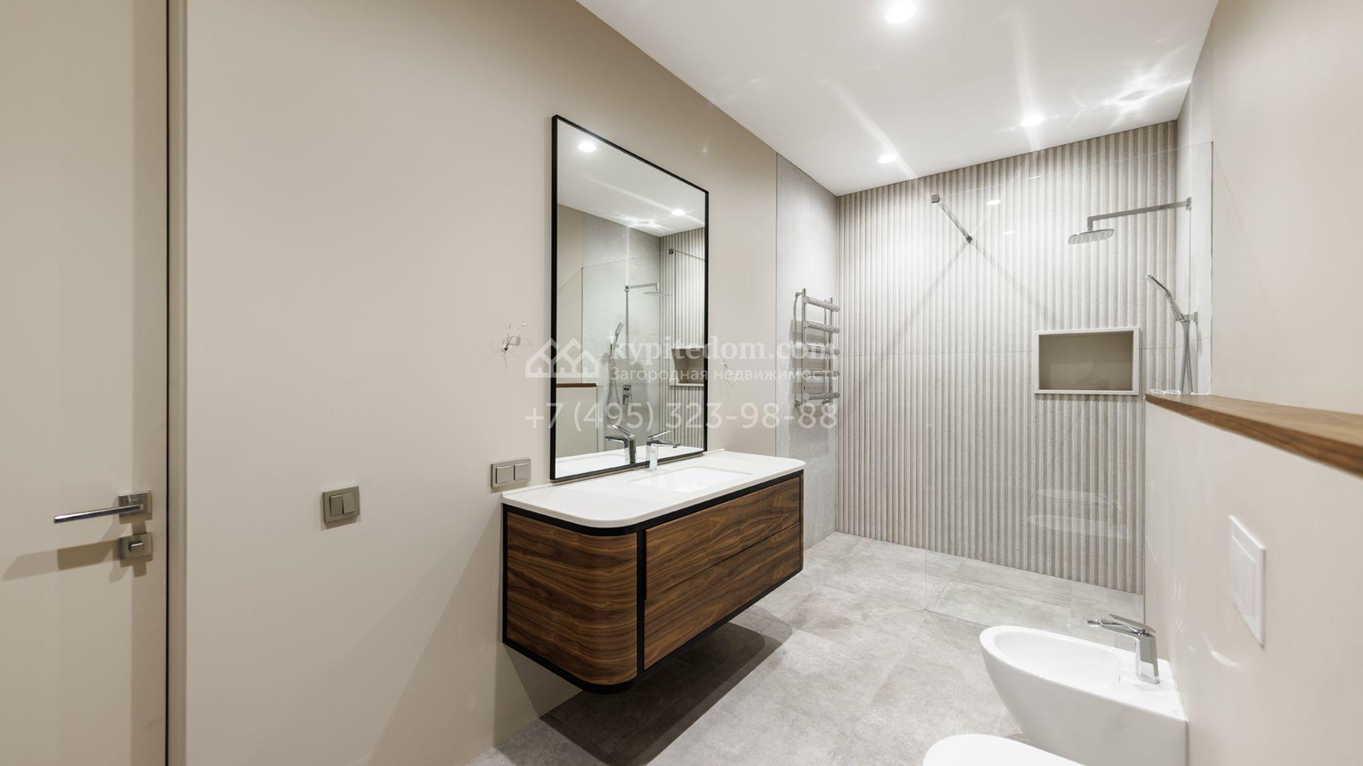 Таунхаус оборудован всей необходимой техникой и сантехникой от известных европейских марок. Также в интерьере присутствуют дизайнерские люстры, трековые и настенные светильники от итальянских брендов. Планировка включает 3 спальни, кабинет и кухню-гостиную с камином и террасой. Вокруг участка высажены туи, создавая уютное и уединенное место для отдыха с зоной для барбекю.