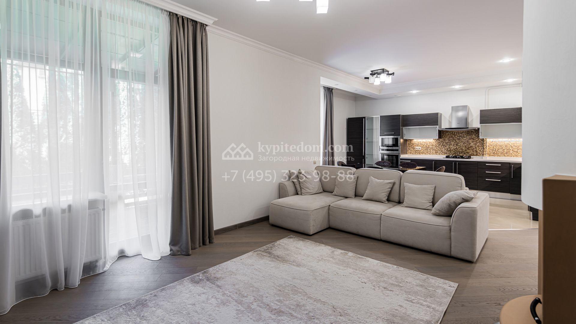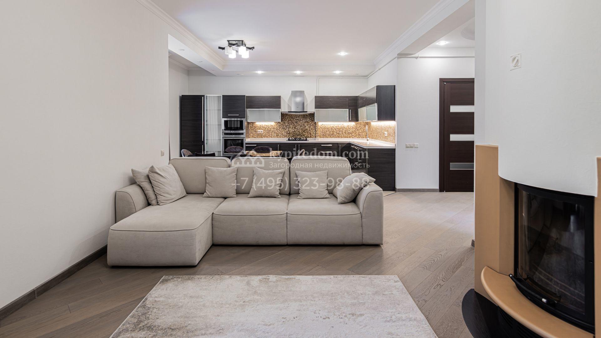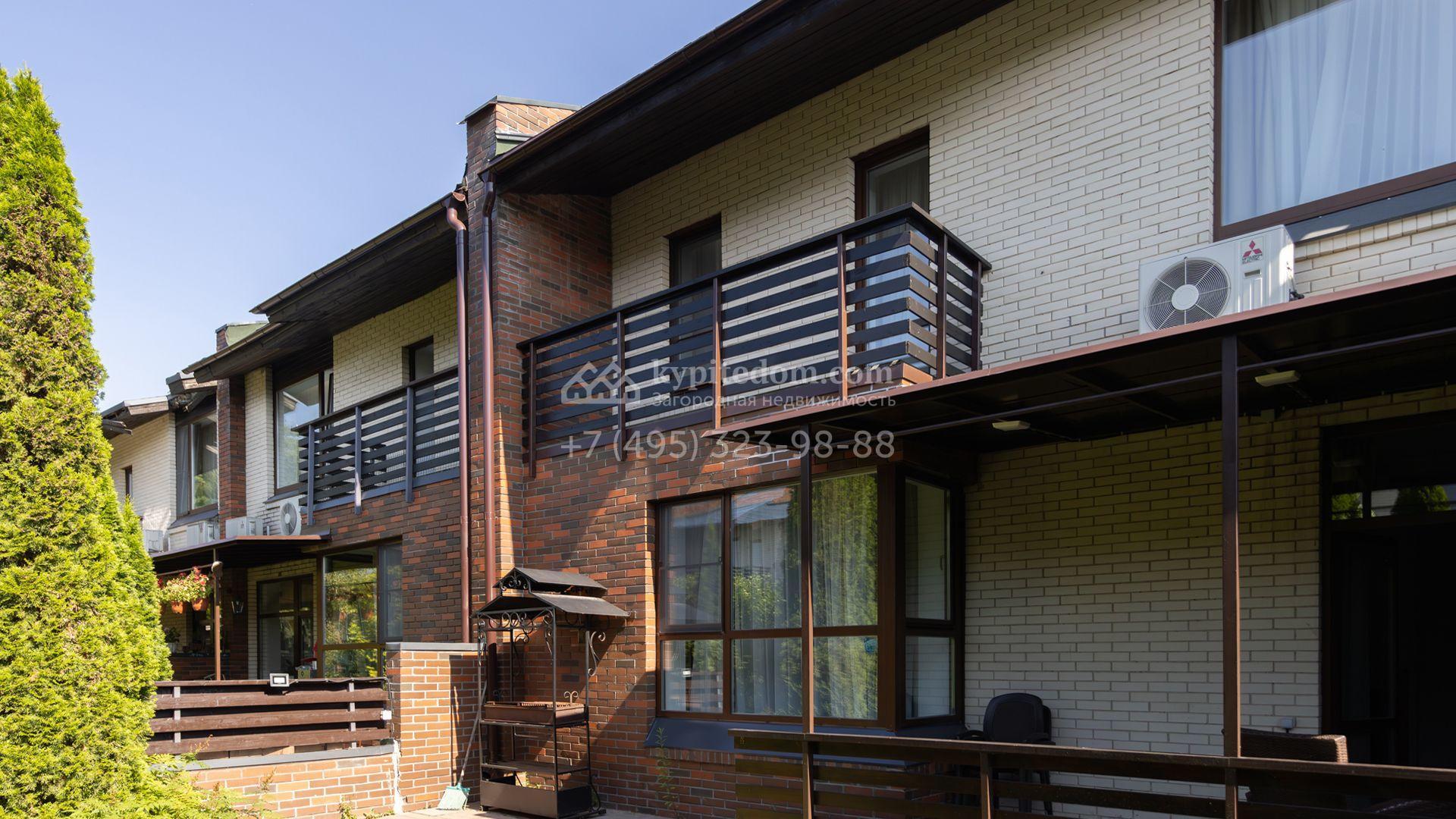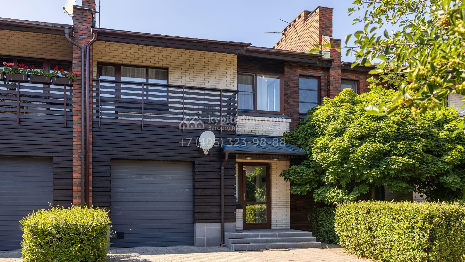 Таунхаус площадью 200 м² расположен на полевом участке 2 сотки. Фасад в современном стиле облицован клинкерным кирпичом разных оттенков. В отделке светлого интерьера использованы теплые оттенки, сощдающие атмосферу уюта. Дом укомплектован мягкой мебелью. Планировка резиденции включает 3 спальни, гостиную с камином, 3 санузла, кухню-столовую, оборудованную необходимой встроенной техникой, гардеробную, 2 балкона и террасу с местом для барбекю. В контуре таунхауса предусмотрен гараж на 1 машину, перед домом паркинг на 2 машины.