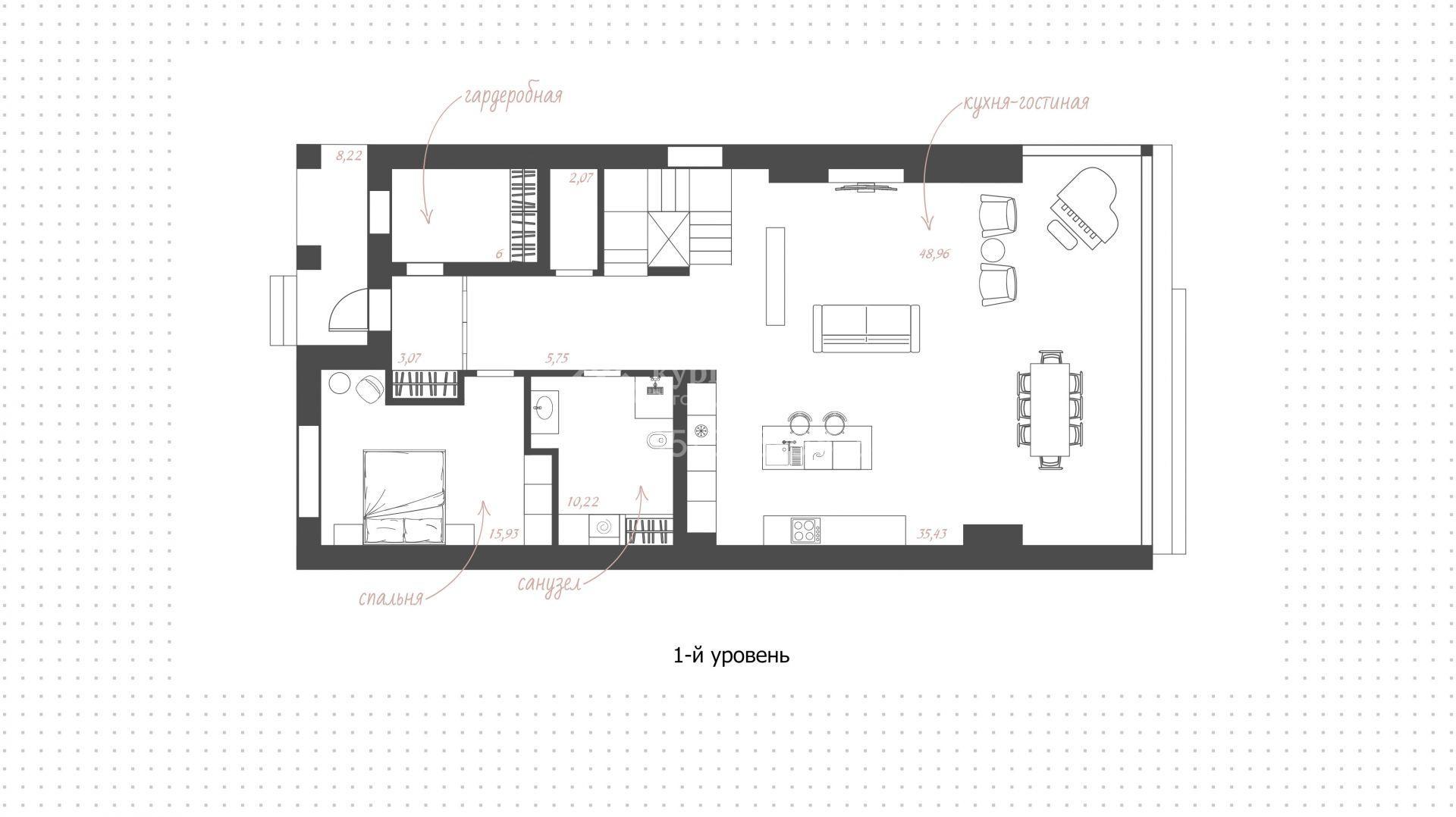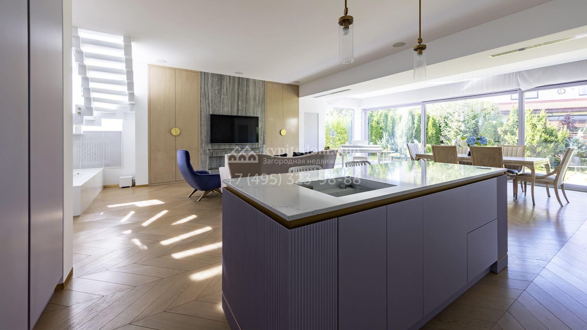 Сердцем дома стала просторная гостиная с камином, объединённая единым пространством с кухней-столовой с удобным островом. Кроме того, планировка включает 3 уютные спальни и вместительные гардеробные. Оставить машину можно на открытой парковке. На приватном участке засеян аккуратный газон, вымощены дорожки, высажены деревья, кустарники и цветы, а благодаря уличной подсветке вечерние посиделки у зоны отдыха станут еще более романтичными.