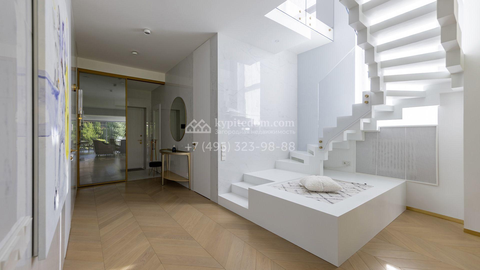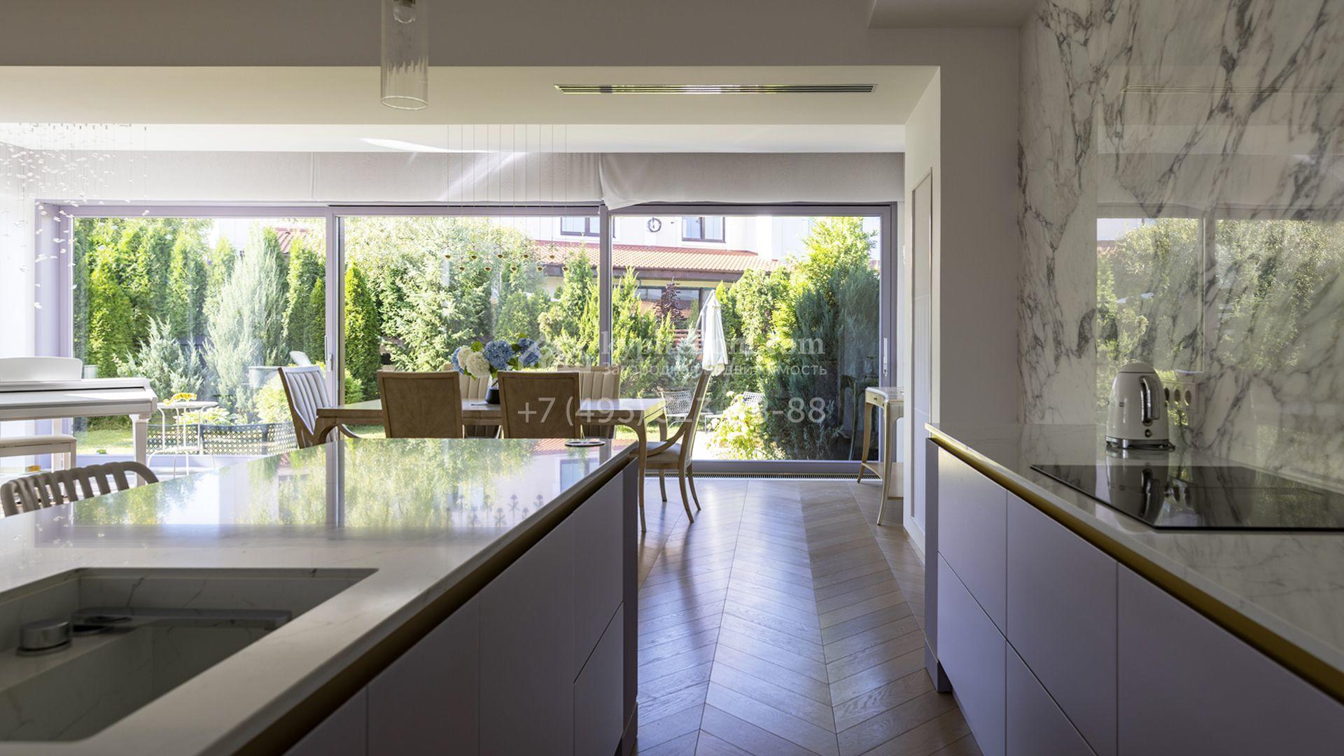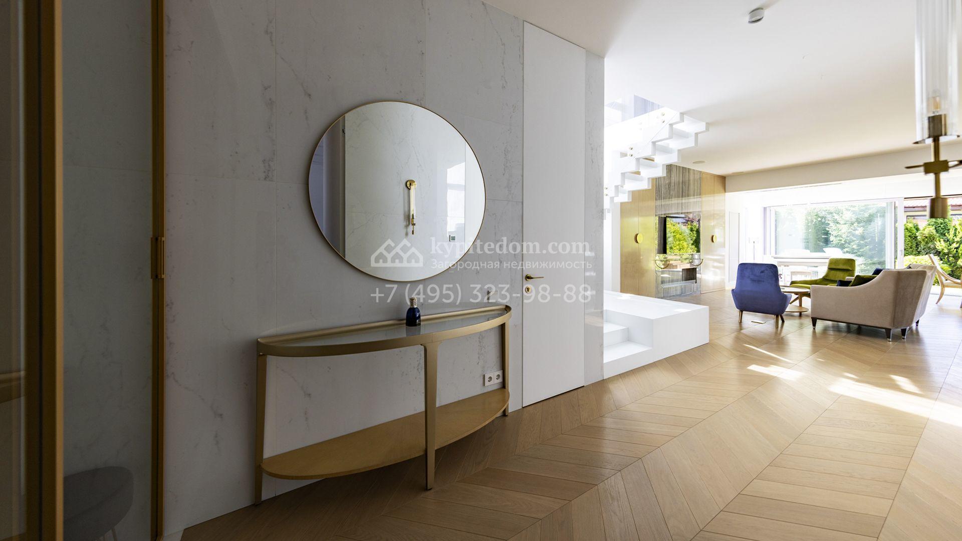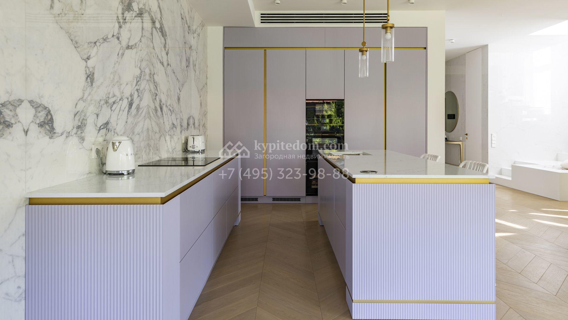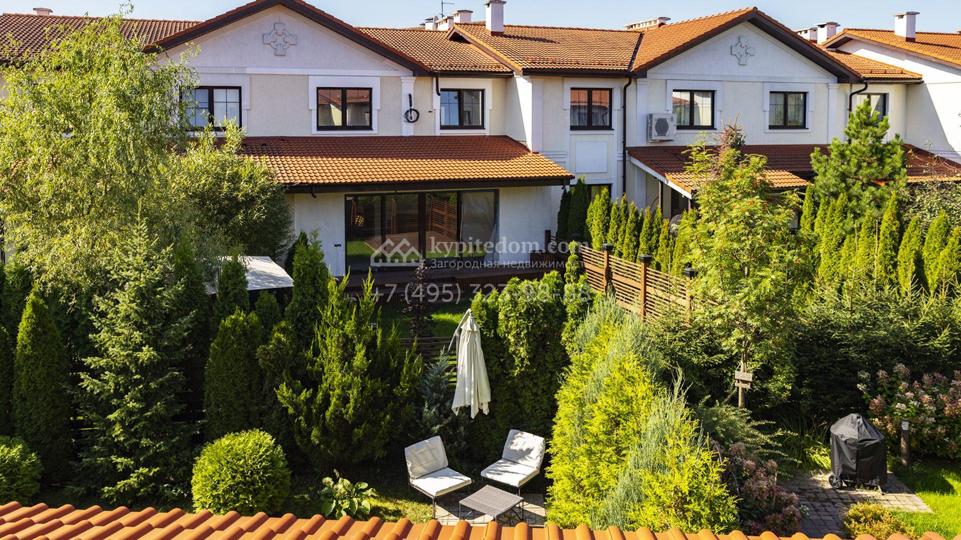 Загородный таунхаус площадью 230 м² расположен на полевом участке 4 сотки. Фасад, выполненный в европейском стиле, облицован кремовой штукатуркой и благородным красным клинкерным кирпичом, а также украшен элегантными рустовкой, пилястрами и лепниной. Современные интерьеры выдержаны в светлых тонах и гармонично сочетают фактуры камня и дерева. Комфортная мебель, встроенная бытовая техника, изящные люстры и тщательно подобранные предметы декора дополняют образ. Для идеального микроклимата установлена система кондиционирования.