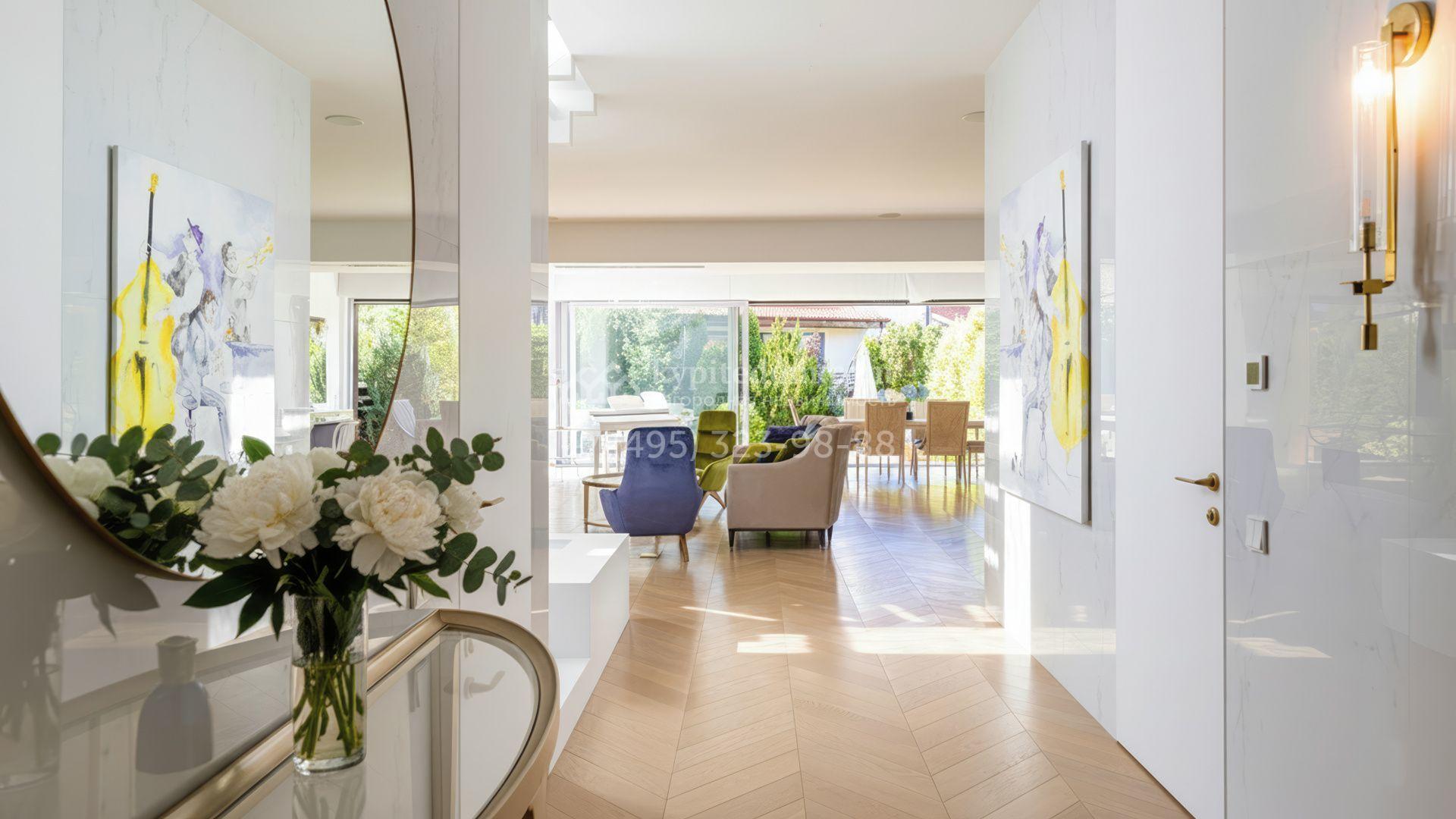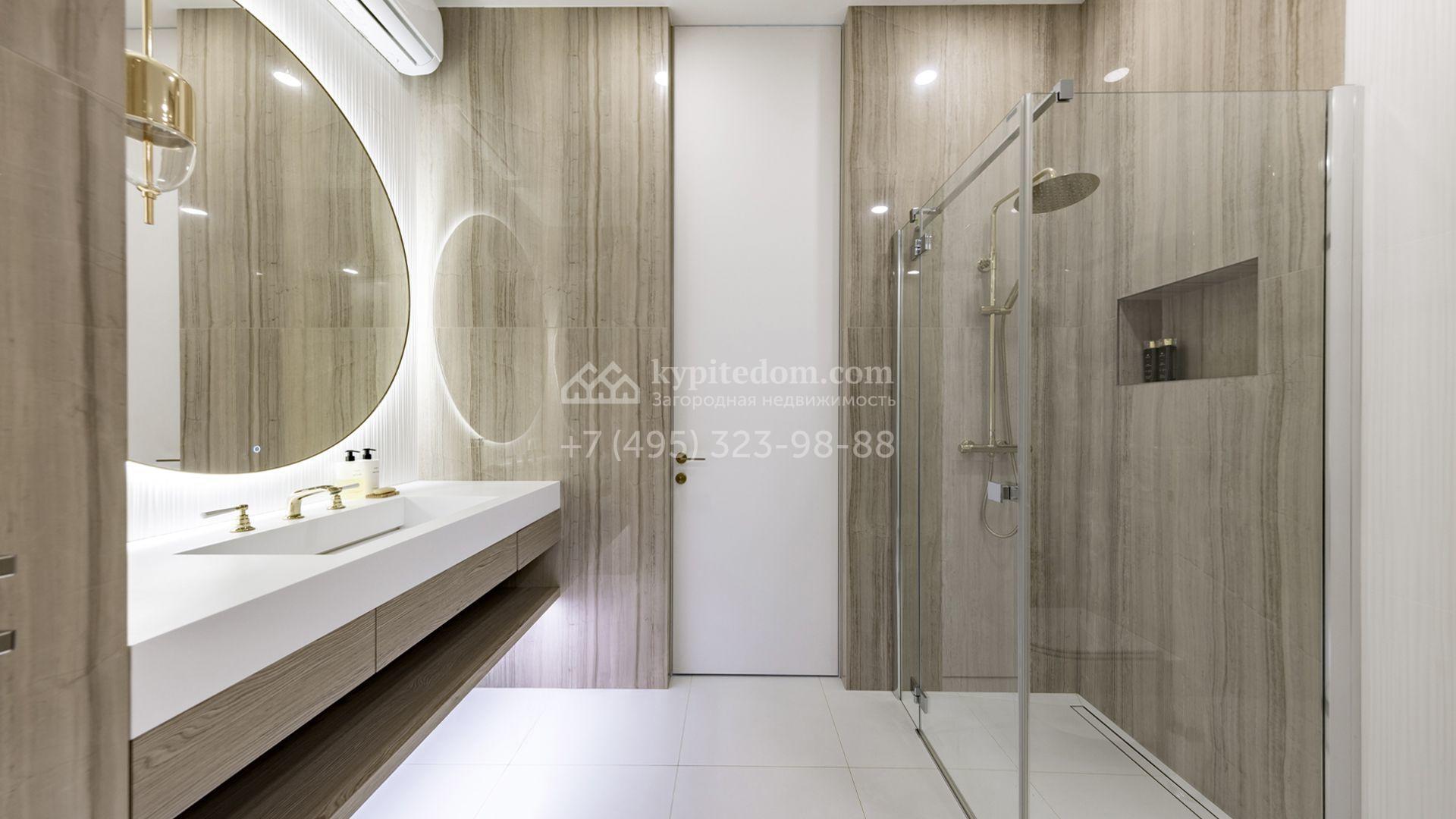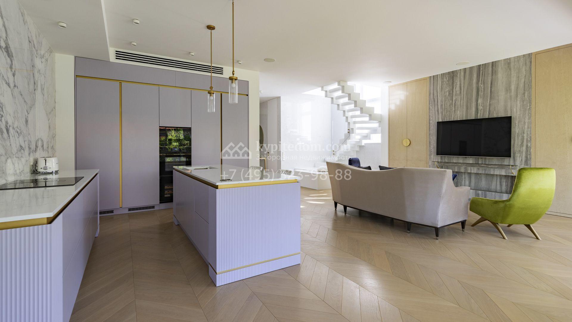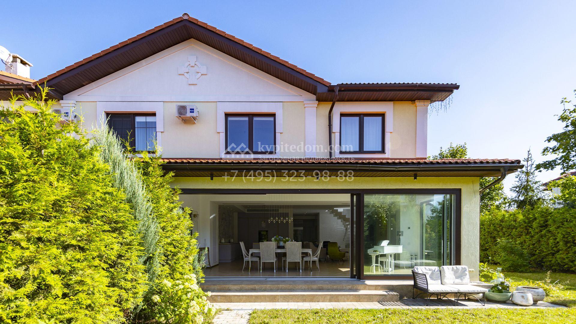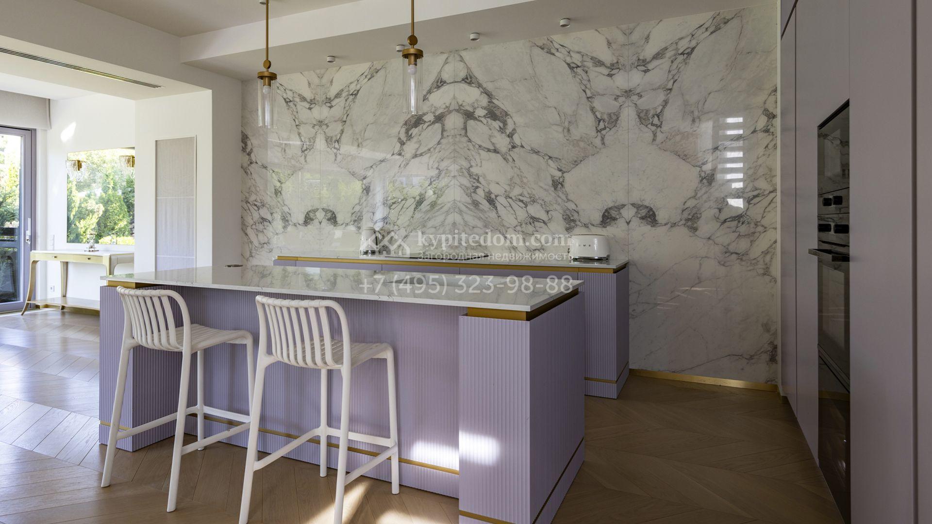 Загородный таунхаус площадью 230 м² расположен на полевом участке 4 сотки. Фасад, выполненный в европейском стиле, облицован кремовой штукатуркой и благородным красным клинкерным кирпичом, а также украшен элегантными рустовкой, пилястрами и лепниной. Современные интерьеры выдержаны в светлых тонах и гармонично сочетают фактуры камня и дерева. Комфортная мебель, встроенная бытовая техника, изящные люстры и тщательно подобранные предметы декора дополняют образ. Для идеального микроклимата установлена система кондиционирования.