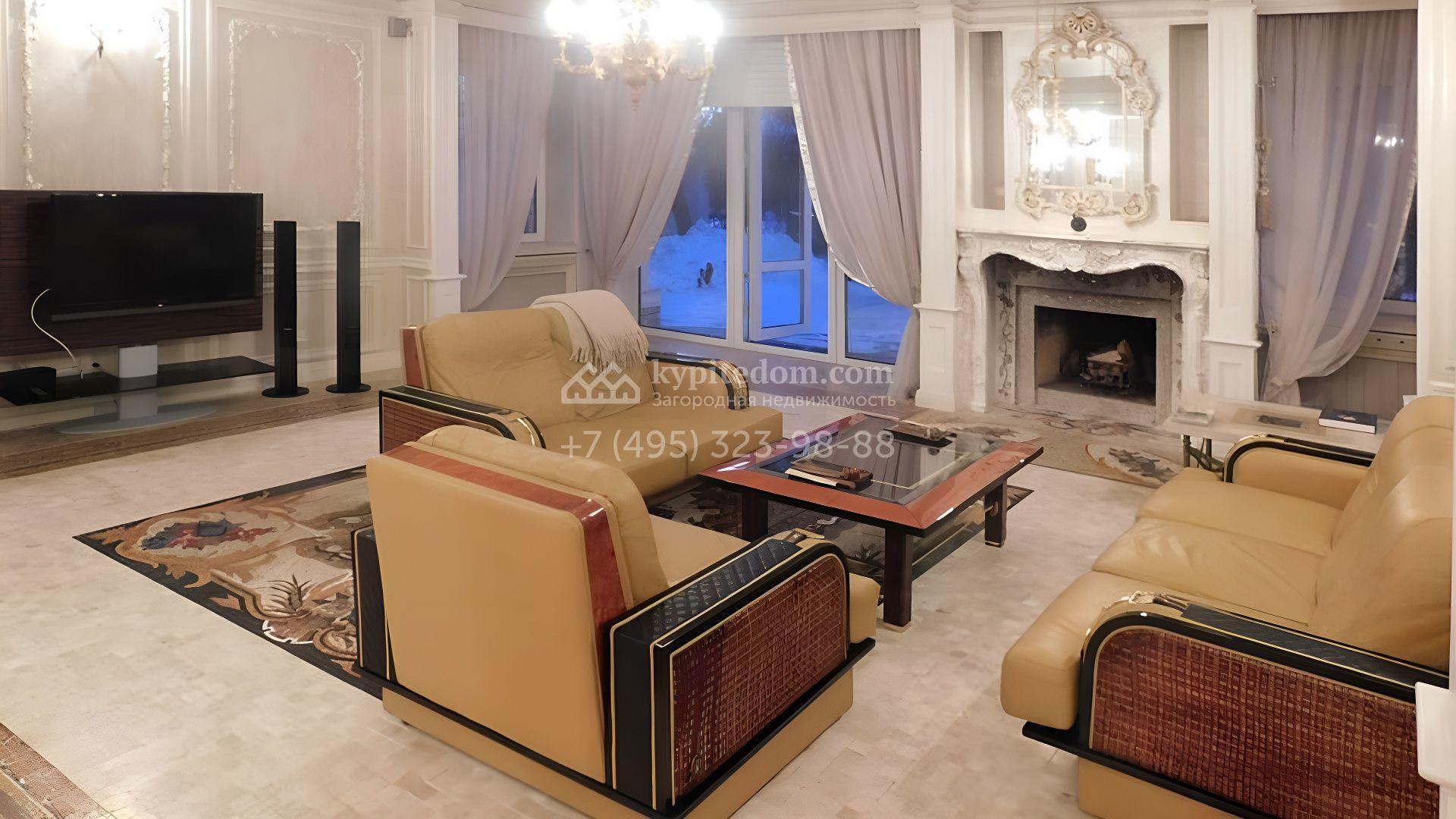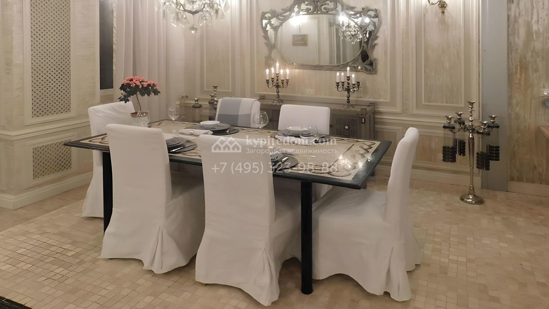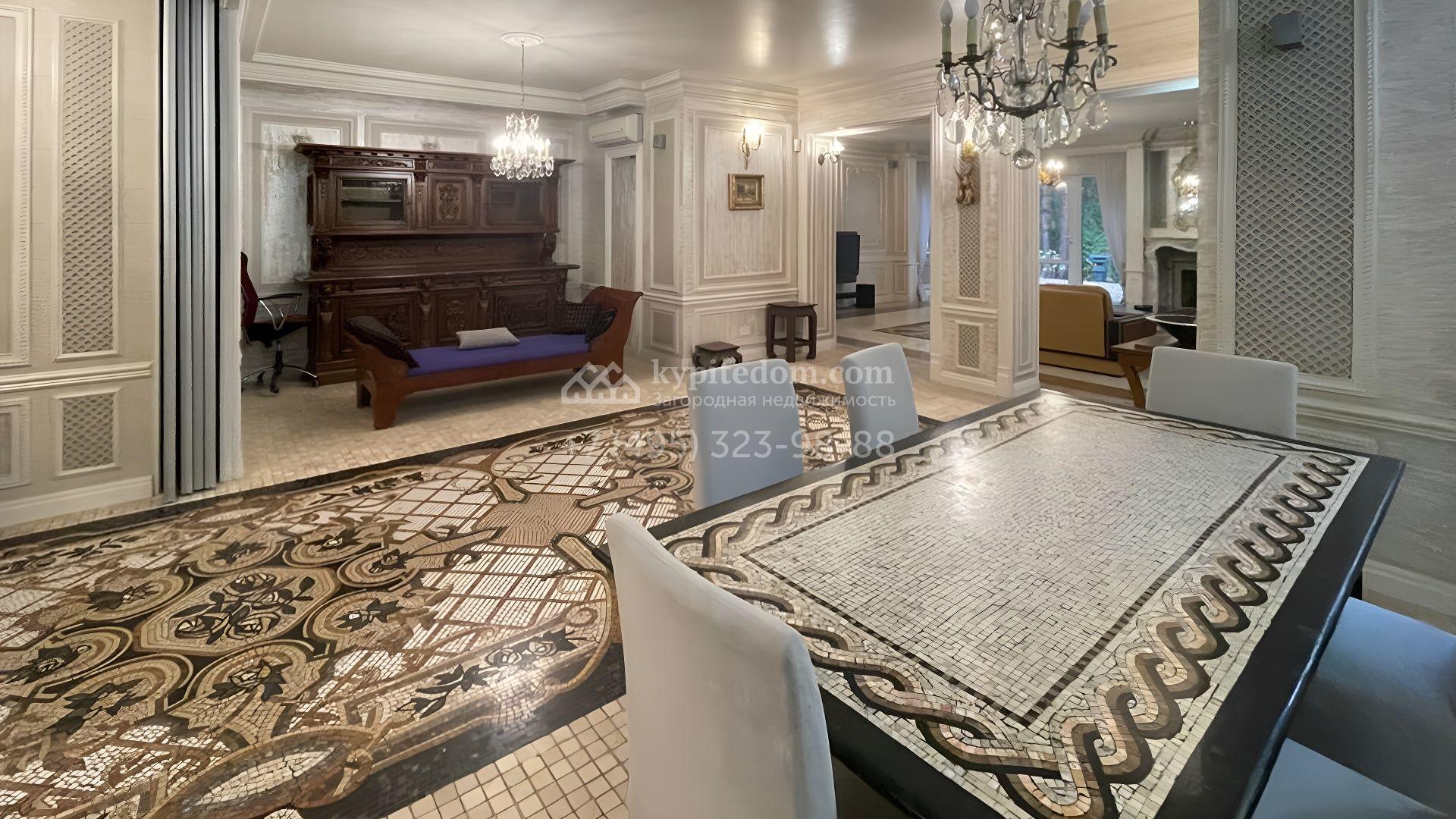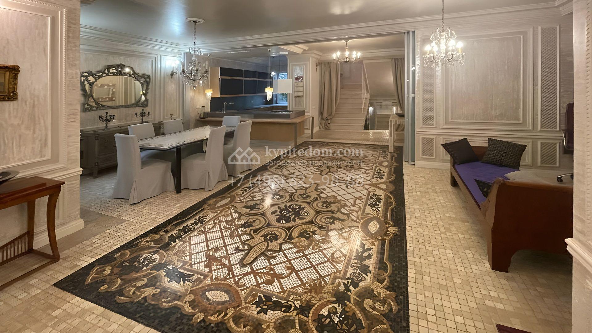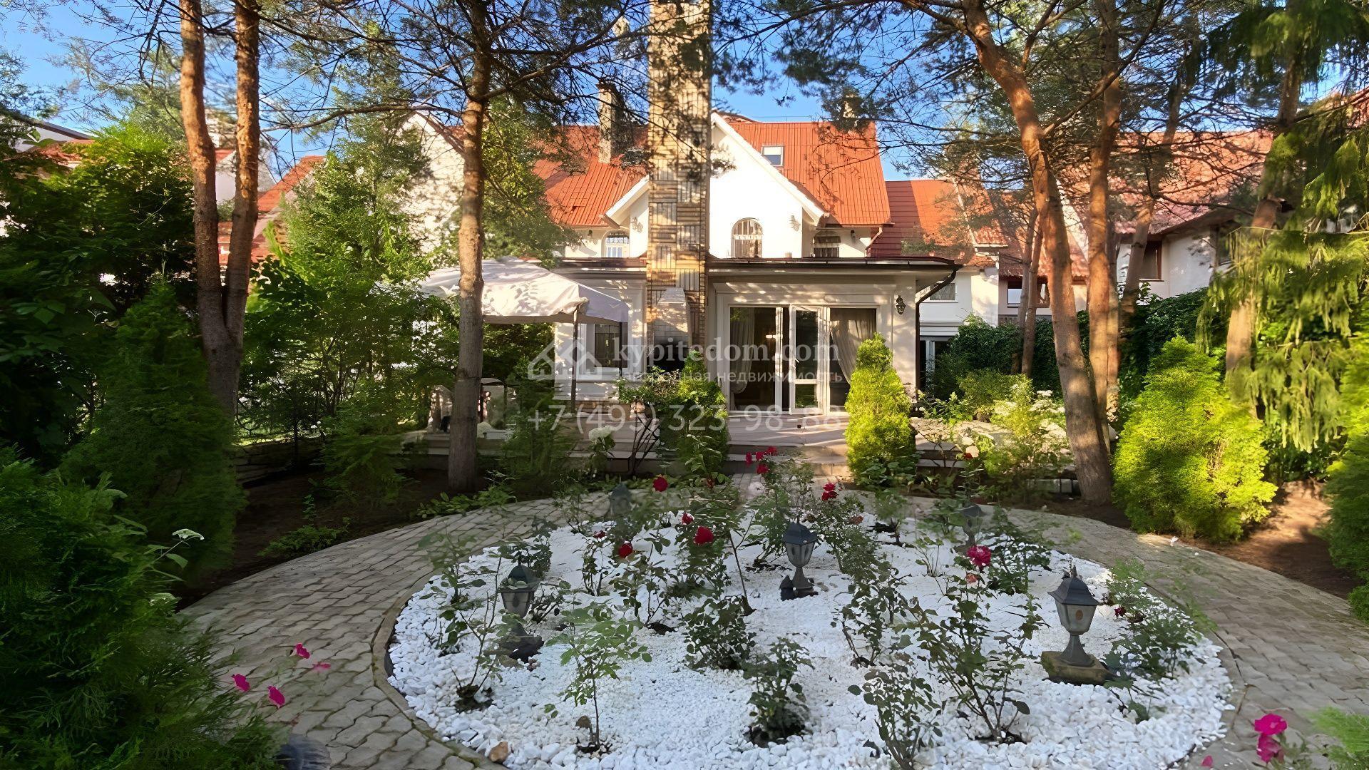Таунхаус площадью 364 м² расположен на уютном полевом участке 6 соток. Светлый фасад с красной крышей выполнен в европейском стиле, на оконных проемах установлены защитные ролл-жалюзи и декоративные решетки. Интерьер сочетает элементы современности и классики, на полах уложена мраморная мозаика, на стенах выполнена художественная покраска стен, установлена встроенная мебель итальянского производства. Планировкой дома предусмотрены 4 спальни, гостиная с камином, 2 кухни, турецкая баня и блок детской зоны с кухней, ванной и отдельным входом. На участке выполнен ландшафтный дизайн, растут взрослые хвойные деревья, построен садовый домик, на террасе оборудована зона барбекю.