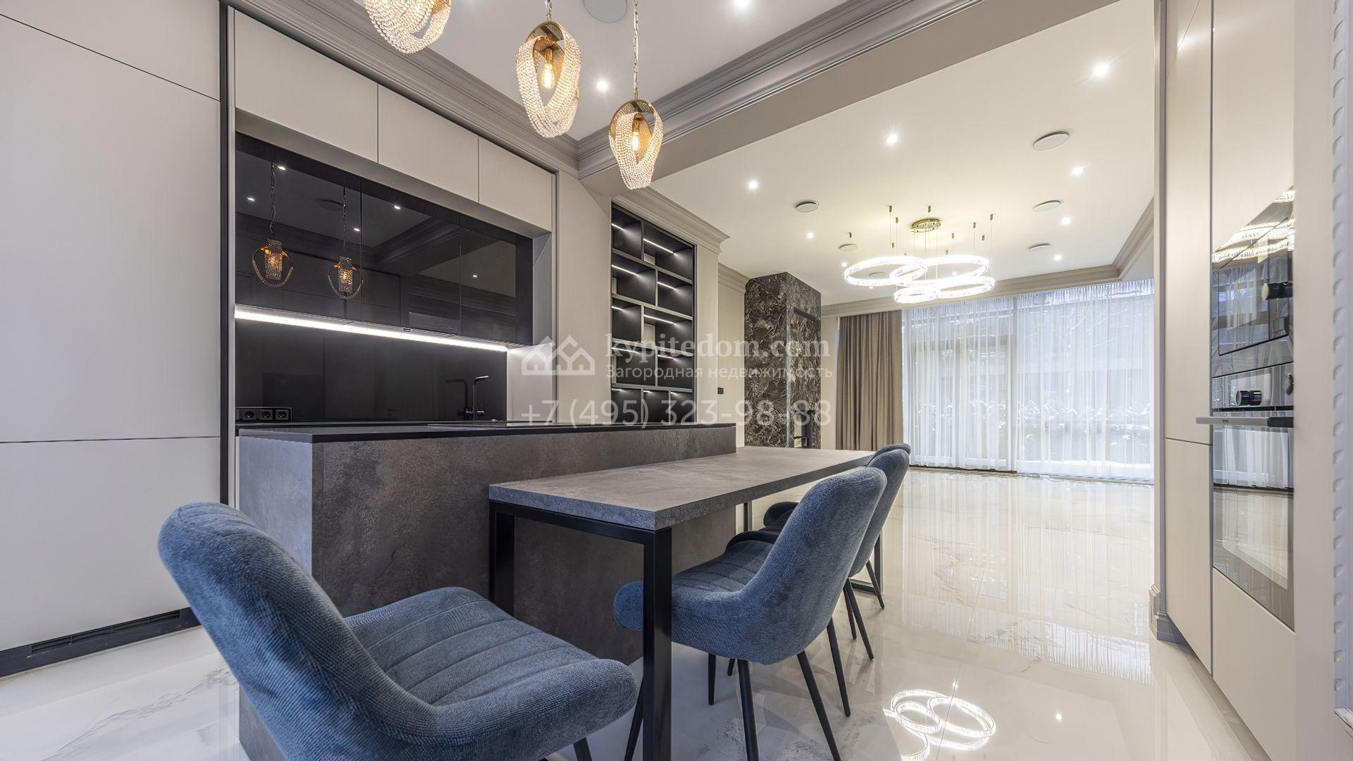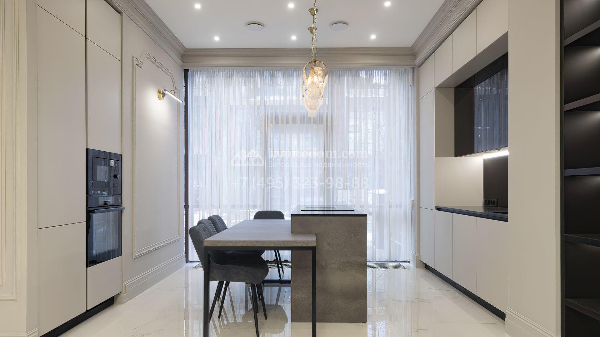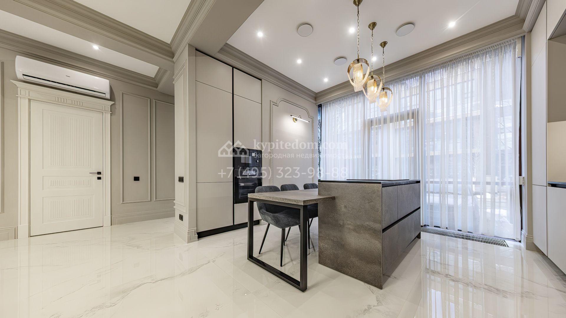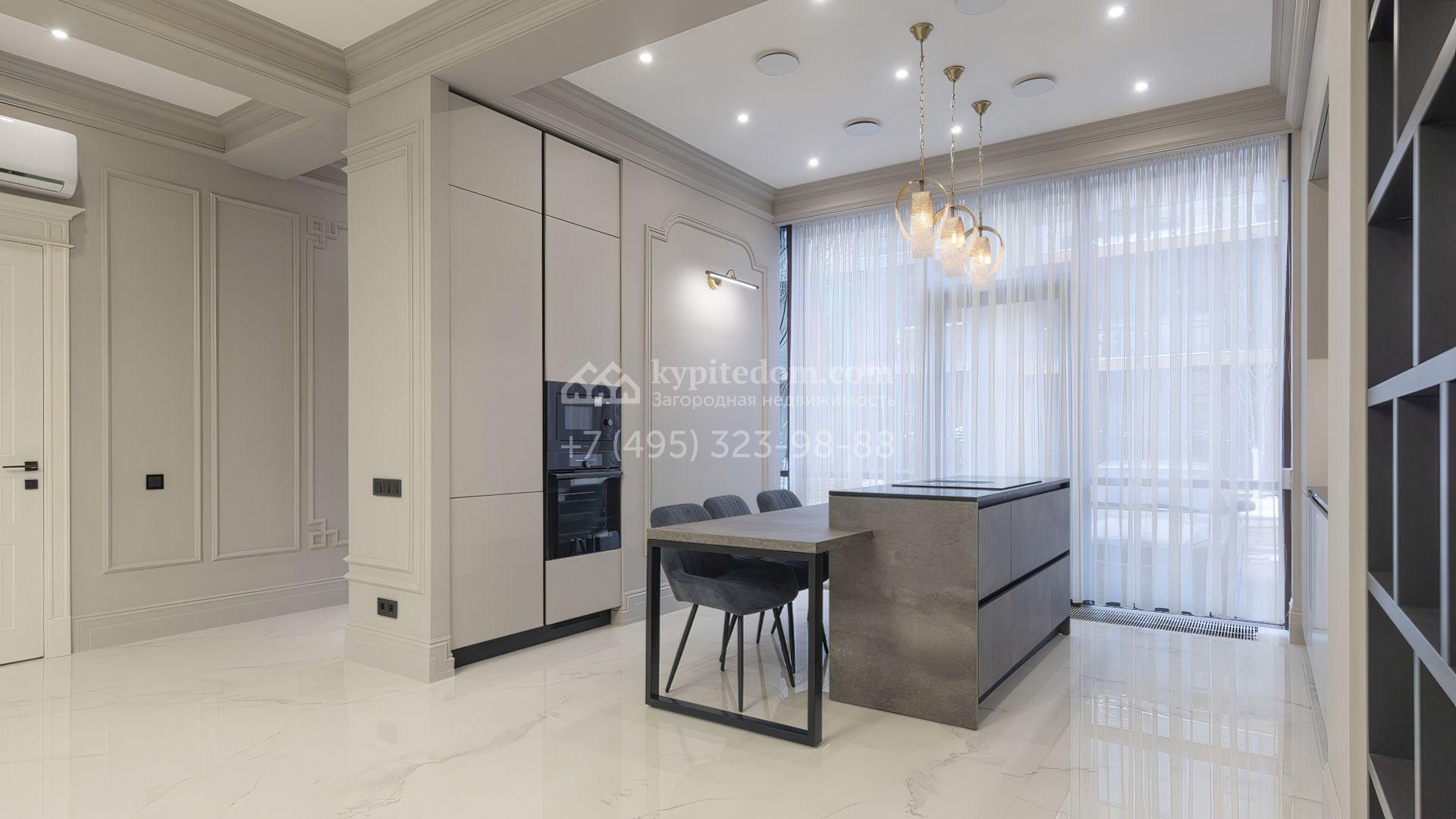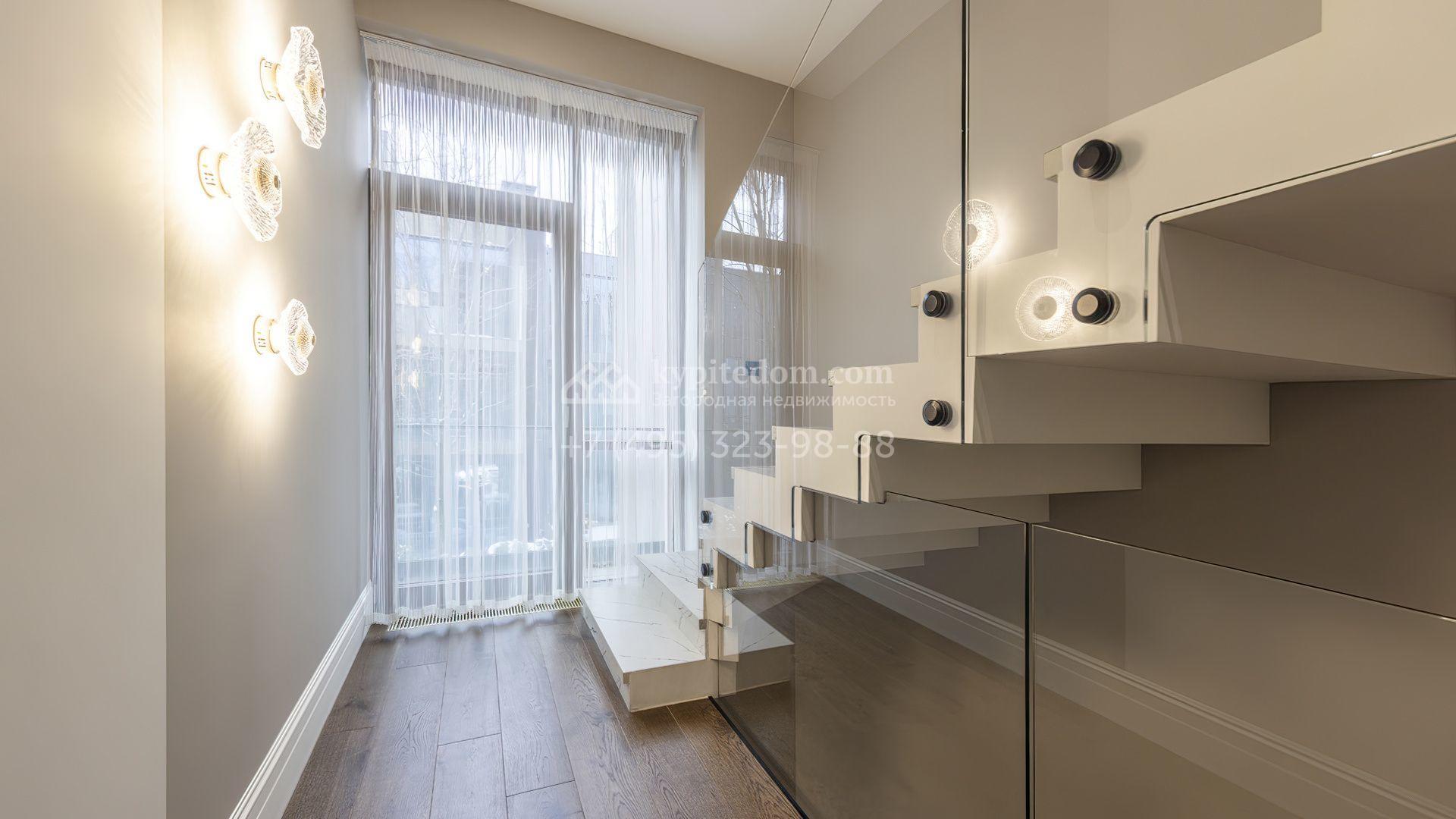 Таунхаус площадью 240 м² расположен на полевом участке 1,6 соток. В доме выполнена премиальная отделка в светлых тонах с использованием натуральных материалов, на полу выложена паркетная доска и керамогранит с текстурой мрамора. Стены декорированы молдингами с элементами лепнины. Таунхаус оснащен системой приточно-вытяжной вентиляции. Установлен кухонный гарнитур со встроенной бытовой техникой Gorenje.
