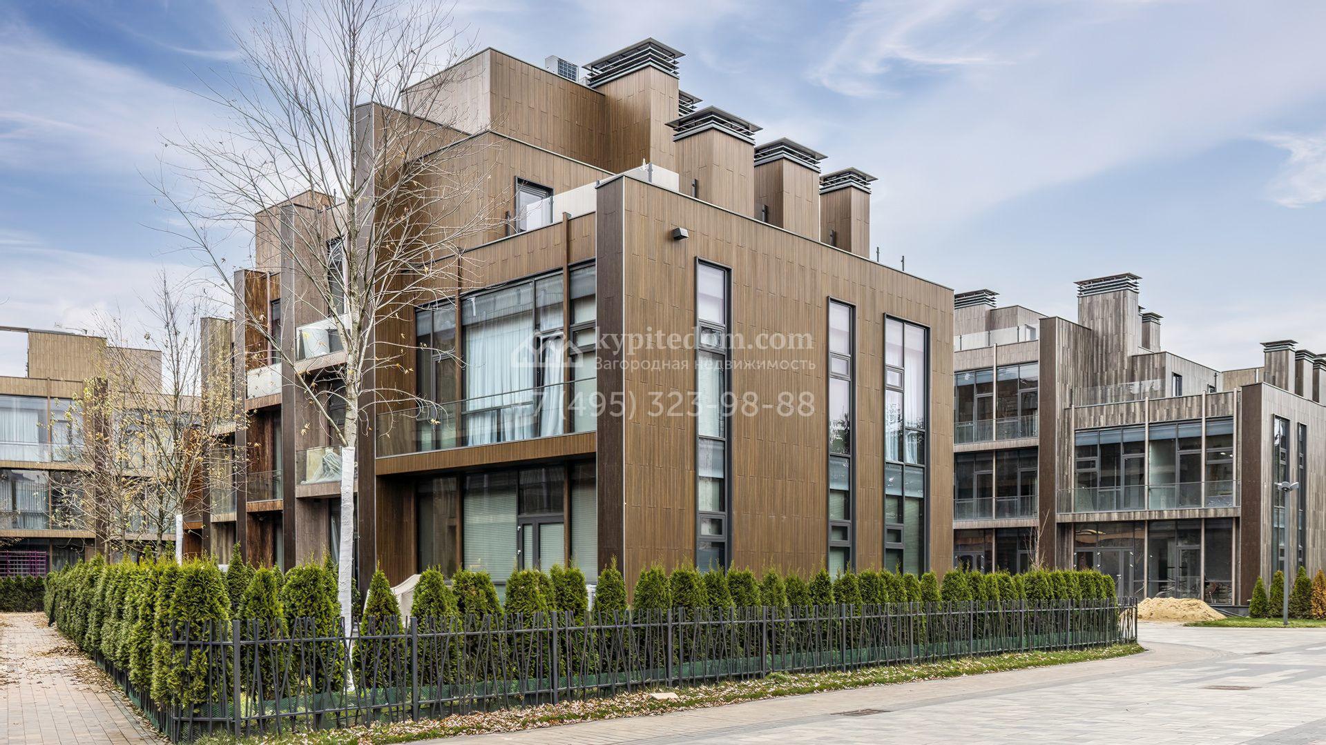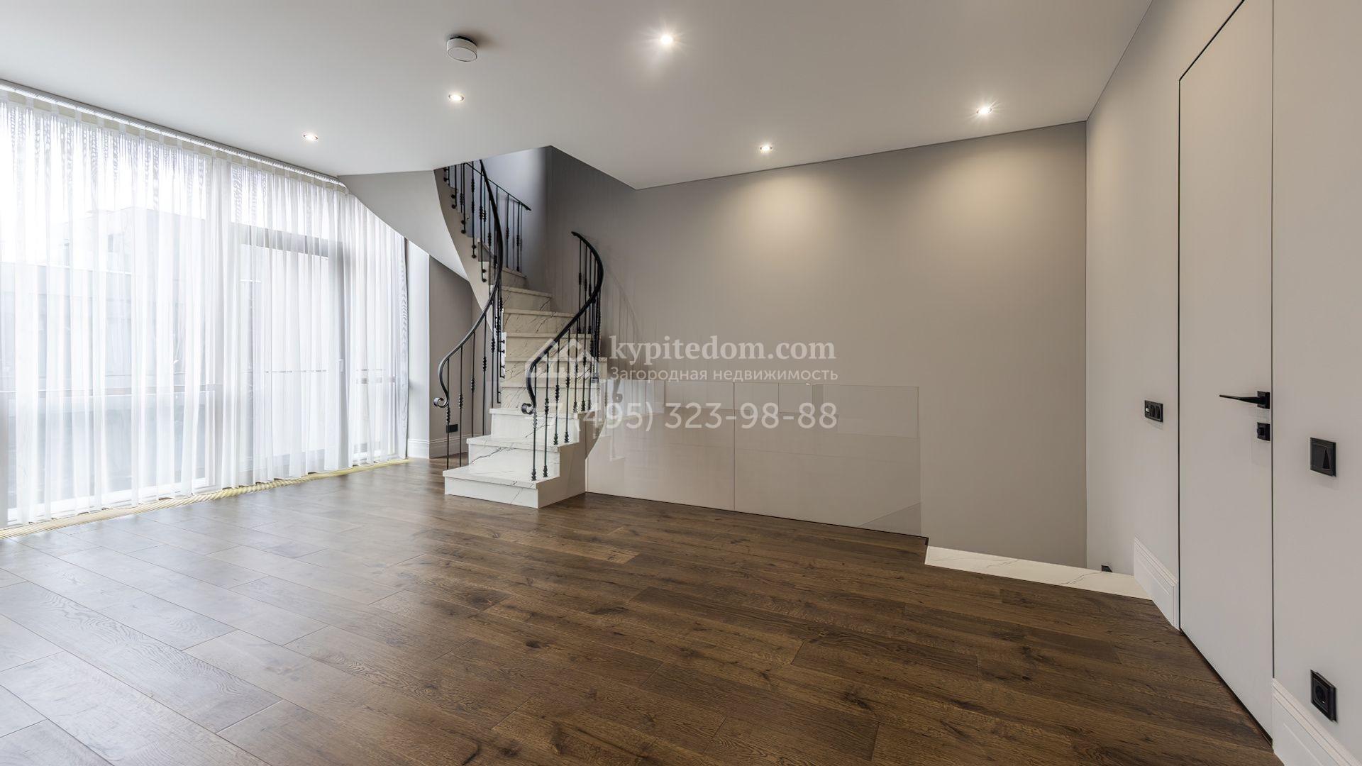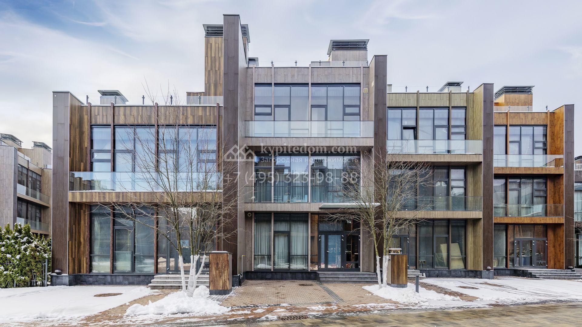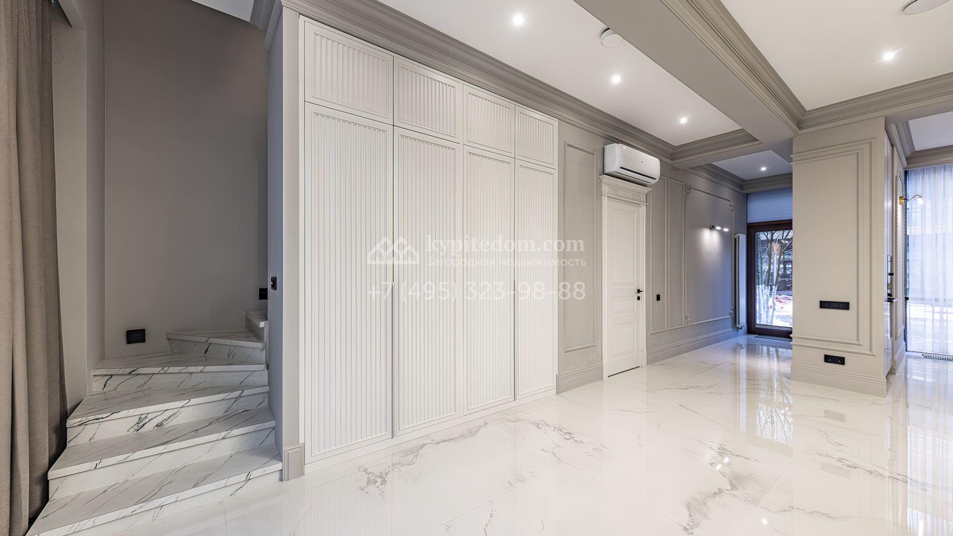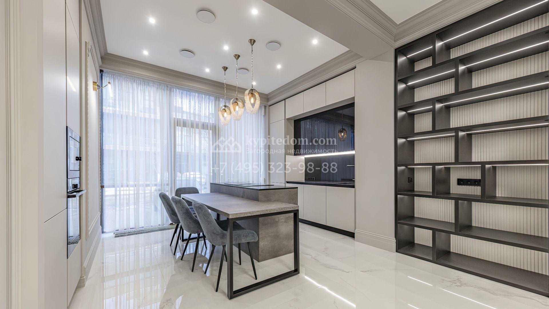 Таунхаус площадью 240 м² расположен на полевом участке 1,6 соток. В доме выполнена премиальная отделка в светлых тонах с использованием натуральных материалов, на полу выложена паркетная доска и керамогранит с текстурой мрамора. Стены декорированы молдингами с элементами лепнины. Таунхаус оснащен системой приточно-вытяжной вентиляции. Установлен кухонный гарнитур со встроенной бытовой техникой Gorenje.