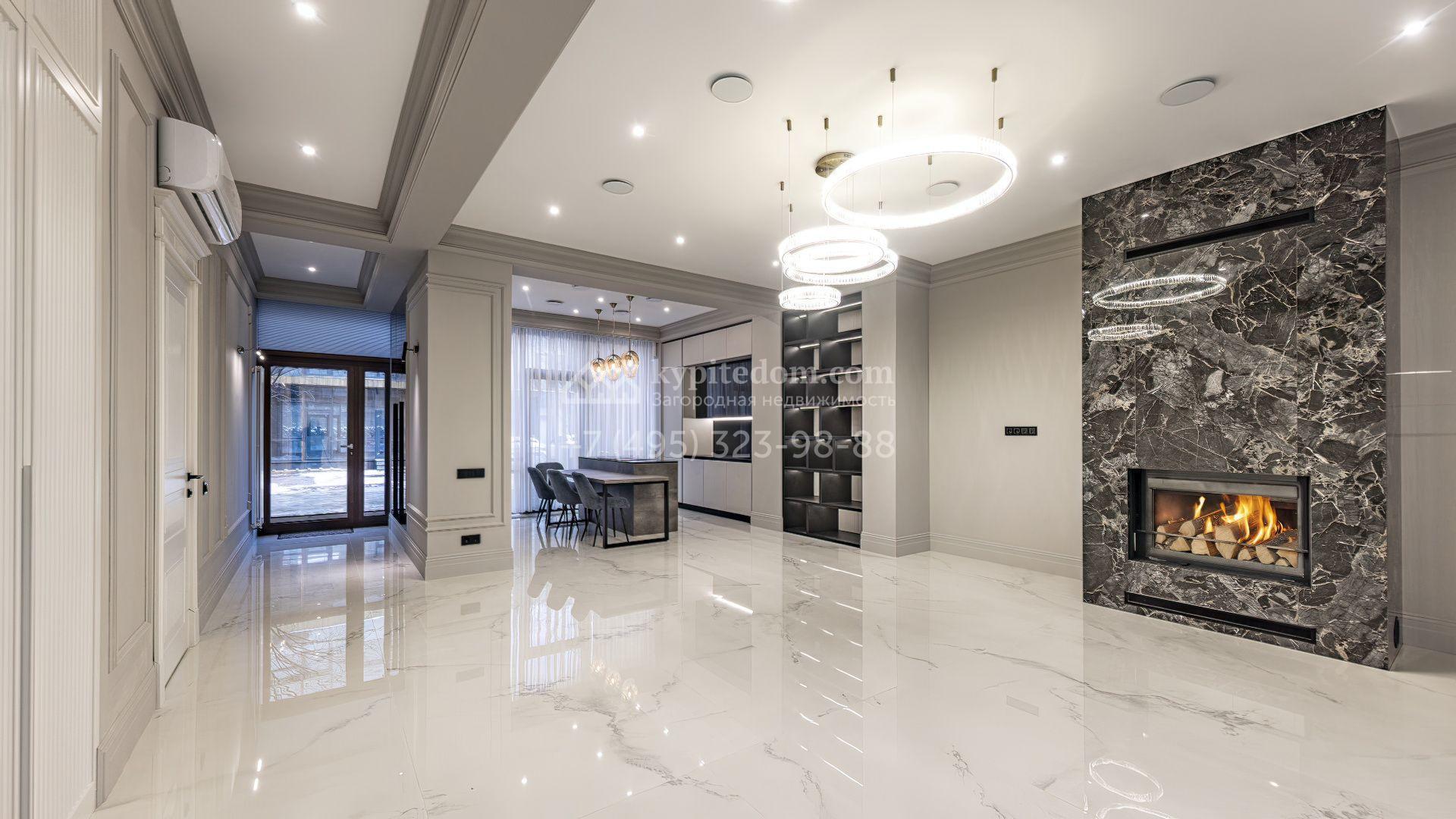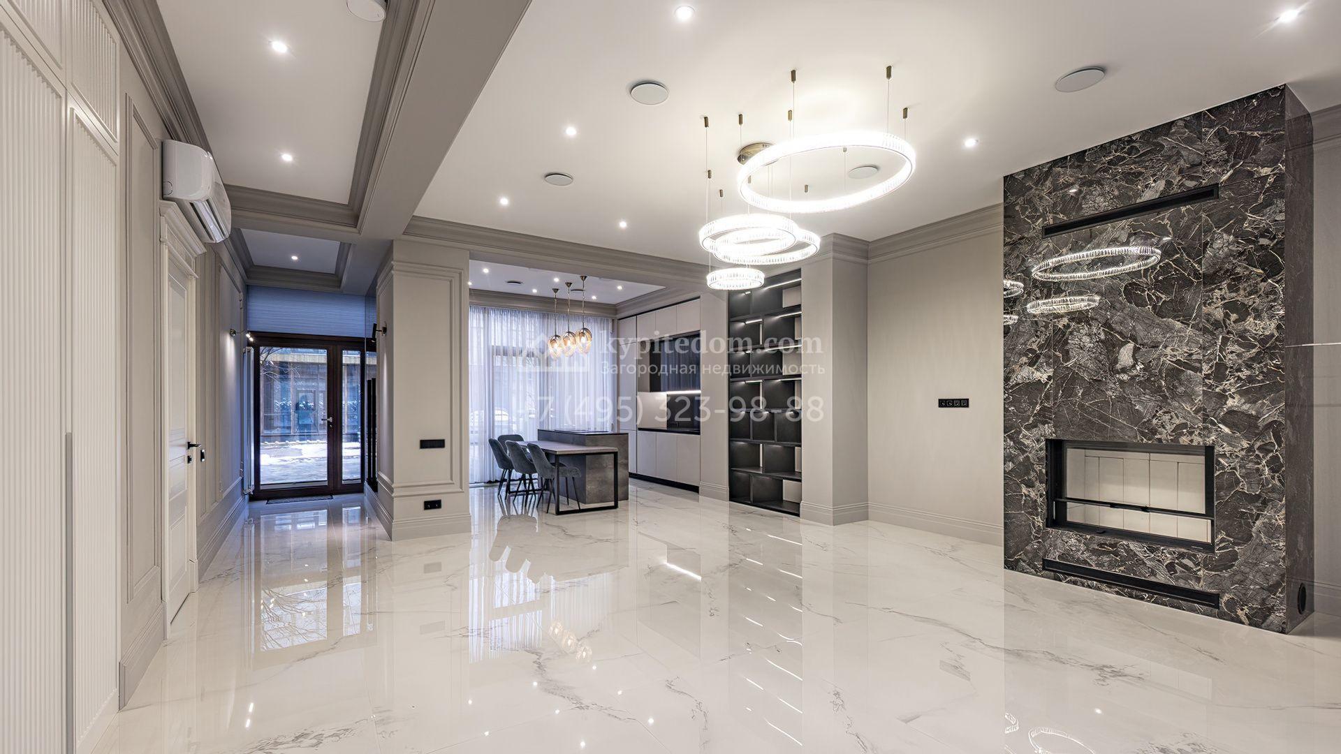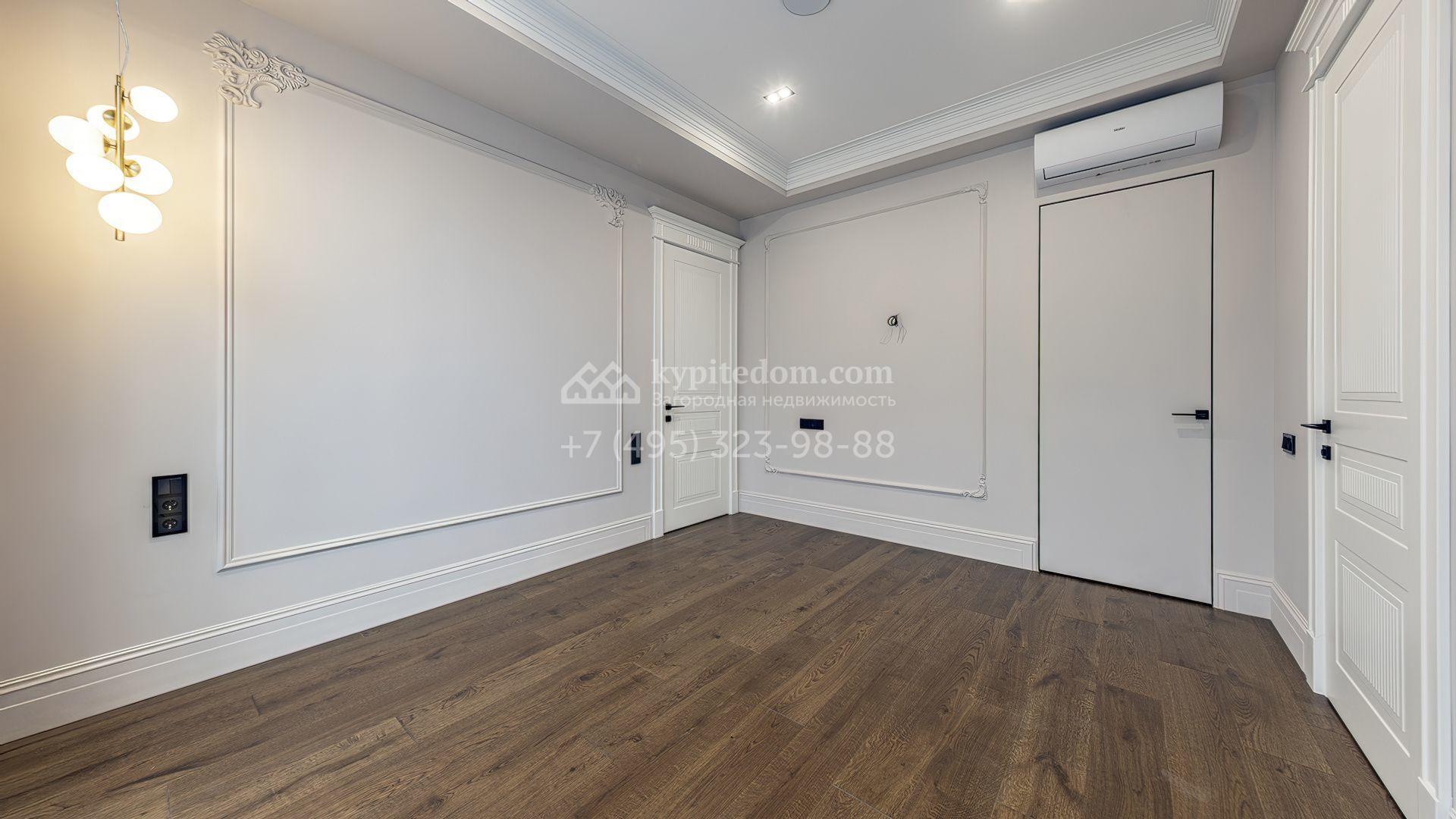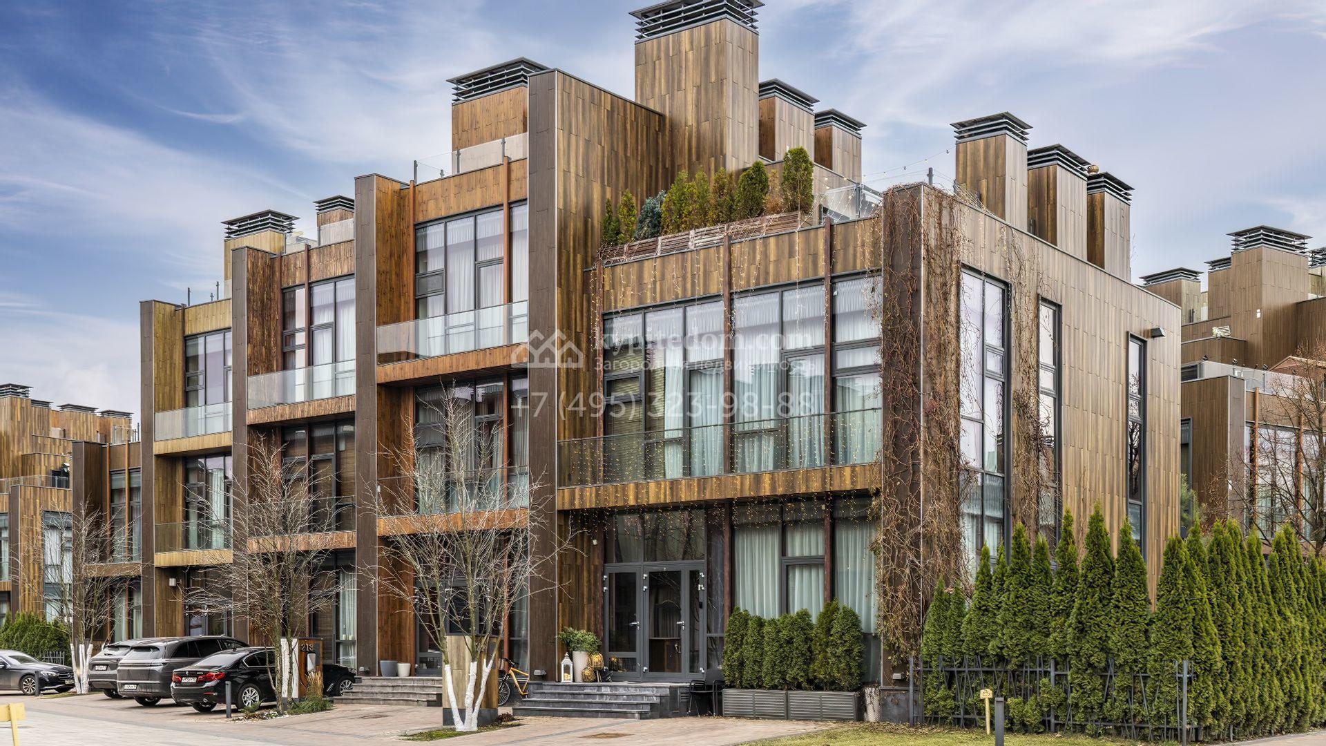 Таунхаус площадью 240 м² расположен на полевом участке 1,6 соток. В доме выполнена премиальная отделка в светлых тонах с использованием натуральных материалов, на полу выложена паркетная доска и керамогранит с текстурой мрамора. Стены декорированы молдингами с элементами лепнины. Таунхаус оснащен системой приточно-вытяжной вентиляции. Установлен кухонный гарнитур со встроенной бытовой техникой Gorenje.