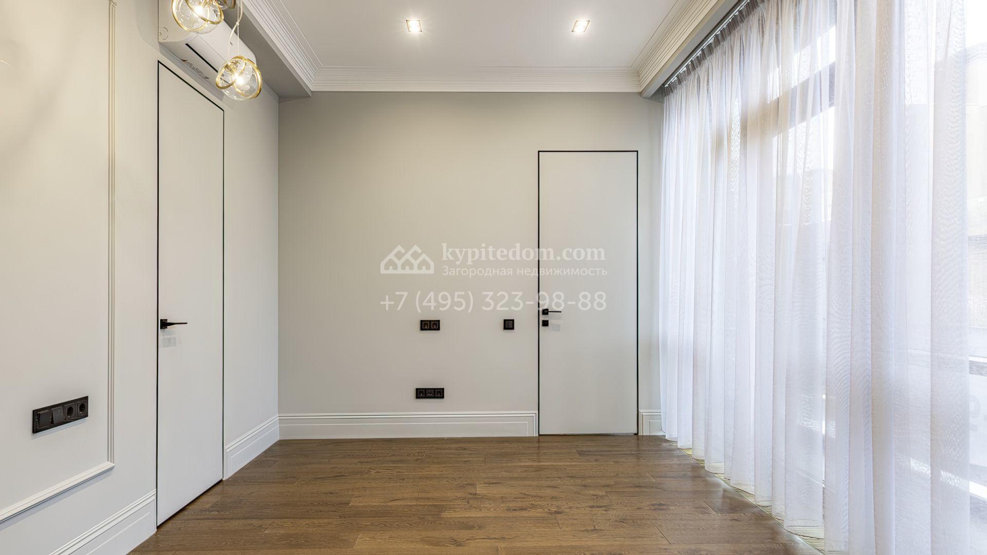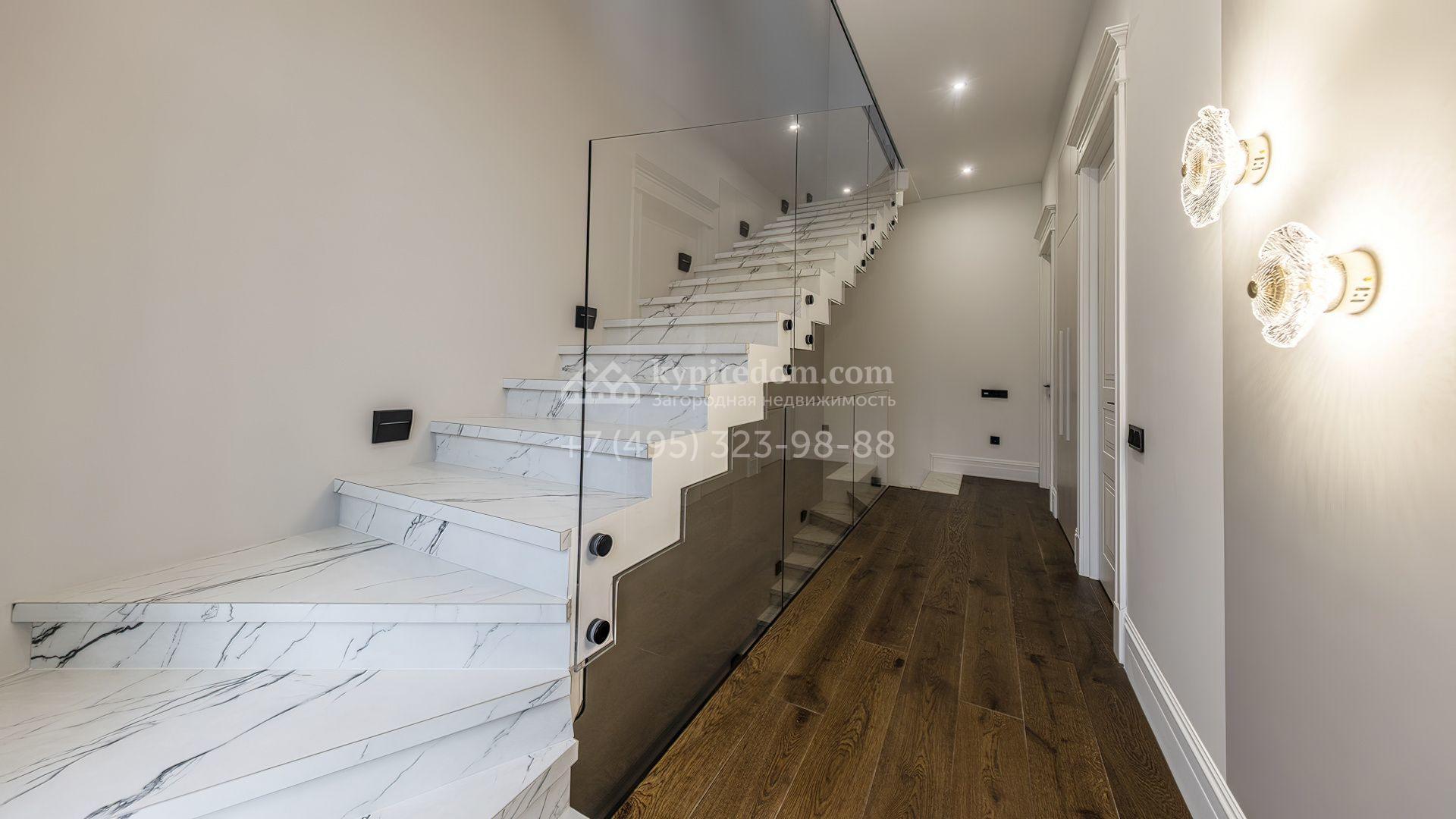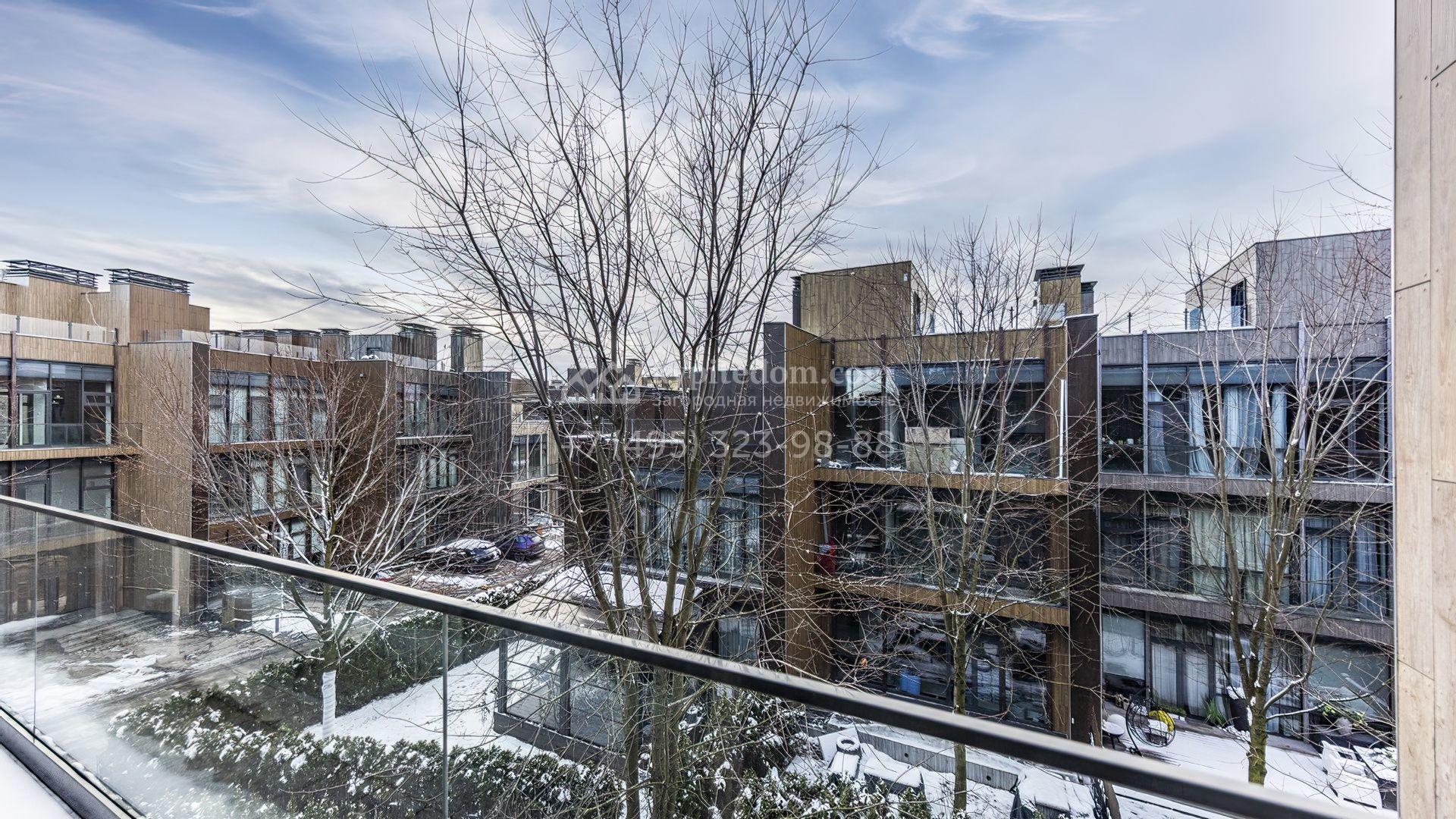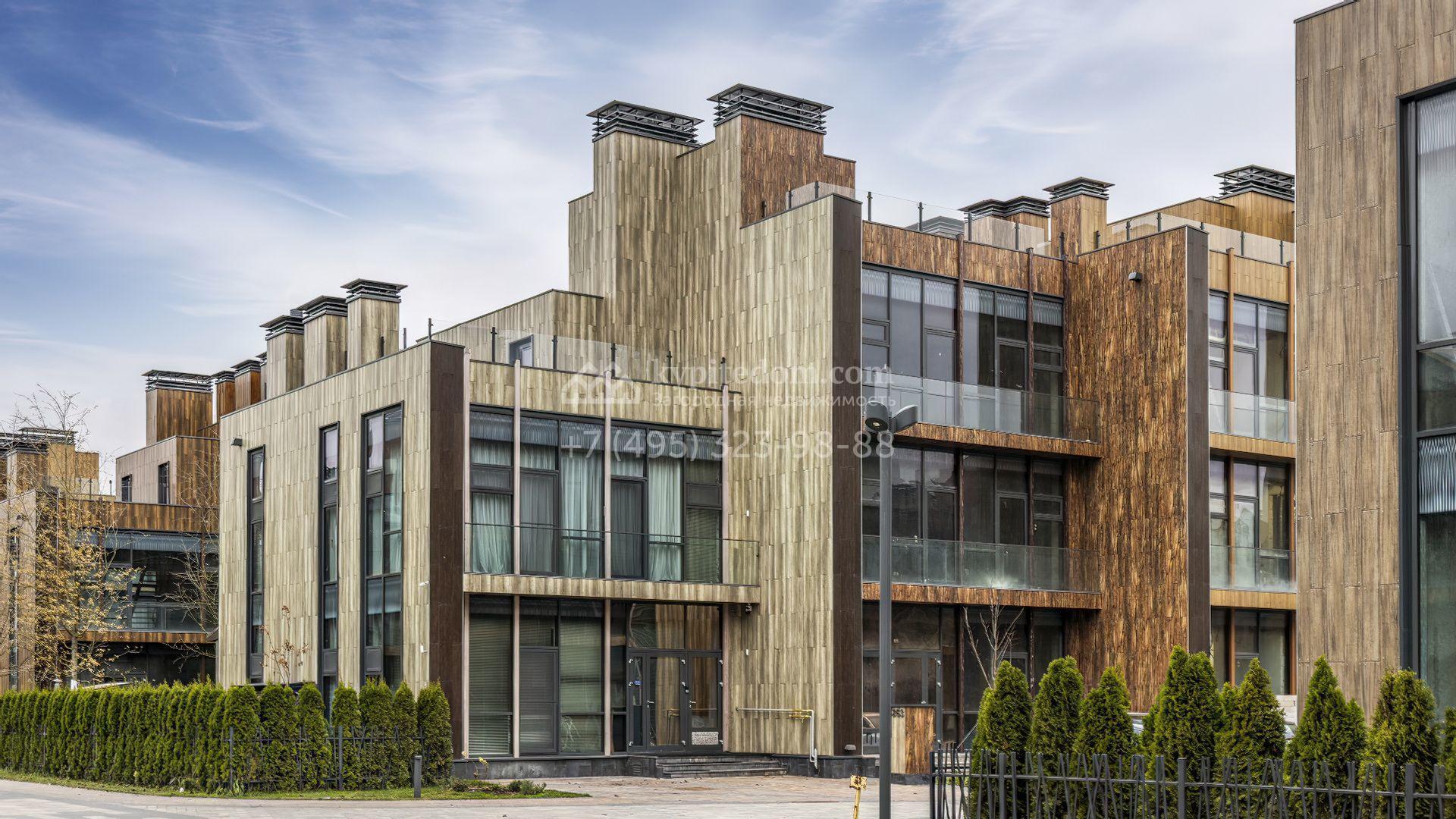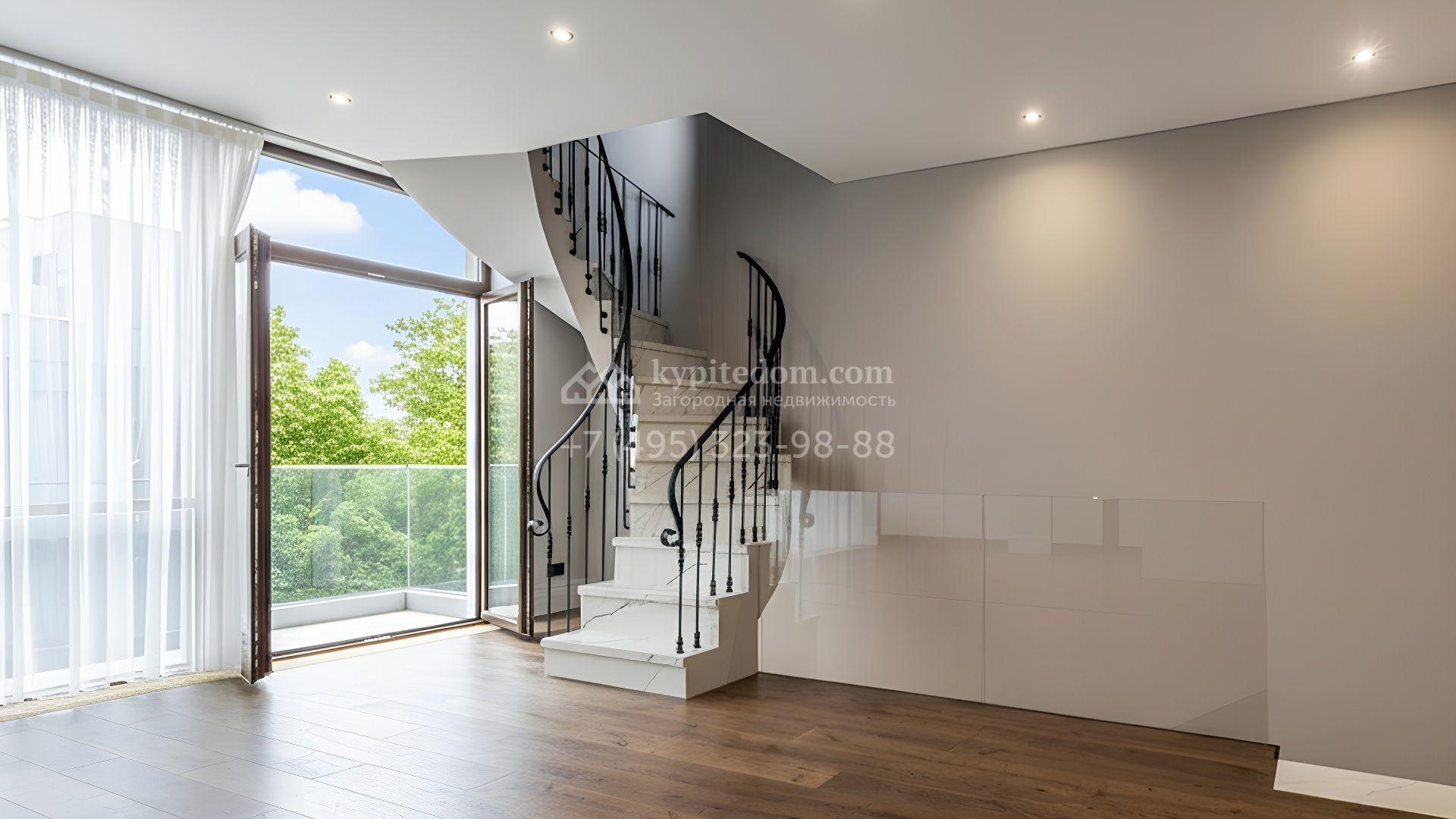 Таунхаус площадью 240 м² расположен на полевом участке 1,6 соток. В доме выполнена премиальная отделка в светлых тонах с использованием натуральных материалов, на полу выложена паркетная доска и керамогранит с текстурой мрамора. Стены декорированы молдингами с элементами лепнины. Таунхаус оснащен системой приточно-вытяжной вентиляции. Установлен кухонный гарнитур со встроенной бытовой техникой Gorenje.