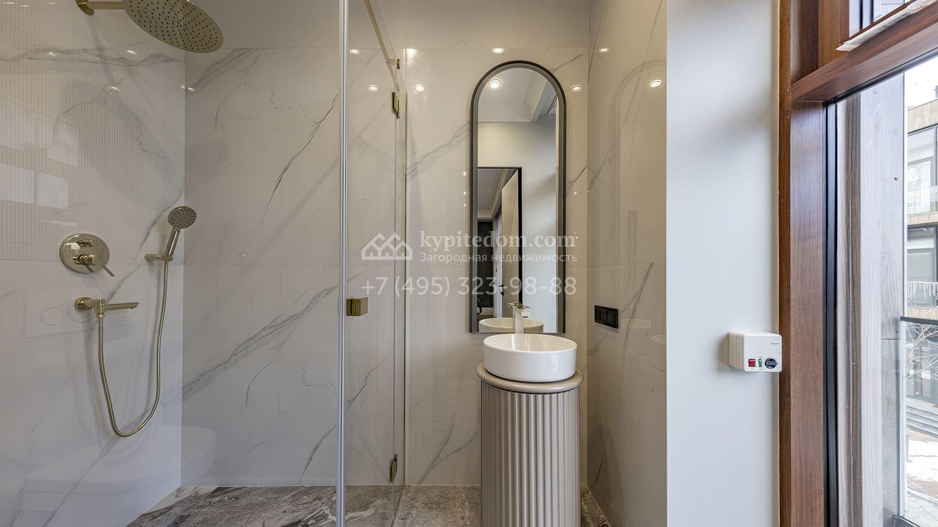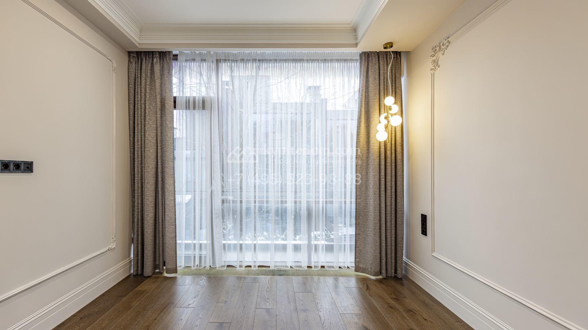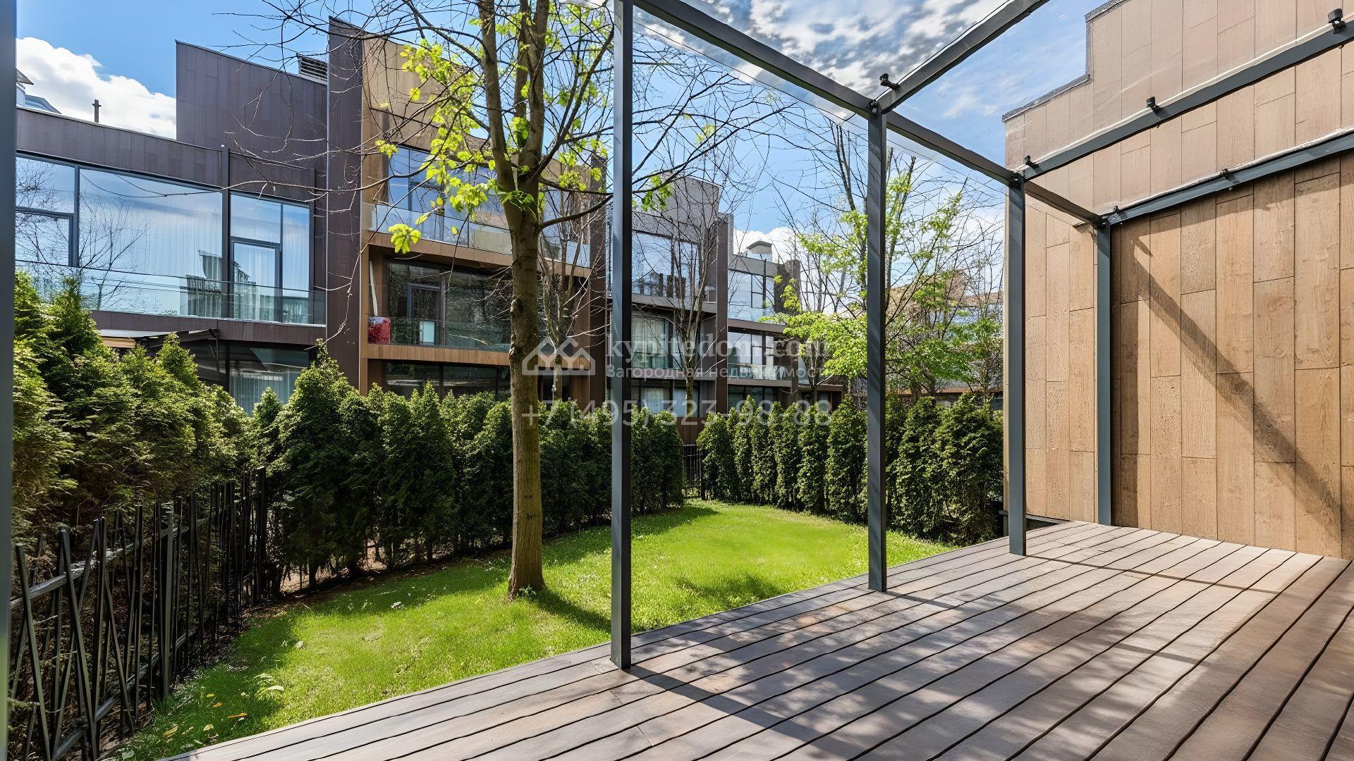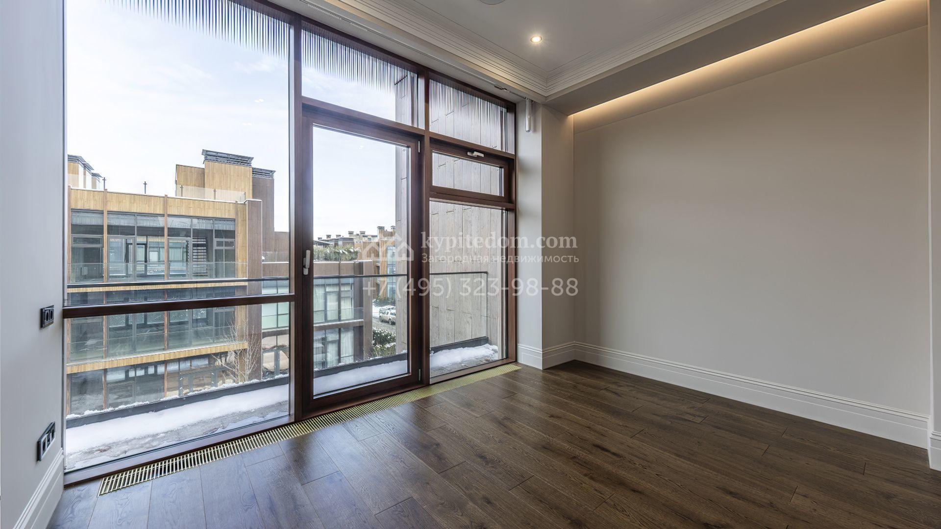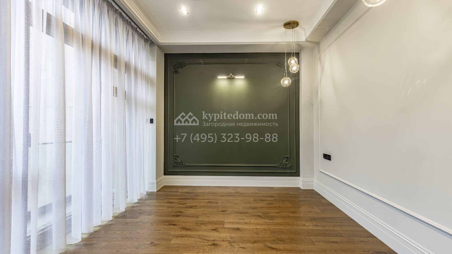 Таунхаус площадью 240 м² расположен на полевом участке 1,6 соток. В доме выполнена премиальная отделка в светлых тонах с использованием натуральных материалов, на полу выложена паркетная доска и керамогранит с текстурой мрамора. Стены декорированы молдингами с элементами лепнины. Таунхаус оснащен системой приточно-вытяжной вентиляции. Установлен кухонный гарнитур со встроенной бытовой техникой Gorenje.