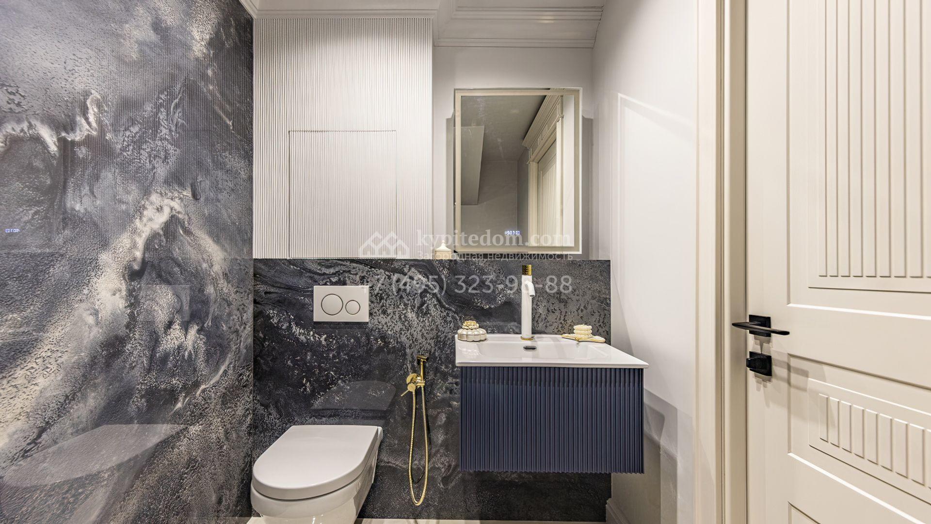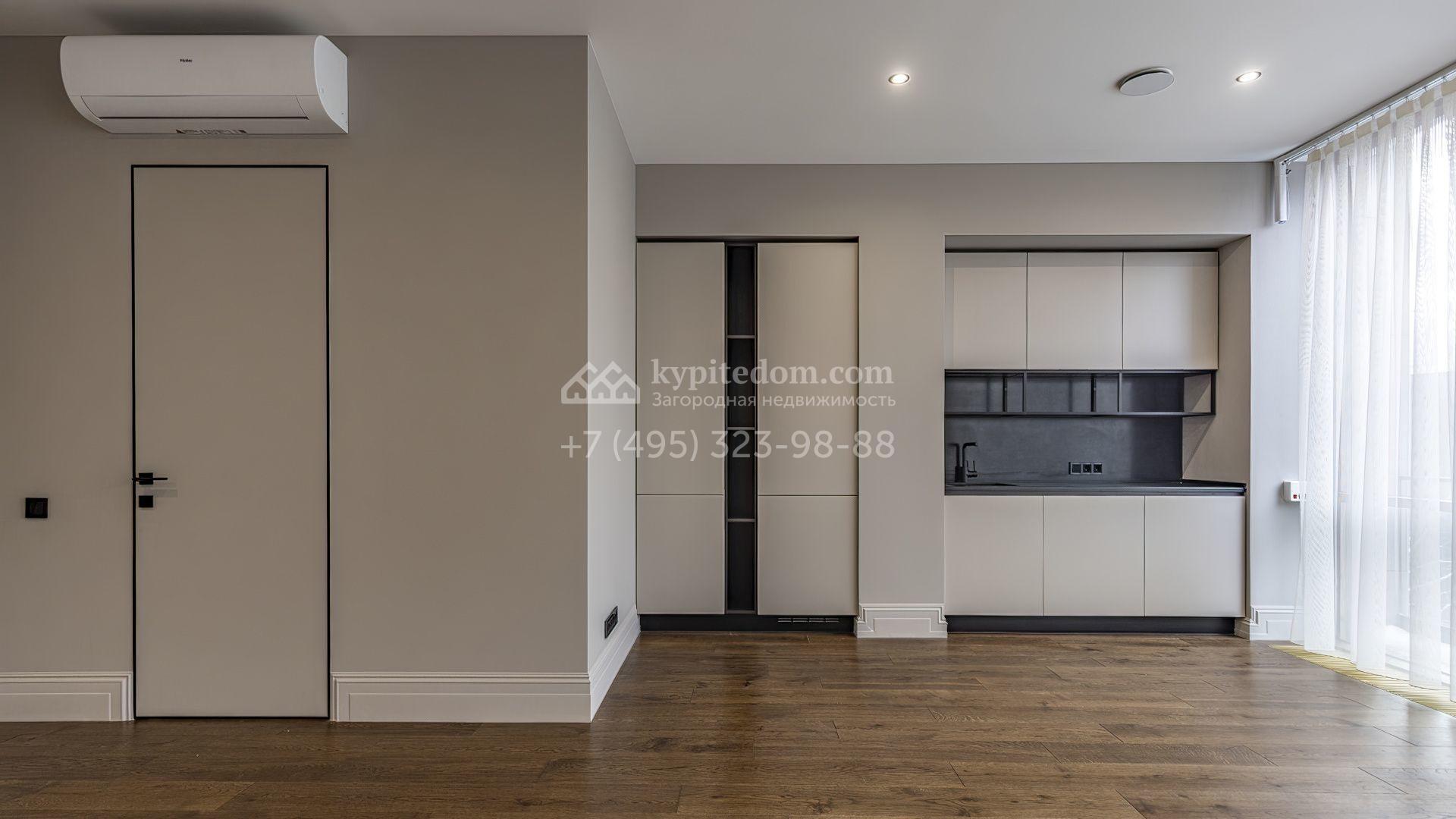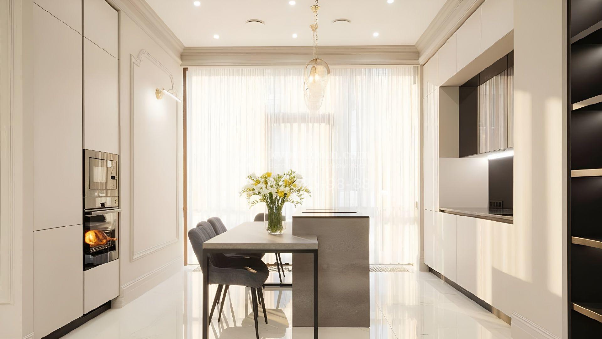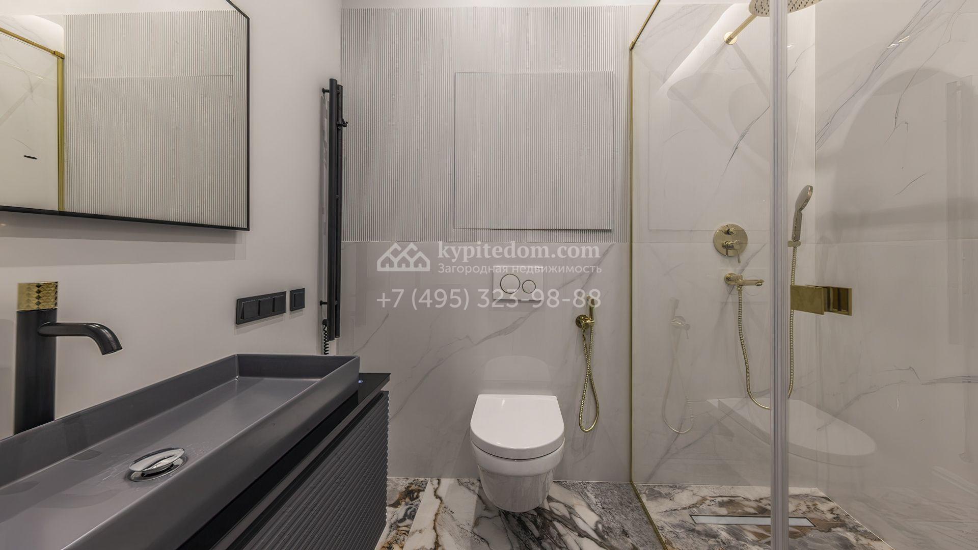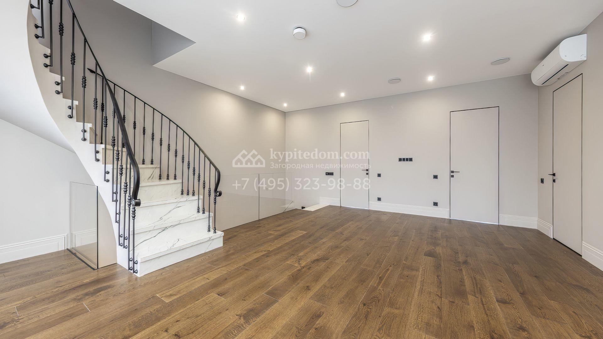 Таунхаус площадью 240 м² расположен на полевом участке 1,6 соток. В доме выполнена премиальная отделка в светлых тонах с использованием натуральных материалов, на полу выложена паркетная доска и керамогранит с текстурой мрамора. Стены декорированы молдингами с элементами лепнины. Таунхаус оснащен системой приточно-вытяжной вентиляции. Установлен кухонный гарнитур со встроенной бытовой техникой Gorenje.