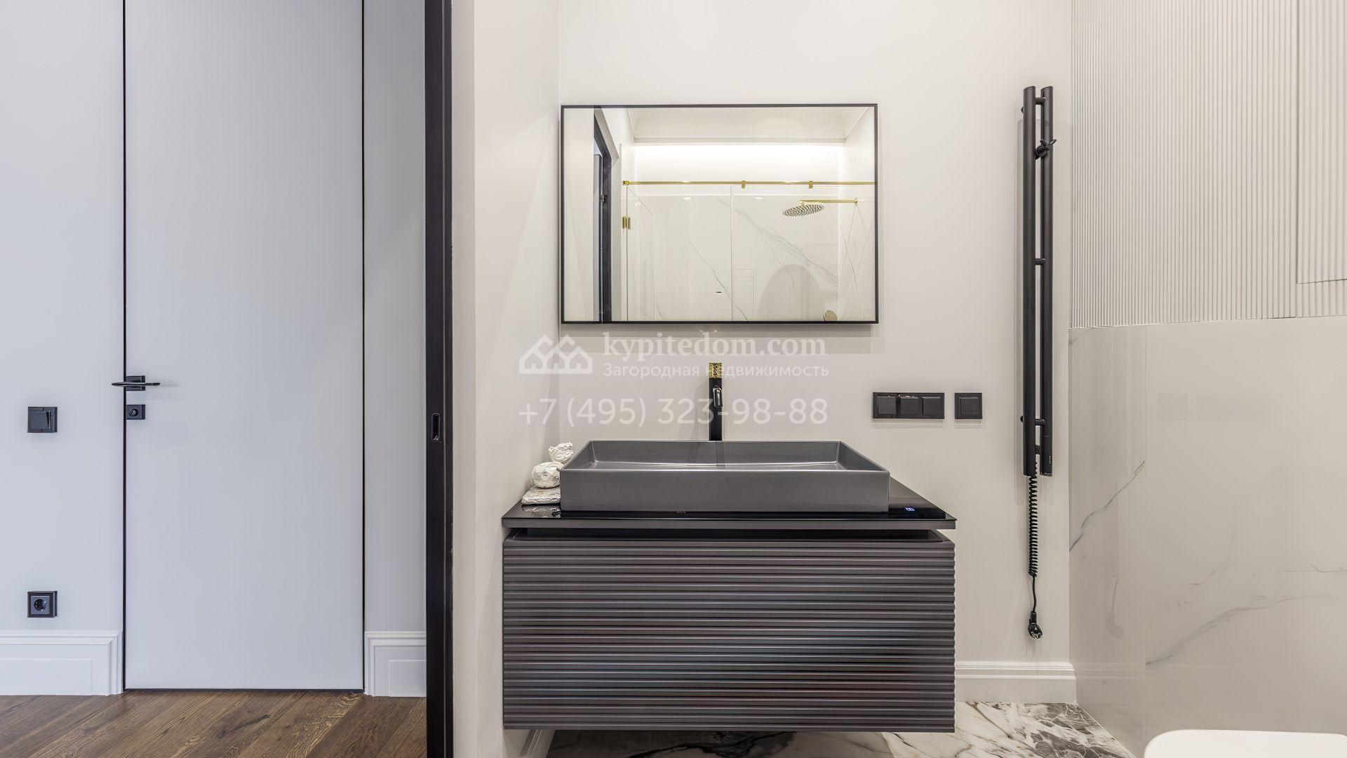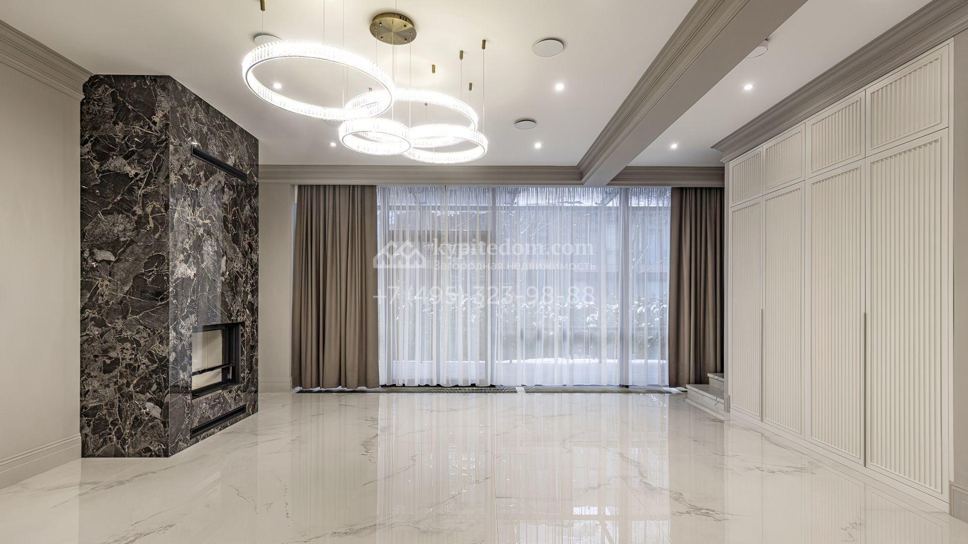 В ходе реализации проекта продуманы различные сценарии освещения, а дизайнерские люстры и светильники наполняют пространство уютом. Спланированы просторная гостиная с камином, кухня-столовая, 4 спальни и терраса. Дополнительно предусмотрен выход на эксплуатируемую крышу, где можно разместить ротанговую мебель и оборудовать место для отдыха.