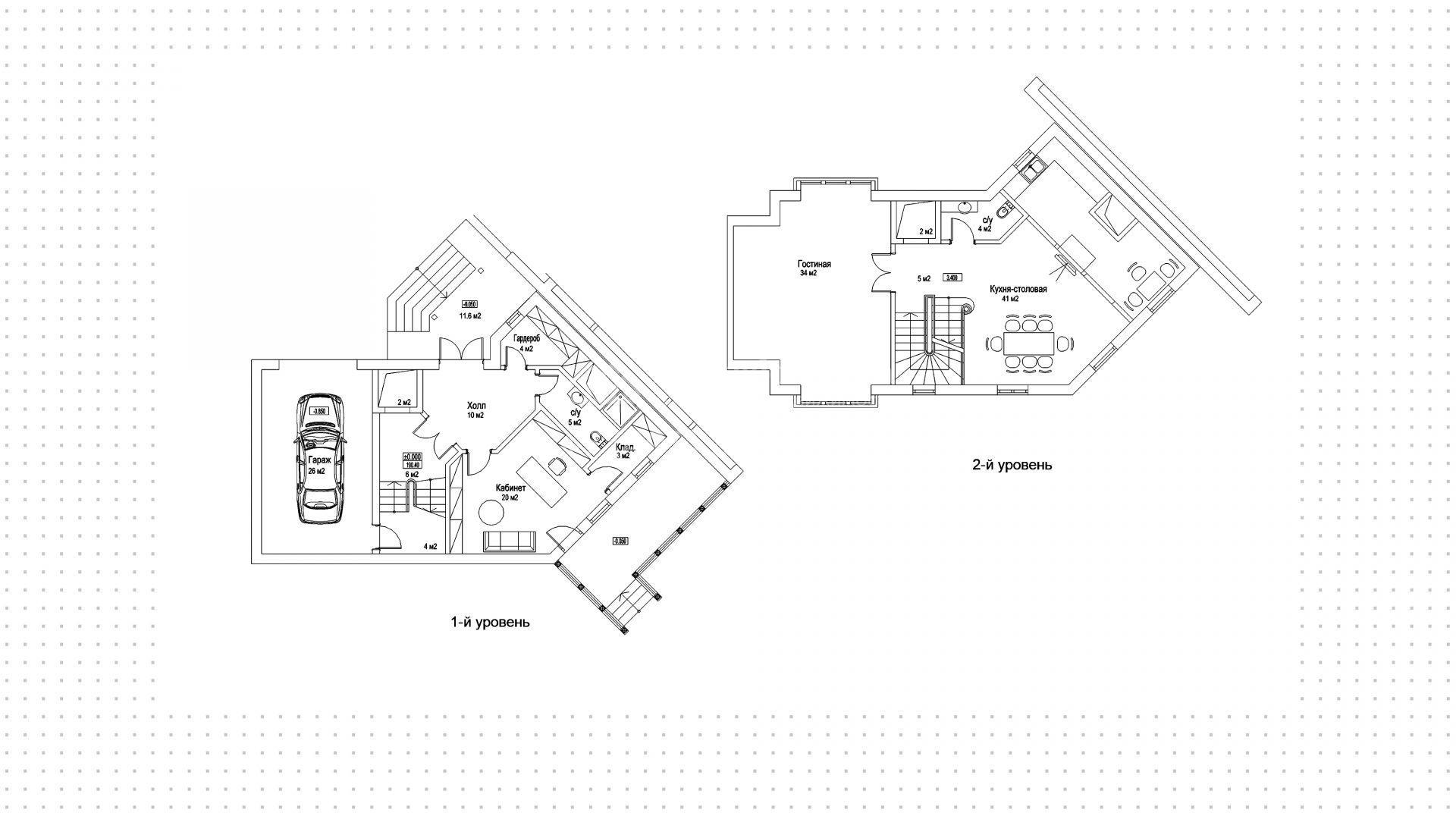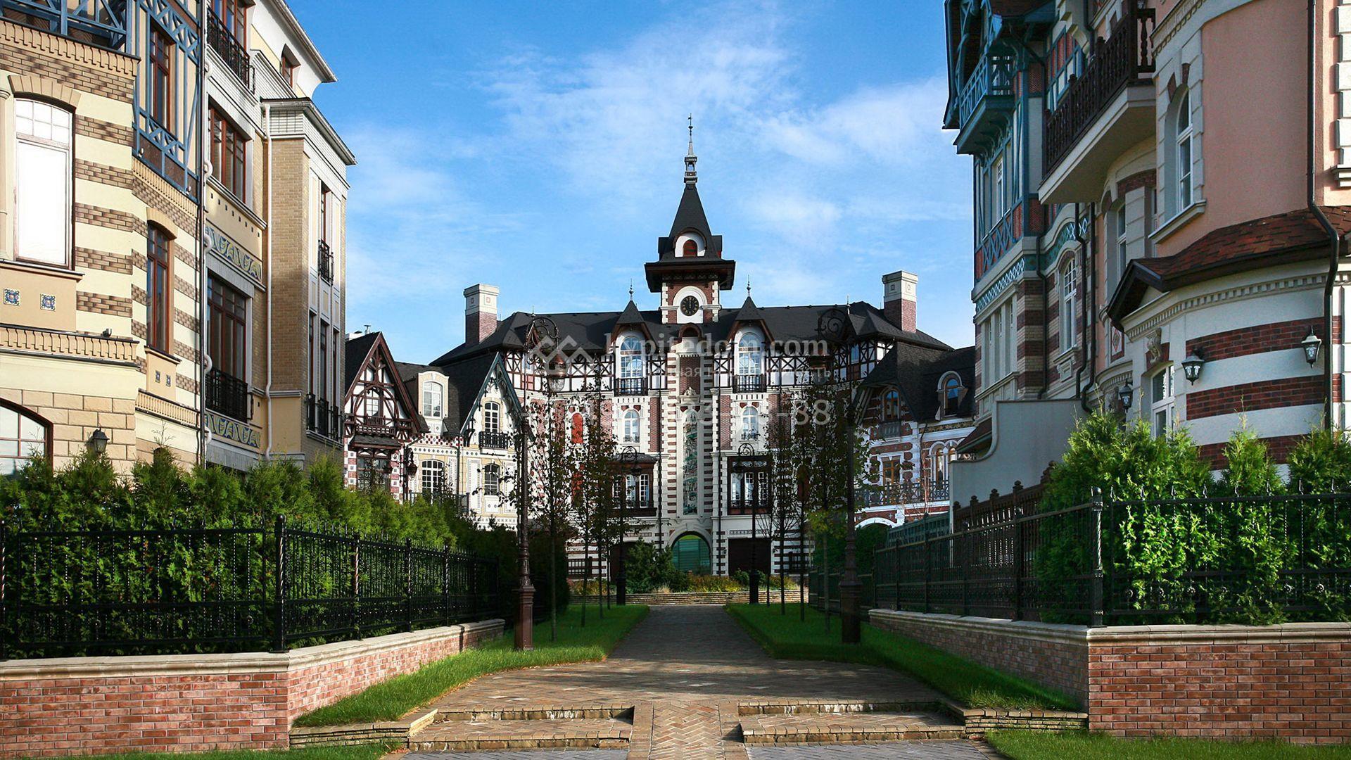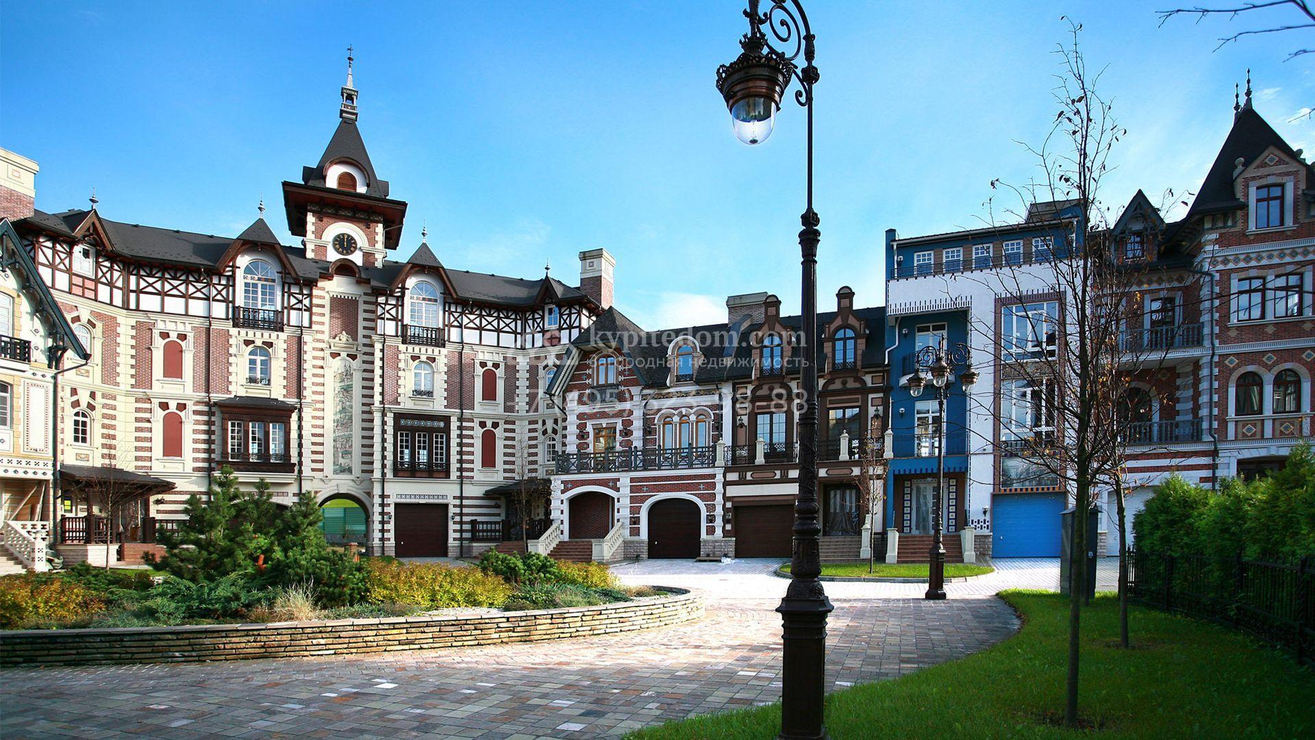 Таунхаус в старофранцузском стиле площадью 387 м² без отделки расположен в левой части здания с башенкой. Фасад с исторической точностью скопирован с французского курорта «Довиль» на Северо-Западе Франции, украшен рустовкой, изящными декоративными балками в стиле «фахверк», шпилями на крыше и мозаикой. Первый этаж таунхауса занимает гараж и подсобные помещения, второй отведен для кухни и гостиной. Третий и четвертый этажи заняты 4 спальнями хозяев дома. Через все этажи проходит шахта лифта. На участке 10,9 соток посадили газон — можно поставить шезлонги и создать зону отдыха с барбекю.