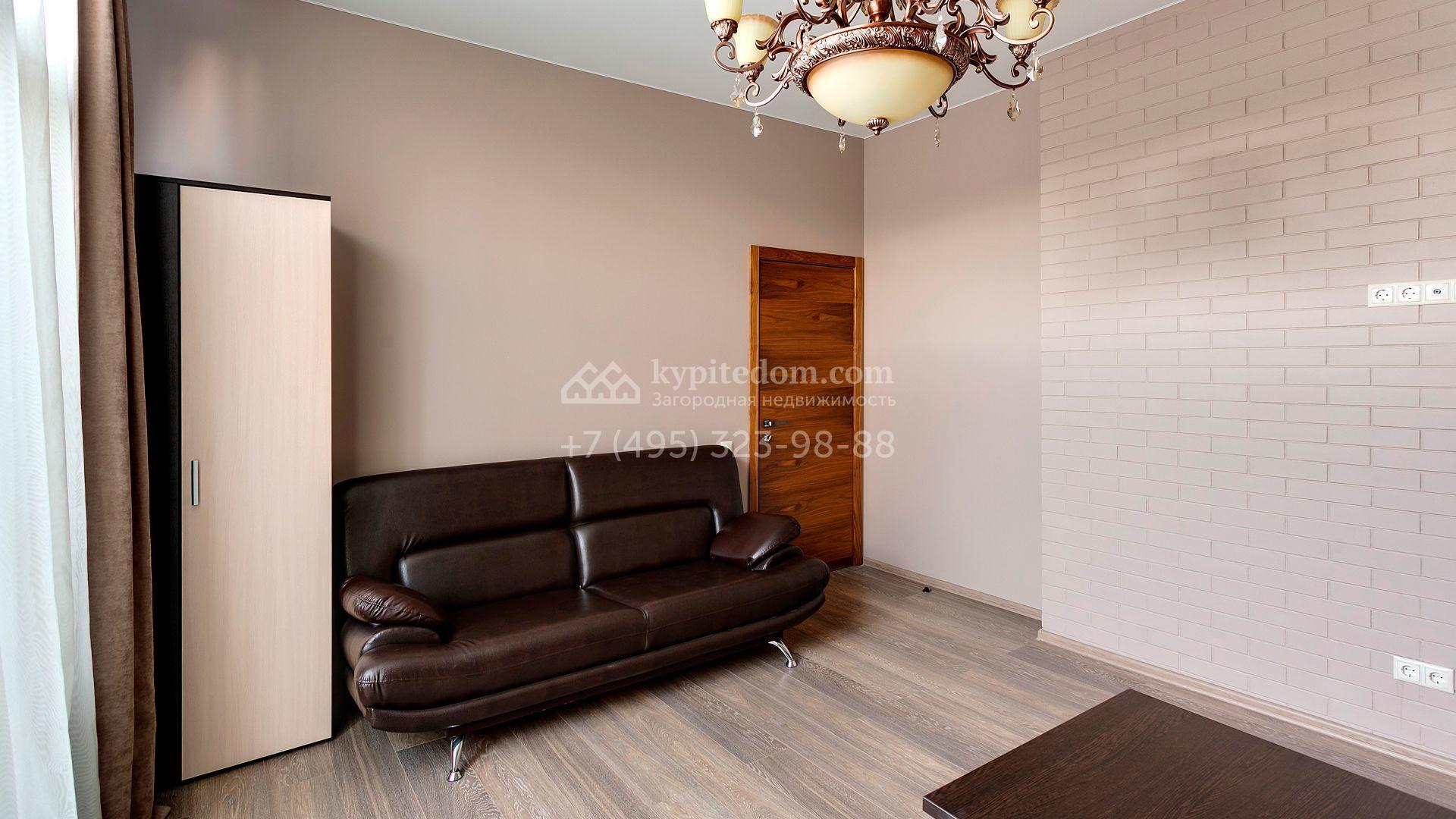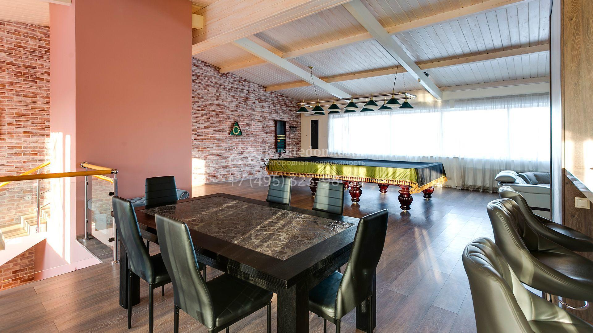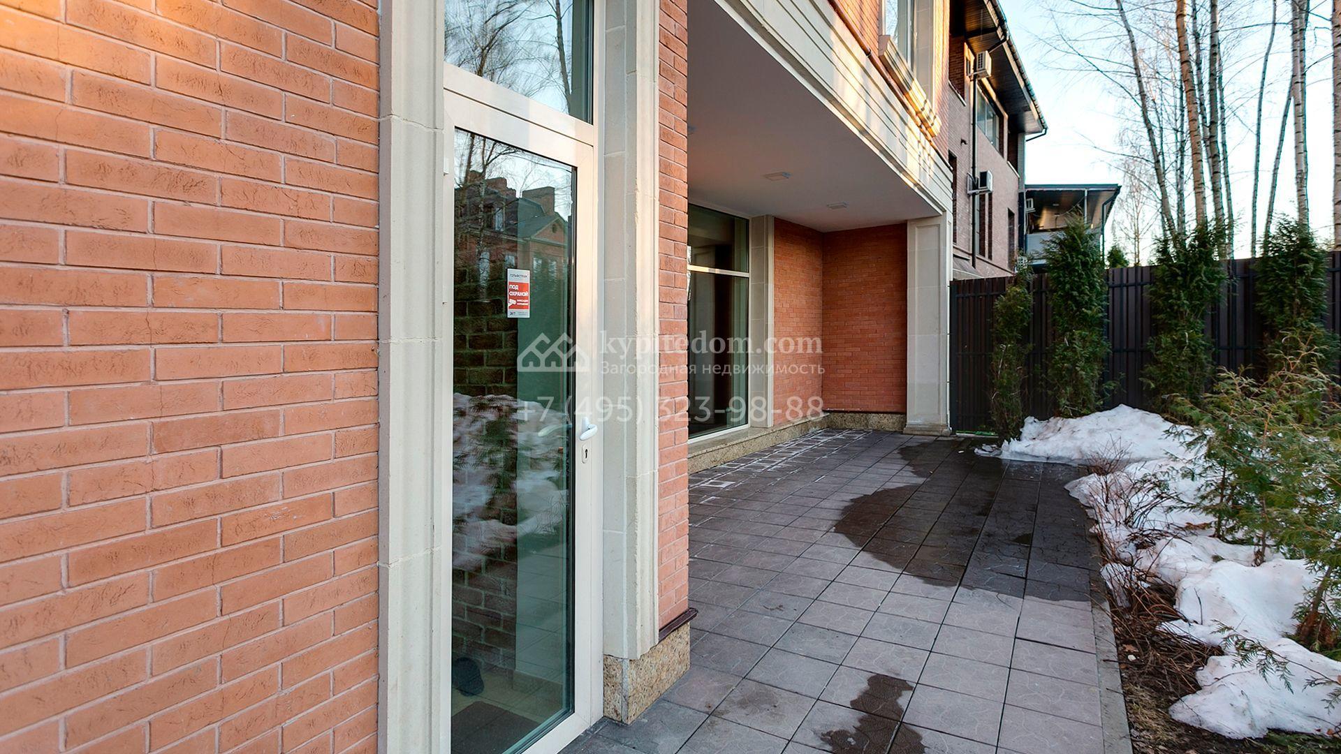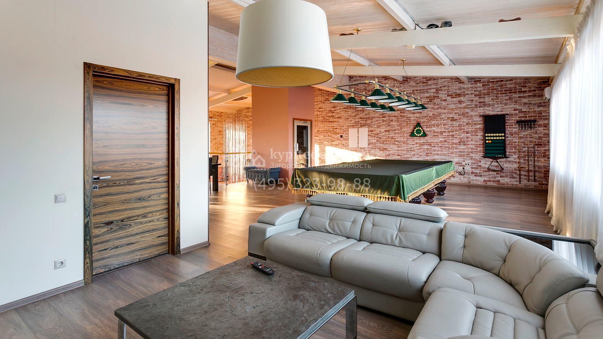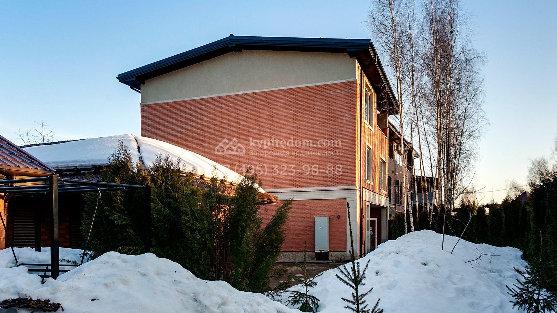 Трехэтажный таунхаус площадью 400 м² расположен на полевом участке 10 соток. Фасад выполнен из красного клинкерного кирпича, окна украшены белыми наличниками. Современный интерьер выполнен в теплой палитре оттенков, создающих атмосферу уюта. В доме спланировали 5 спален, гостиную-столовую-кухню, бильярдную с зоной отдыха и бассейн. На территории предусмотрены гараж на 2 машины, паркинг на 6 машин, баня с 2 гостевыми спальнями и зона барбекю. На участке выполнен ландшафтный дизайн, вымощены дорожки.
