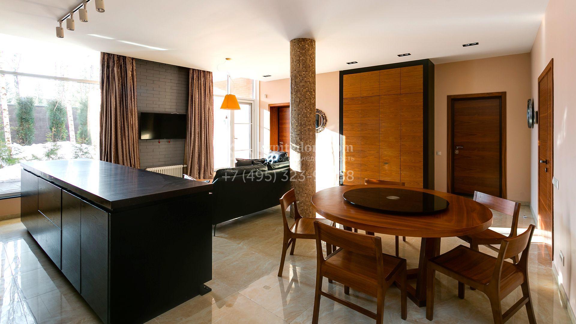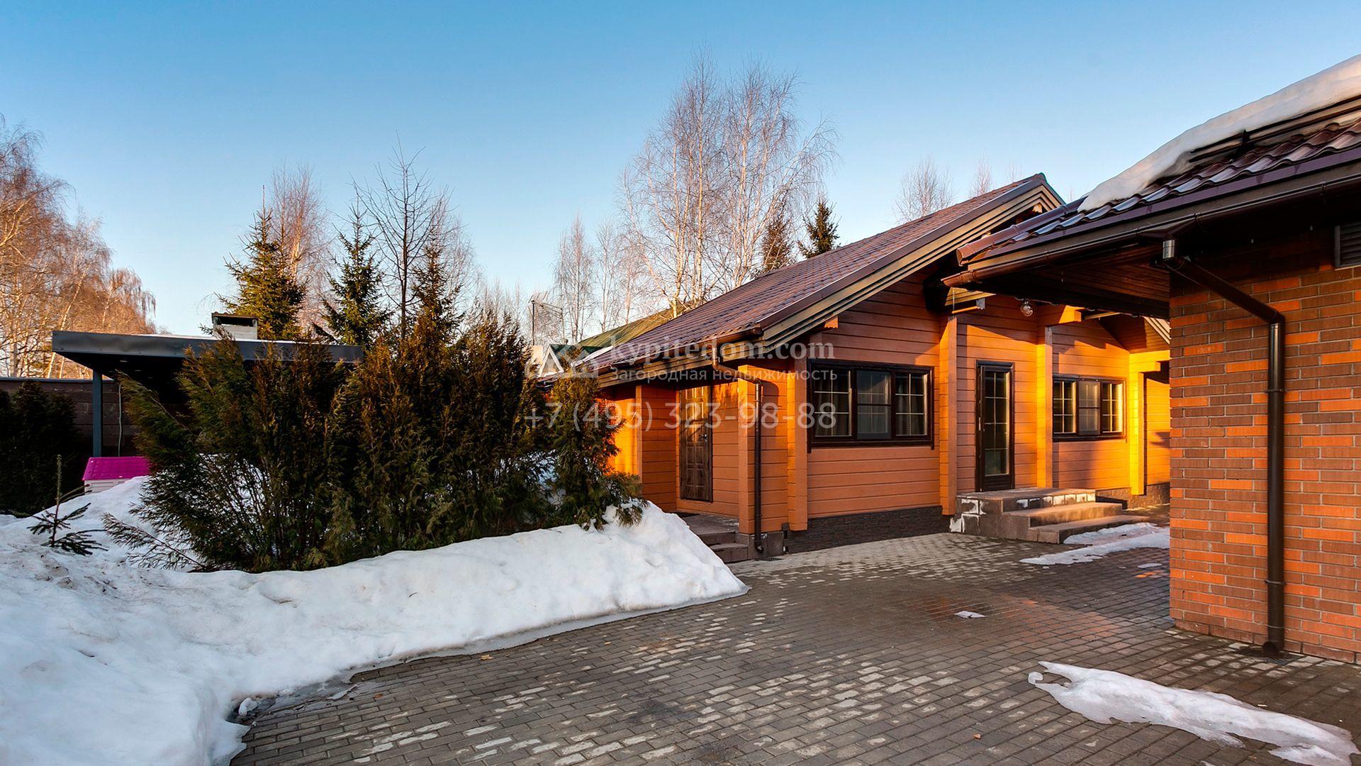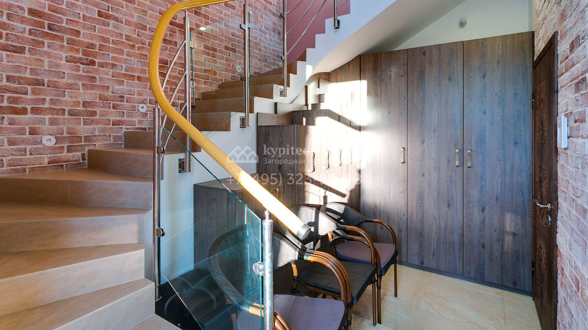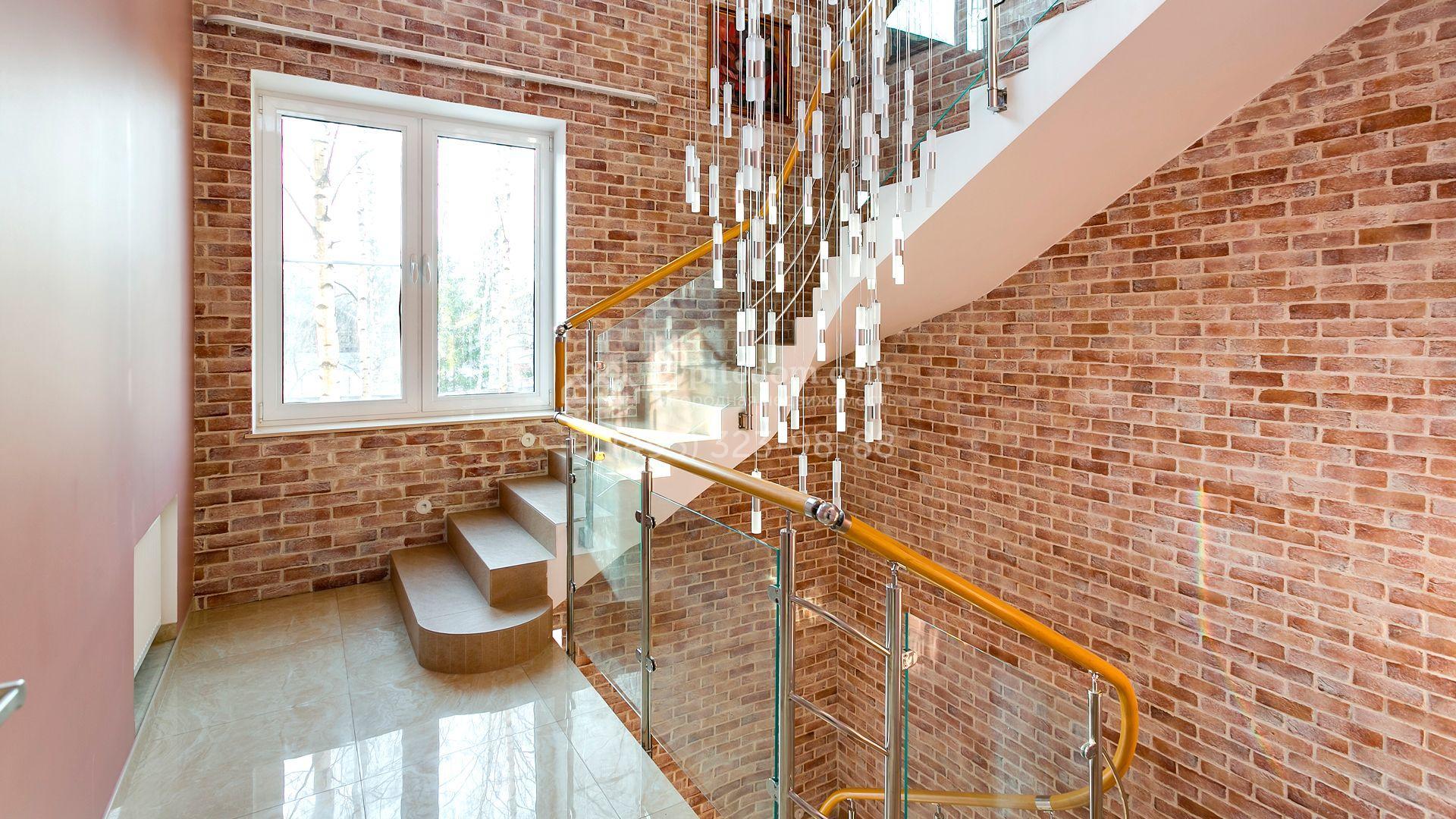 Трехэтажный таунхаус площадью 400 м² расположен на полевом участке 10 соток. Фасад выполнен из красного клинкерного кирпича, окна украшены белыми наличниками. Современный интерьер выполнен в теплой палитре оттенков, создающих атмосферу уюта. В доме спланировали 5 спален, гостиную-столовую-кухню, бильярдную с зоной отдыха и бассейн. На территории предусмотрены гараж на 2 машины, паркинг на 6 машин, баня с 2 гостевыми спальнями и зона барбекю. На участке выполнен ландшафтный дизайн, вымощены дорожки.