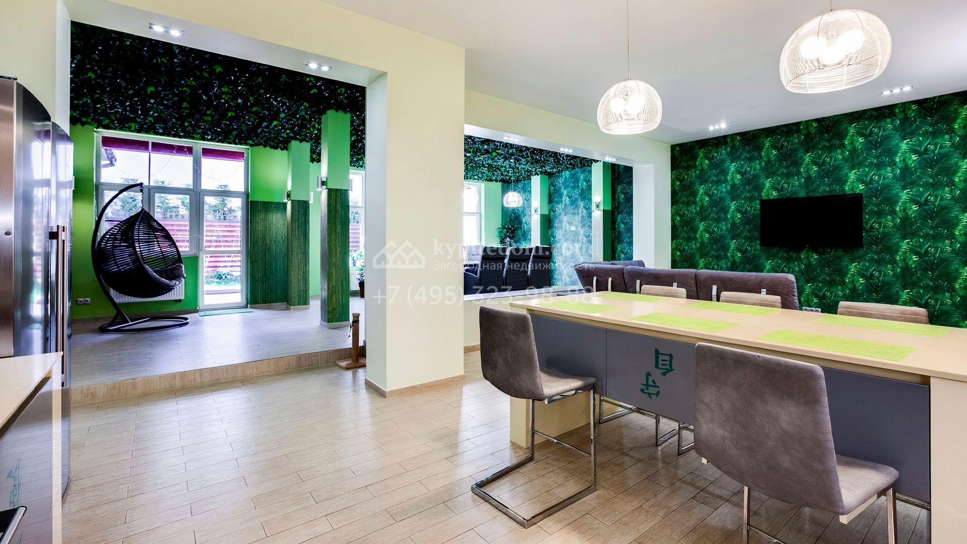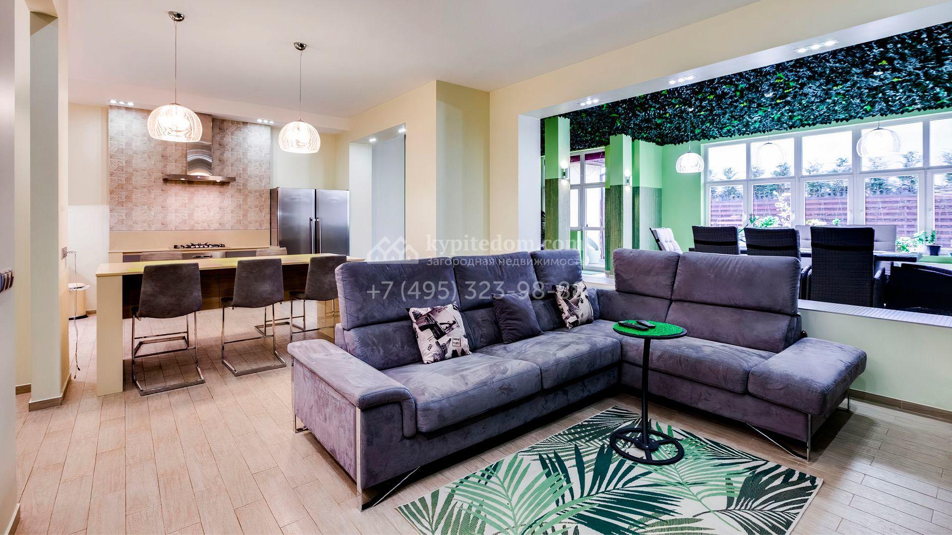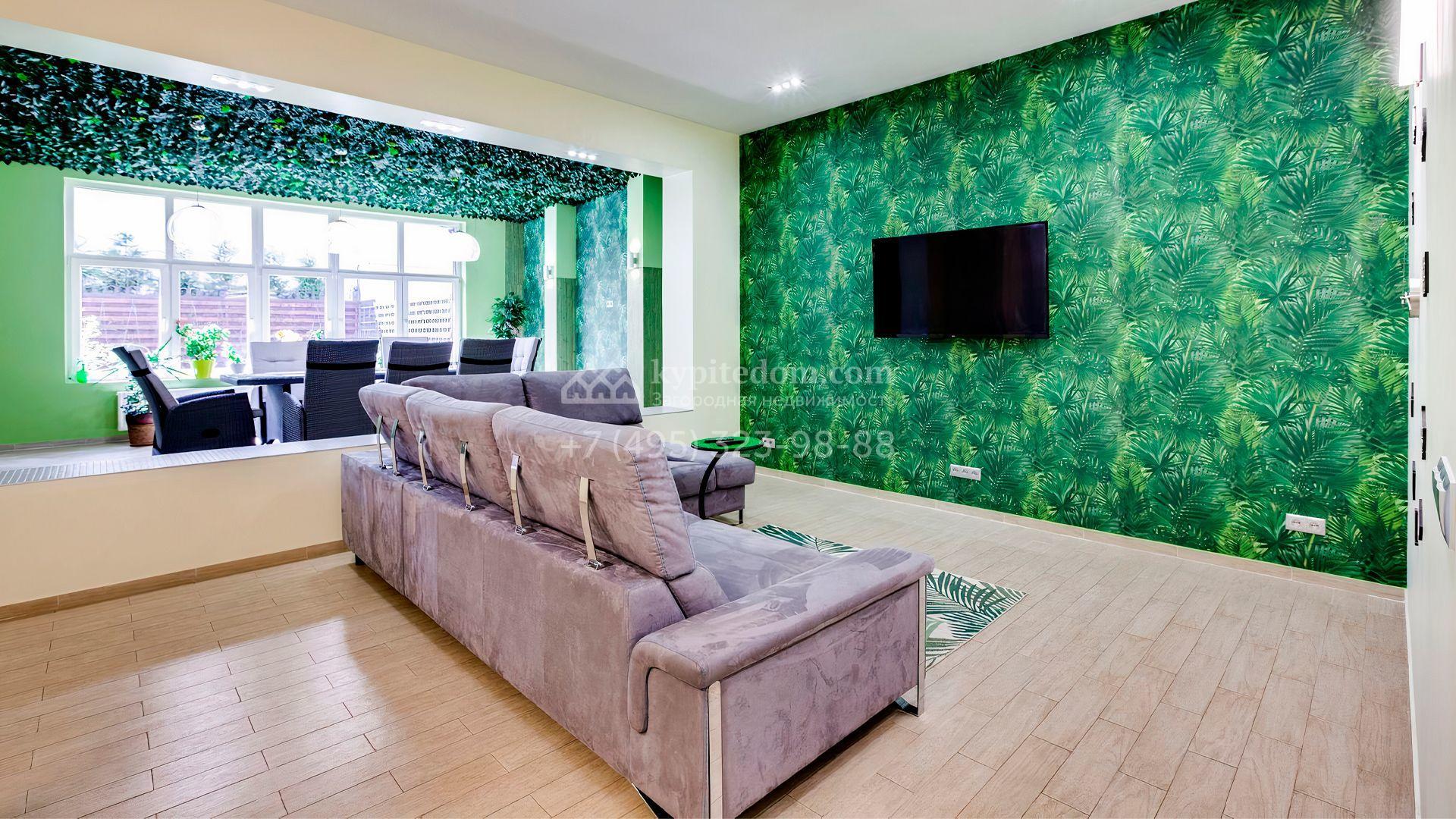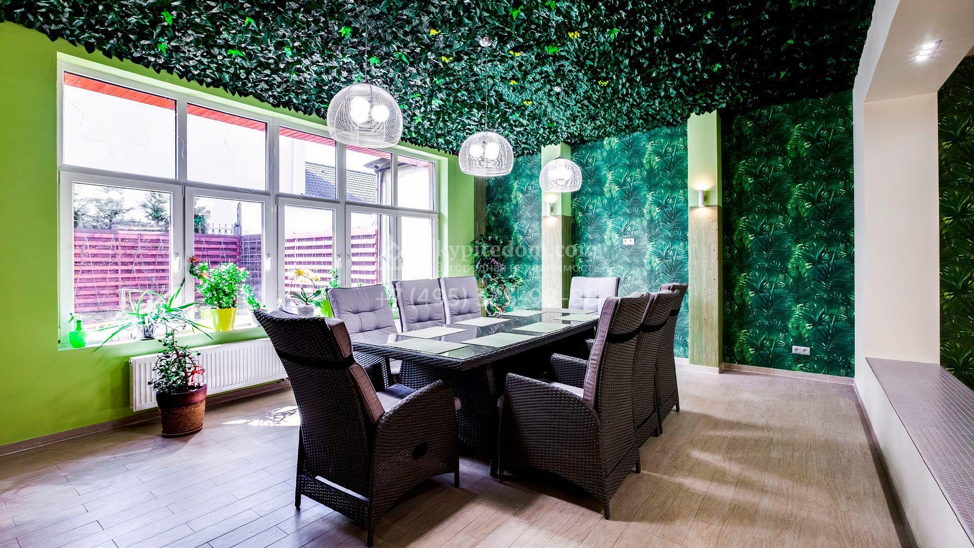 Уютный таунхаус площадью 370 м² расположен на полевом участке 2,7 сотки. Фасад в современном стиле облицован бежевой штукатуркой с вставками из клинкерной плитки. Интерьер наполнен тропическими мотивами и яркими зелеными акцентами. В доме разместили 5 спален, просторную гостиную, кухню, столовую, зимний сад с выходом на террасу. На участке засеян газон, оборудована зона барбекю.