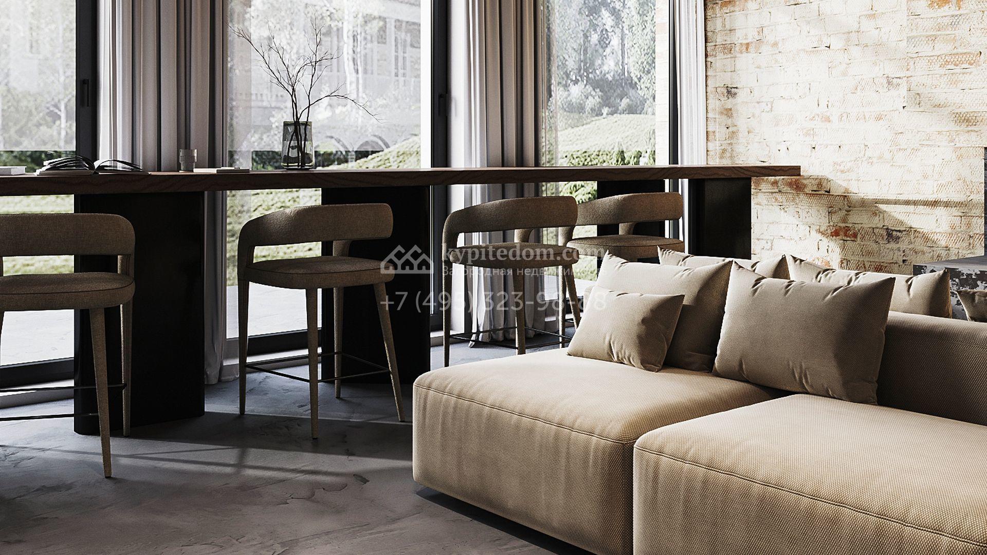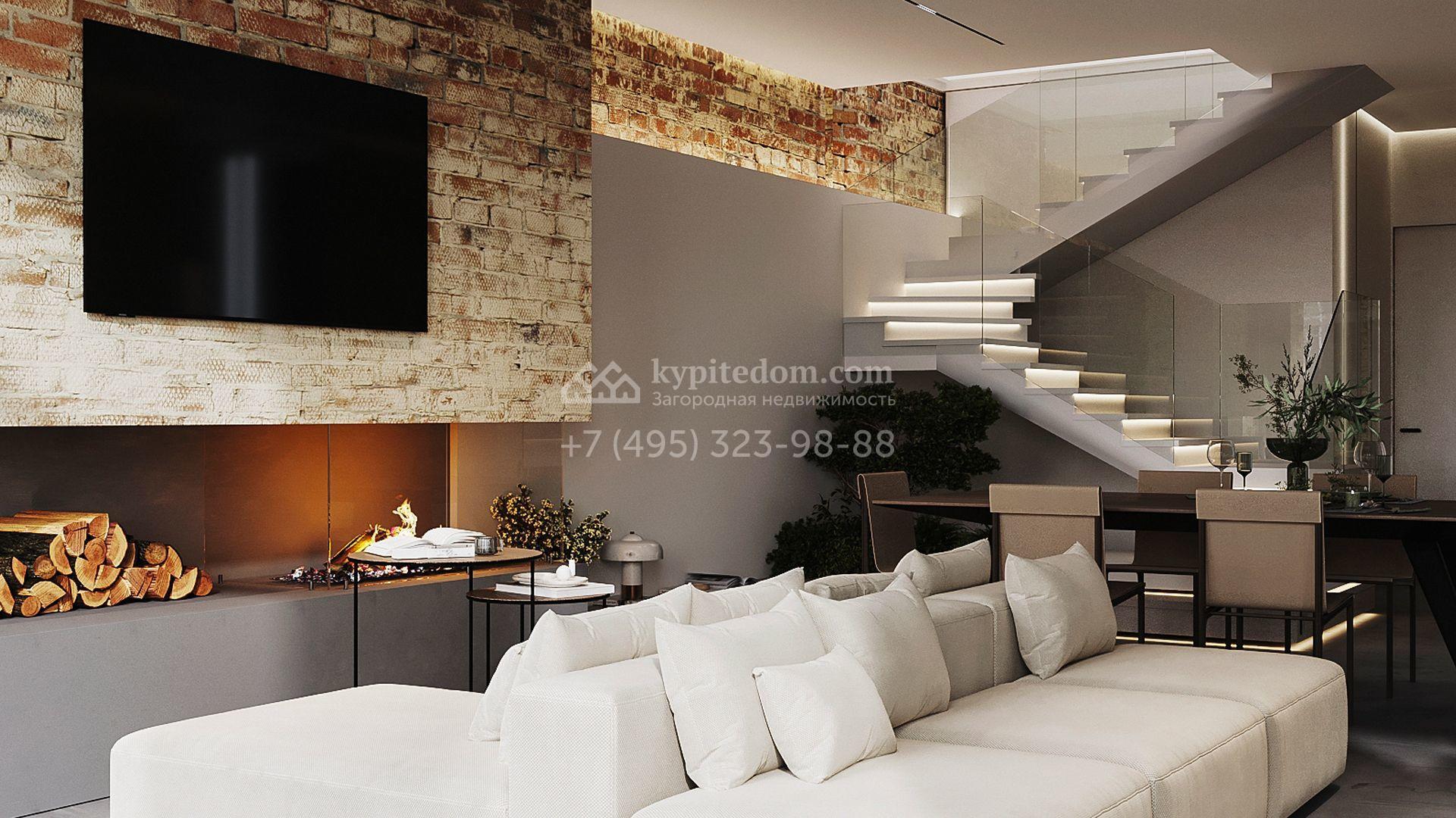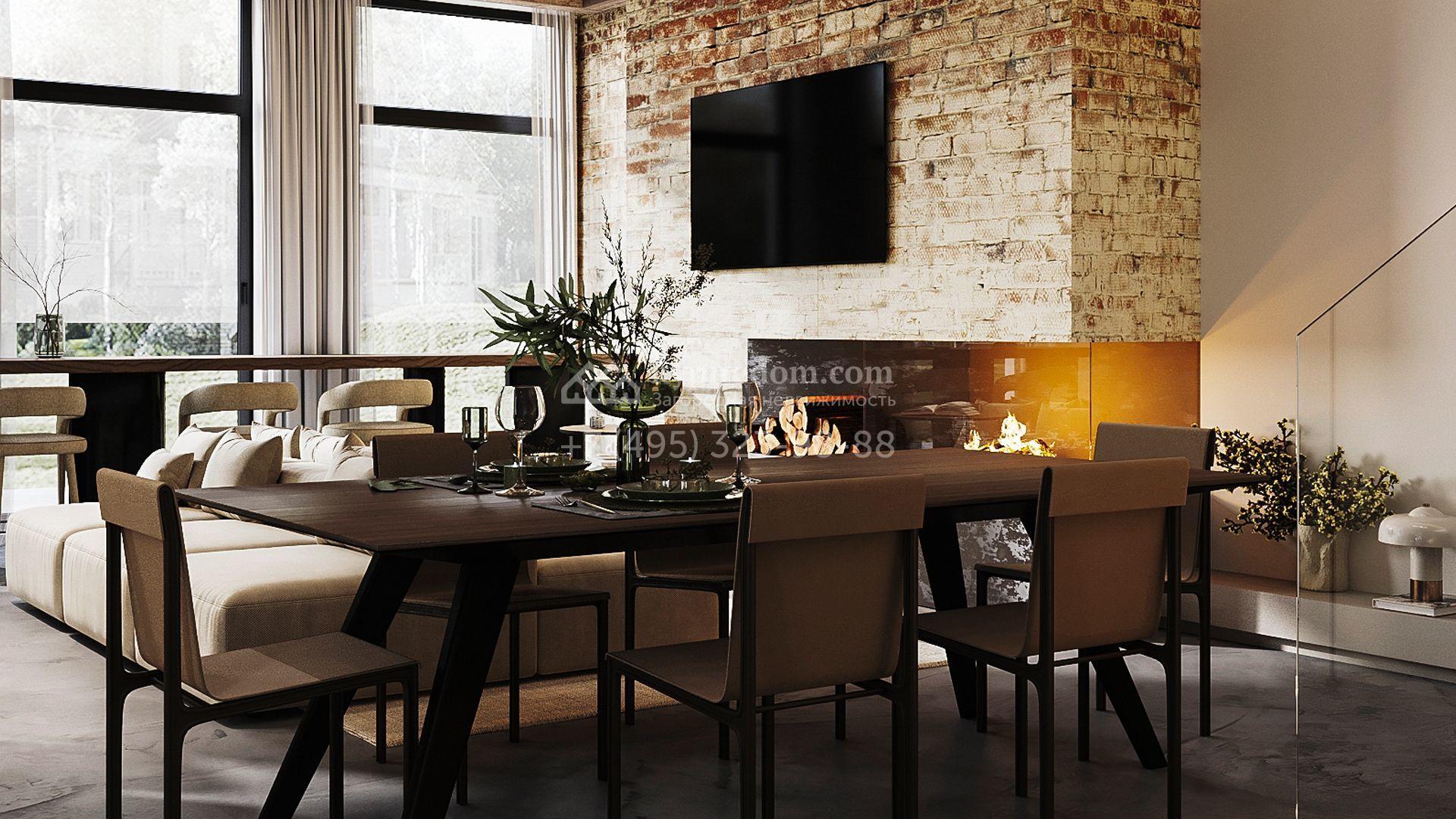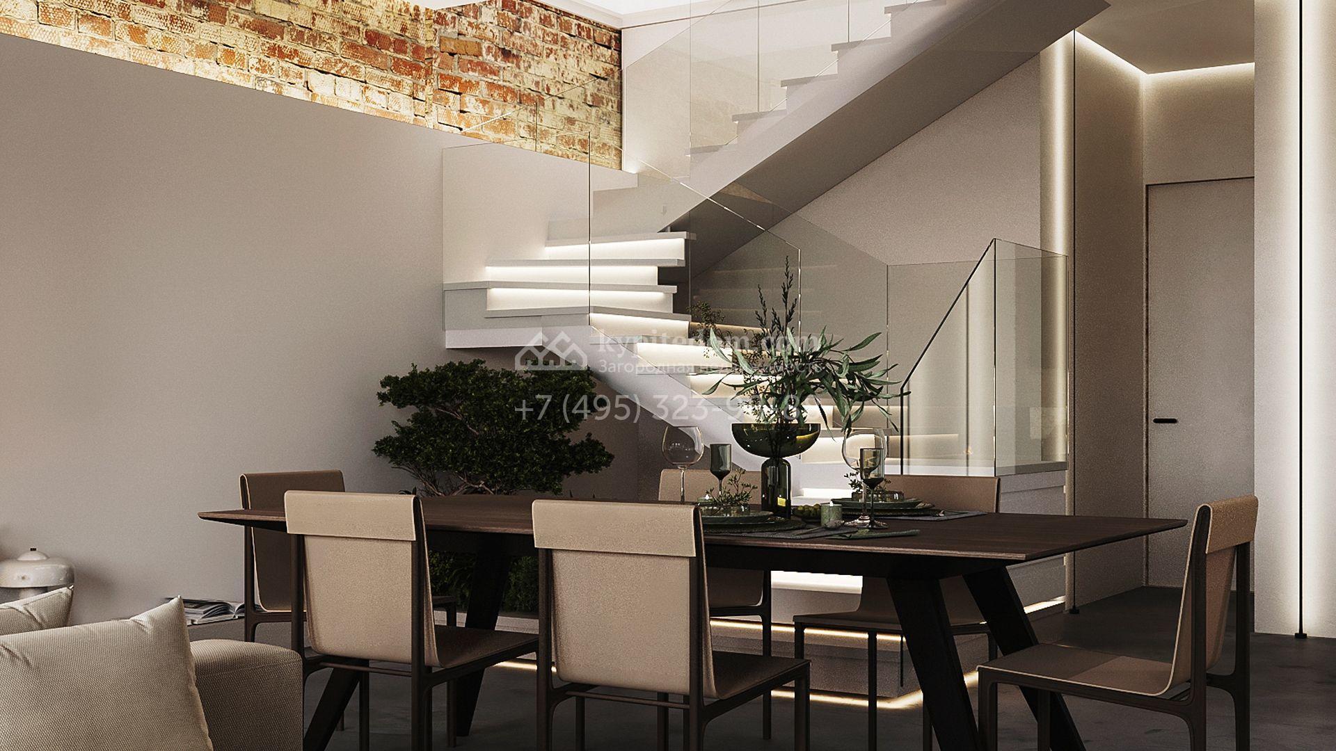 Трехуровневый таунхаус площадью 363 м² расположен на уютном участке 5 соток. Интерьер оформлен в стиле «лофт» с использованием теплых приглушенных оттенков, имитации кирпичной кладки и подсветки. В резиденции разместили 5 спален, уютную гостиную-кухню с камином и выходом на террасу, дровяную сауну и 2 комнаты, в которых можно обустроить зоны отдыха и досуга. Участок подойдет для размещения барбекю.