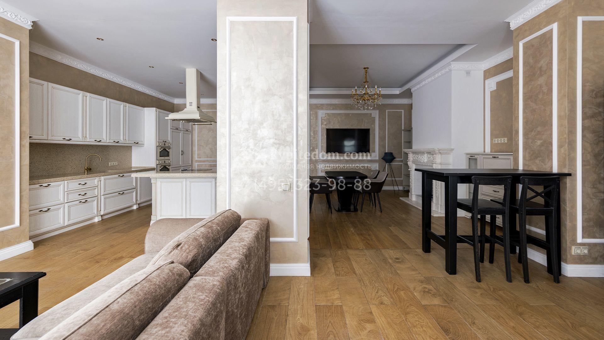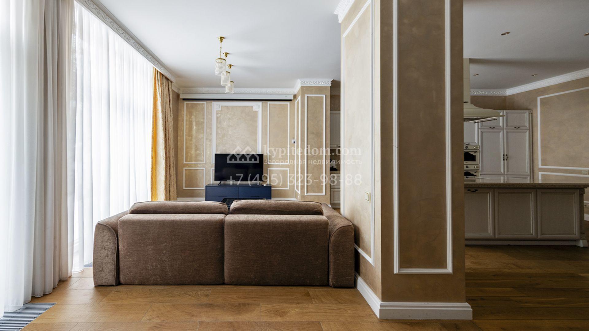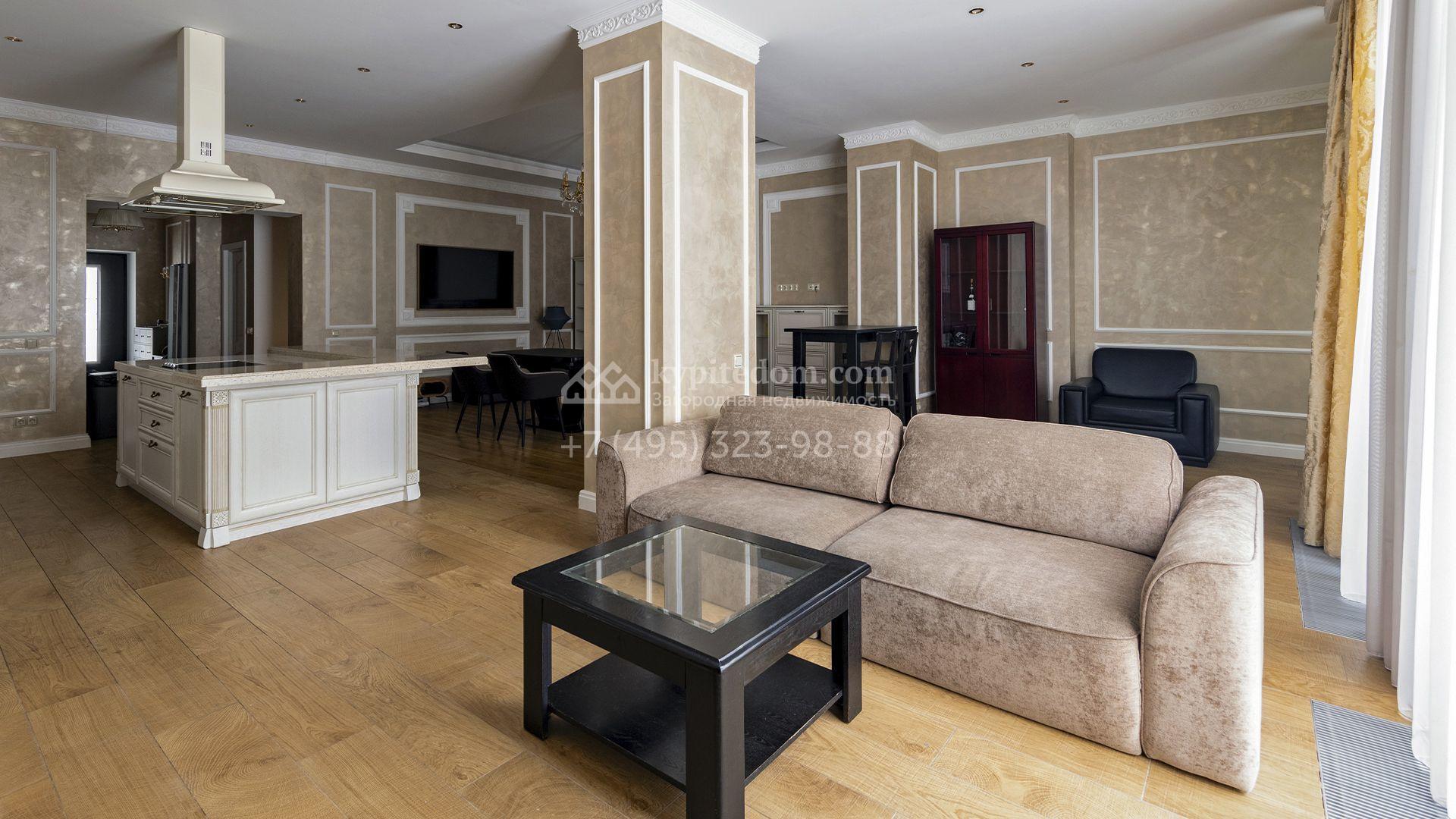 Загородный таунхаус площадью 265 м² расположен на полевом участке 3 сотки, на тихой улице в самом сердце посёлка. Современный фасад гармонично сочетает фактуры дерева и благородного травертина. Панорамные окна открывают живописные виды и наполняют внутренние пространства солнечными лучами. Интерьеры, выполненные в неоклассическом стиле, выдержаны в светлых тонах, украшены изящными молдингами и люстрами, а также укомплектованы комфортной мебелью. Кондиционирование и система «тёплый пол» поддерживают идеальный микроклимат в течение всего года.