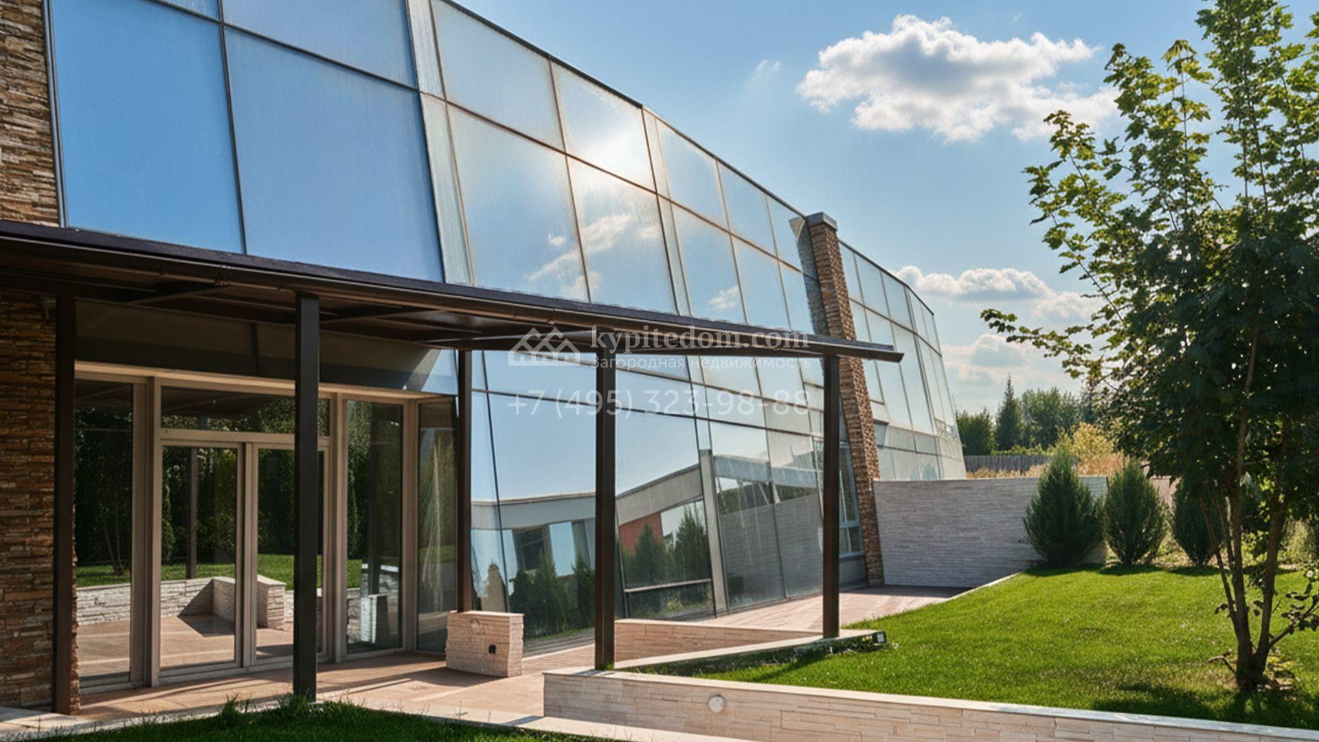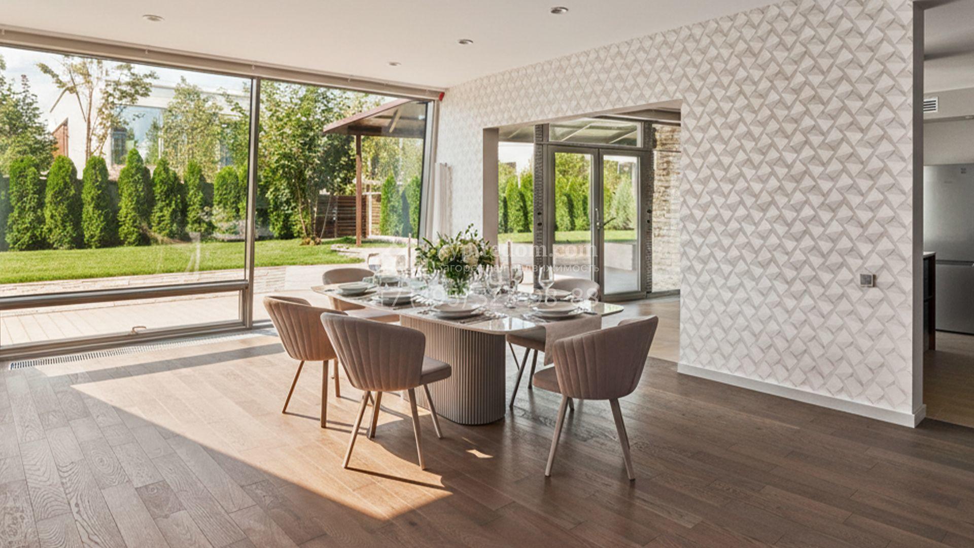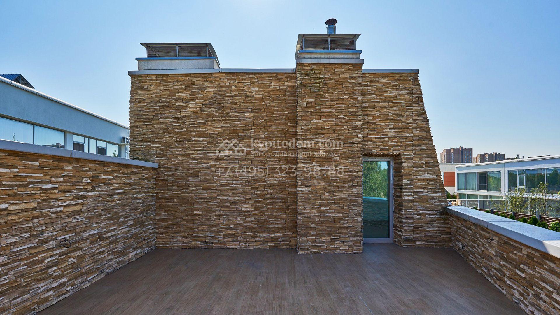 Загородный таунхаус площадью 355 м² расположен на полевом участке 5 соток в центральной части посёлка. Фасад, выполненный в стиле хай-тек, эффектно сочетает фактуры камня и стекла. Панорамные окна наполняют внутренние пространства солнцем, визуально расширяя их.