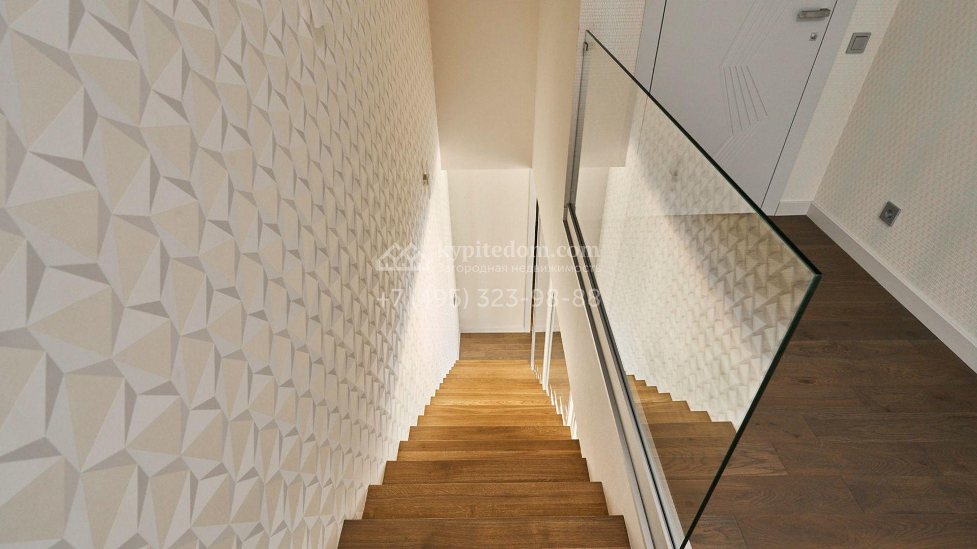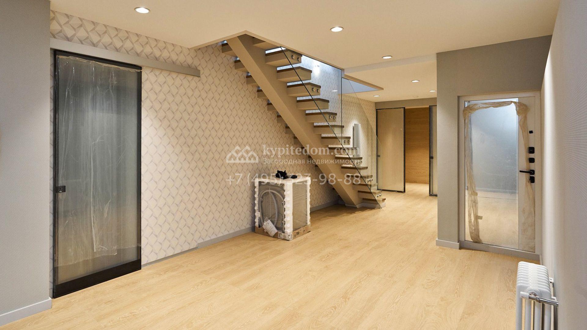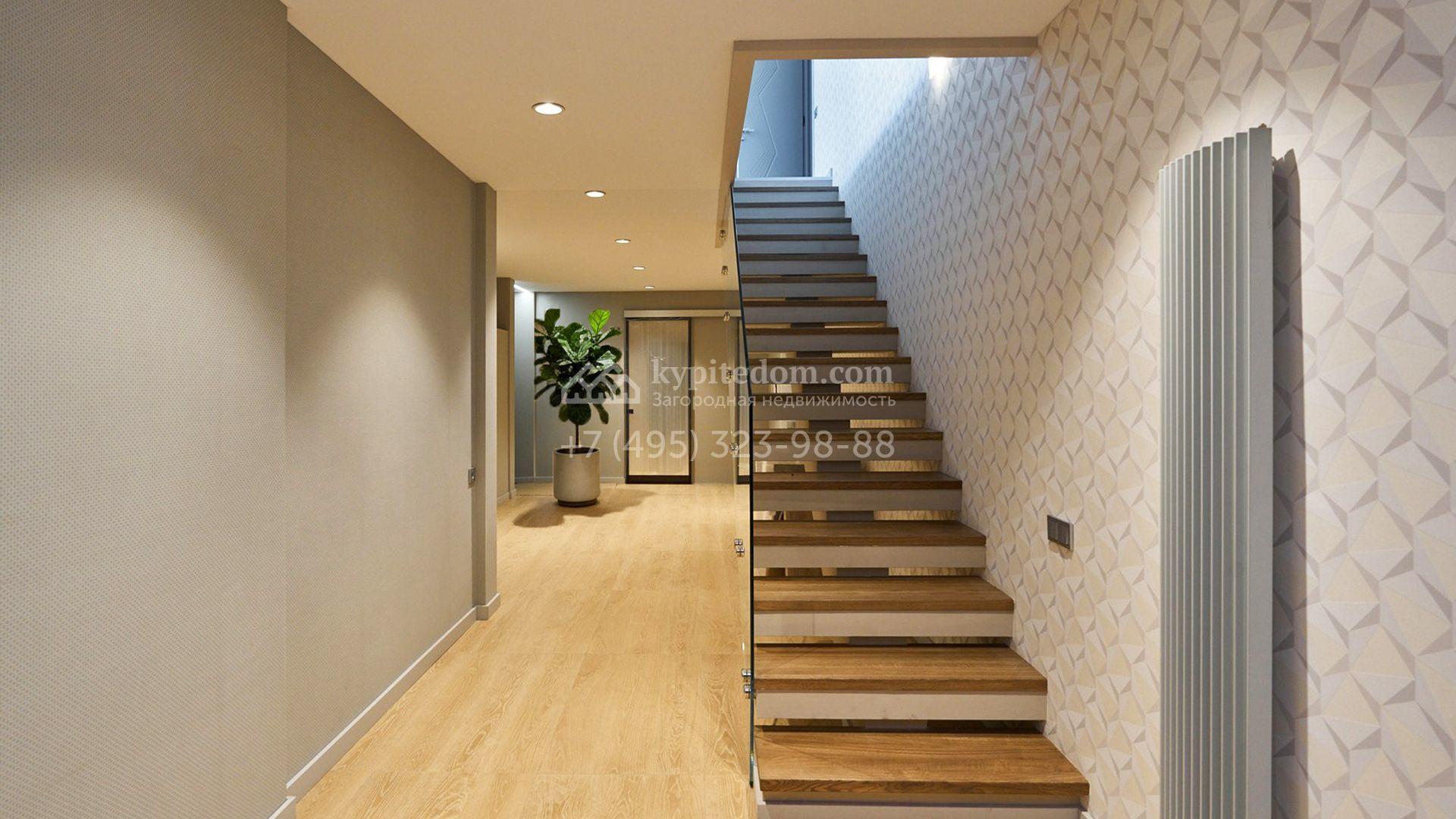 Загородный таунхаус площадью 355 м² расположен на полевом участке 5 соток в центральной части посёлка. Фасад, выполненный в стиле хай-тек, эффектно сочетает фактуры камня и стекла. Панорамные окна наполняют внутренние пространства солнцем, визуально расширяя их.
