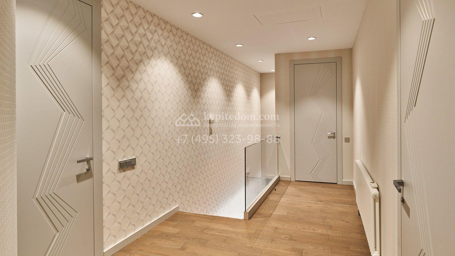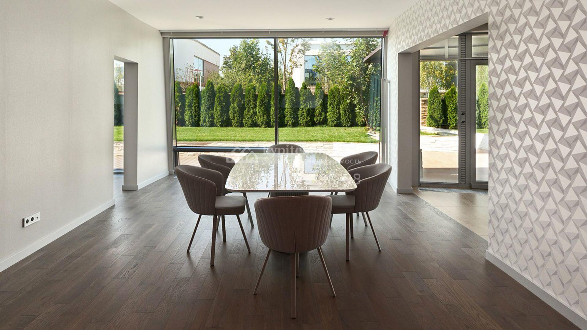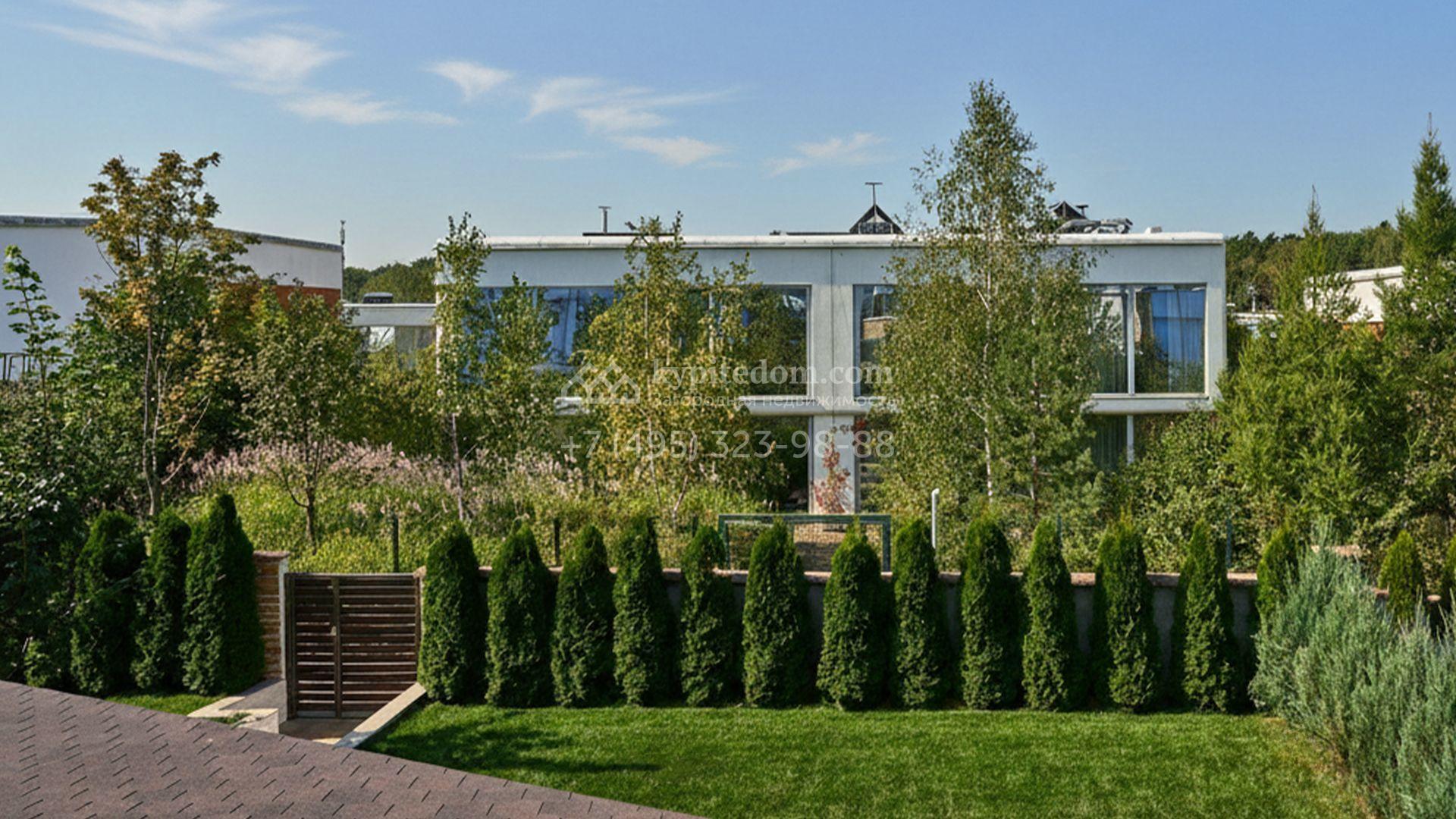 Планировка включает гостиную, кухню-столовую с удобным островом, три уютные спальни, четыре гардеробные и две просторные террасы, на которых будет приятно провести вечер в кругу близких и насладиться живописными видами. Оставить машины можно во встроенном двухместном гараже. Участок благоустроен — здесь засеян аккуратный газон, проложены дорожки, а по периметру высажены стройные туи, формирующие атмосферу приватности.
