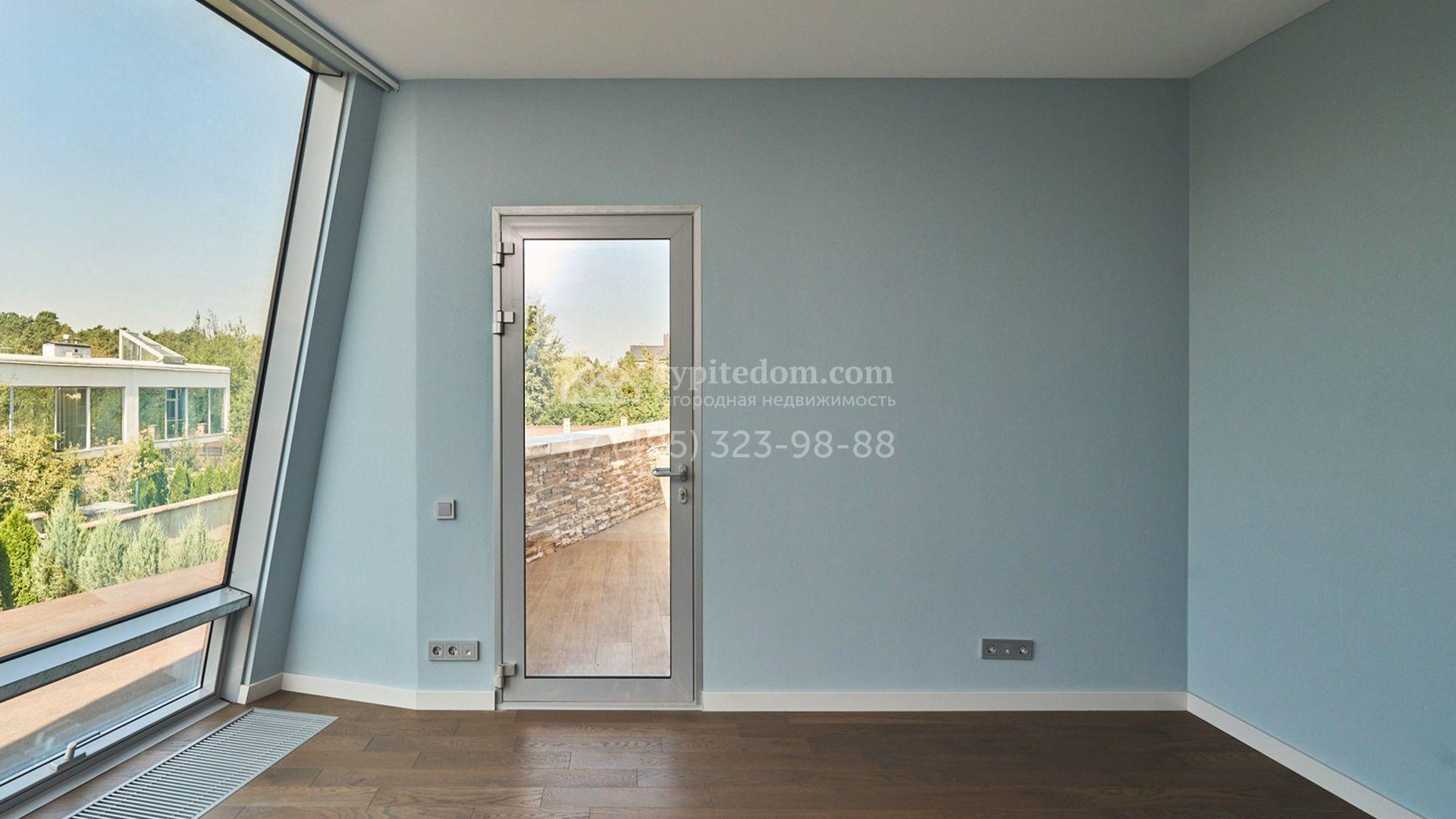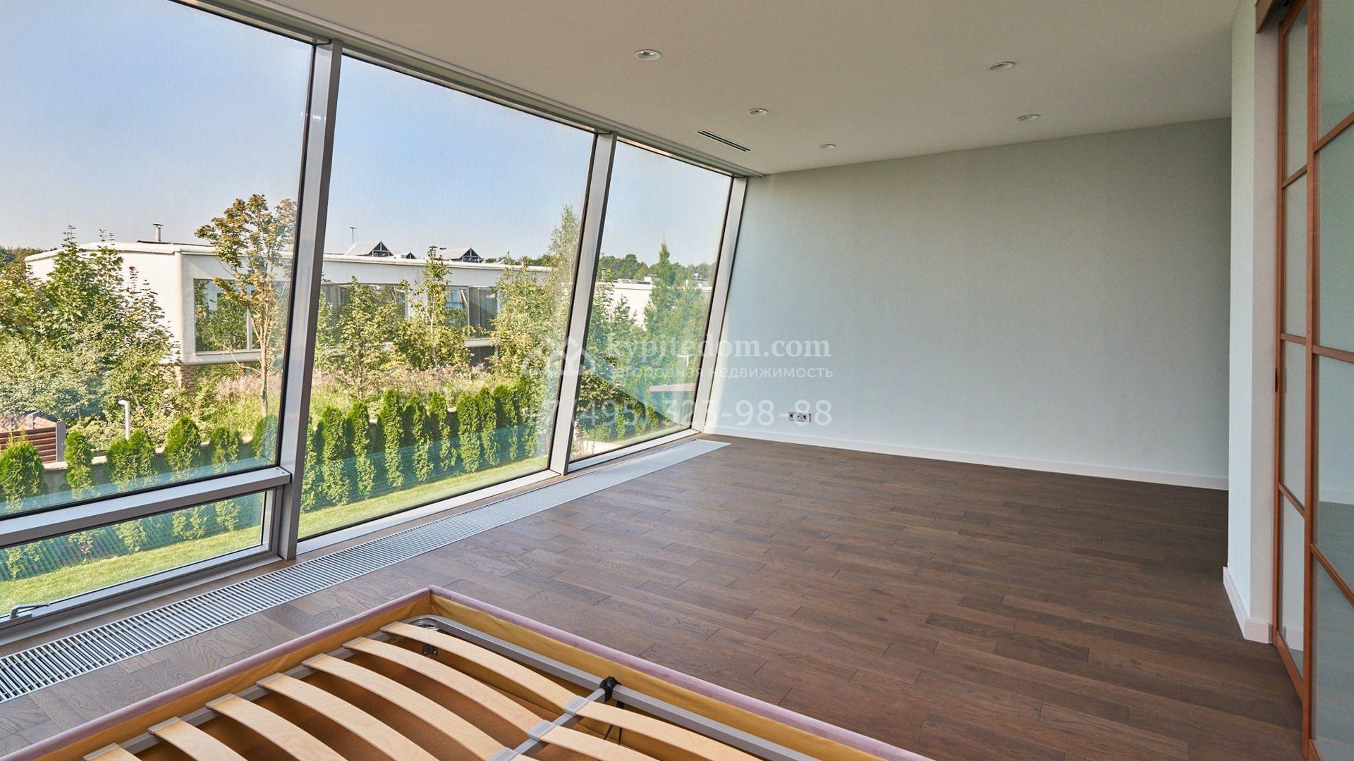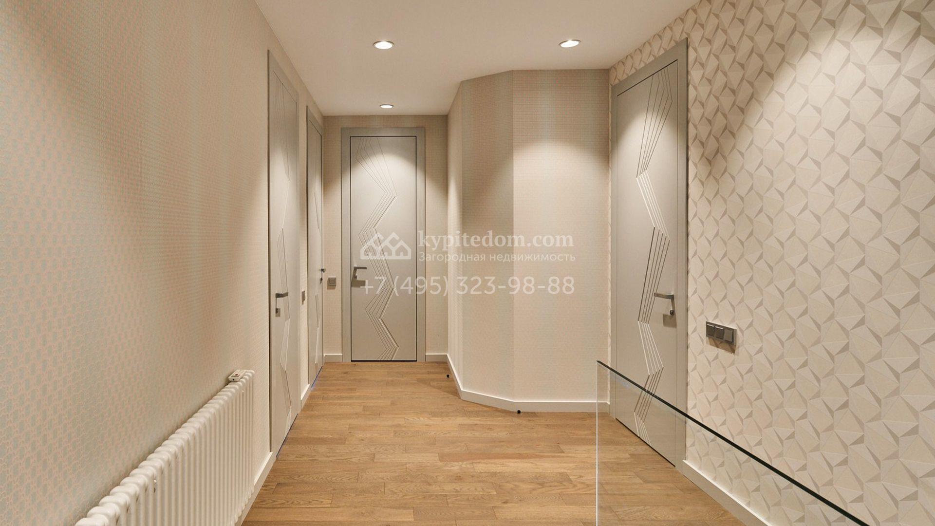 Планировка включает гостиную, кухню-столовую с удобным островом, три уютные спальни, четыре гардеробные и две просторные террасы, на которых будет приятно провести вечер в кругу близких и насладиться живописными видами. Оставить машины можно во встроенном двухместном гараже. Участок благоустроен — здесь засеян аккуратный газон, проложены дорожки, а по периметру высажены стройные туи, формирующие атмосферу приватности.