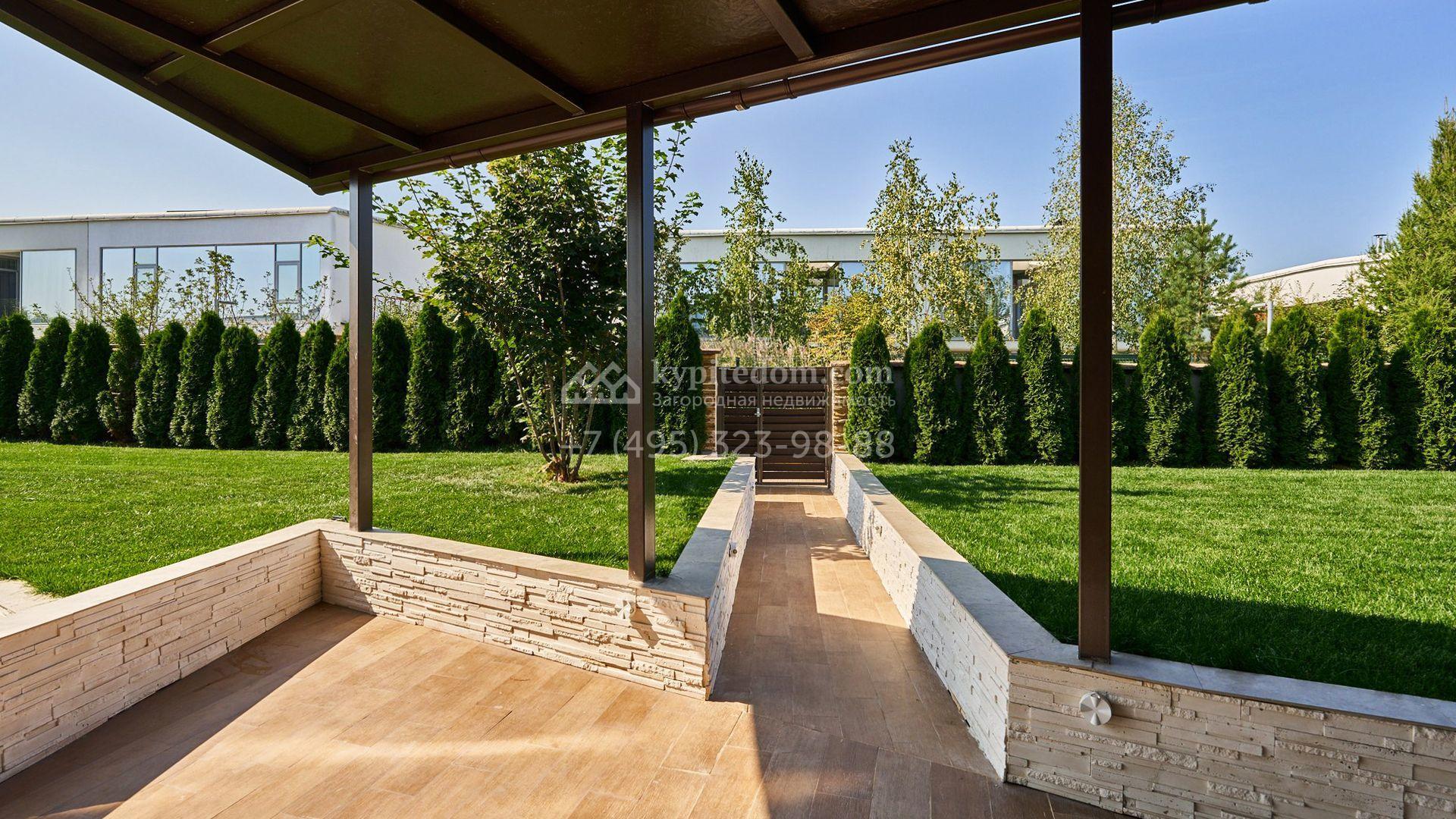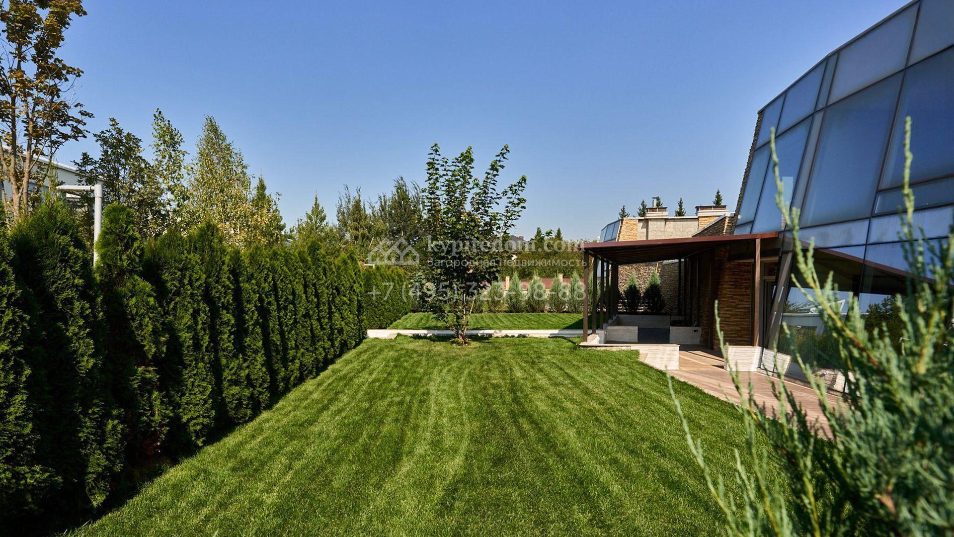 Планировка включает гостиную, кухню-столовую, три спальни, четыре гардеробные и две просторные террасы, на которых будет приятно провести вечер в кругу близких и насладиться живописными видами. Оставить машины можно во встроенном двухместном гараже. Участок благоустроен — здесь засеян аккуратный газон, проложены дорожки, а по периметру высажены стройные туи, формирующие атмосферу приватности.