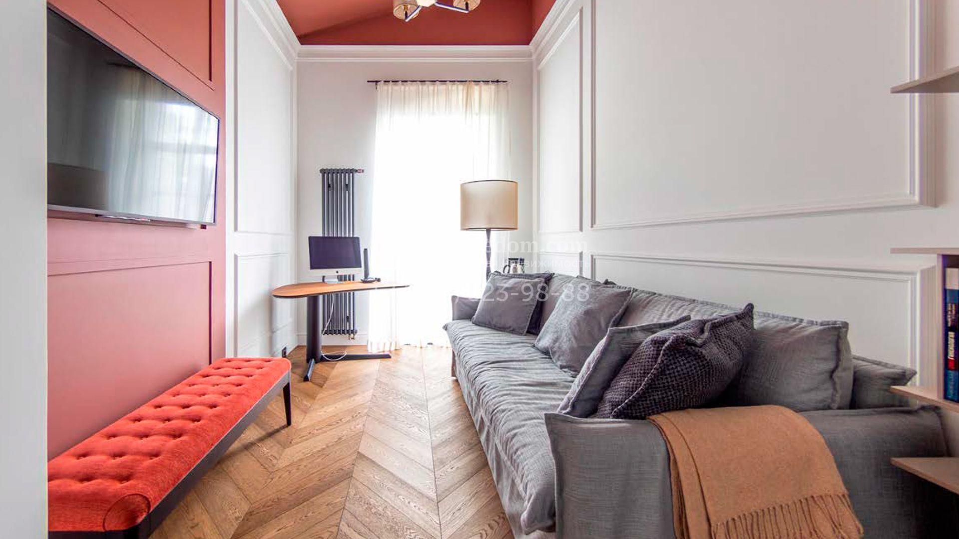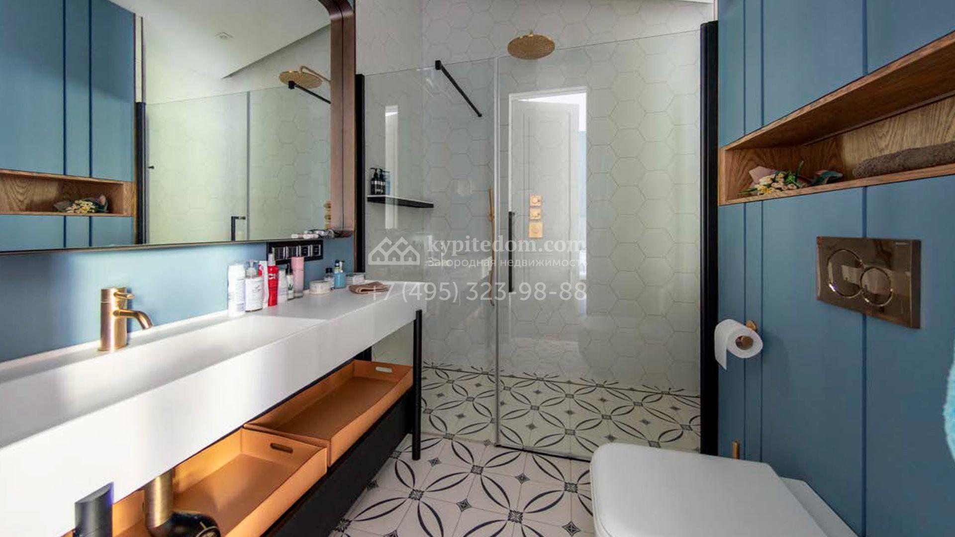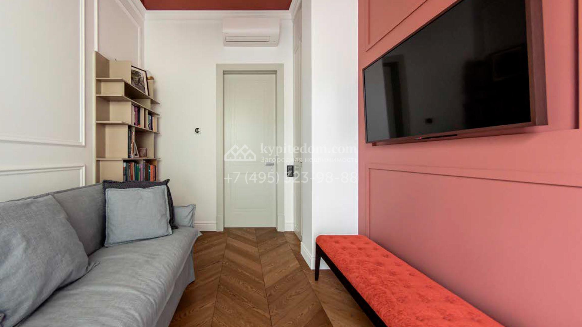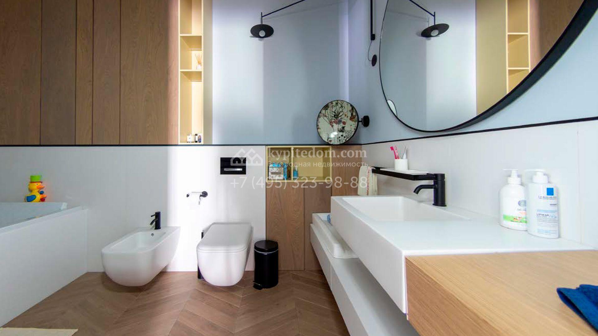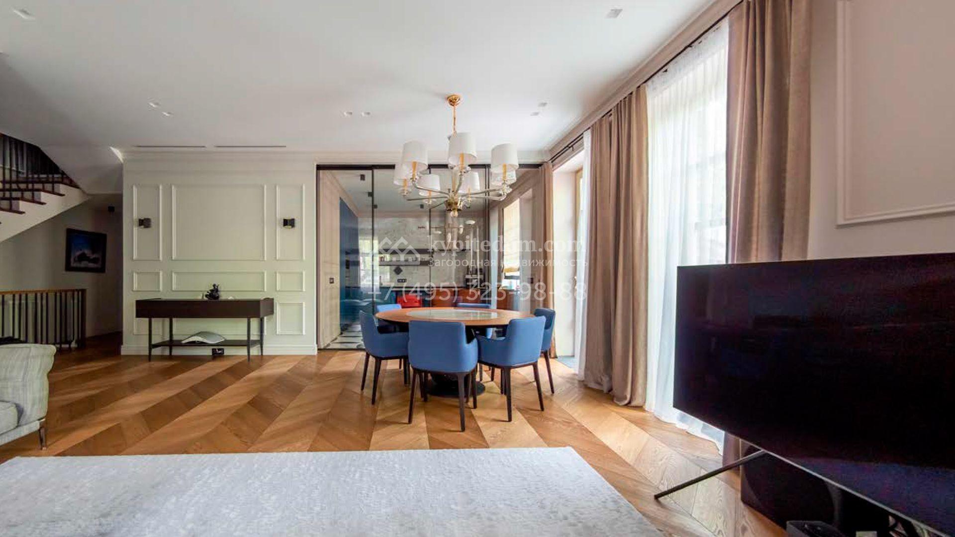 Уютный таунхаус площадью 170 м² расположен на облагороженном лесном участке 2,5 сотки. Фасад в английском стиле облицован красно-коричневым клинкерным кирпичом, установлены белые массивные рамы с коваными чугунными балконами. Классический интерьер сочетает светлые мягкие оттенки и фактуру дерева. В доме спланировали 2 спальни, уютную гостиную с камином, кухню, кабинет и сауну. Предусмотрены терраса 19 м² и парковочное место.
