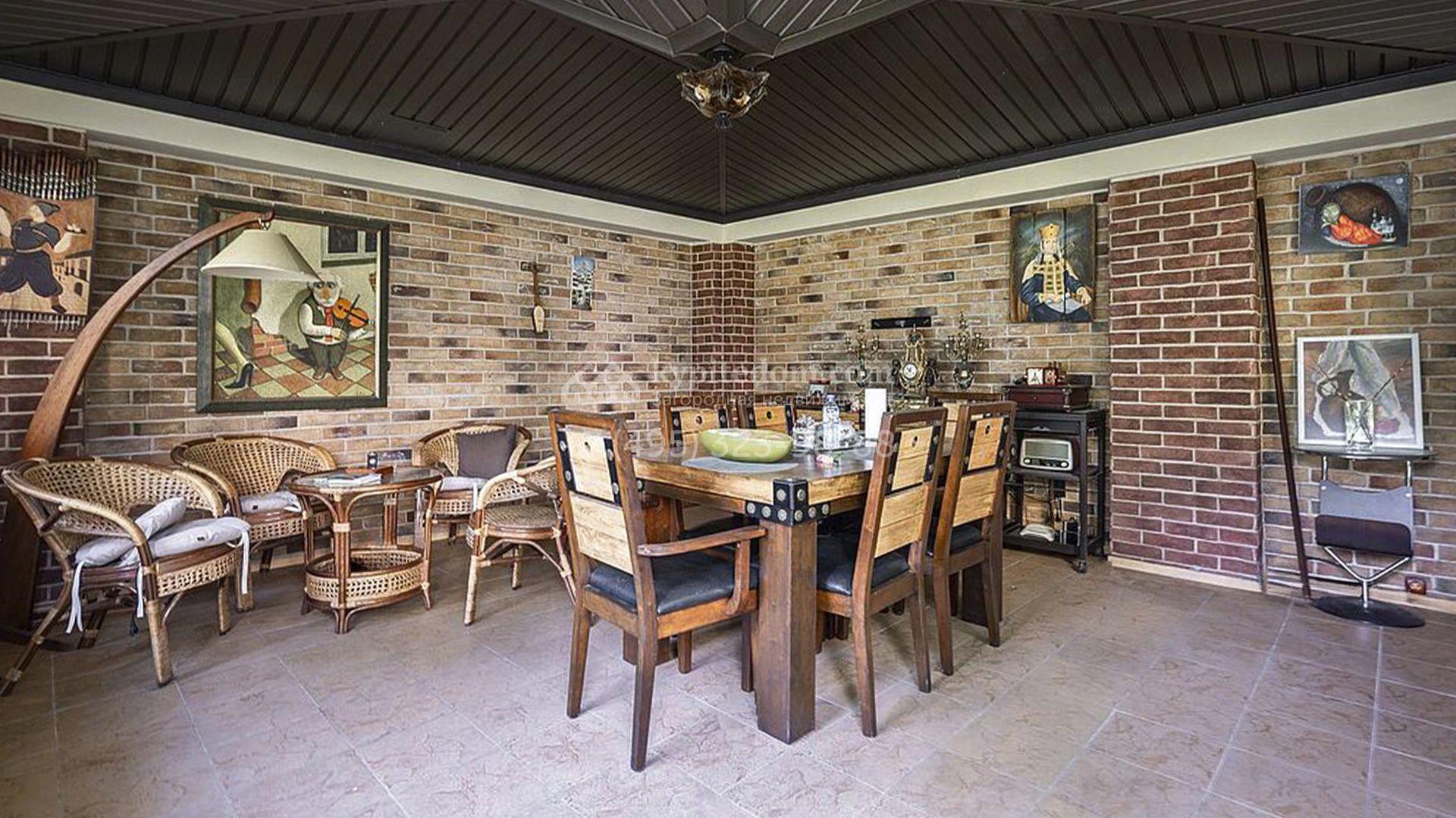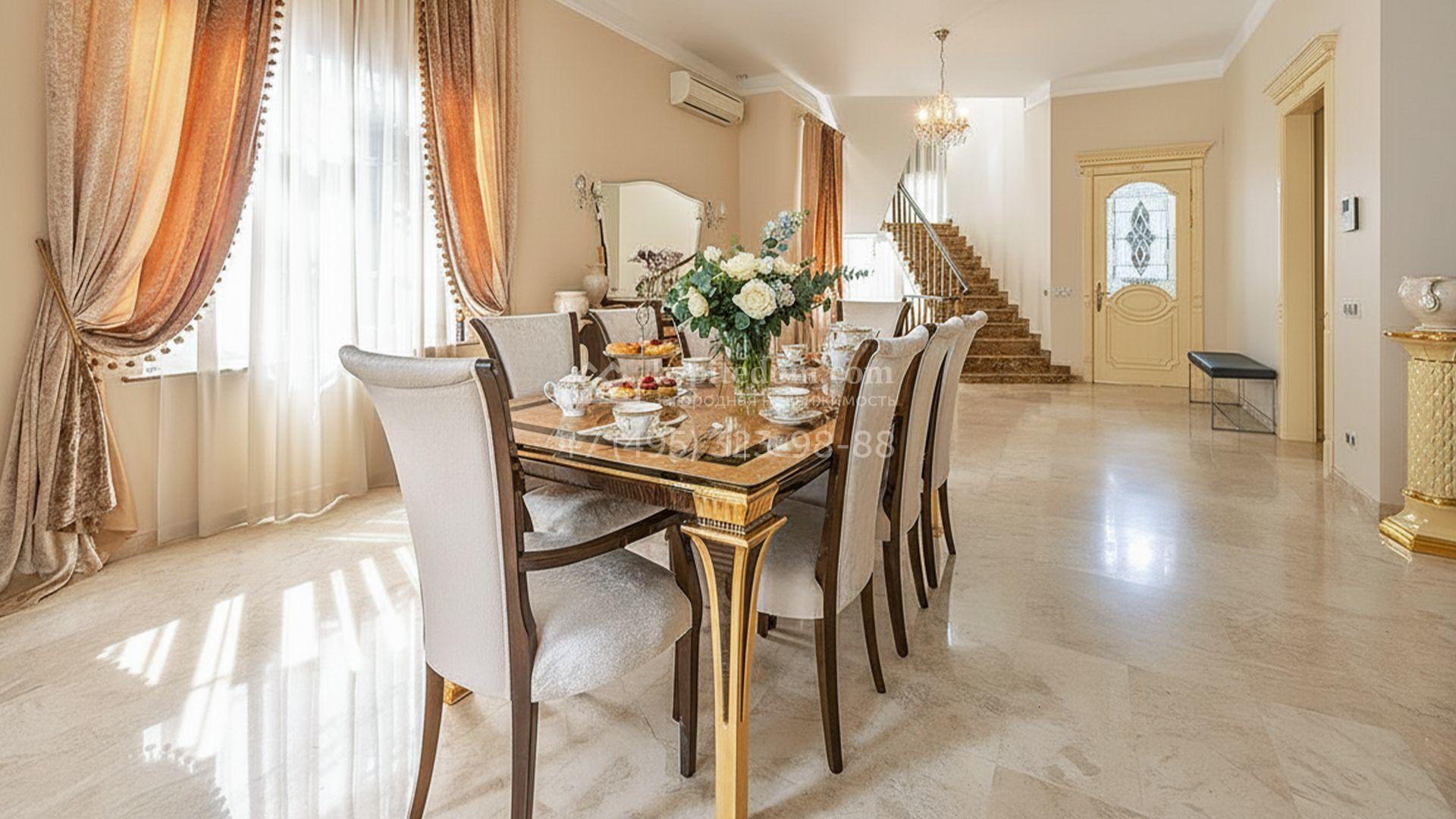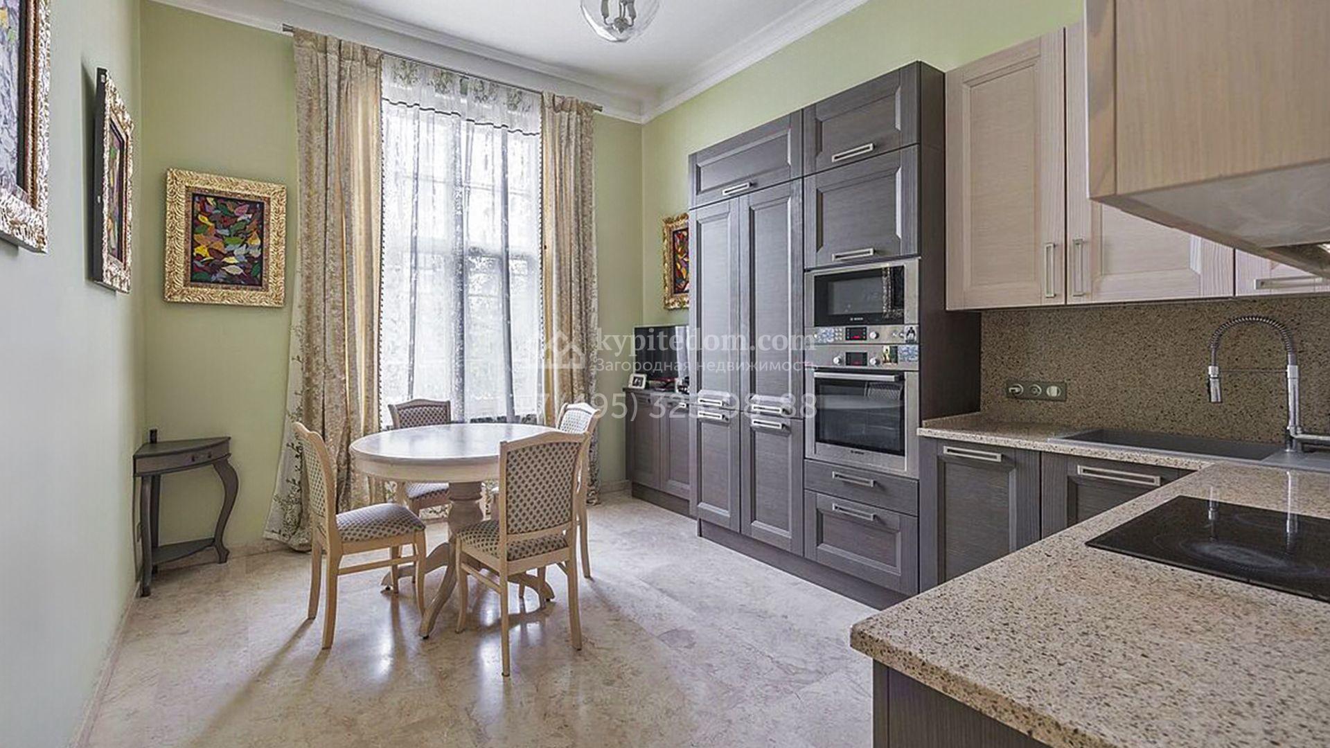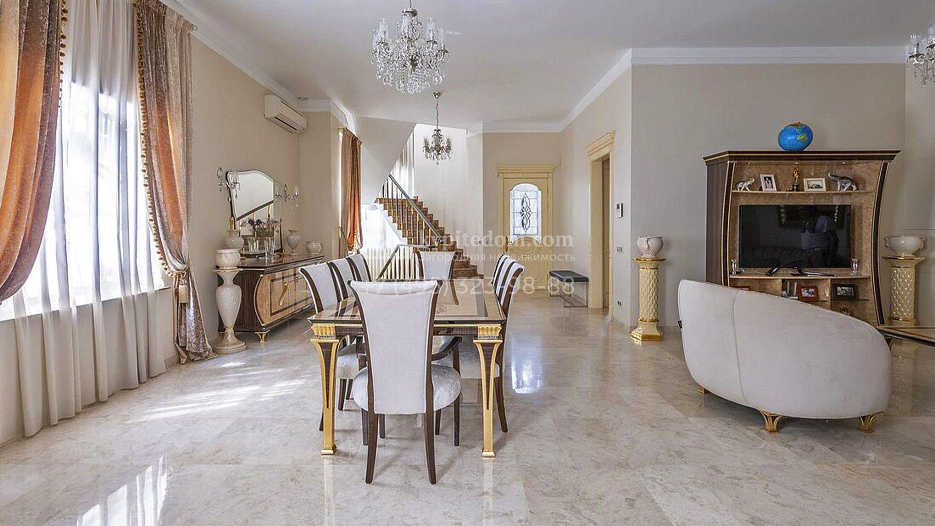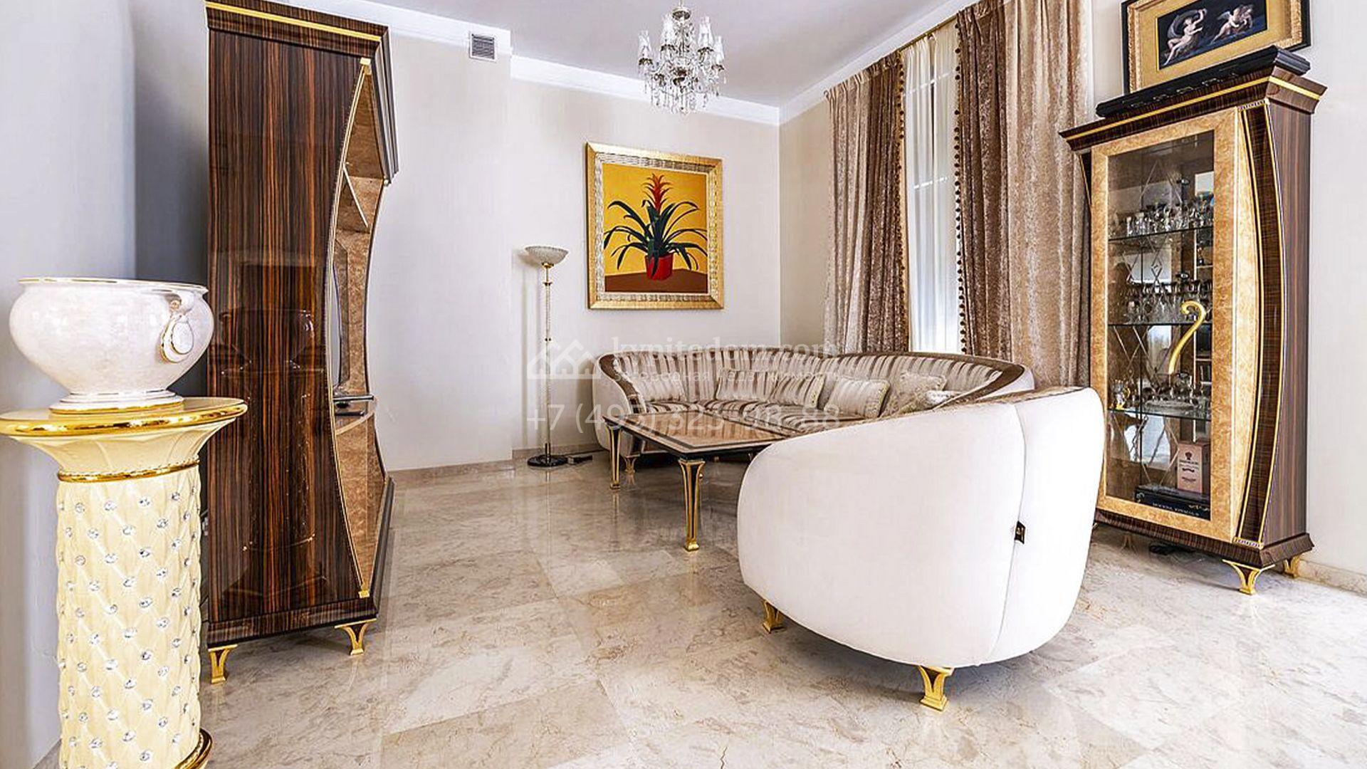 Загородный таунхаус площадью 350 м² расположен на полевом участке 8 соток в тихой части посёлка. Фасад, выполненный в европейском стиле, облицован благородным клинкерным кирпичом и украшен белоснежными рустами, изящными наличниками и замковым камнем. Внутри встречают интерьеры с трёхметровыми полотками, отделанные мрамором в светлой пастельной гамме. Дом полностью готов к жизни: он укомплектован мебелью и встроенной бытовой техникой, а система кондиционирования заботится об идеальном микроклимате в любое время года.