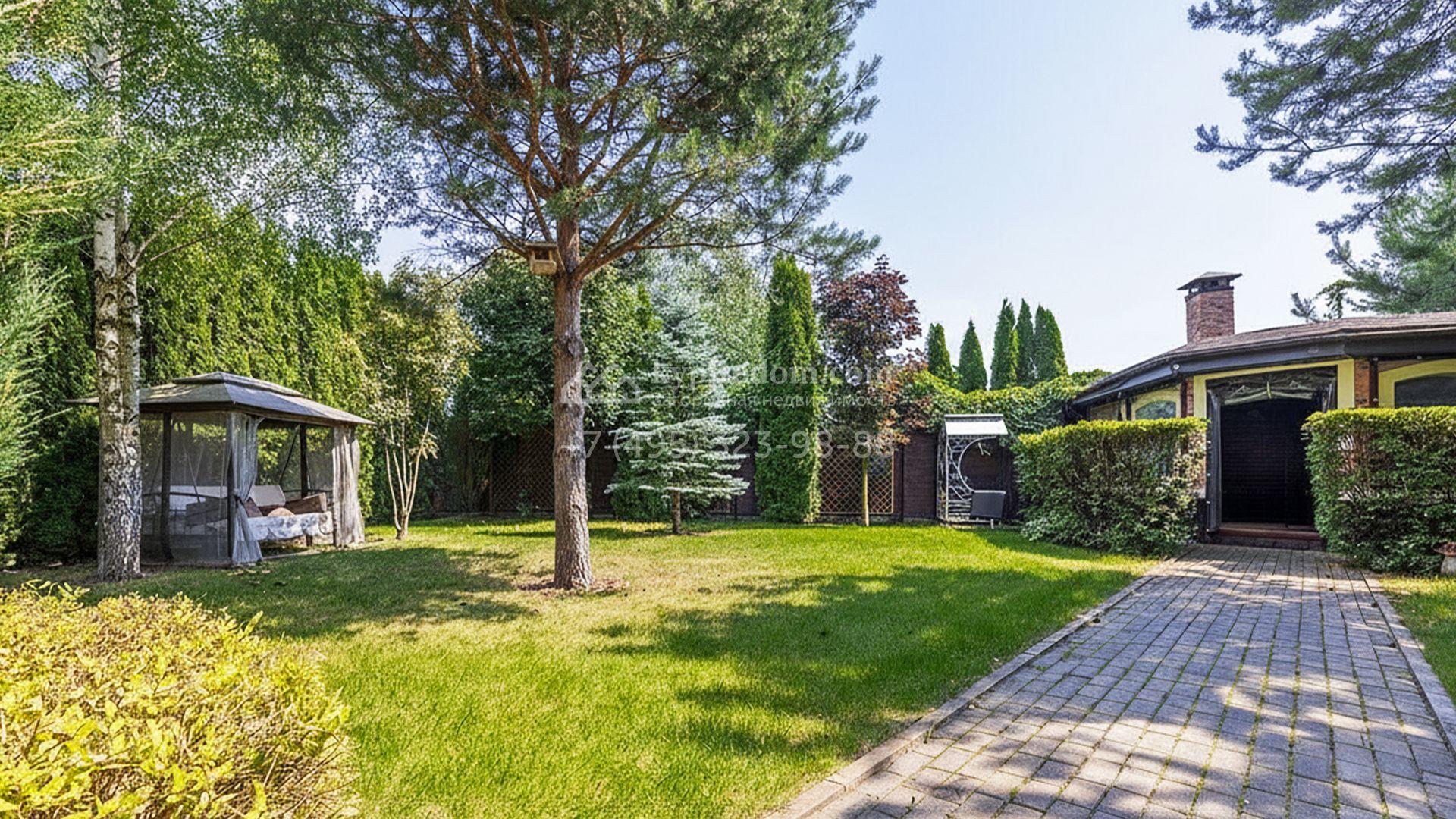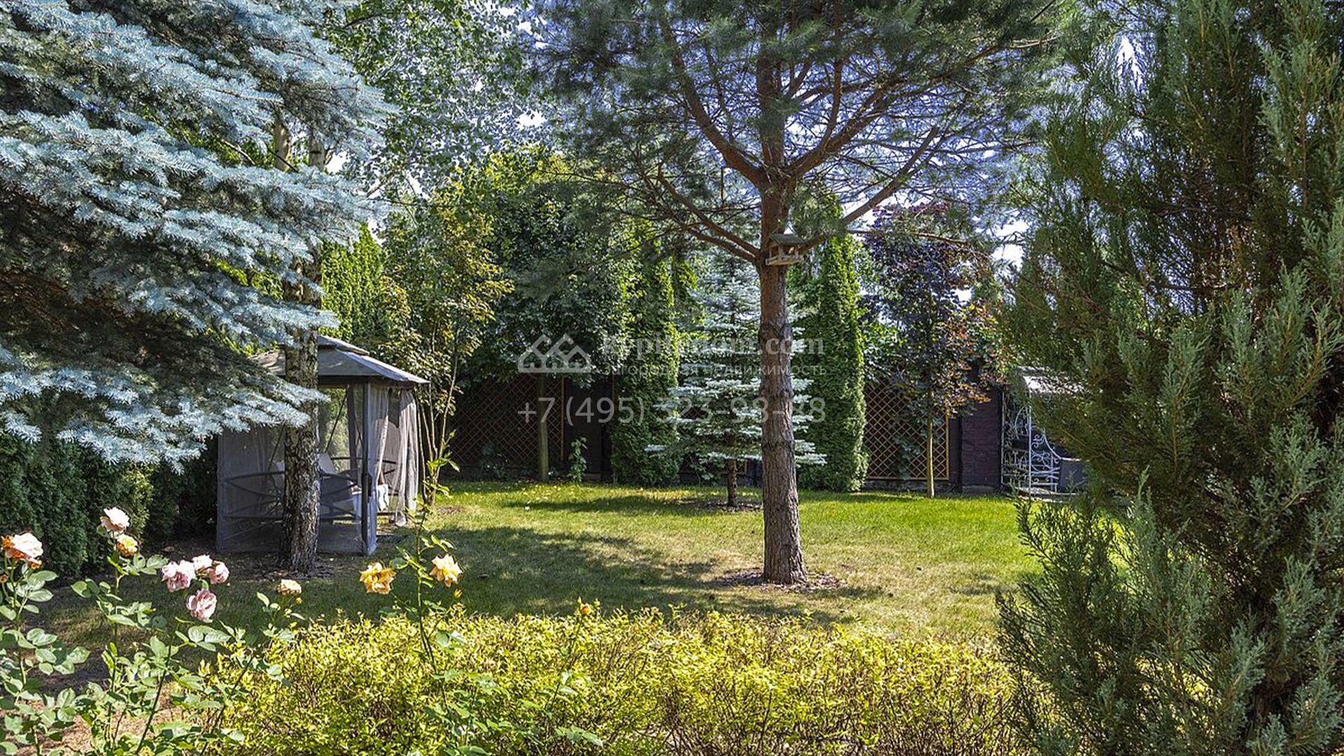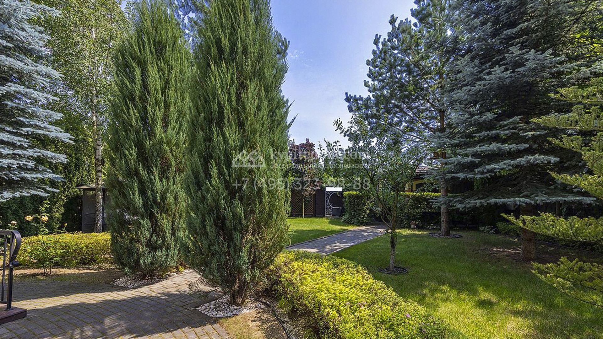 Участок впечатляет ухоженным газоном, мощёными дорожками и тенистыми деревьями. Декоративные кустарники, стройные туи и пушистые голубые ели по периметру создают атмосферу уединённости и покоя. Ночные посиделки в беседке с зоной барбекю будут ещё более романтичными благодаря уличной подсветке дома.