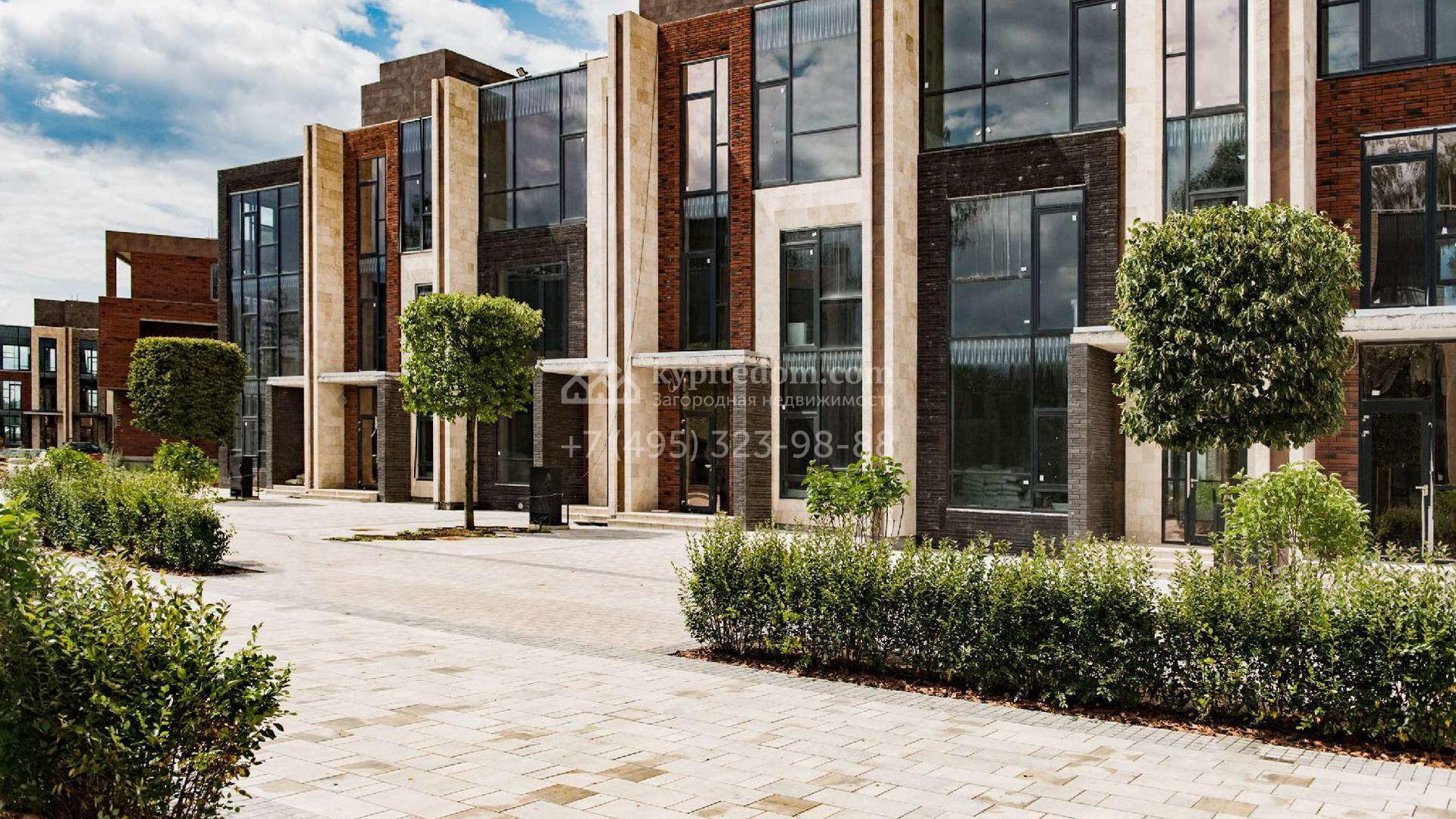Трёхэтажный таунхаус в стиле «эко-тек» площадью 277 м² с эксплуатируемой кровлей расположен на участке 2,2 сотки. Фасад с панорамным остеклением облицован натуральным бежевым камнем и клинкером. Внутри таунхаус со свободной планировкой и потолком высоток 3,5 метра, этажи соединяет монолитная лестница. Благодаря тому, что внутри нет несущих стен, планировку можно спланировать на свое усмотрение. С третьего этажа есть выход на эксплуатируемую крышу, где можно загорать или встречать закаты. Участок скрыт от соседей живой изгородью и оборудован калиткой.