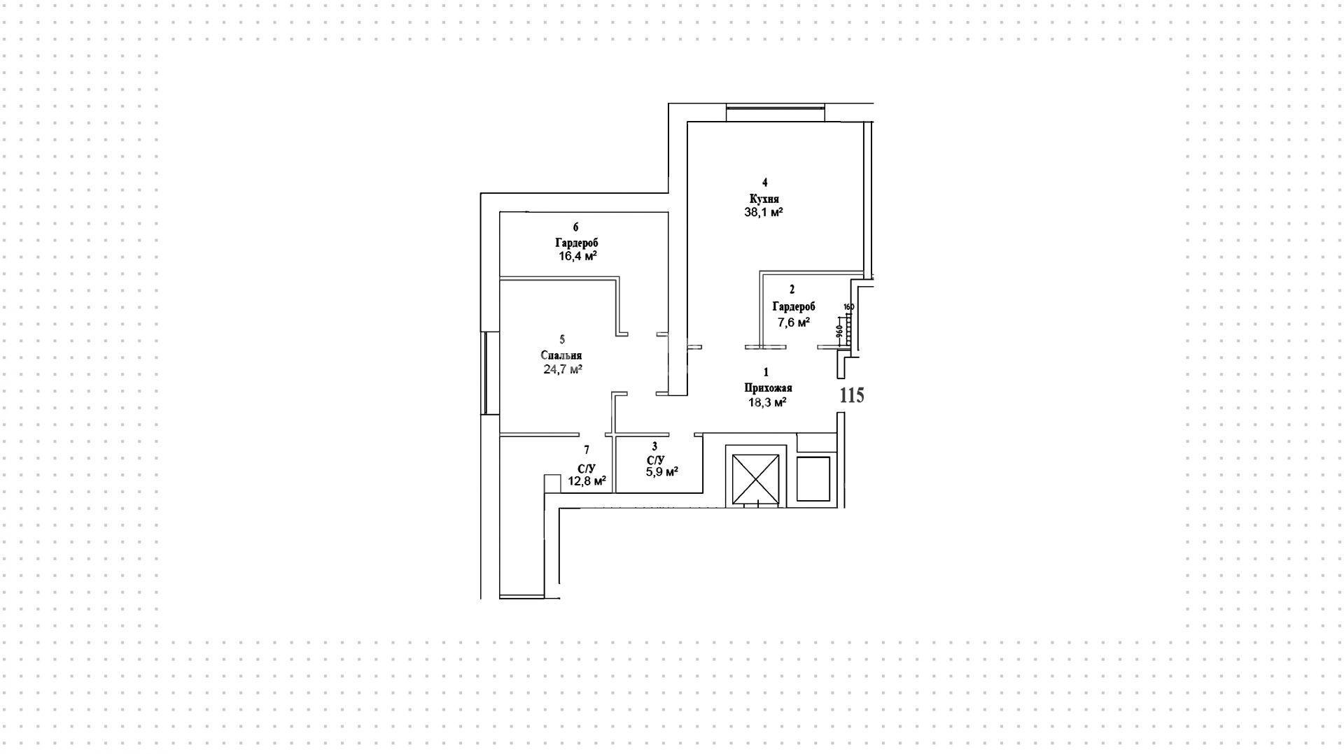 Угловая квартира без отделки с просторной спальней, кухней, отдельной гардеробной, двумя ванными комнатами. Общая площадь квартиры — 121 м². Установлена система кондиционирования.