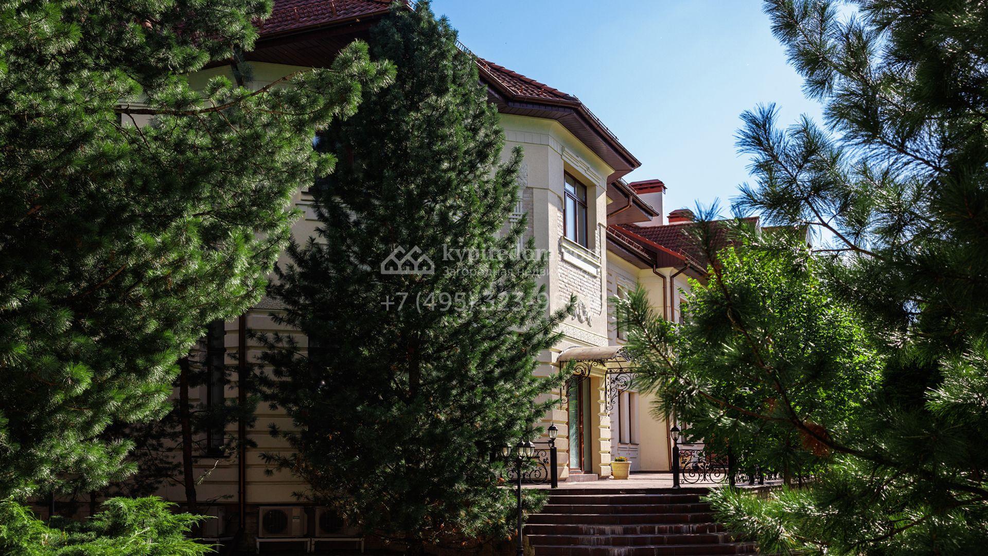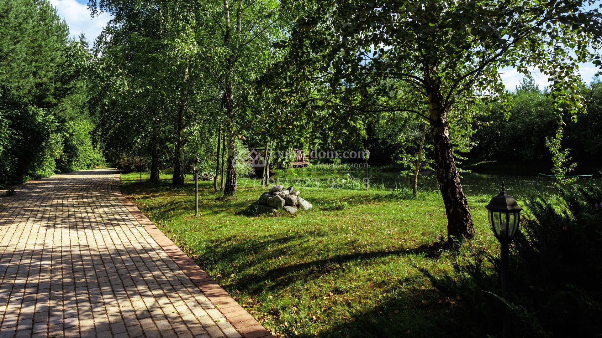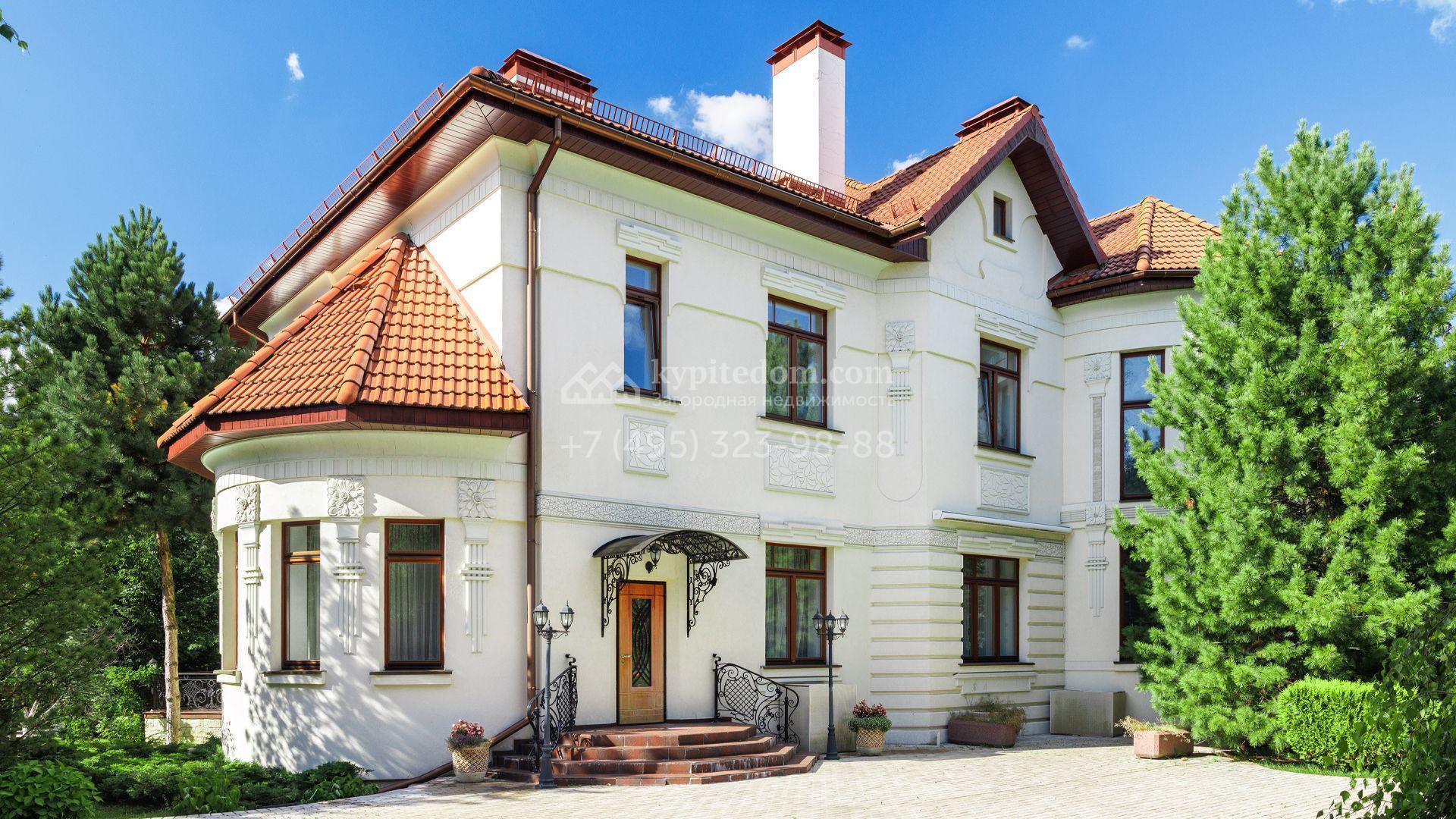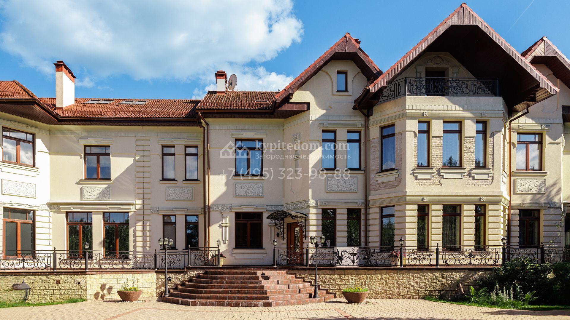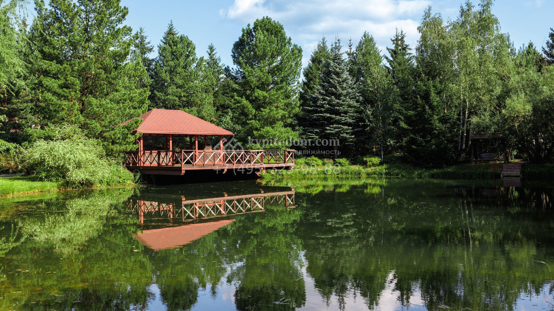 Загородный особняк в стиле русского модерна площадью 2009 м² построен на просторном участке 0,9 гектара с собственным озером. Фасад дома облицован бежевой штукатуркой, декорирован панно, рустовкой и коваными элементами. В отделке интерьера использованы светлые, теплые оттенки, создающие атмосферу уюта. Планировкой резиденции предусмотрены 3 спальни, 2 гостиные, одна из которых с камином и вторым светом, кухня, 2 столовые, кабинет и спа-зона с бассейном длиной 16 метров, хаммамом и сауной. На территории построены 4 гаража, гостевой дом, летний домик, беседка и зона барбекю, а также обустроены парк, сад, фонтан и паркинг. На участке с 2-мя въездами выполнены ландшафтный дизайн и дренажные работы, установлена система автополива, вымощены дорожки и оборудовано уличное освещение.