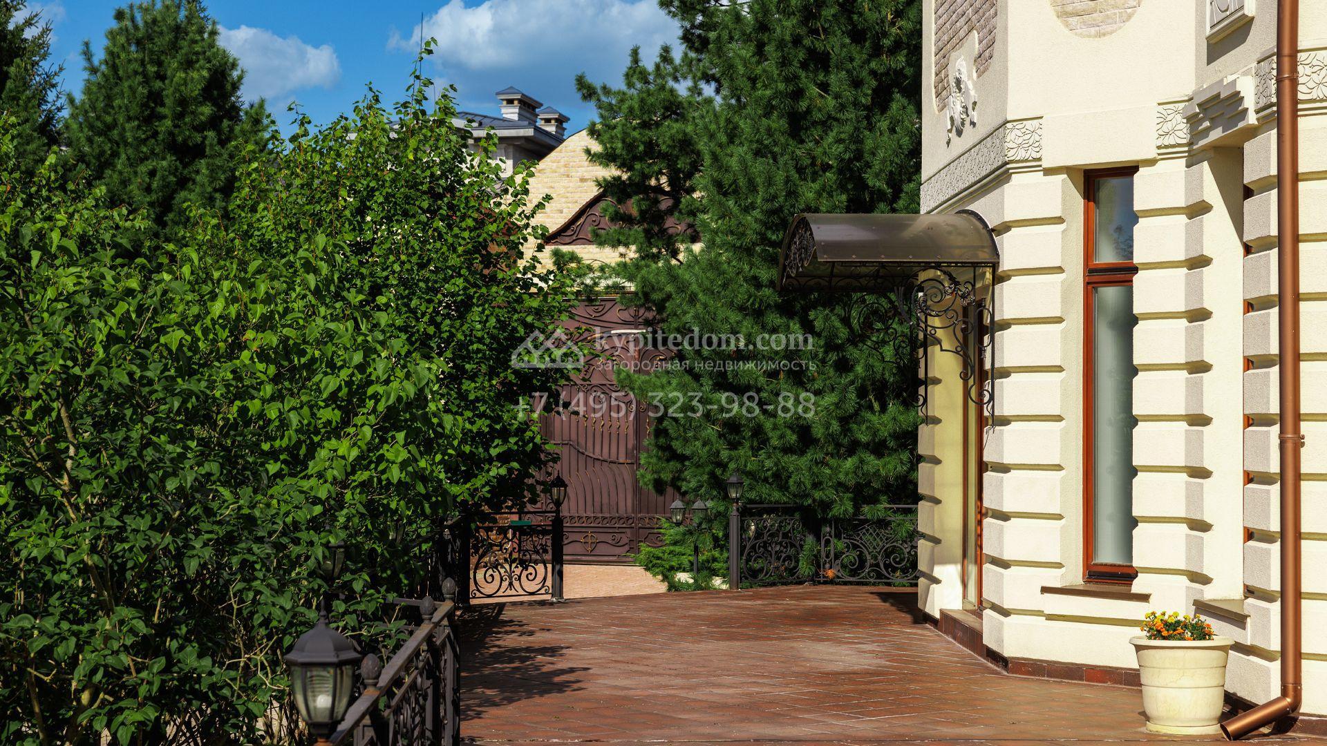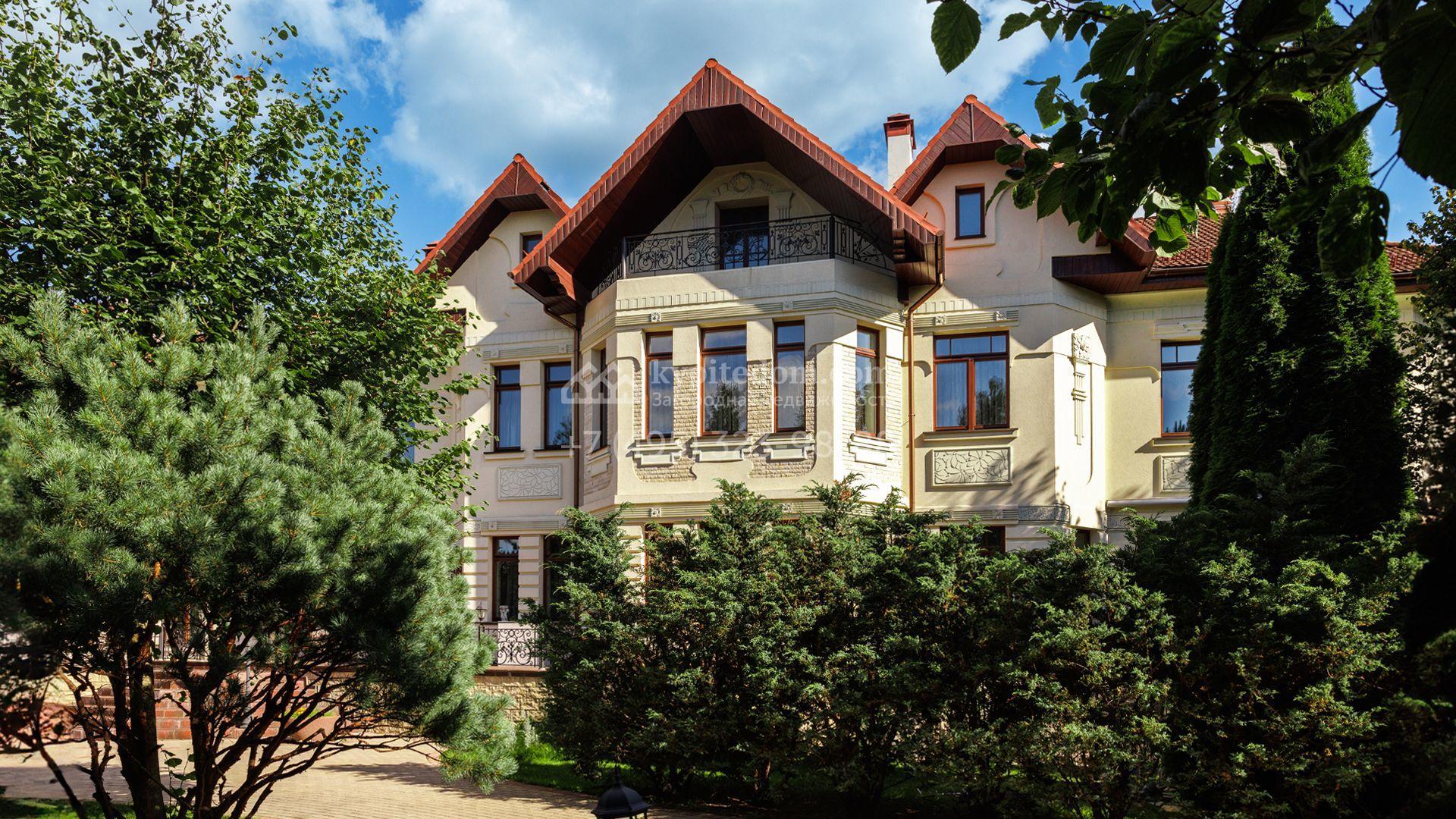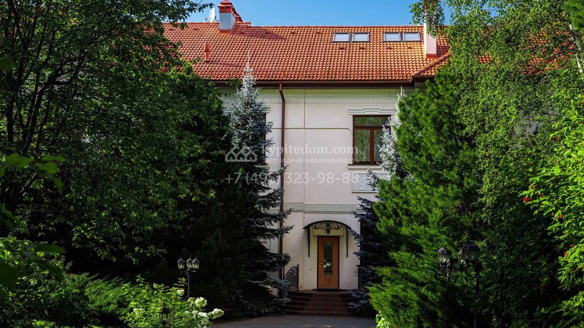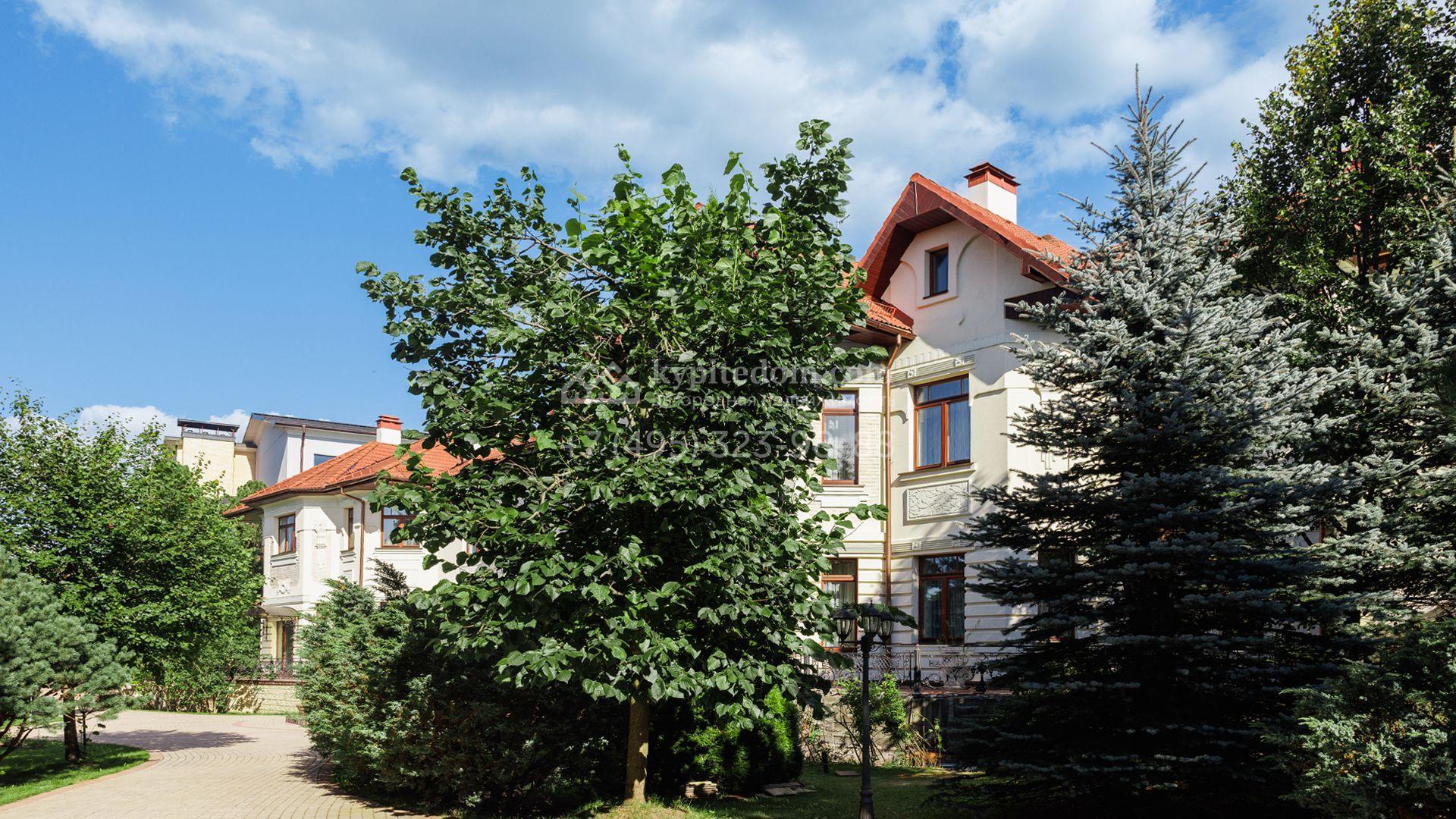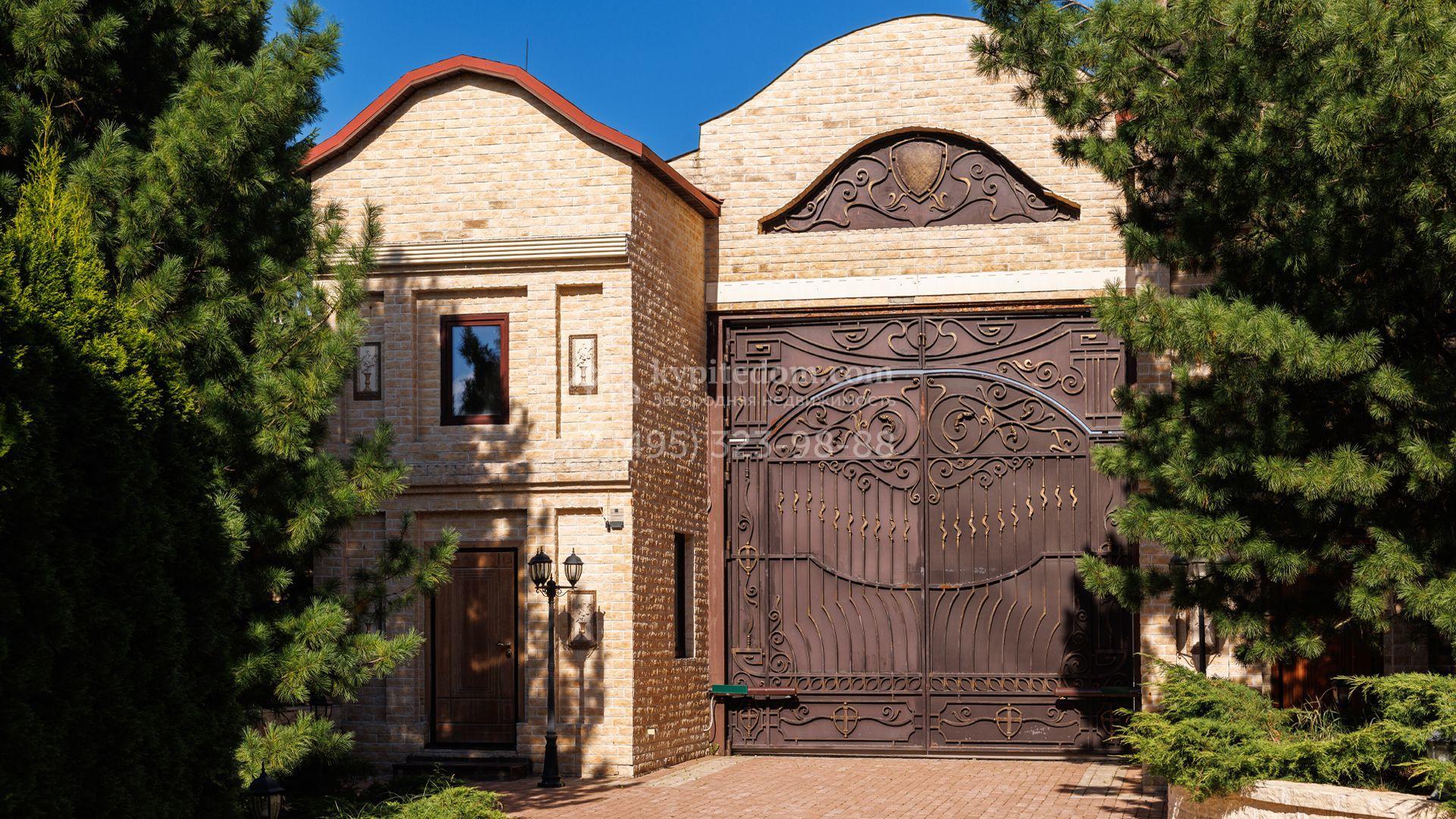 Загородный особняк в стиле русского модерна площадью 2009 м² построен на просторном участке 0,9 гектара с собственным озером. Фасад дома облицован бежевой штукатуркой, декорирован панно, рустовкой и коваными элементами. В отделке интерьера использованы светлые, теплые оттенки, создающие атмосферу уюта. Планировкой резиденции предусмотрены 3 спальни, 2 гостиные, одна из которых с камином и вторым светом, кухня, 2 столовые, кабинет и спа-зона с бассейном длиной 16 метров, хаммамом и сауной. На территории построены 4 гаража, гостевой дом, летний домик, беседка и зона барбекю, а также обустроены парк, сад, фонтан и паркинг. На участке с 2-мя въездами выполнены ландшафтный дизайн и дренажные работы, установлена система автополива, вымощены дорожки и оборудовано уличное освещение.