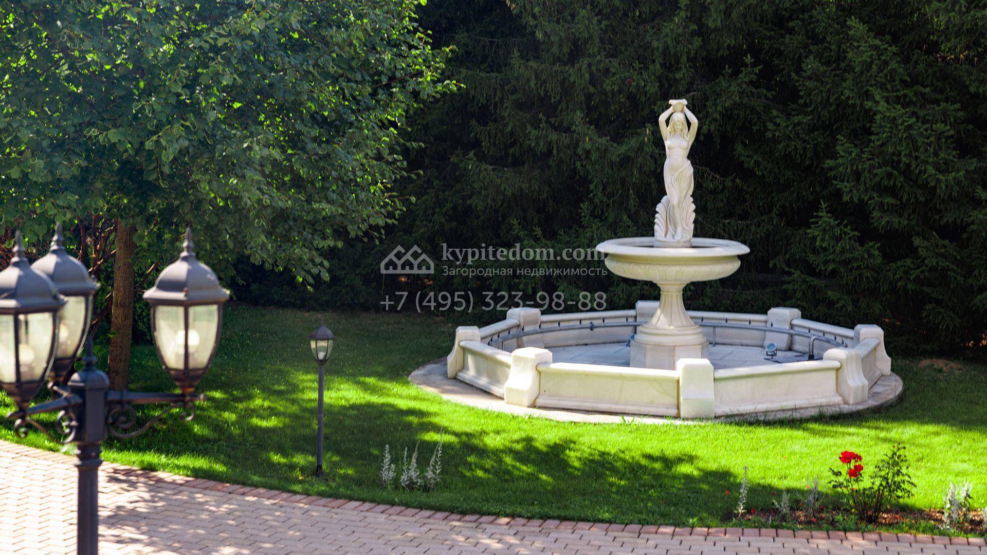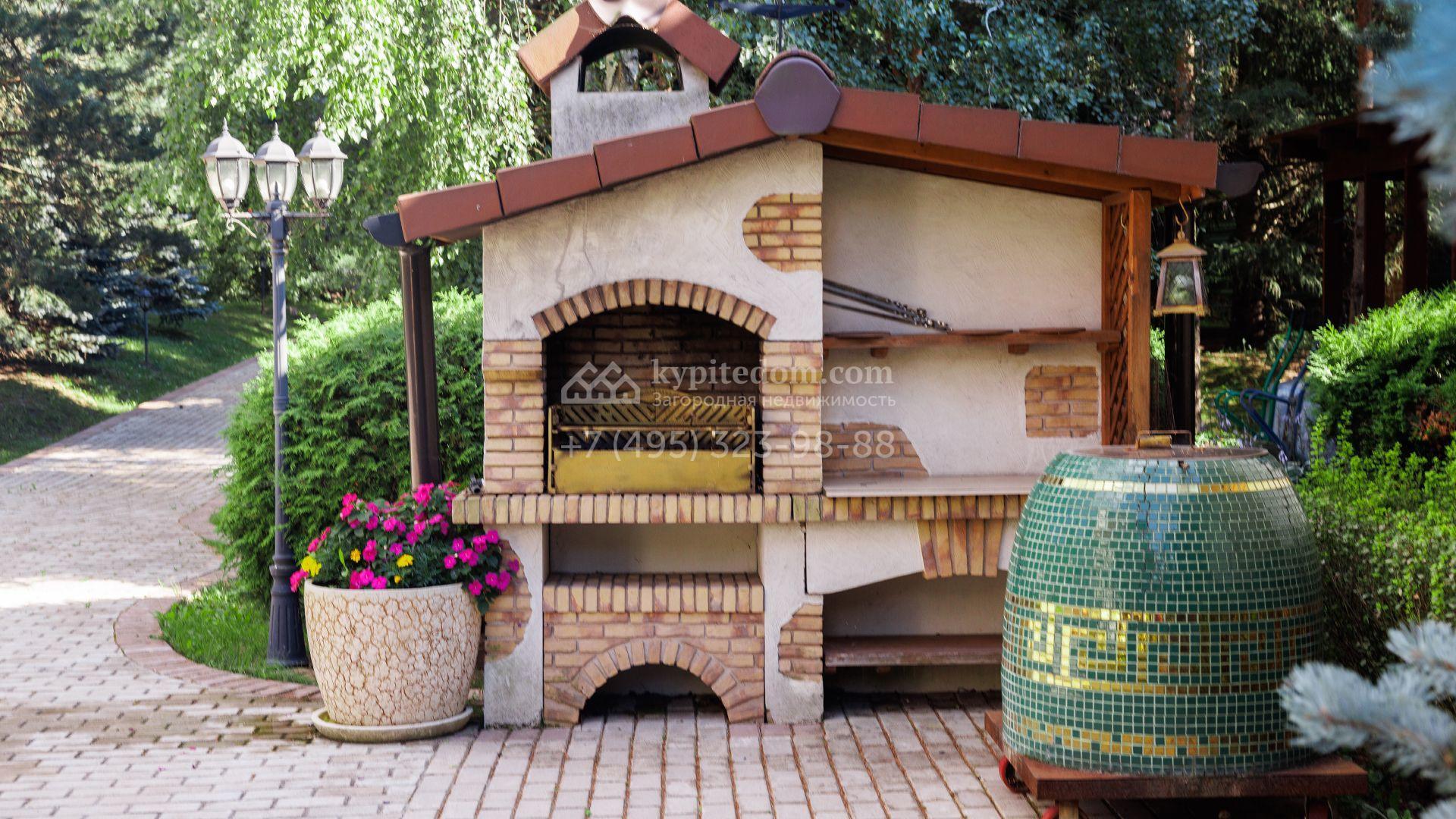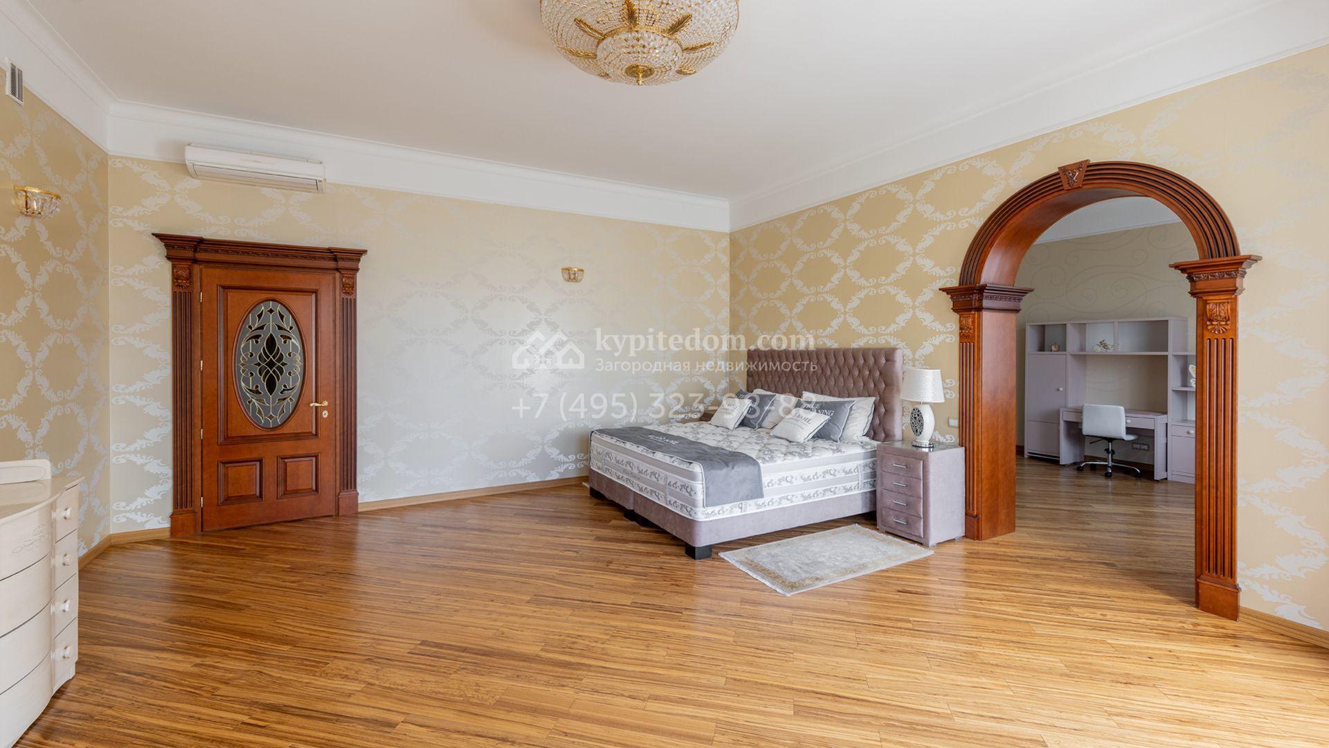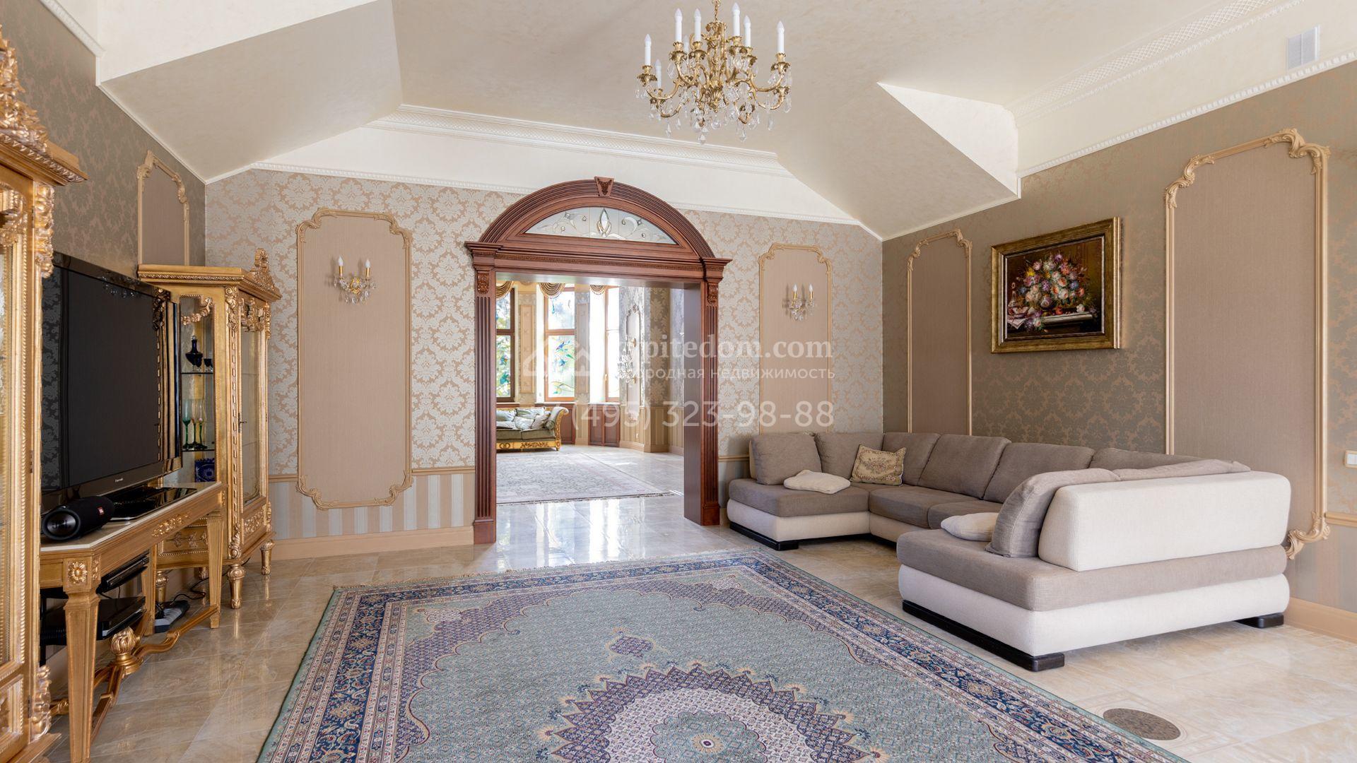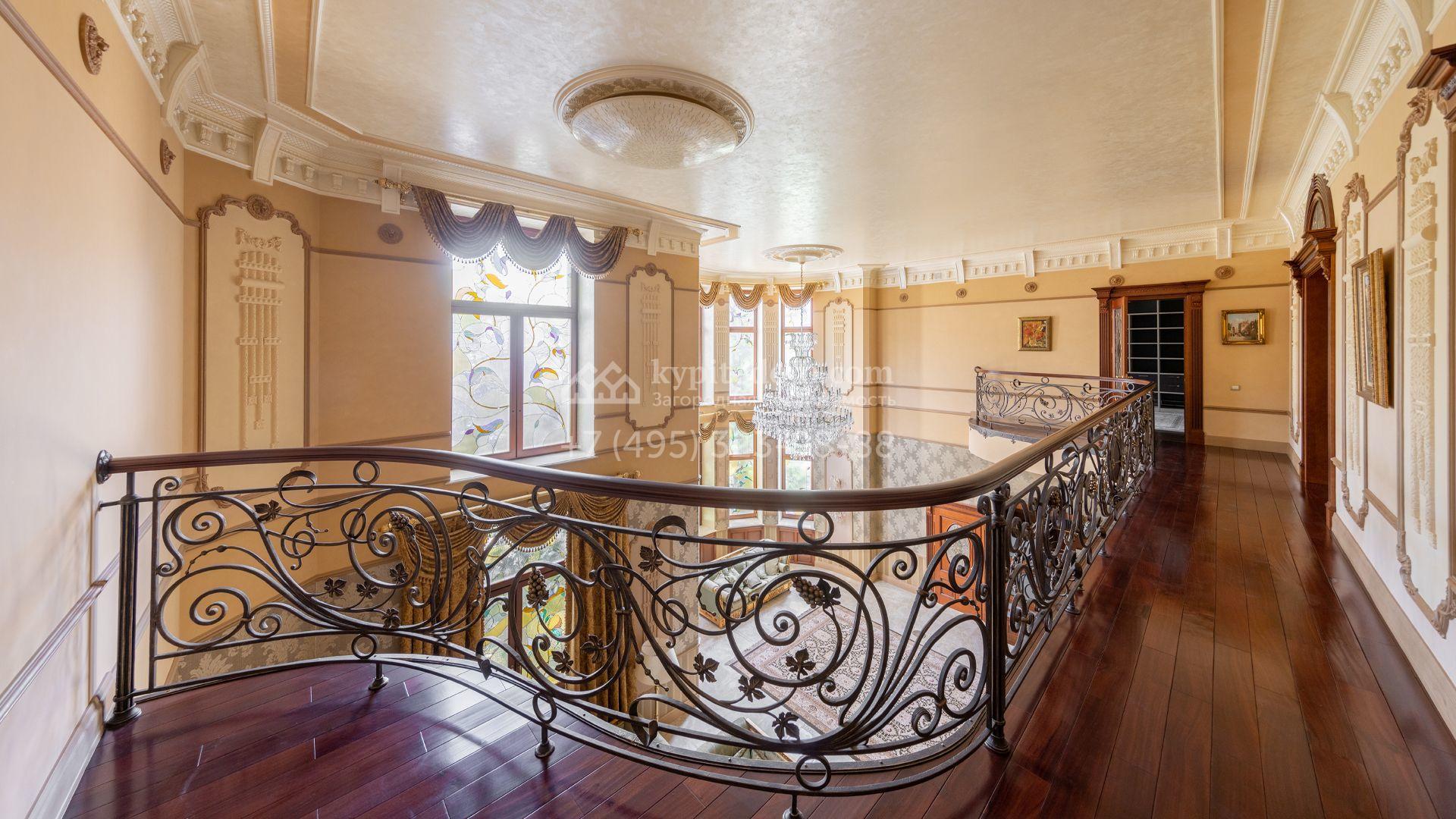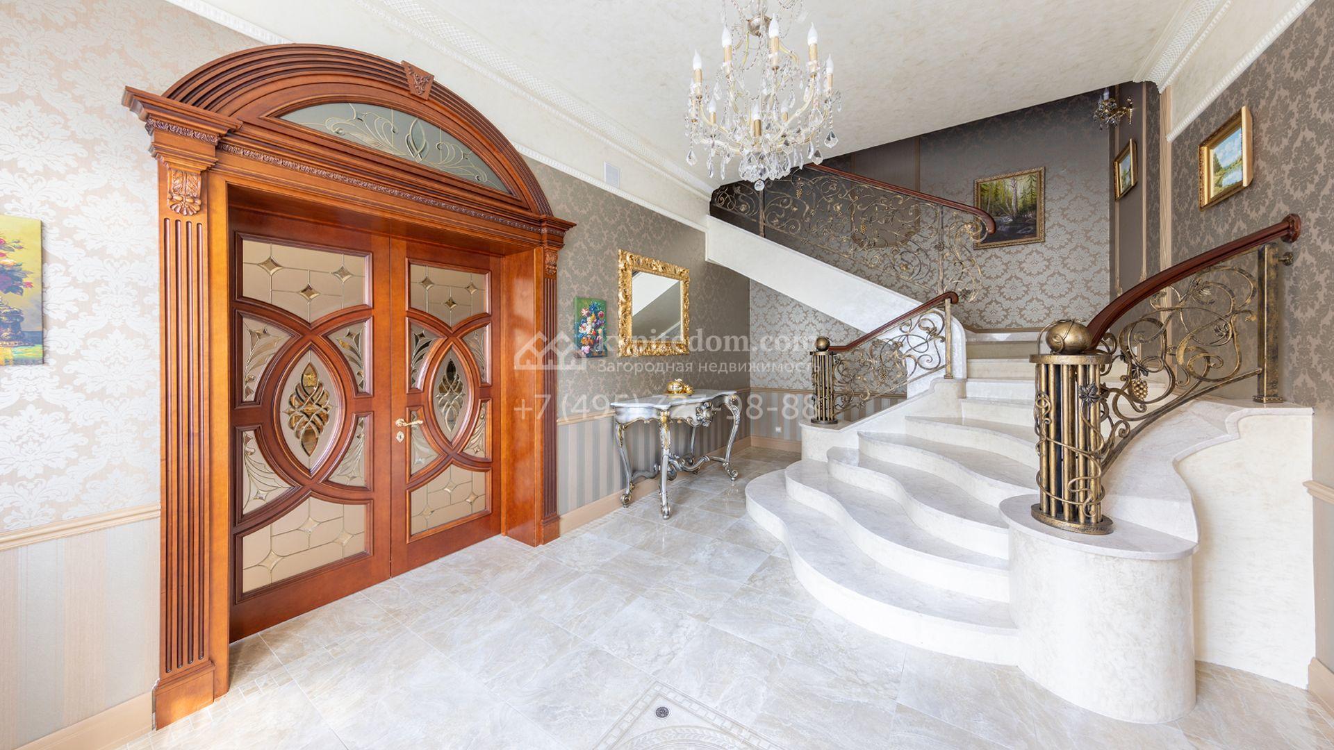 Загородный особняк в стиле русского модерна площадью 2009 м² построен на просторном участке 0,9 гектара с собственным озером. Фасад дома облицован бежевой штукатуркой, декорирован панно, рустовкой и коваными элементами. В отделке интерьера использованы светлые, теплые оттенки, создающие атмосферу уюта. Планировкой резиденции предусмотрены 3 спальни, 2 гостиные, одна из которых с камином и вторым светом, кухня, 2 столовые, кабинет и спа-зона с бассейном длиной 16 метров, хаммамом и сауной. На территории построены 4 гаража, гостевой дом, летний домик, беседка и зона барбекю, а также обустроены парк, сад, фонтан и паркинг. На участке с 2-мя въездами выполнены ландшафтный дизайн и дренажные работы, установлена система автополива, вымощены дорожки и оборудовано уличное освещение.