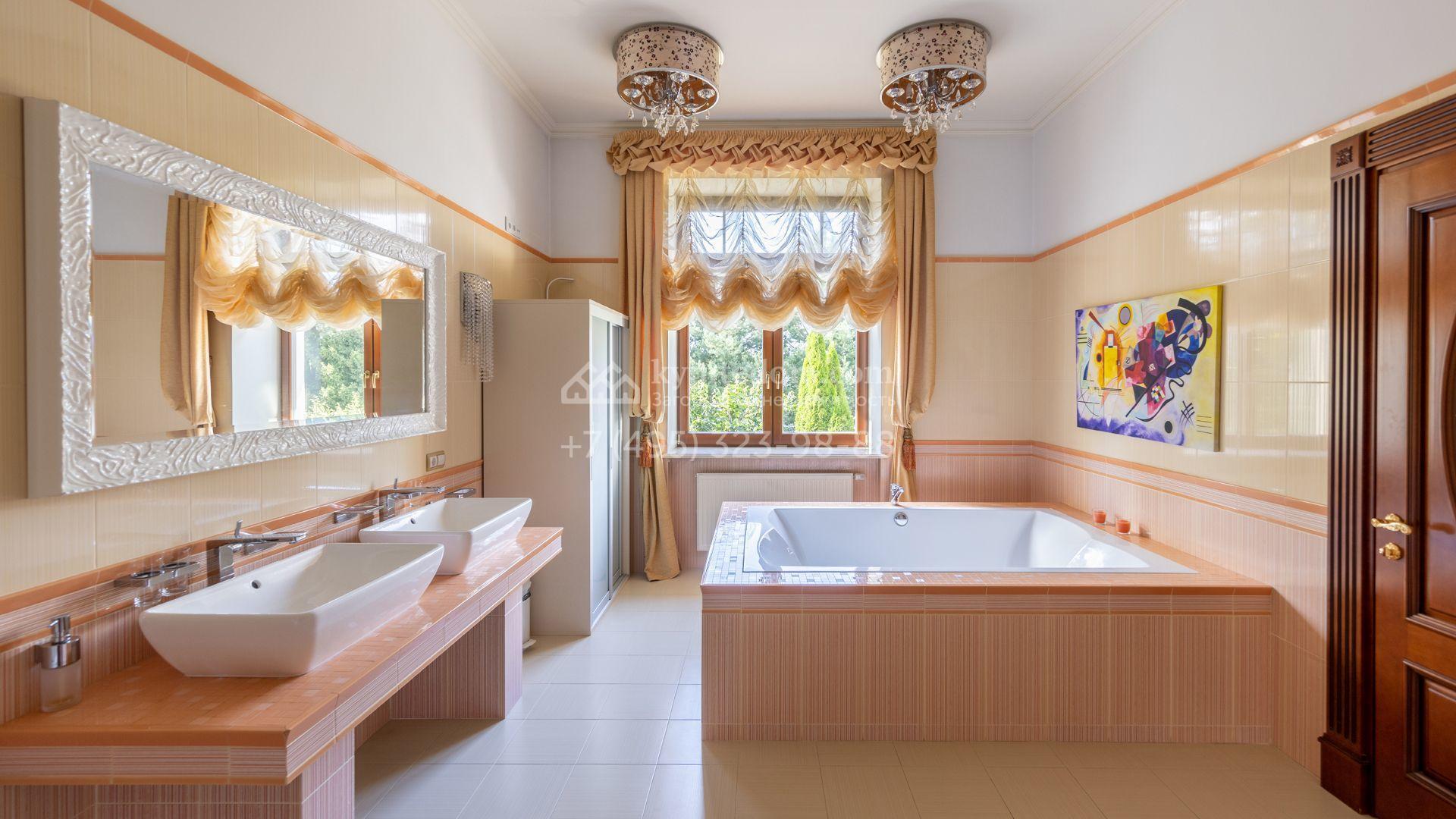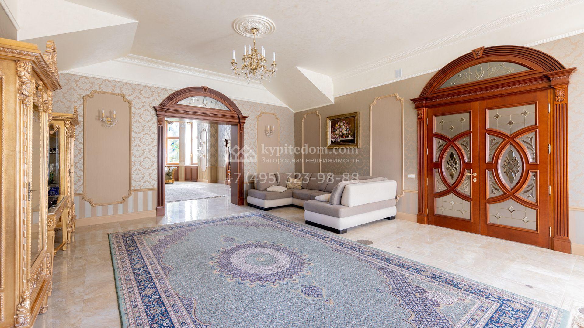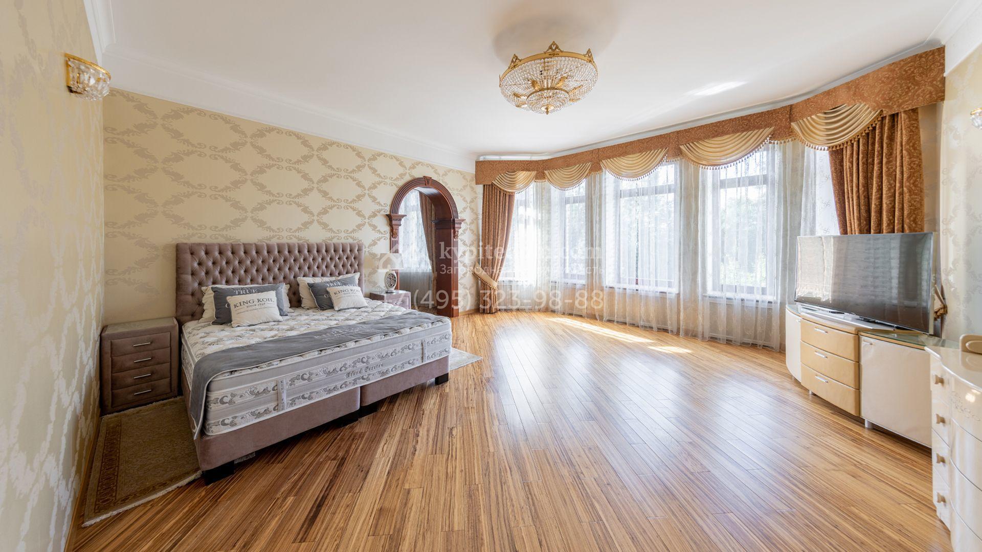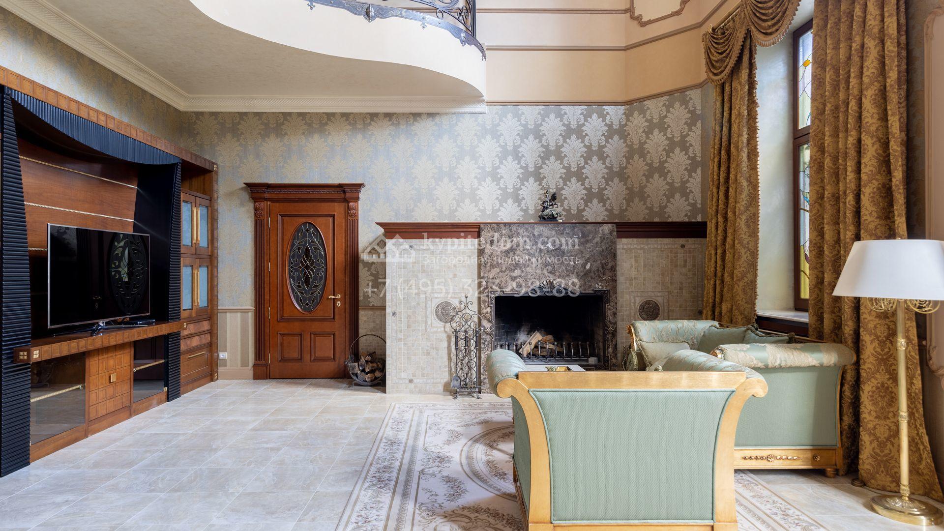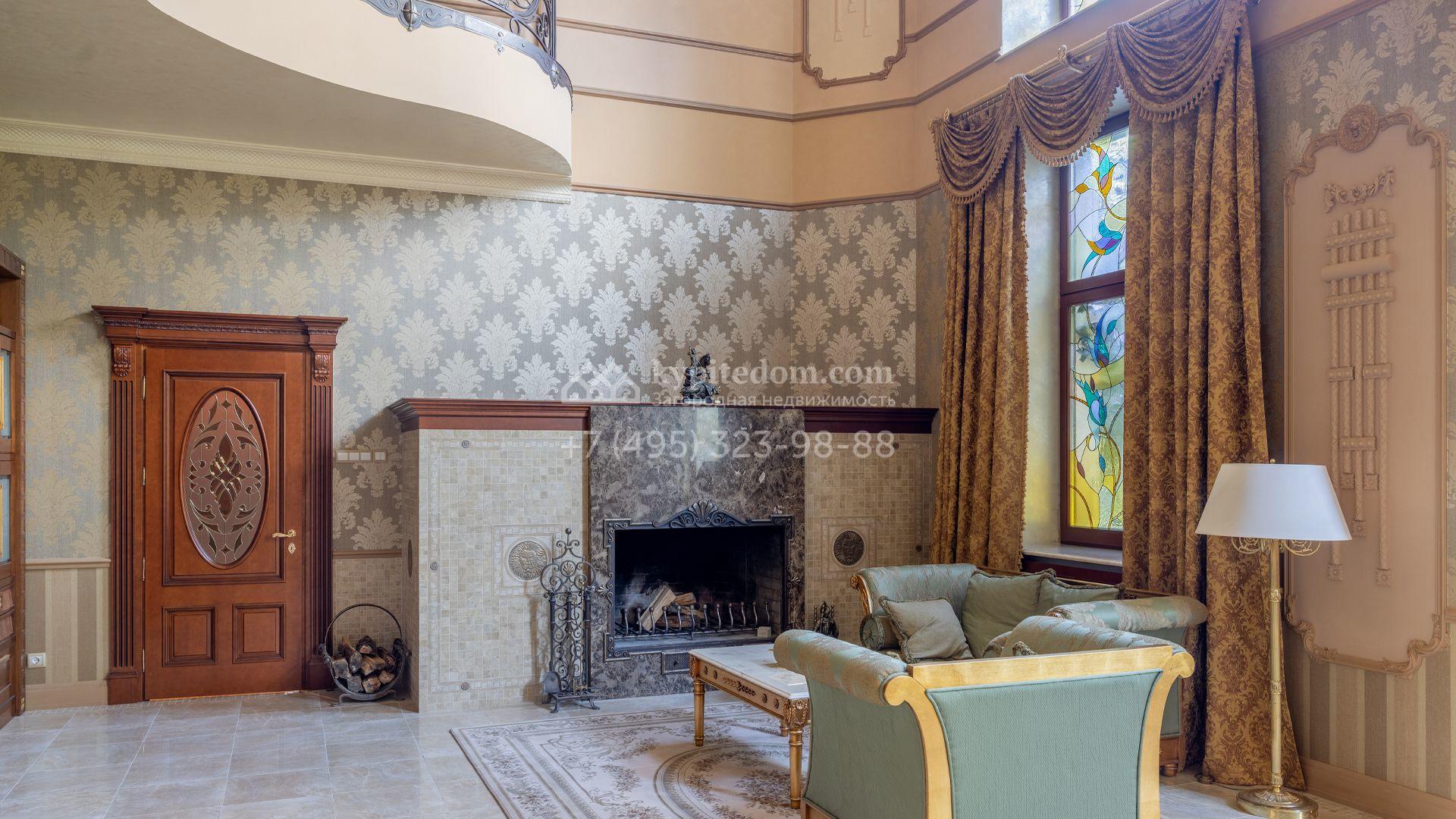 Загородный особняк в стиле русского модерна площадью 2009 м² построен на просторном участке 0,9 гектара с собственным озером. Фасад дома облицован бежевой штукатуркой, декорирован панно, рустовкой и коваными элементами. В отделке интерьера использованы светлые, теплые оттенки, создающие атмосферу уюта. Планировкой резиденции предусмотрены 3 спальни, 2 гостиные, одна из которых с камином и вторым светом, кухня, 2 столовые, кабинет и спа-зона с бассейном длиной 16 метров, хаммамом и сауной. На территории построены 4 гаража, гостевой дом, летний домик, беседка и зона барбекю, а также обустроены парк, сад, фонтан и паркинг. На участке с 2-мя въездами выполнены ландшафтный дизайн и дренажные работы, установлена система автополива, вымощены дорожки и оборудовано уличное освещение.