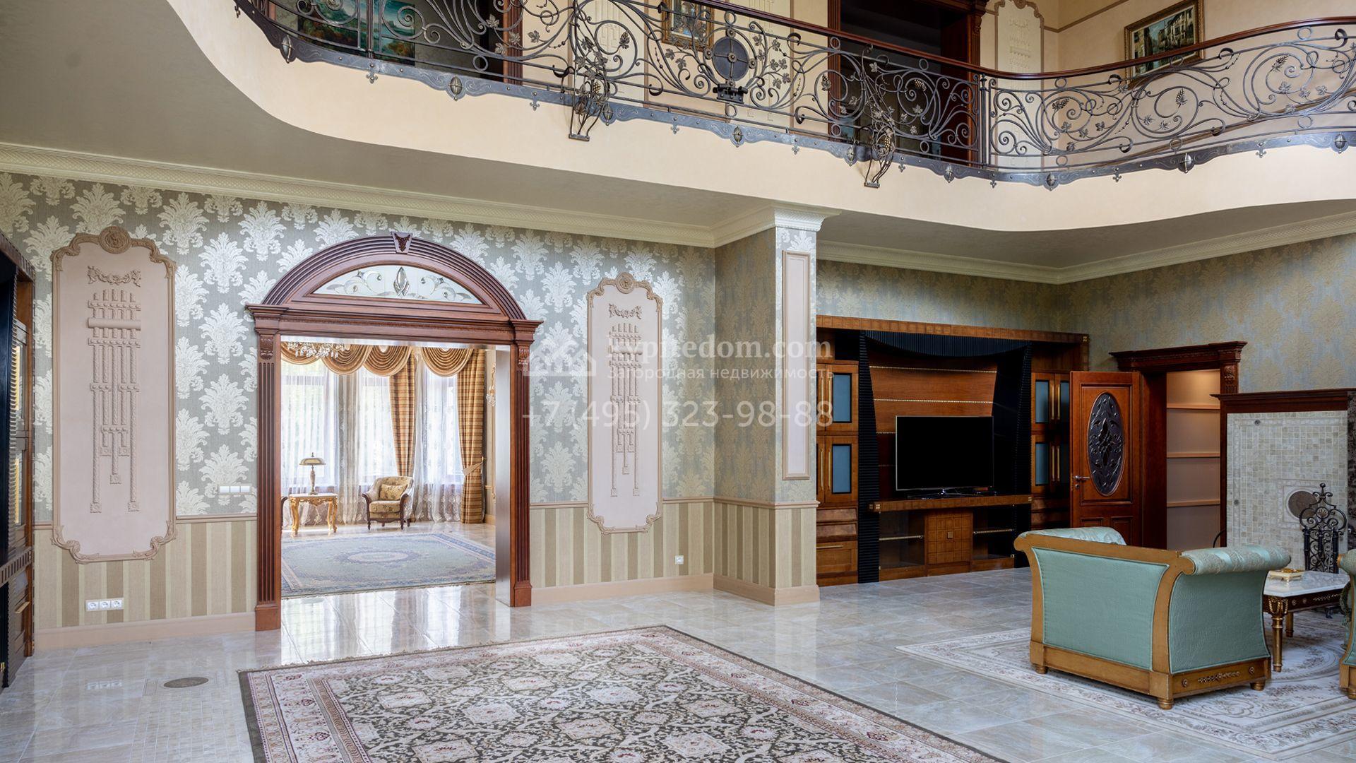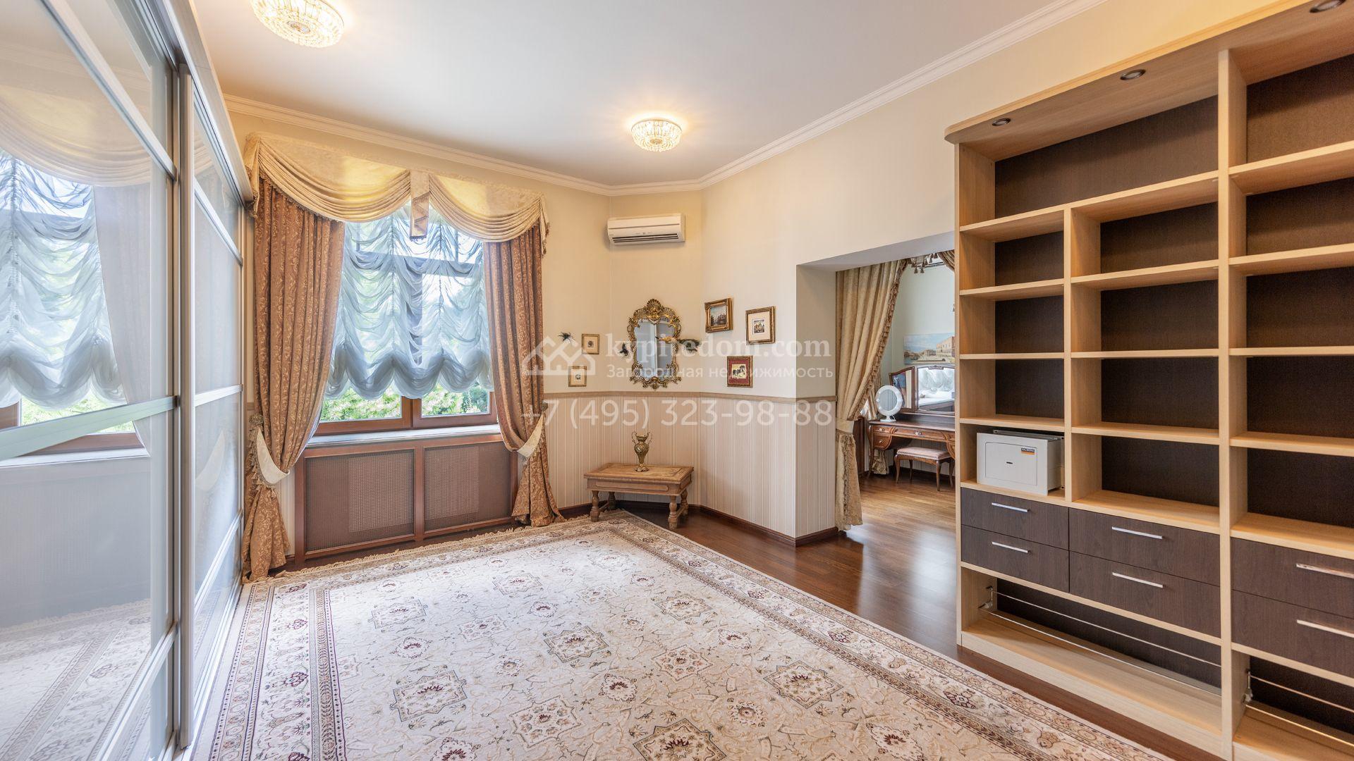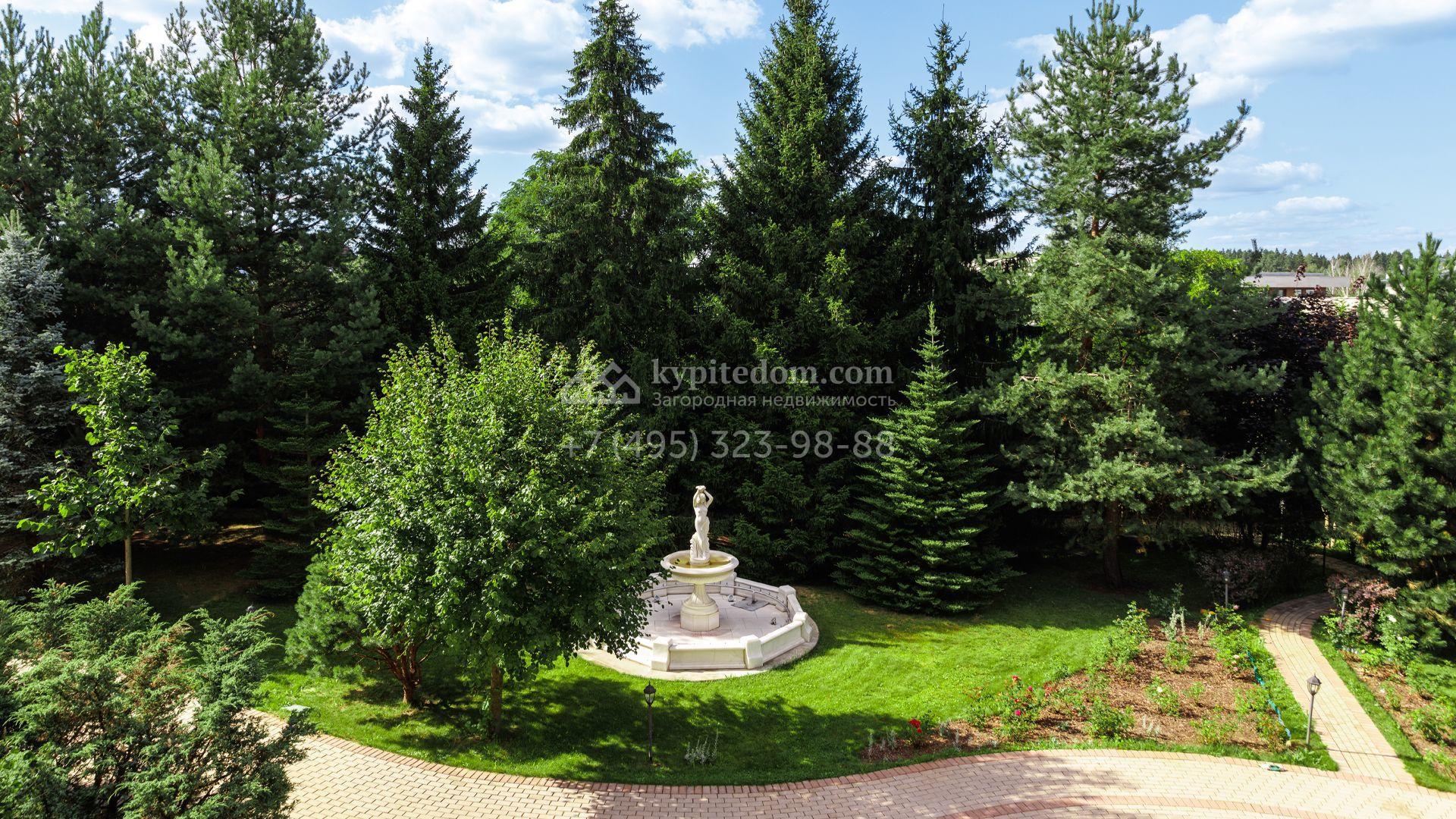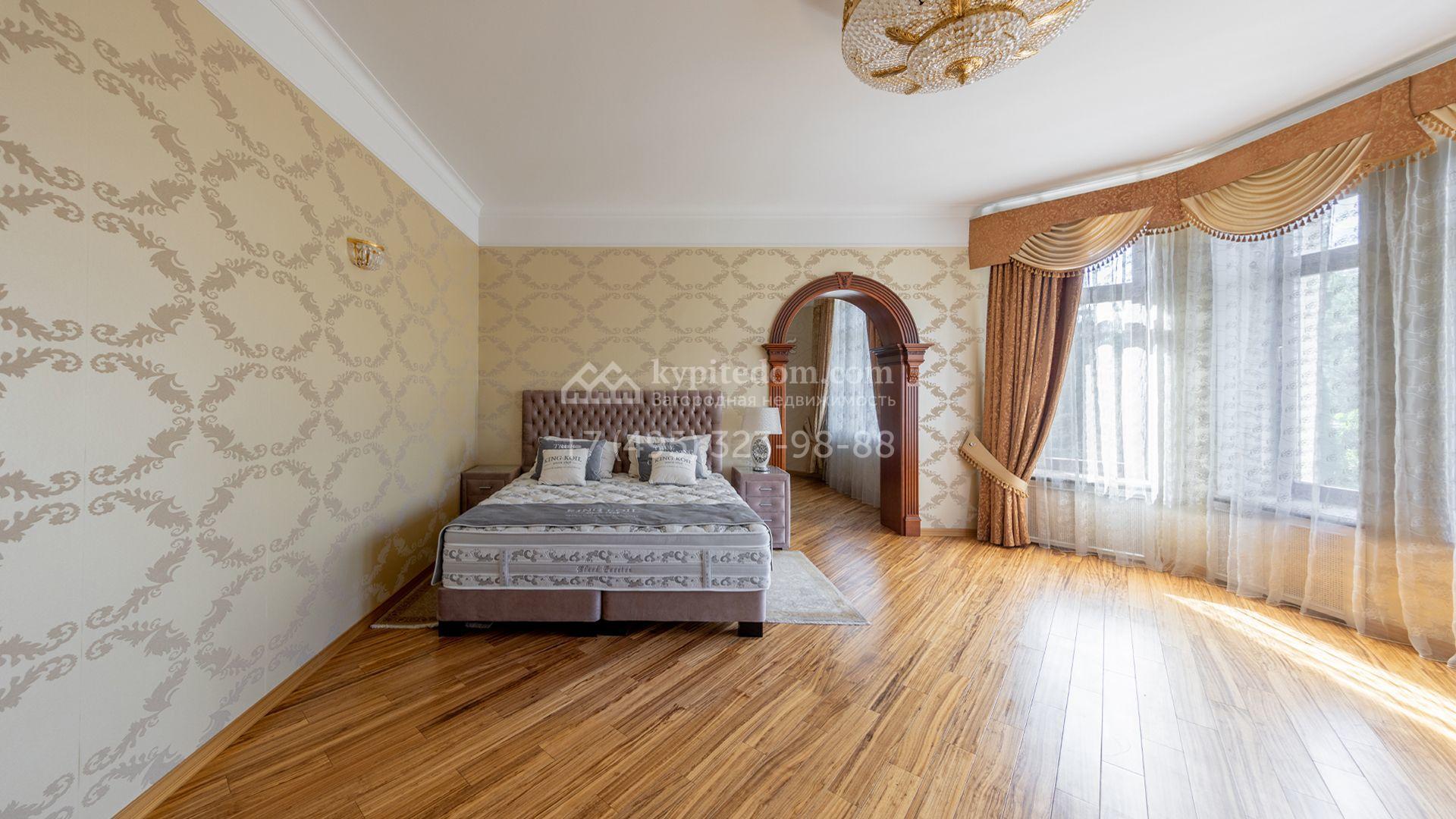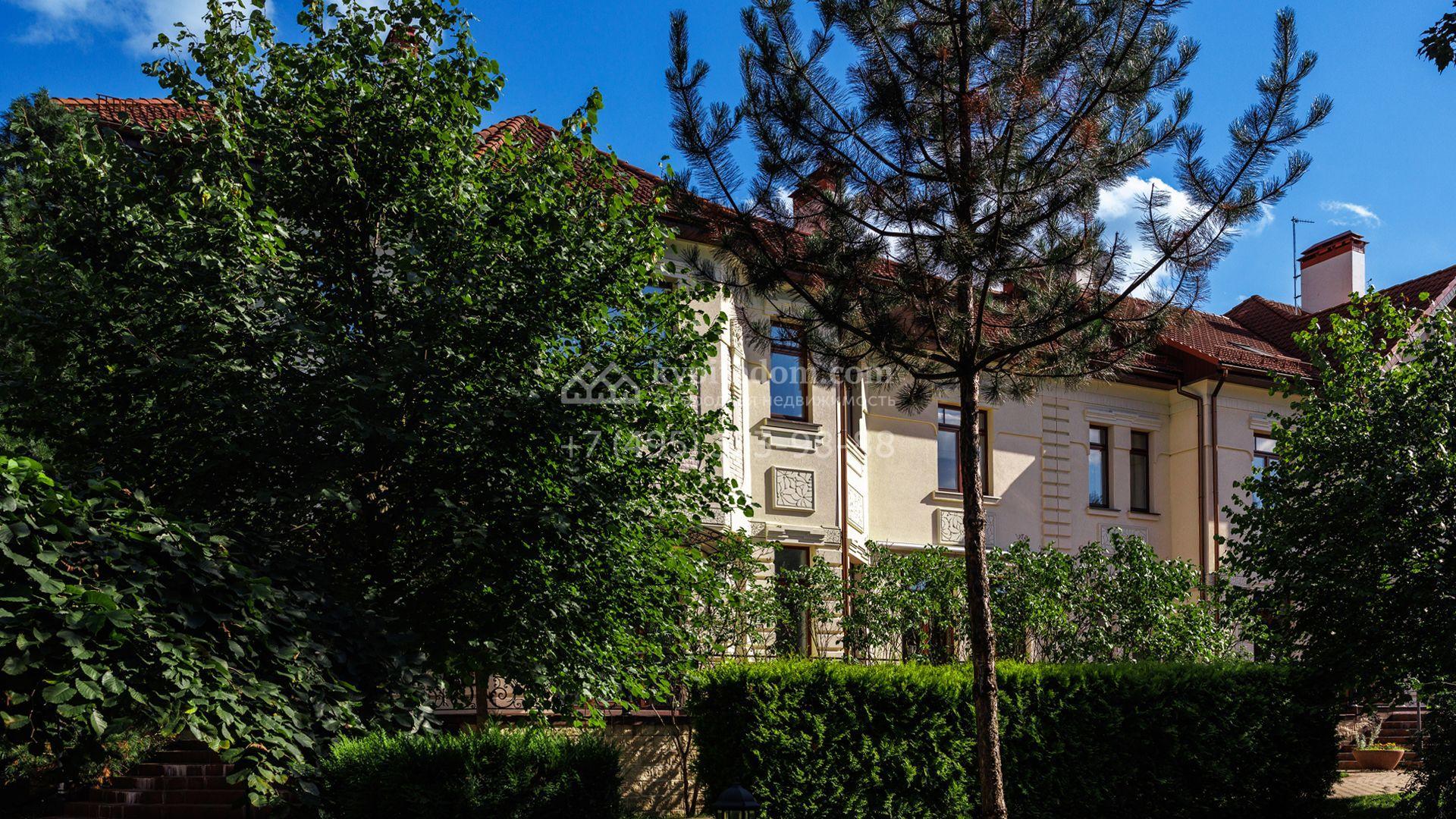 Загородный особняк в стиле русского модерна площадью 2009 м² построен на просторном участке 0,9 гектара с собственным озером. Фасад дома облицован бежевой штукатуркой, декорирован панно, рустовкой и коваными элементами. В отделке интерьера использованы светлые, теплые оттенки, создающие атмосферу уюта. Планировкой резиденции предусмотрены 3 спальни, 2 гостиные, одна из которых с камином и вторым светом, кухня, 2 столовые, кабинет и спа-зона с бассейном длиной 16 метров, хаммамом и сауной. На территории построены 4 гаража, гостевой дом, летний домик, беседка и зона барбекю, а также обустроены парк, сад, фонтан и паркинг. На участке с 2-мя въездами выполнены ландшафтный дизайн и дренажные работы, установлена система автополива, вымощены дорожки и оборудовано уличное освещение.