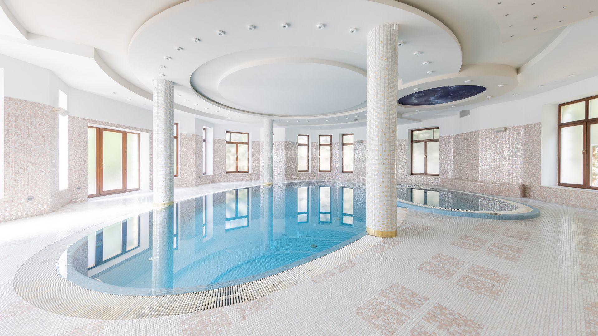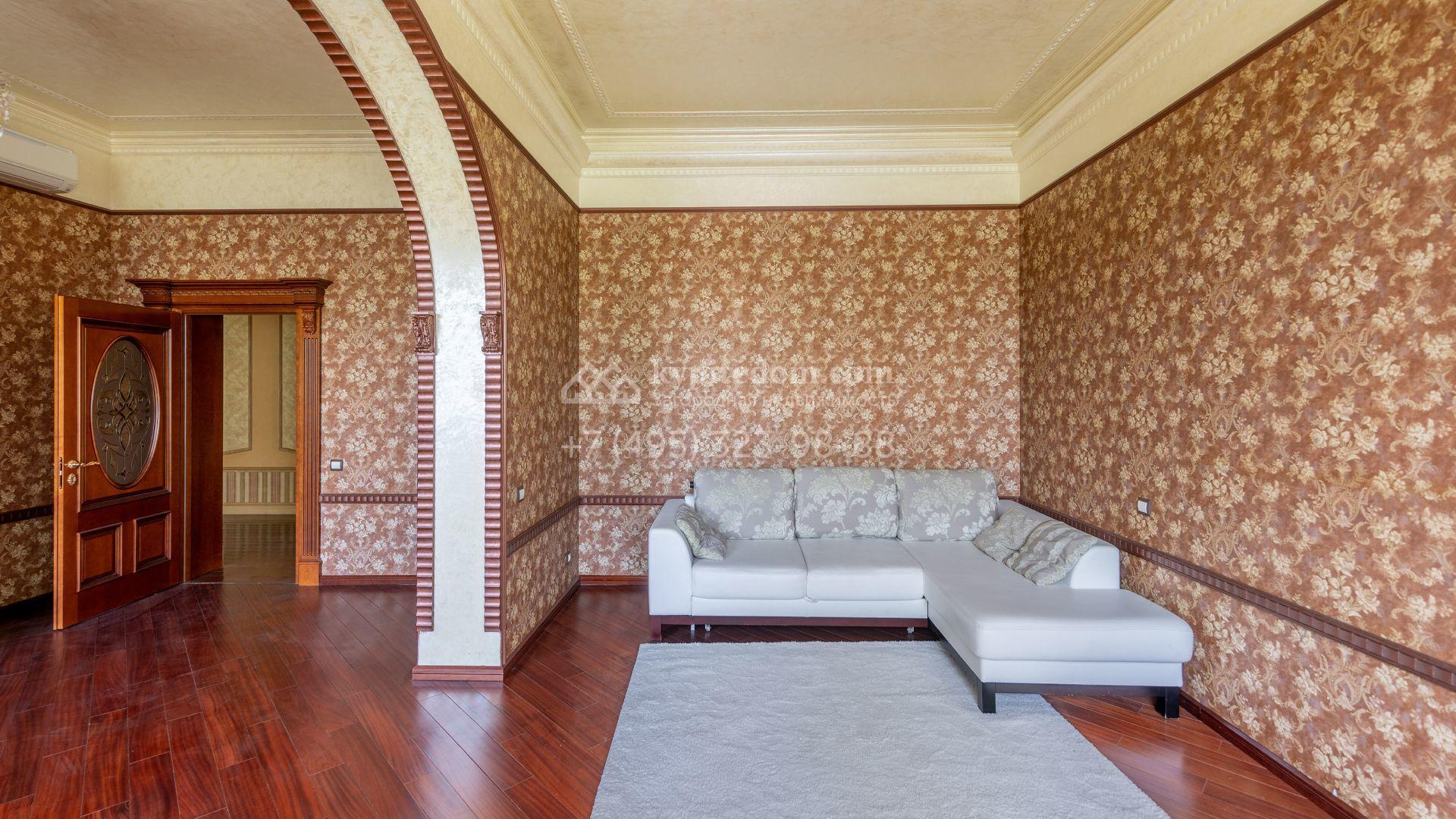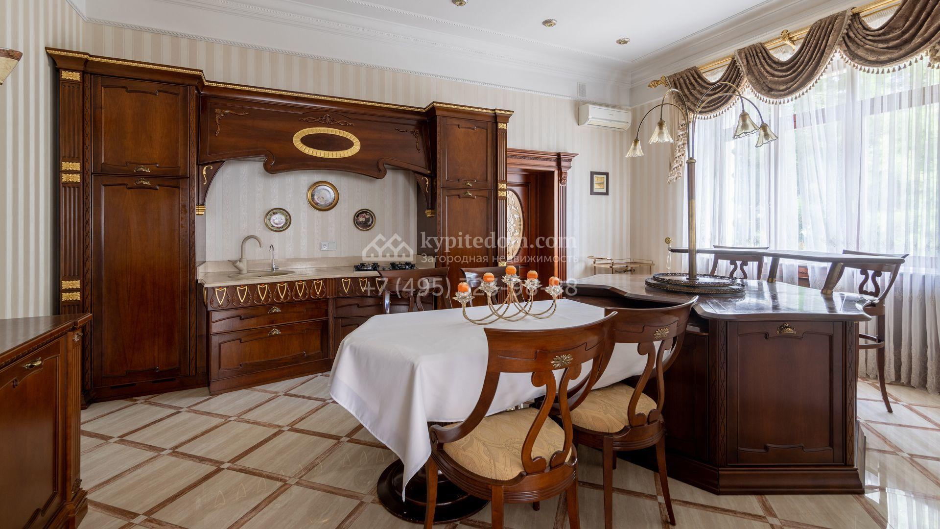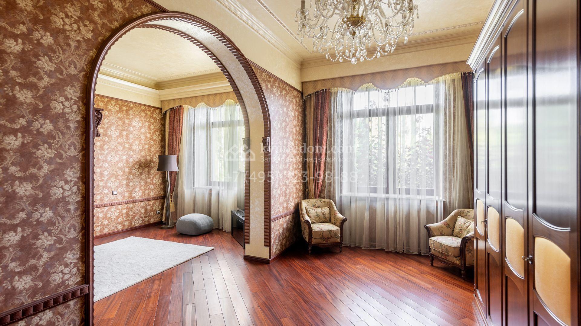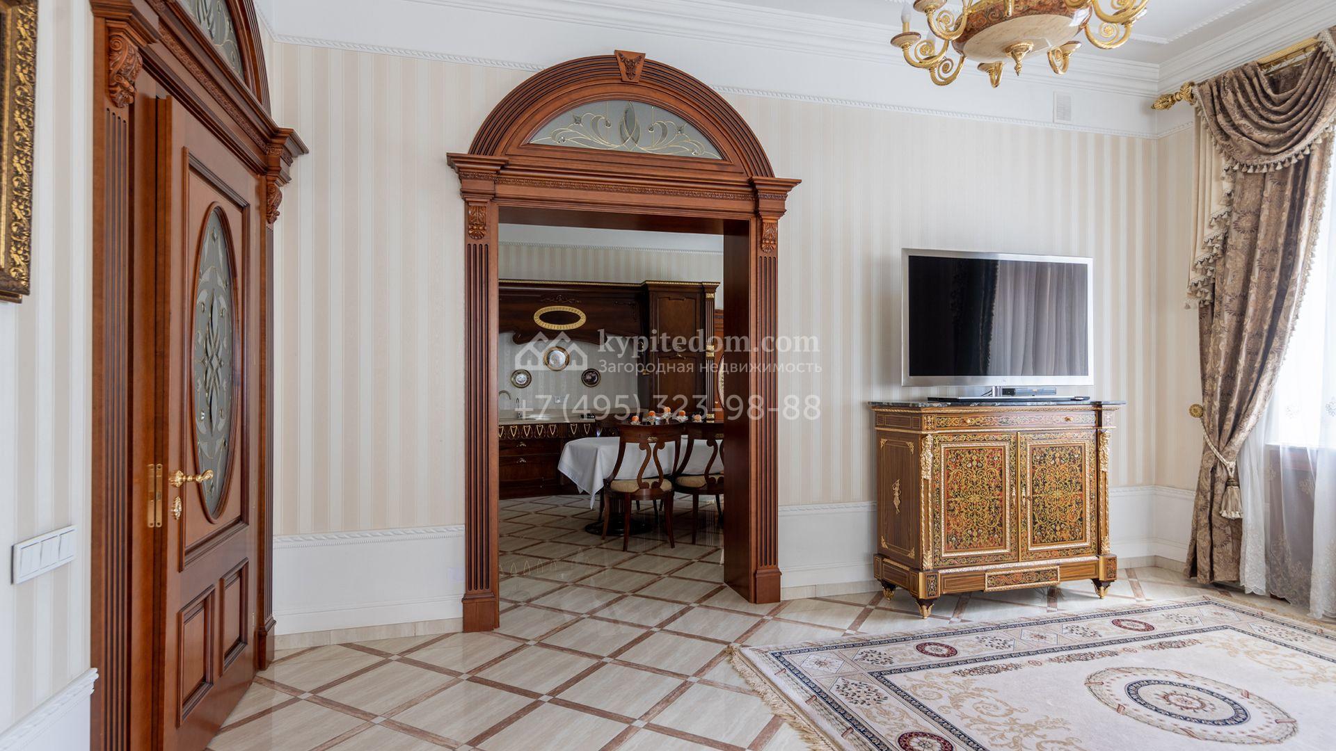 Загородный особняк в стиле русского модерна площадью 2009 м² построен на просторном участке 0,9 гектара с собственным озером. Фасад дома облицован бежевой штукатуркой, декорирован панно, рустовкой и коваными элементами. В отделке интерьера использованы светлые, теплые оттенки, создающие атмосферу уюта. Планировкой резиденции предусмотрены 3 спальни, 2 гостиные, одна из которых с камином и вторым светом, кухня, 2 столовые, кабинет и спа-зона с бассейном длиной 16 метров, хаммамом и сауной. На территории построены 4 гаража, гостевой дом, летний домик, беседка и зона барбекю, а также обустроены парк, сад, фонтан и паркинг. На участке с 2-мя въездами выполнены ландшафтный дизайн и дренажные работы, установлена система автополива, вымощены дорожки и оборудовано уличное освещение.