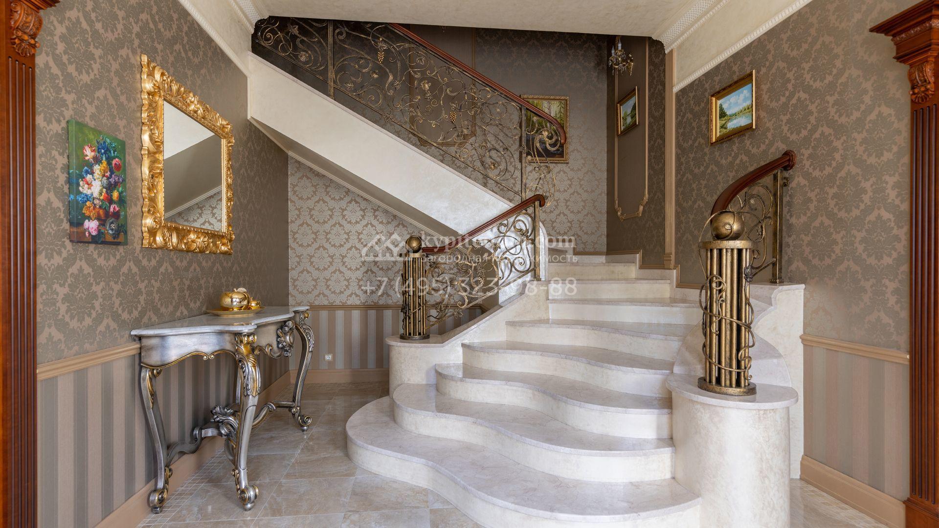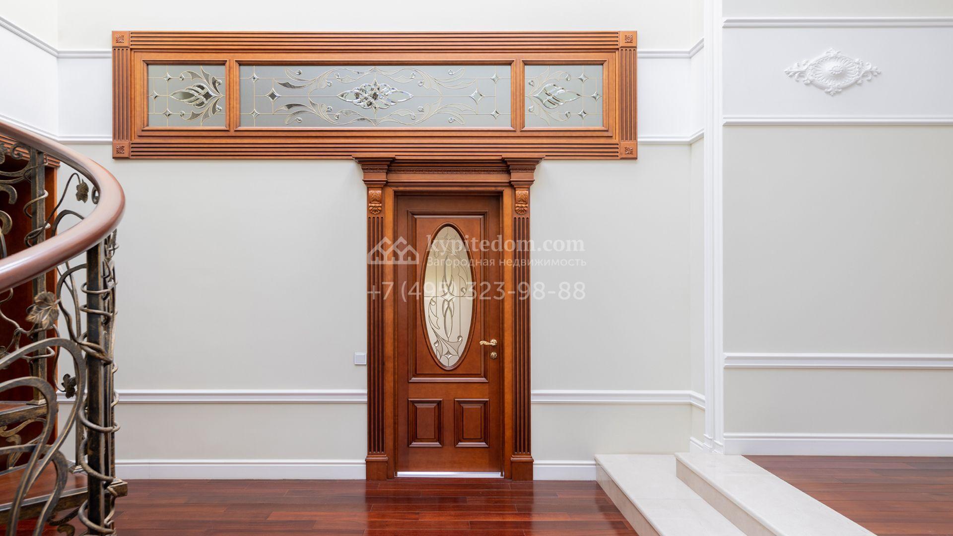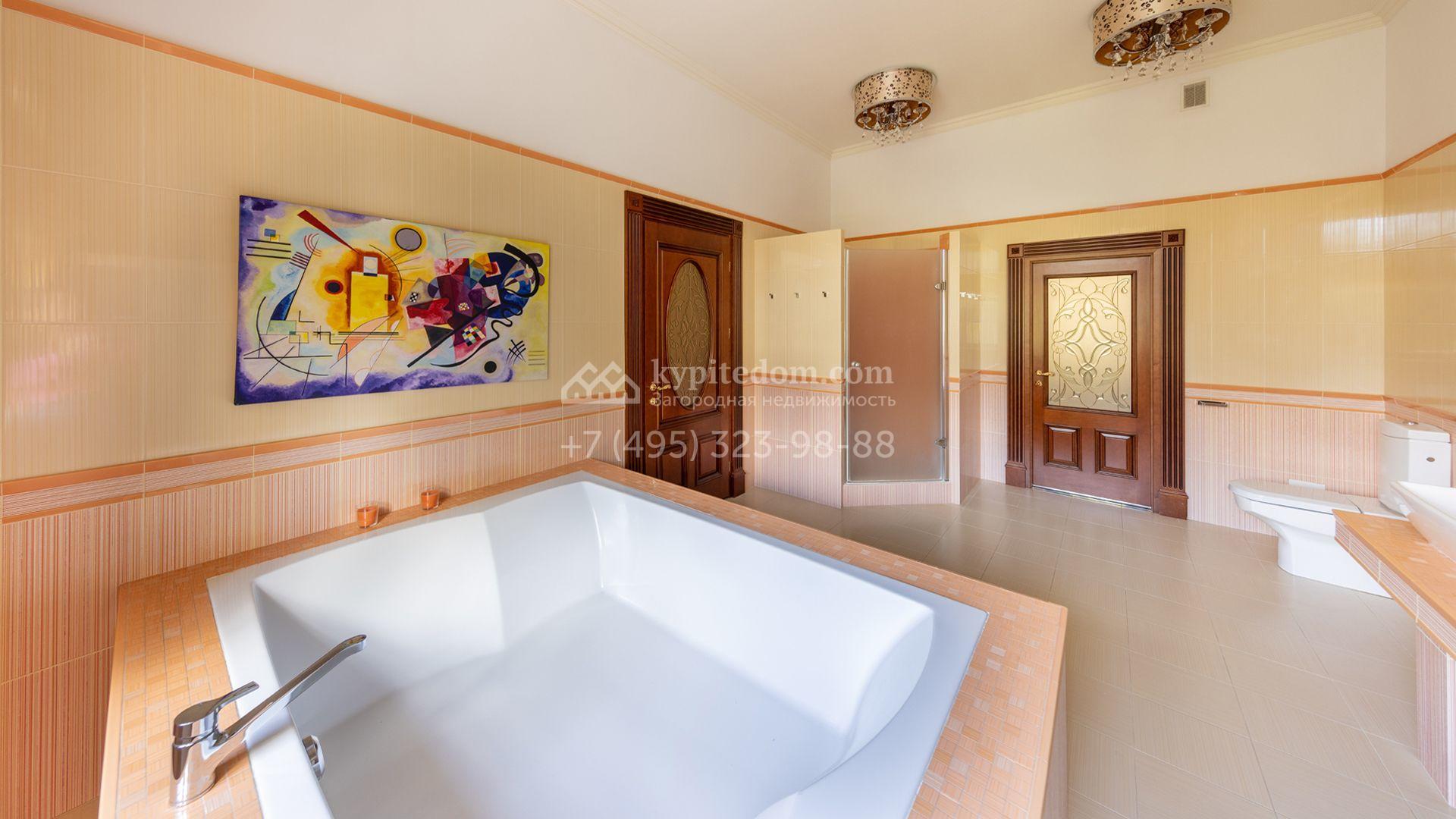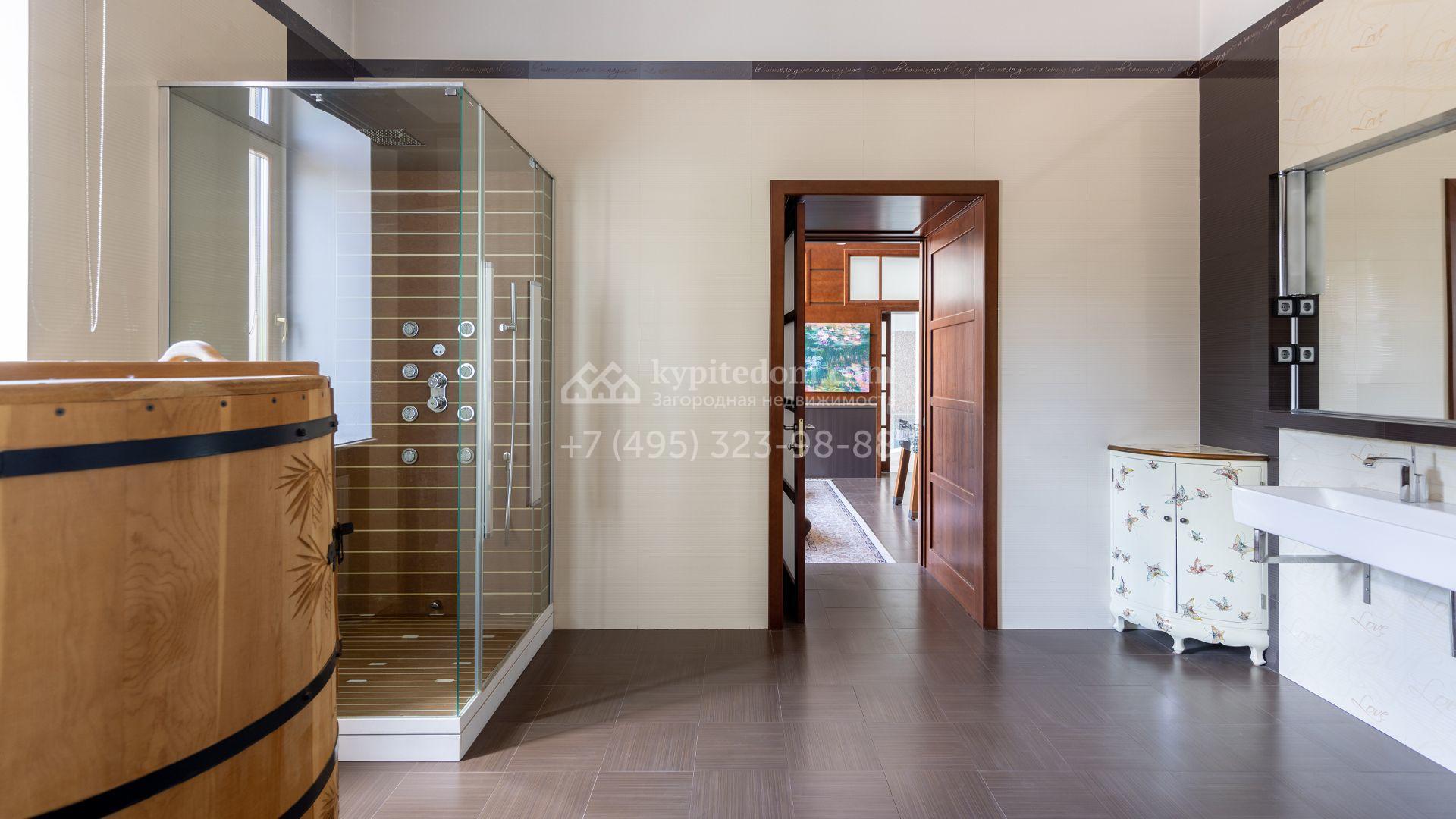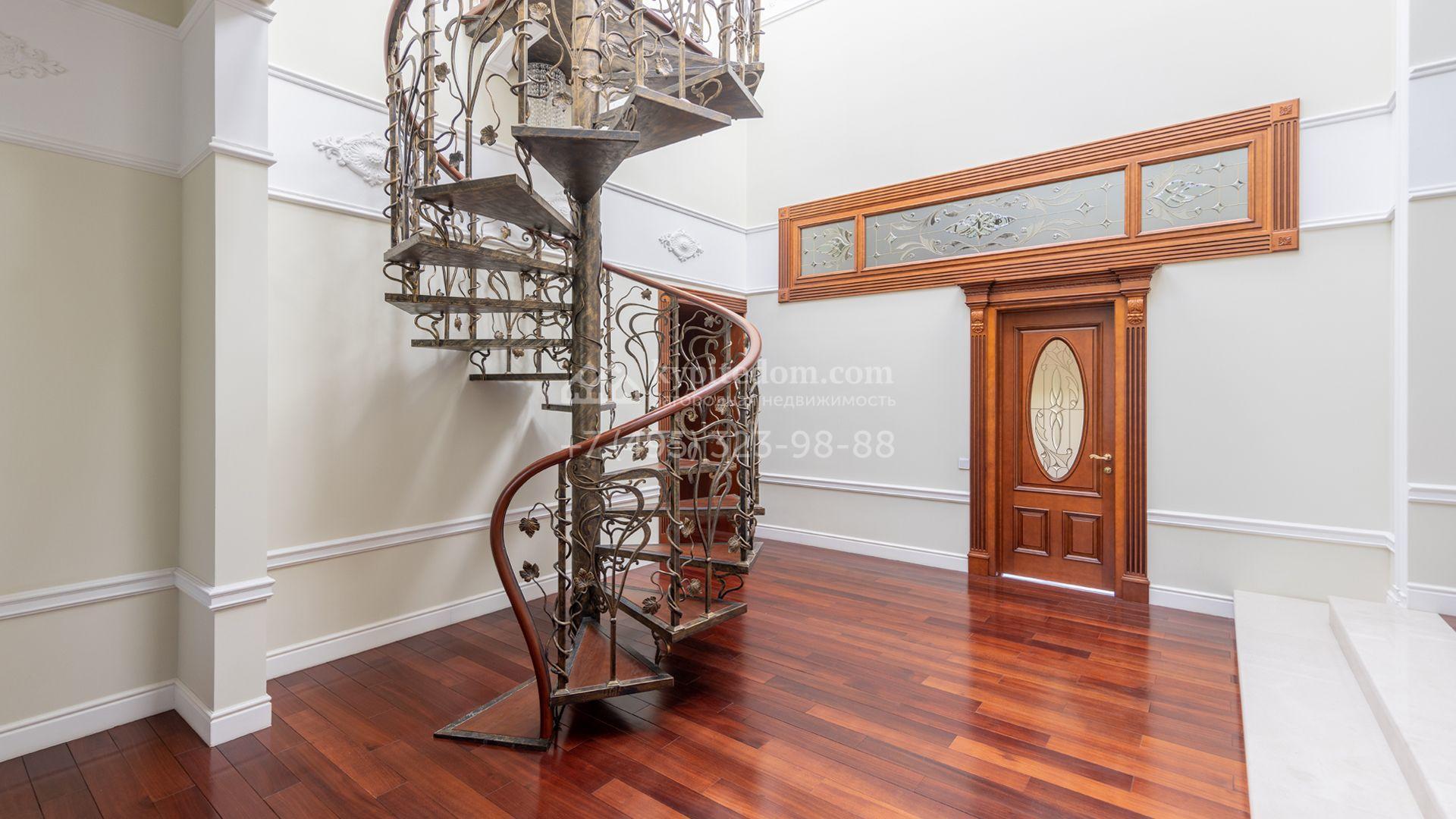 Загородный особняк в стиле русского модерна площадью 2009 м² построен на просторном участке 0,9 гектара с собственным озером. Фасад дома облицован бежевой штукатуркой, декорирован панно, рустовкой и коваными элементами. В отделке интерьера использованы светлые, теплые оттенки, создающие атмосферу уюта. Планировкой резиденции предусмотрены 3 спальни, 2 гостиные, одна из которых с камином и вторым светом, кухня, 2 столовые, кабинет и спа-зона с бассейном длиной 16 метров, хаммамом и сауной. На территории построены 4 гаража, гостевой дом, летний домик, беседка и зона барбекю, а также обустроены парк, сад, фонтан и паркинг. На участке с 2-мя въездами выполнены ландшафтный дизайн и дренажные работы, установлена система автополива, вымощены дорожки и оборудовано уличное освещение.