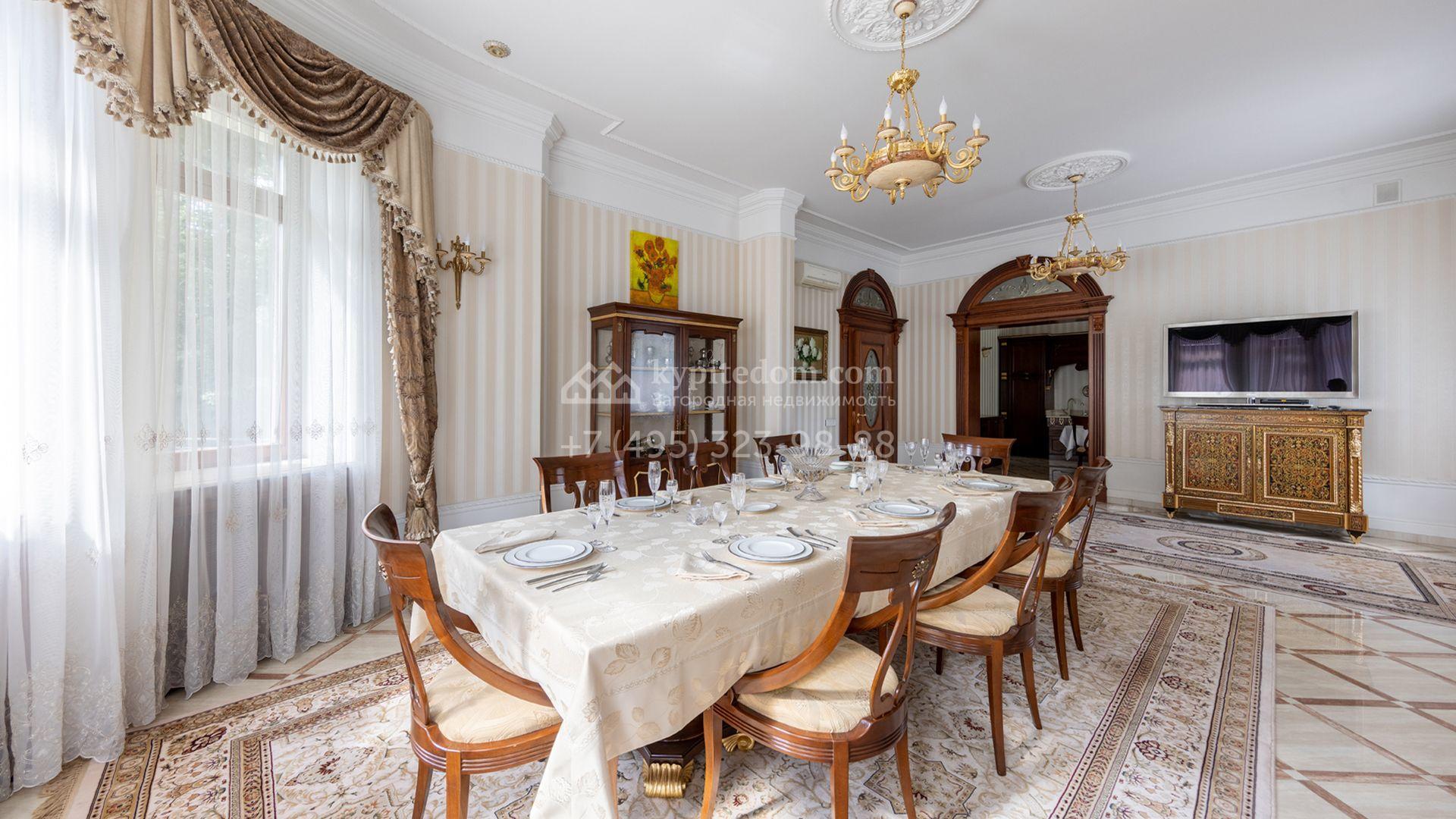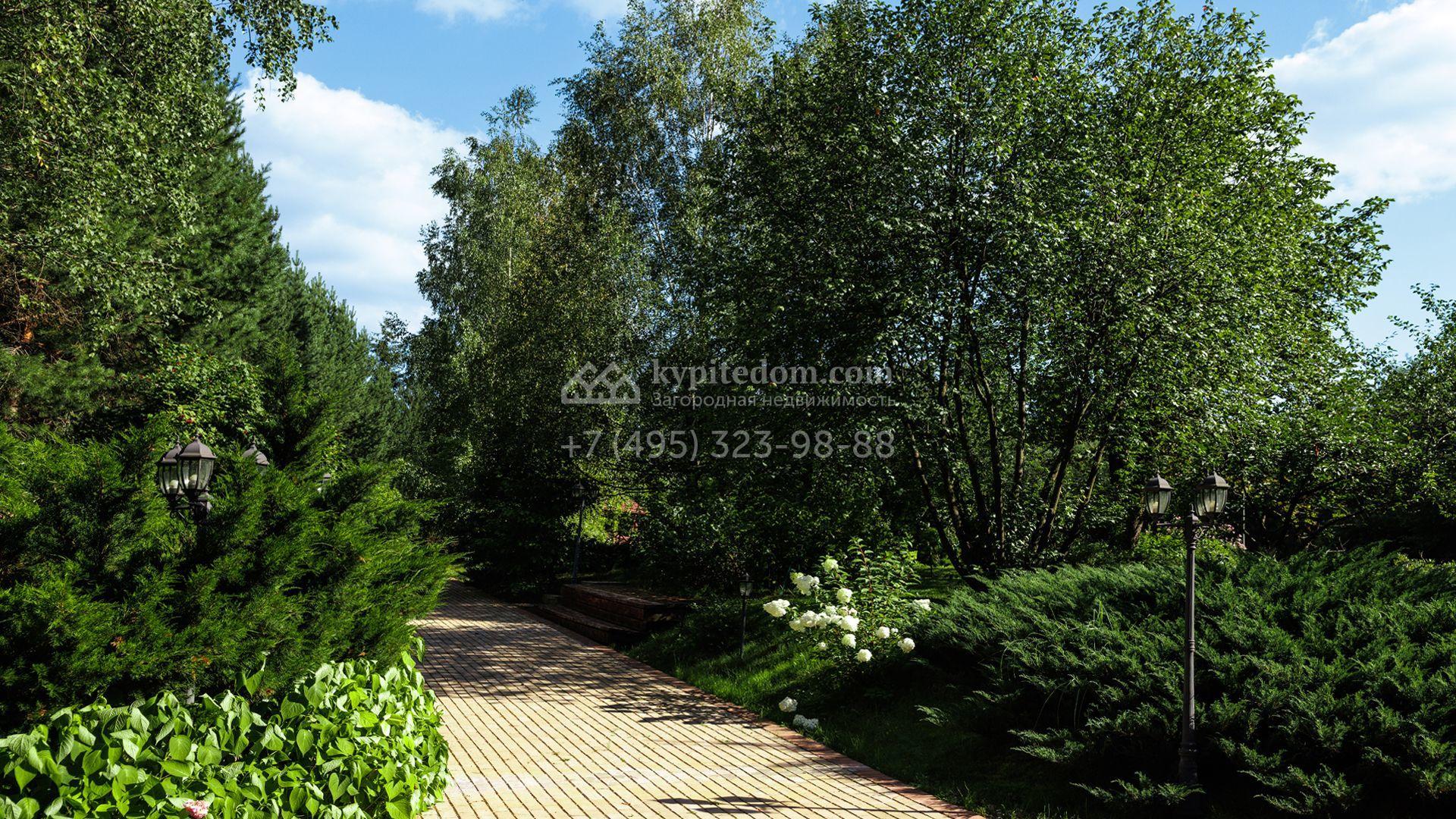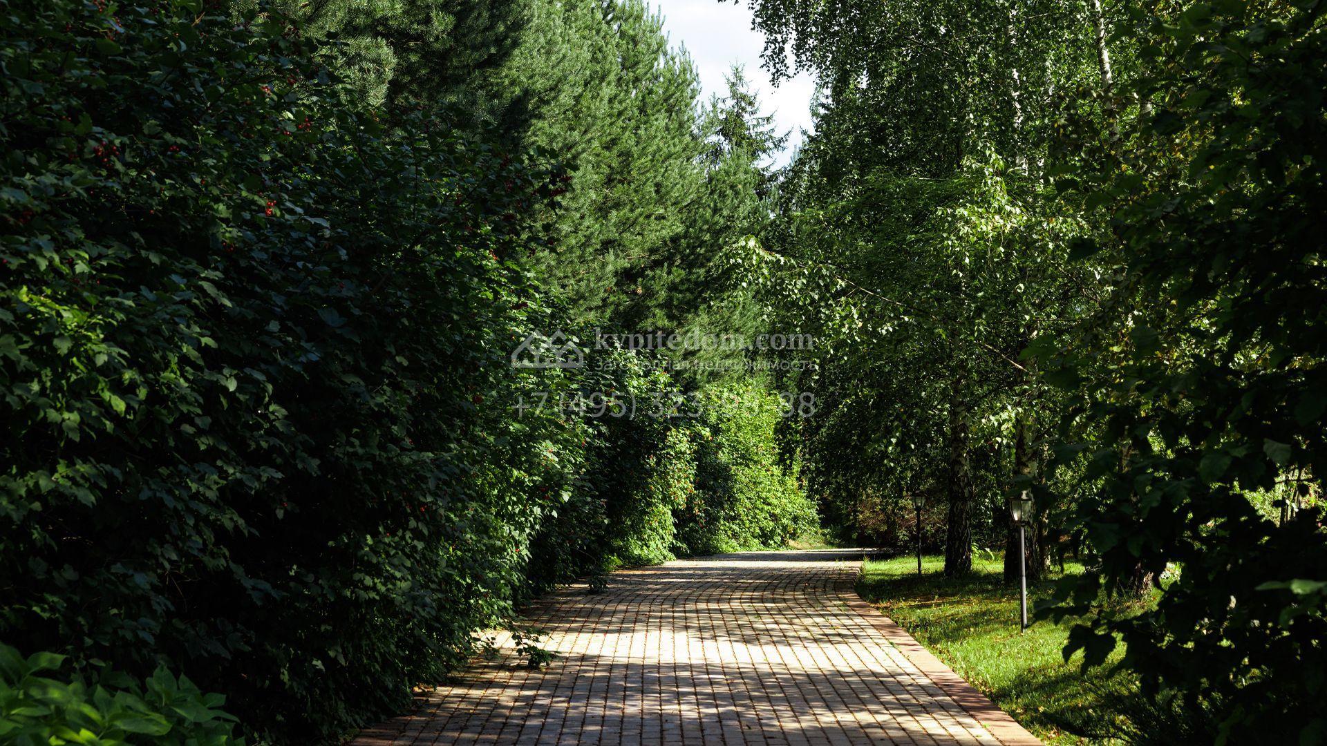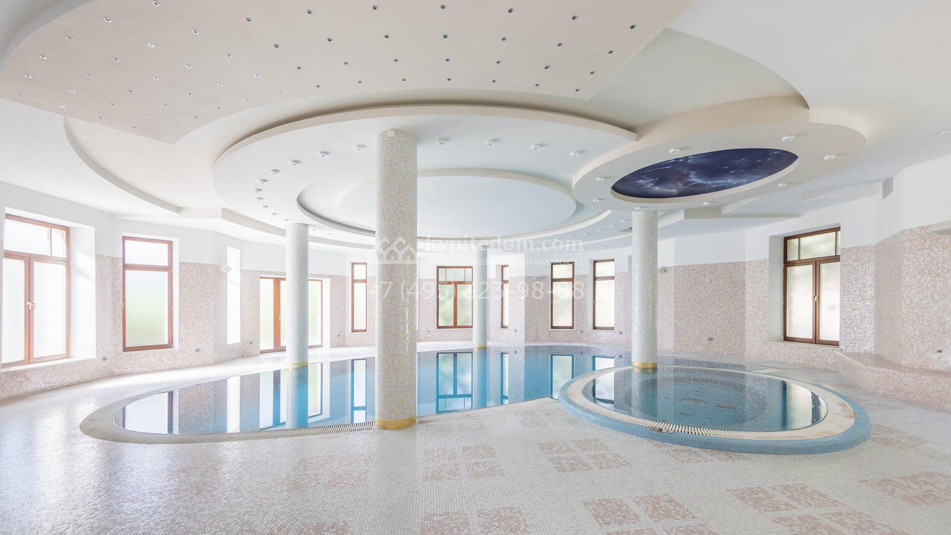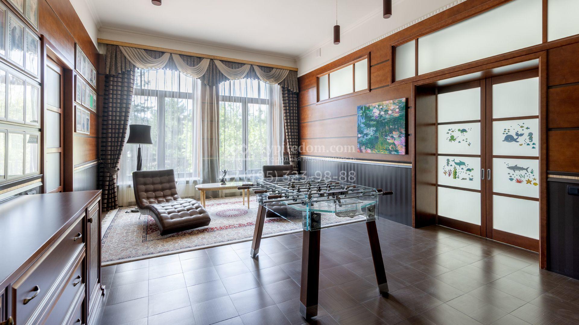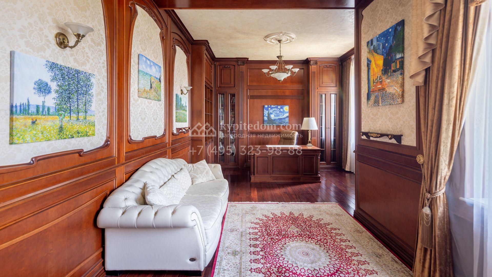 Загородный особняк в стиле русского модерна площадью 2009 м² построен на просторном участке 0,9 гектара с собственным озером. Фасад дома облицован бежевой штукатуркой, декорирован панно, рустовкой и коваными элементами. В отделке интерьера использованы светлые, теплые оттенки, создающие атмосферу уюта. Планировкой резиденции предусмотрены 3 спальни, 2 гостиные, одна из которых с камином и вторым светом, кухня, 2 столовые, кабинет и спа-зона с бассейном длиной 16 метров, хаммамом и сауной. На территории построены 4 гаража, гостевой дом, летний домик, беседка и зона барбекю, а также обустроены парк, сад, фонтан и паркинг. На участке с 2-мя въездами выполнены ландшафтный дизайн и дренажные работы, установлена система автополива, вымощены дорожки и оборудовано уличное освещение.