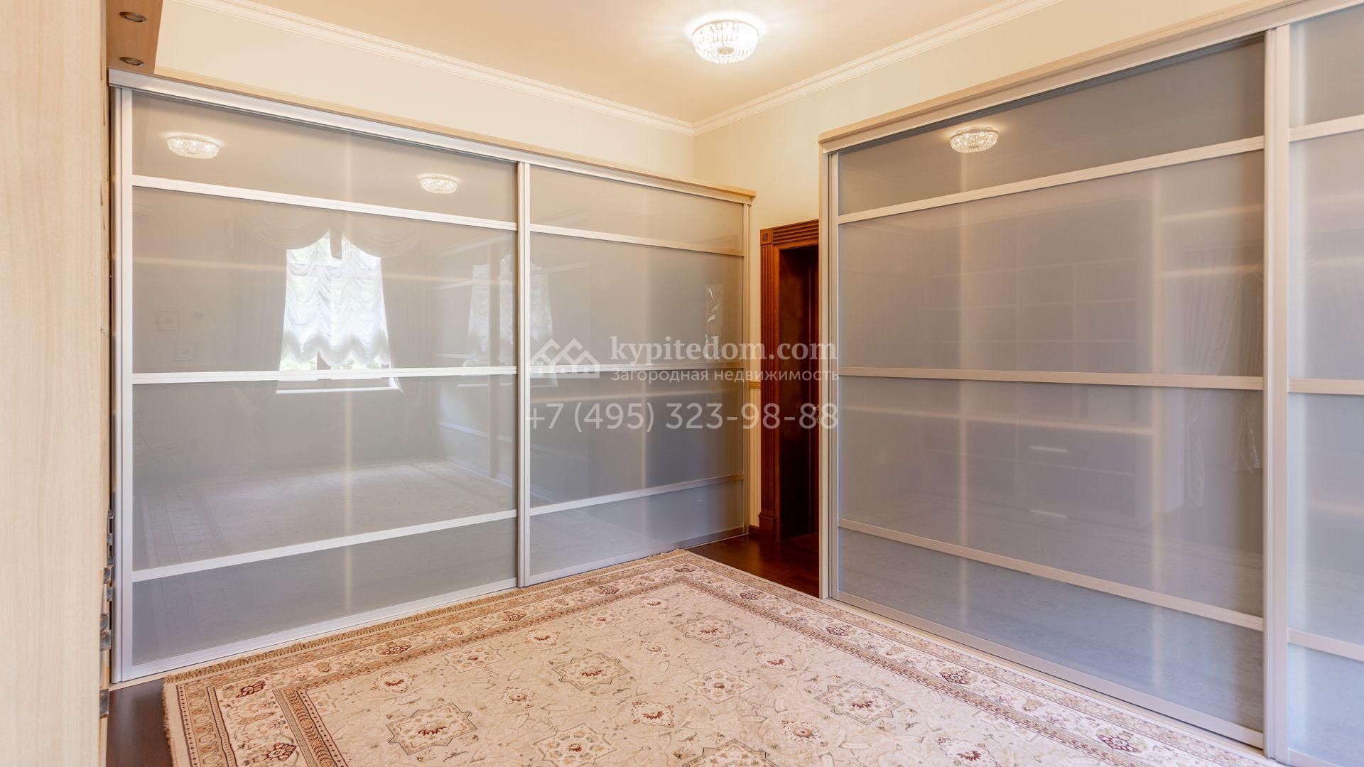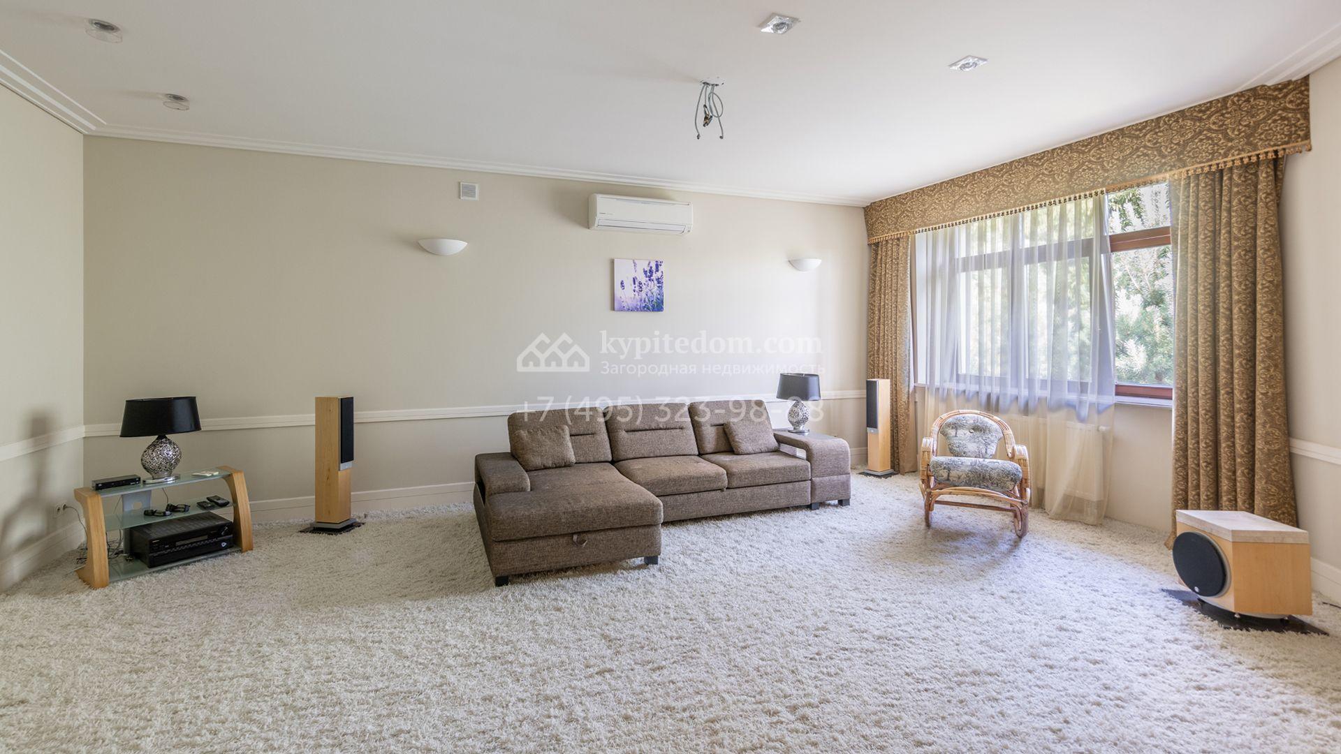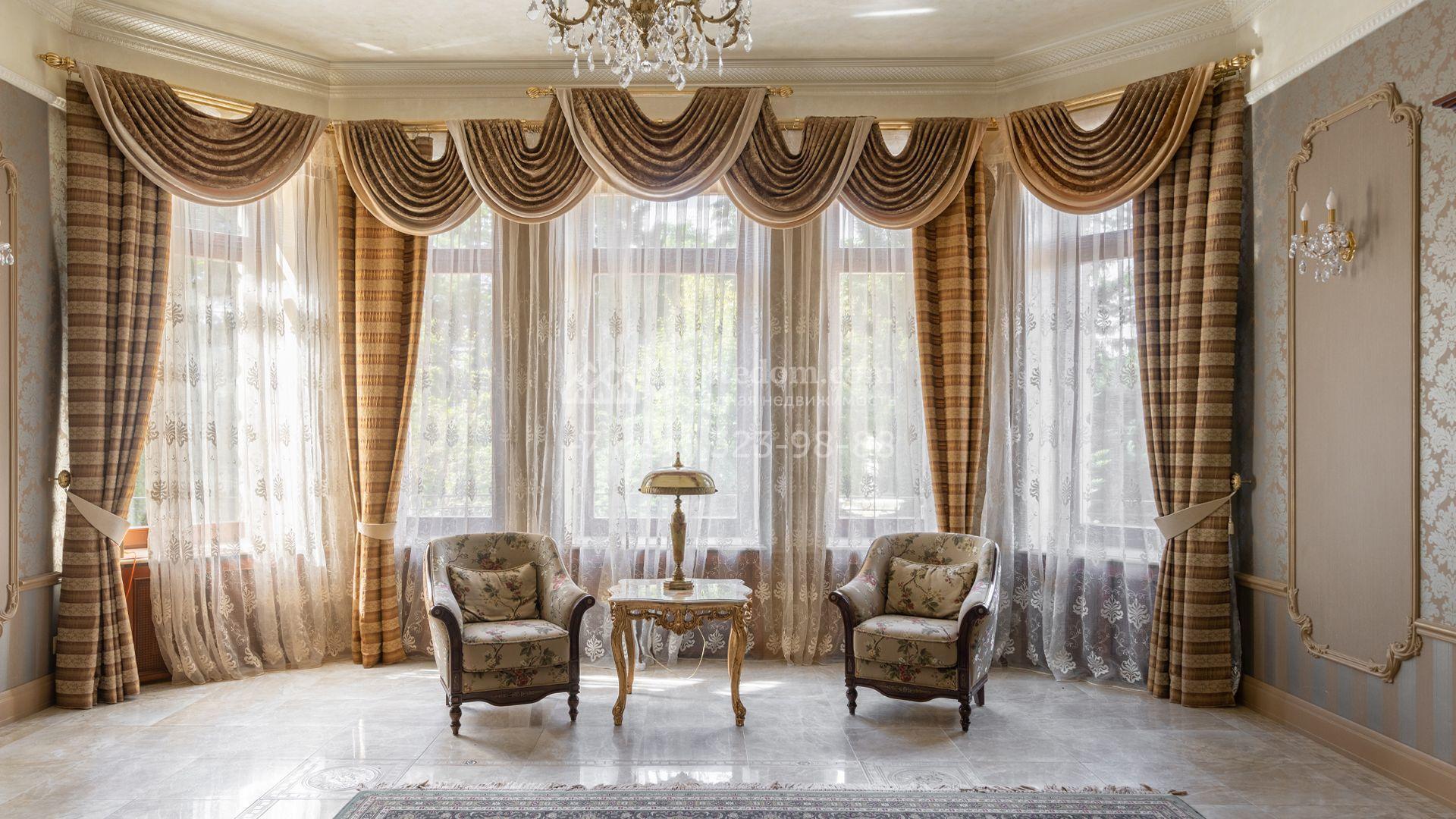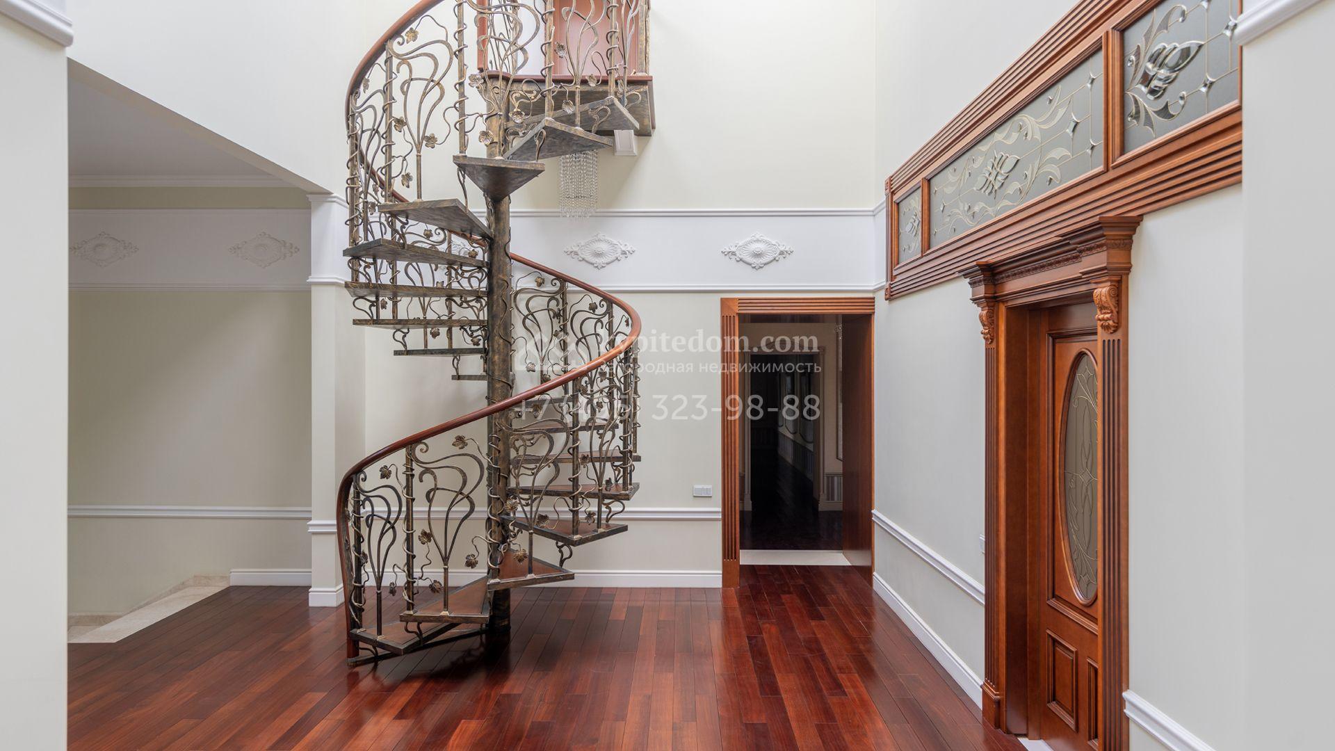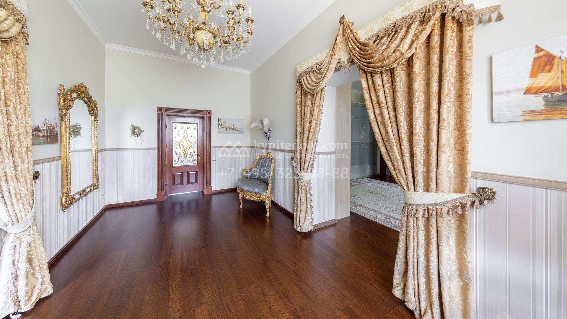Загородный особняк в стиле русского модерна площадью 2009 м² построен на просторном участке 0,9 гектара с собственным озером. Фасад дома облицован бежевой штукатуркой, декорирован панно, рустовкой и коваными элементами. В отделке интерьера использованы светлые, теплые оттенки, создающие атмосферу уюта. Планировкой резиденции предусмотрены 3 спальни, 2 гостиные, одна из которых с камином и вторым светом, кухня, 2 столовые, кабинет и спа-зона с бассейном длиной 16 метров, хаммамом и сауной. На территории построены 4 гаража, гостевой дом, летний домик, беседка и зона барбекю, а также обустроены парк, сад, фонтан и паркинг. На участке с 2-мя въездами выполнены ландшафтный дизайн и дренажные работы, установлена система автополива, вымощены дорожки и оборудовано уличное освещение.