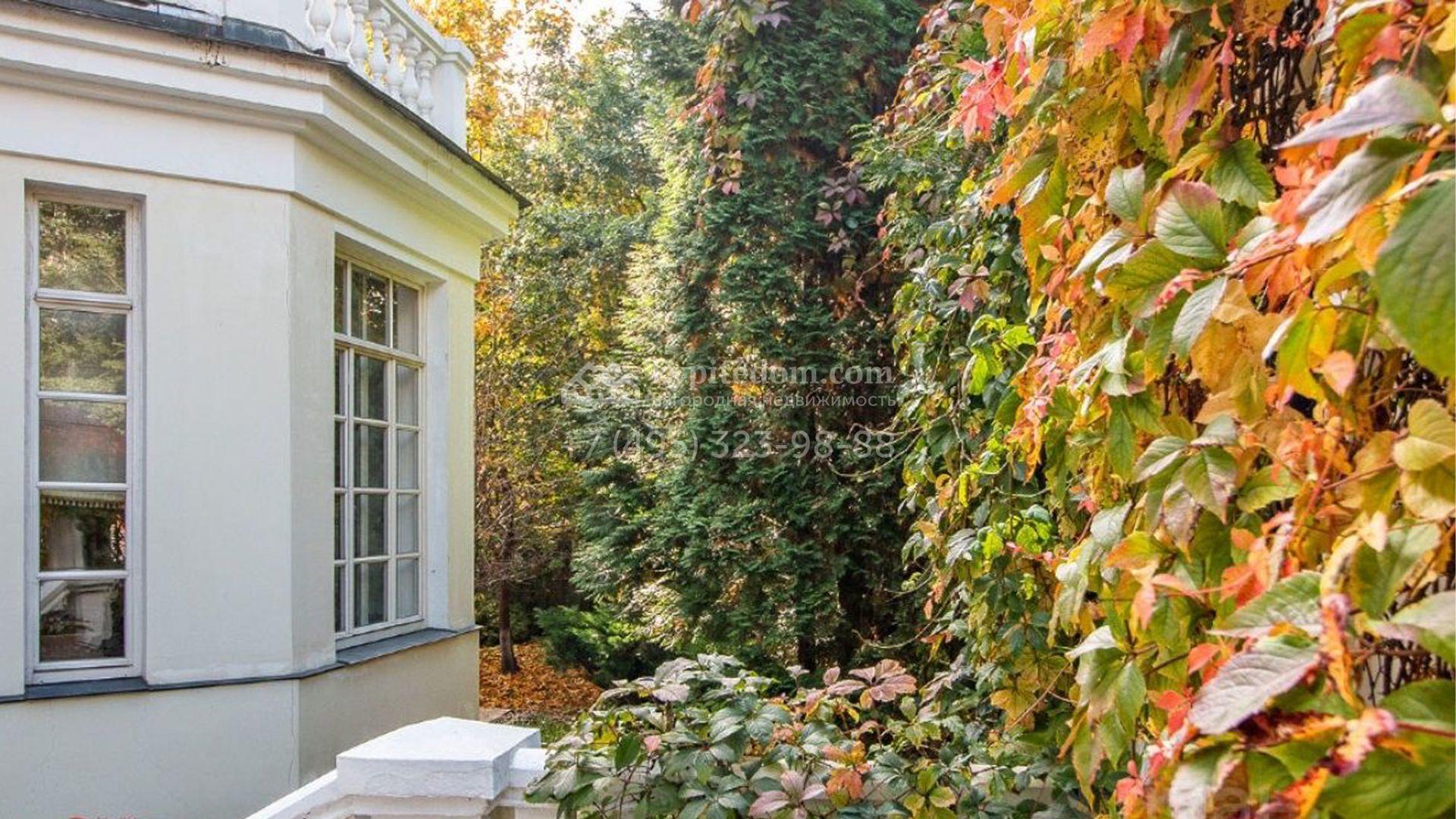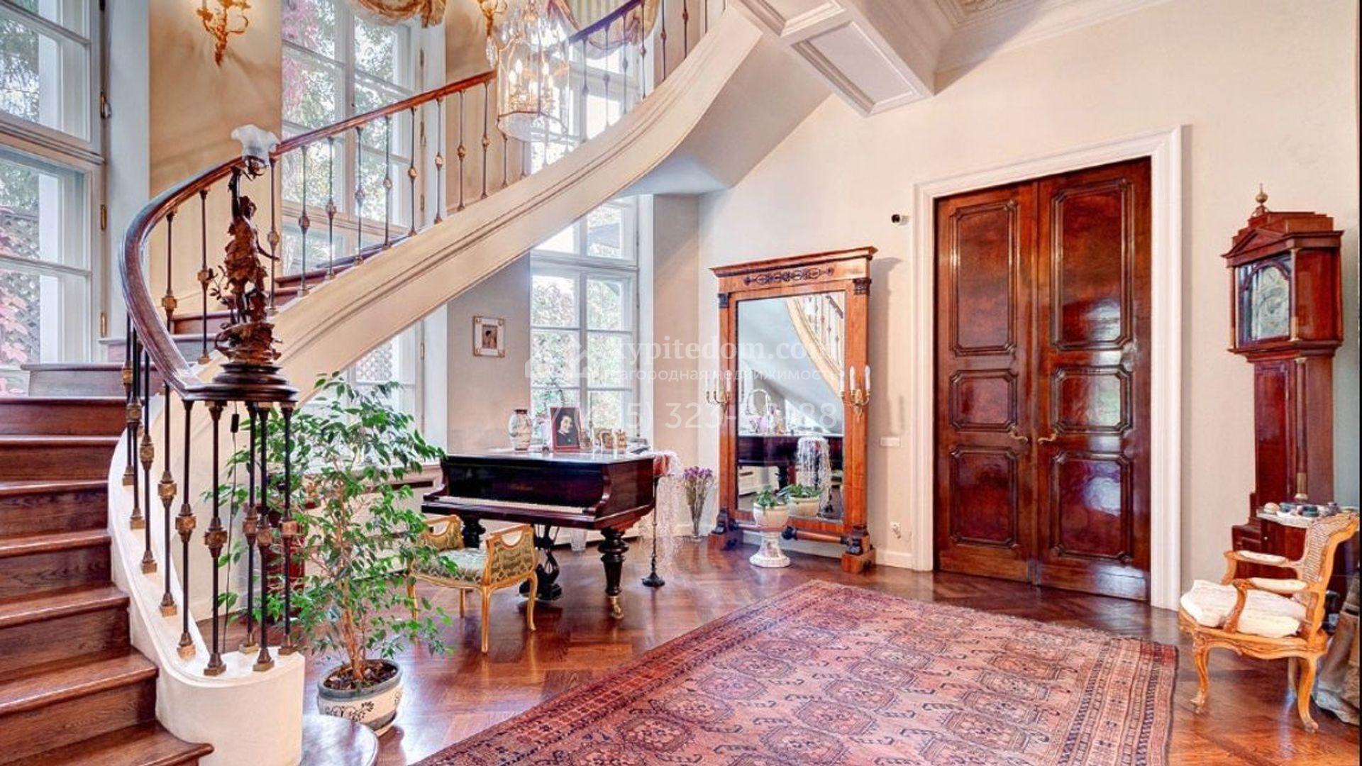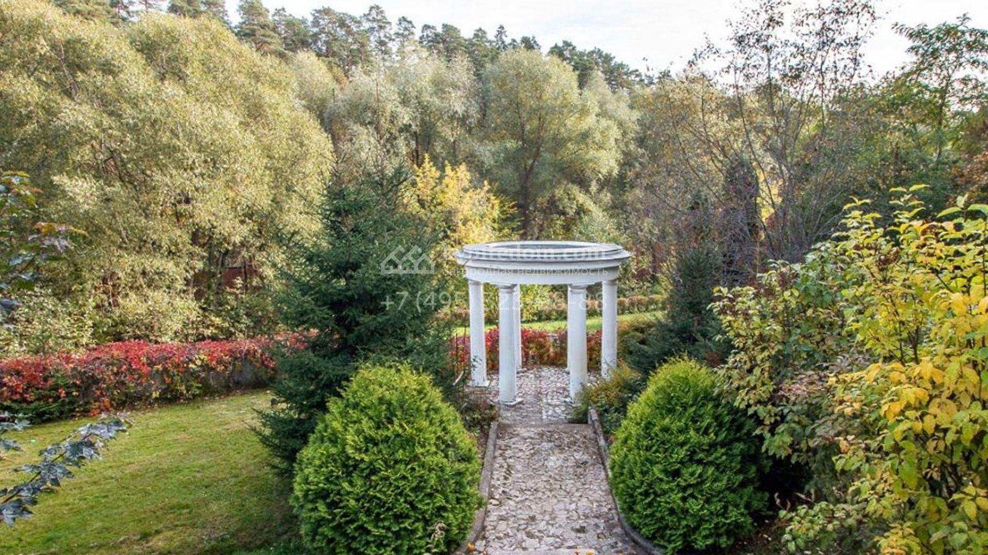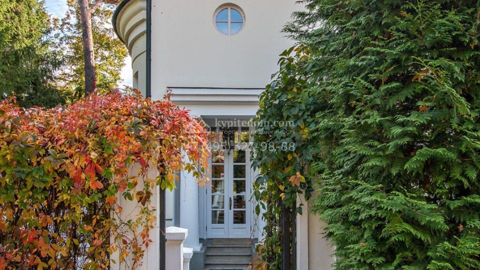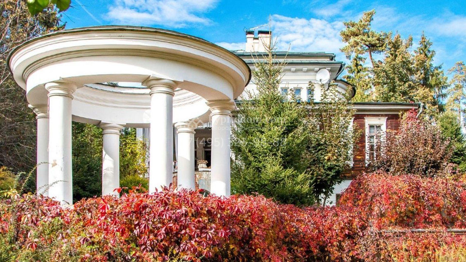 Загородный особняк площадью 800 м² построен на просторном лесном участке 25 соток возле реки. Фасад выполнен в стиле классической русской усадьбы, облицован бежевой штукатуркой с красно-коричневой вставкой. В отделке использованы теплые оттенки, создающие домашний уют. Дом полностью меблирован. Планировка резиденции включает 7 спален, гостиную, каминную, кухню, кабинет, комнату отдыха и сауну. Предусмотрен блок для персонала с 4-мя спальнями. На участке с ландшафтным дизайном расположены беседка в виде ротонды и паркинг на 2 машины.