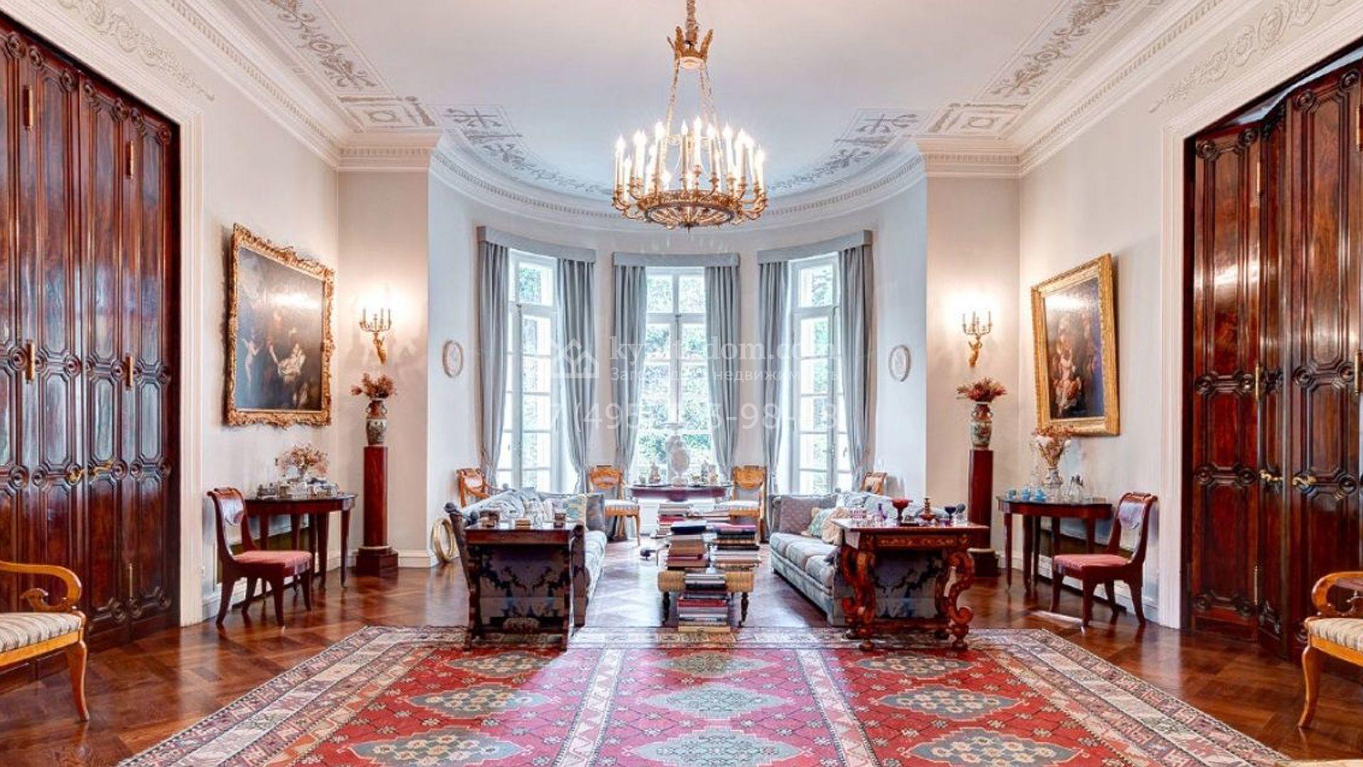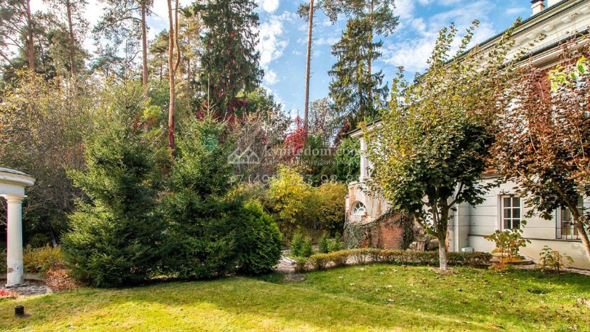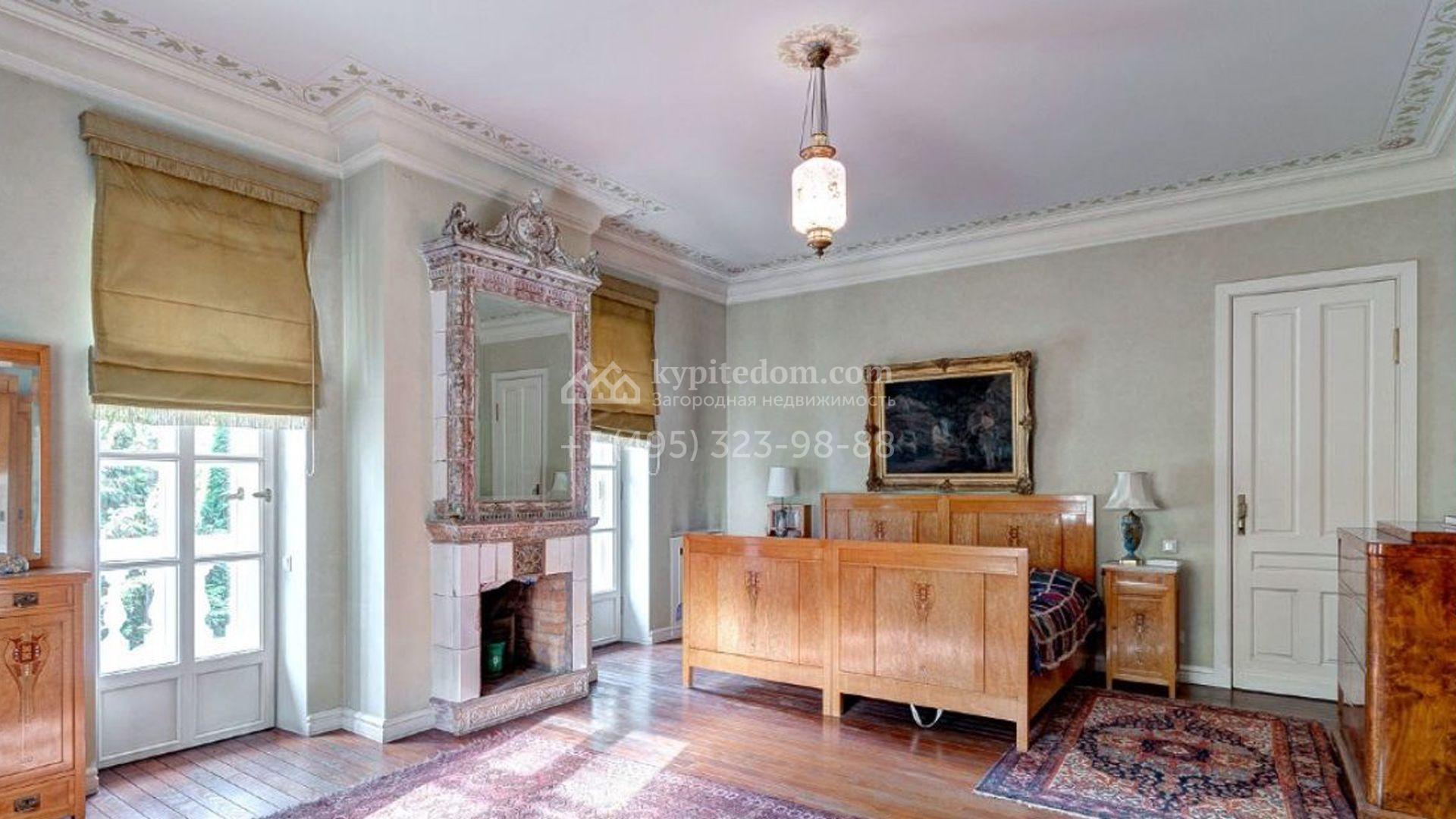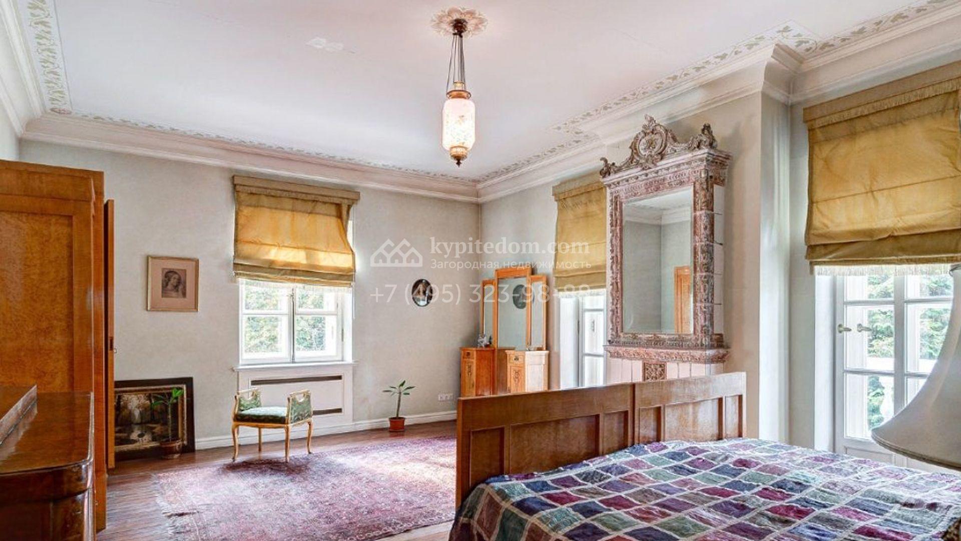 Загородный особняк площадью 800 м² построен на просторном лесном участке 25 соток возле реки. Фасад выполнен в стиле классической русской усадьбы, облицован бежевой штукатуркой с красно-коричневой вставкой. В отделке использованы теплые оттенки, создающие домашний уют. Дом полностью меблирован. Планировка резиденции включает 7 спален, гостиную, каминную, кухню, кабинет, комнату отдыха и сауну. Предусмотрен блок для персонала с 4-мя спальнями. На участке с ландшафтным дизайном расположены беседка в виде ротонды и паркинг на 2 машины.