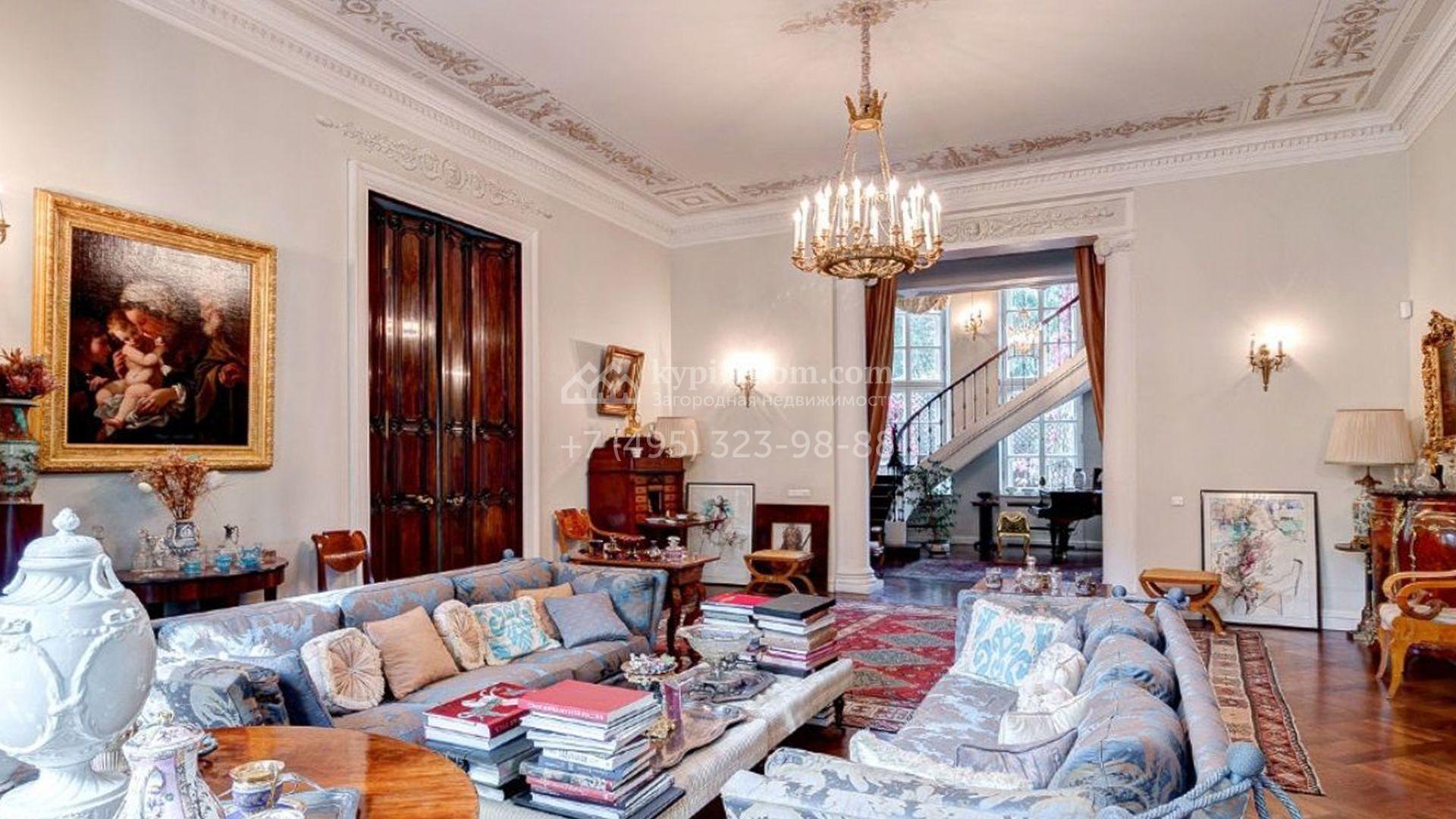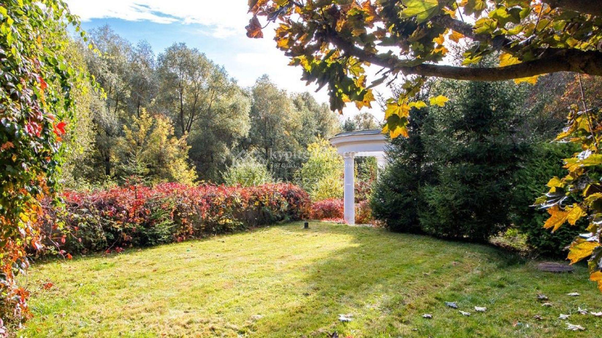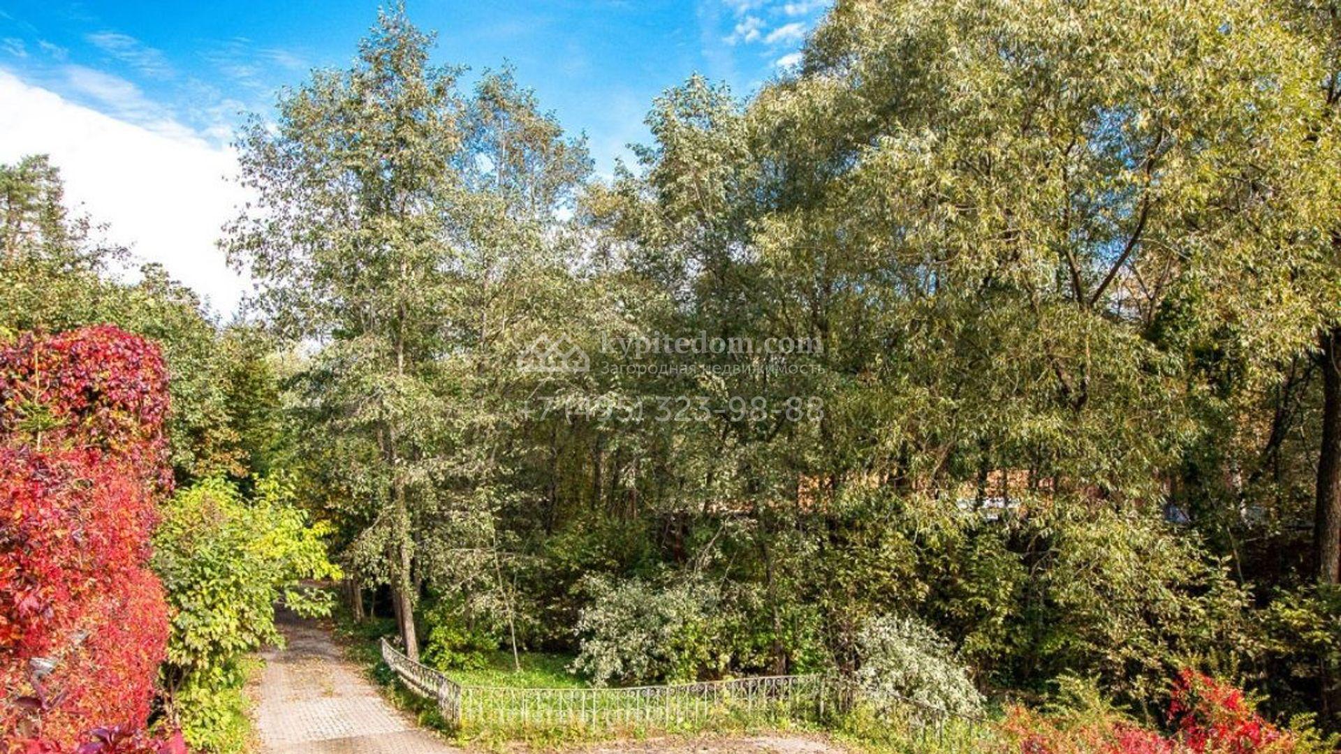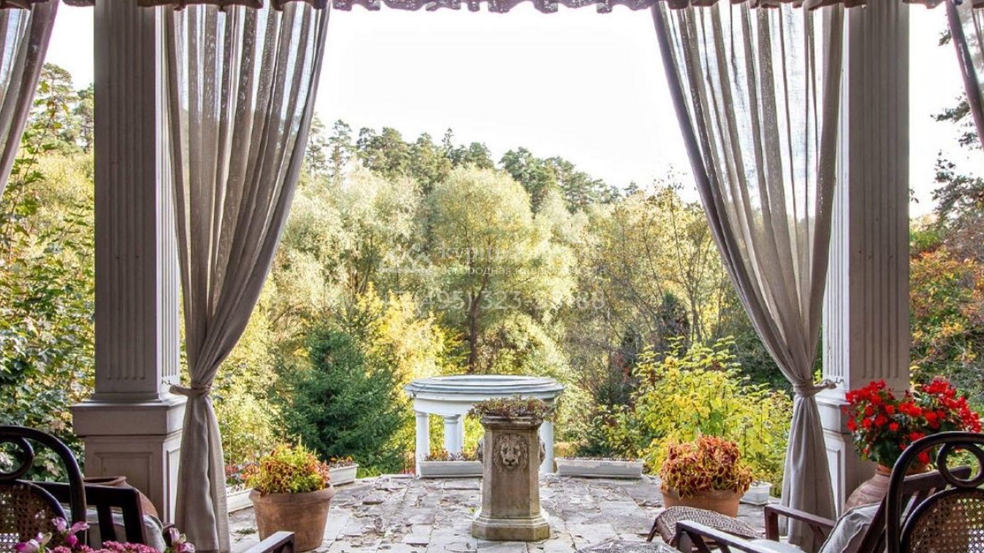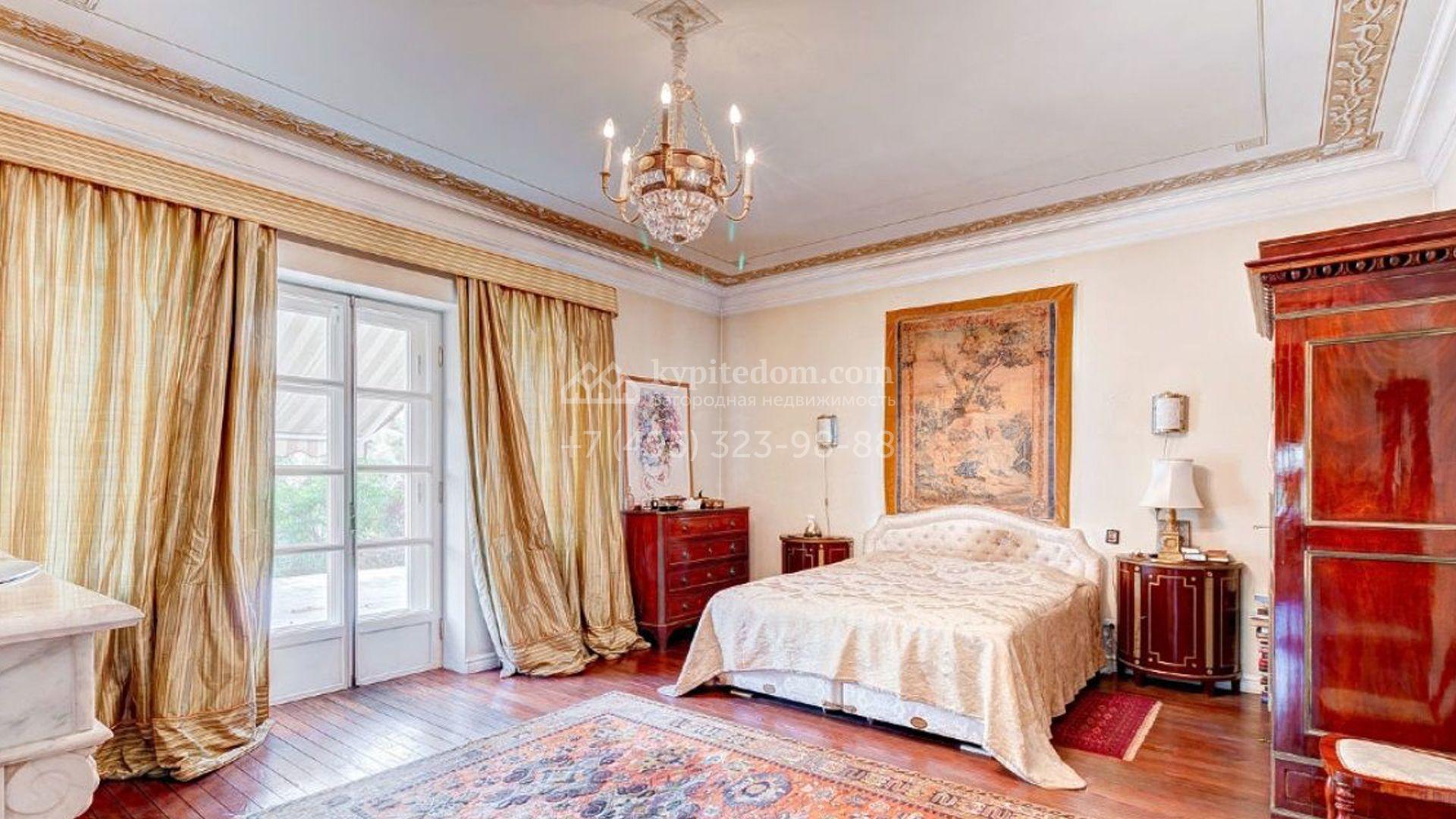 Загородный особняк площадью 800 м² построен на просторном лесном участке 25 соток возле реки. Фасад выполнен в стиле классической русской усадьбы, облицован бежевой штукатуркой с красно-коричневой вставкой. В отделке использованы теплые оттенки, создающие домашний уют. Дом полностью меблирован. Планировка резиденции включает 7 спален, гостиную, каминную, кухню, кабинет, комнату отдыха и сауну. Предусмотрен блок для персонала с 4-мя спальнями. На участке с ландшафтным дизайном расположены беседка в виде ротонды и паркинг на 2 машины.