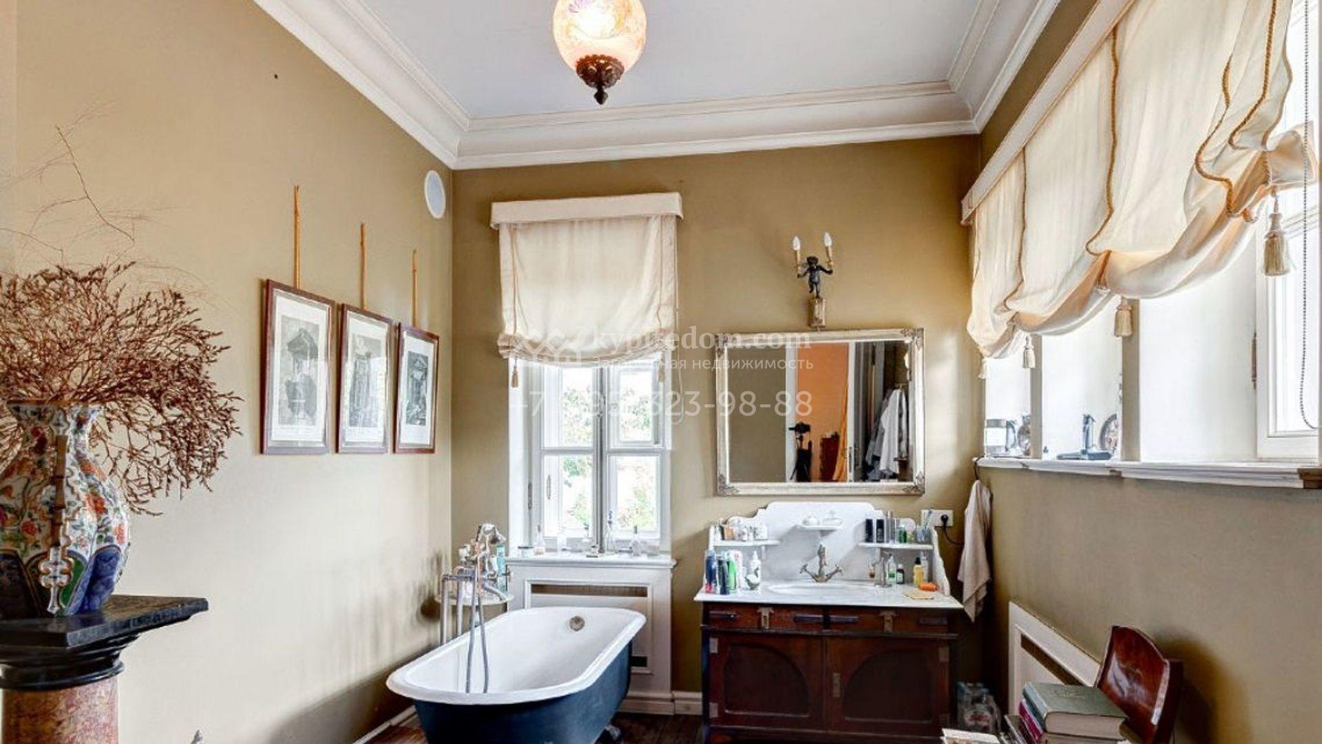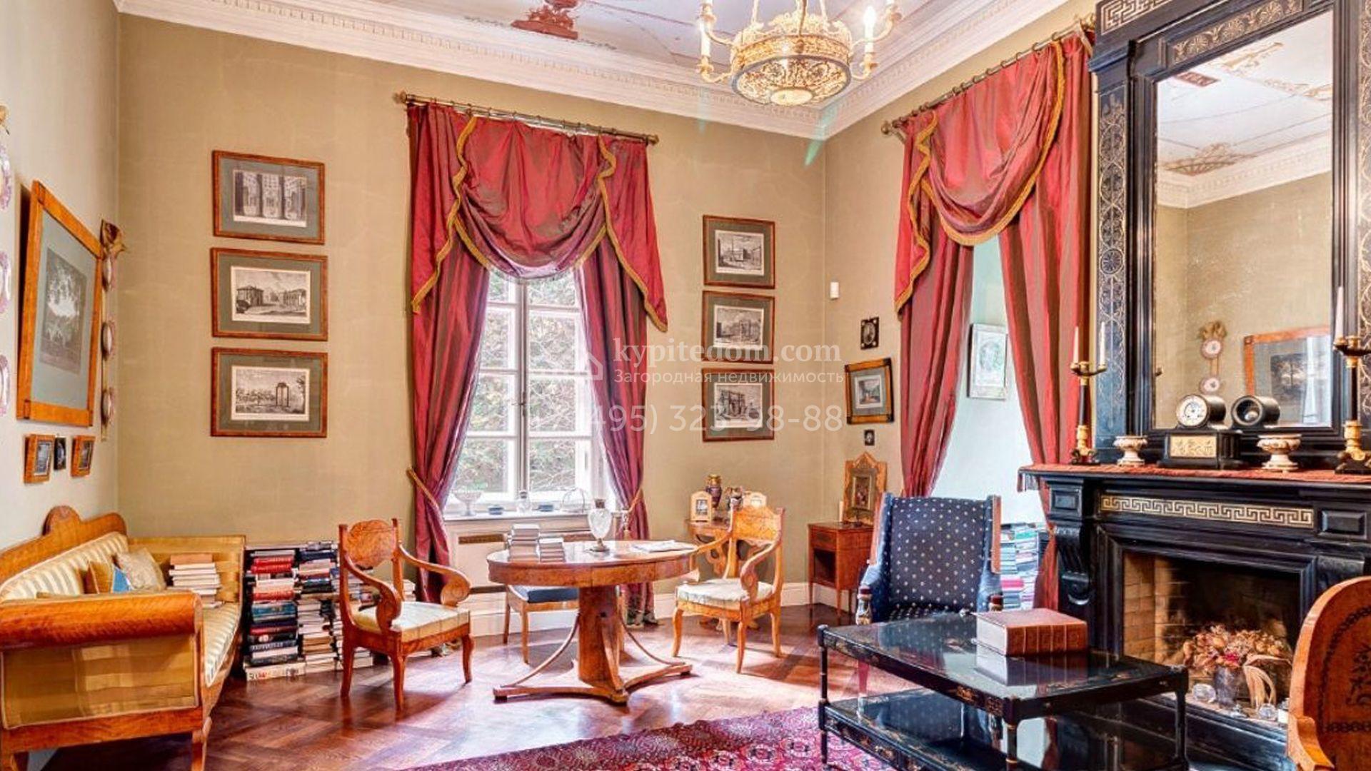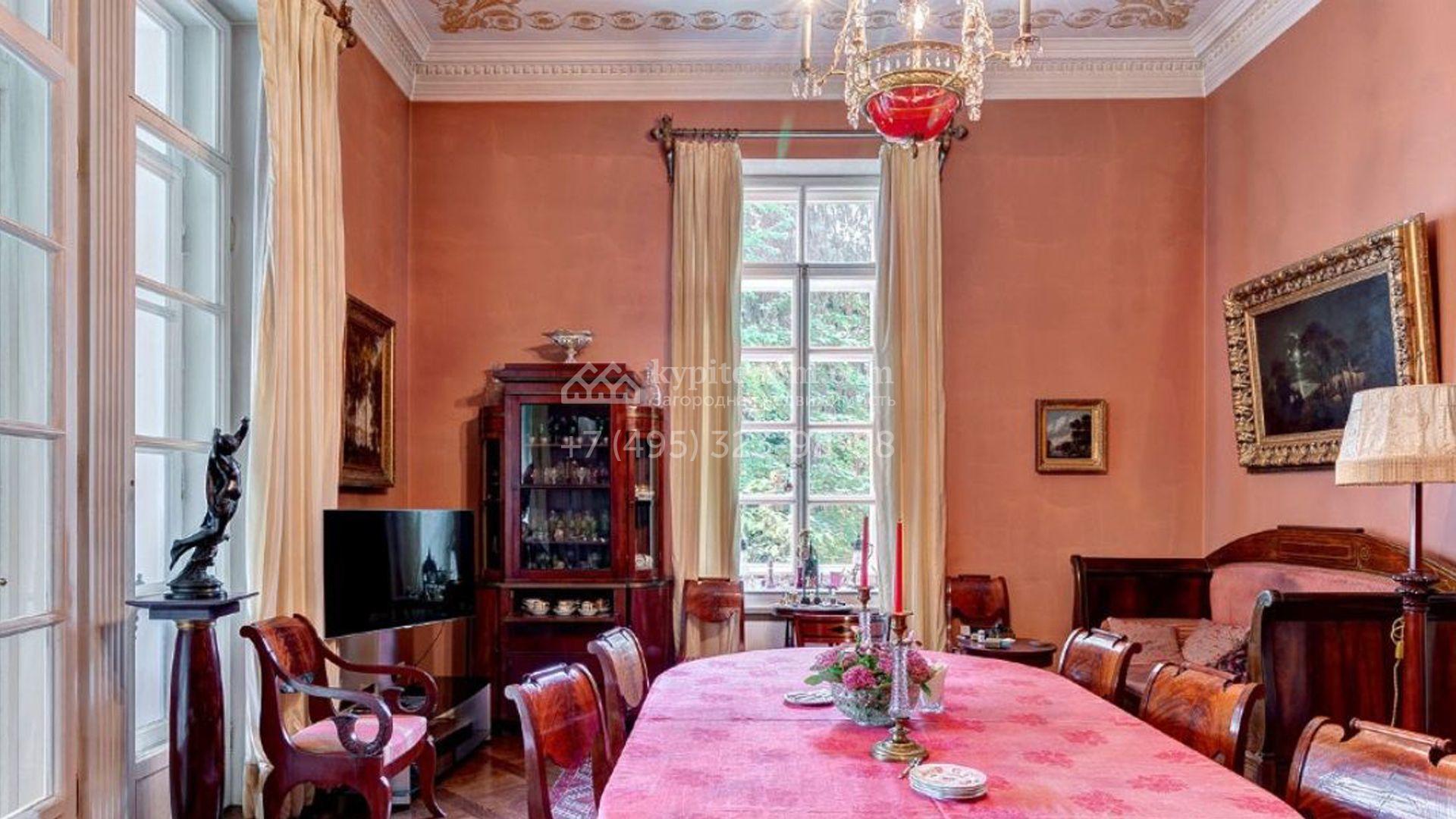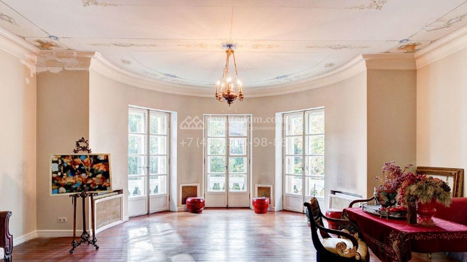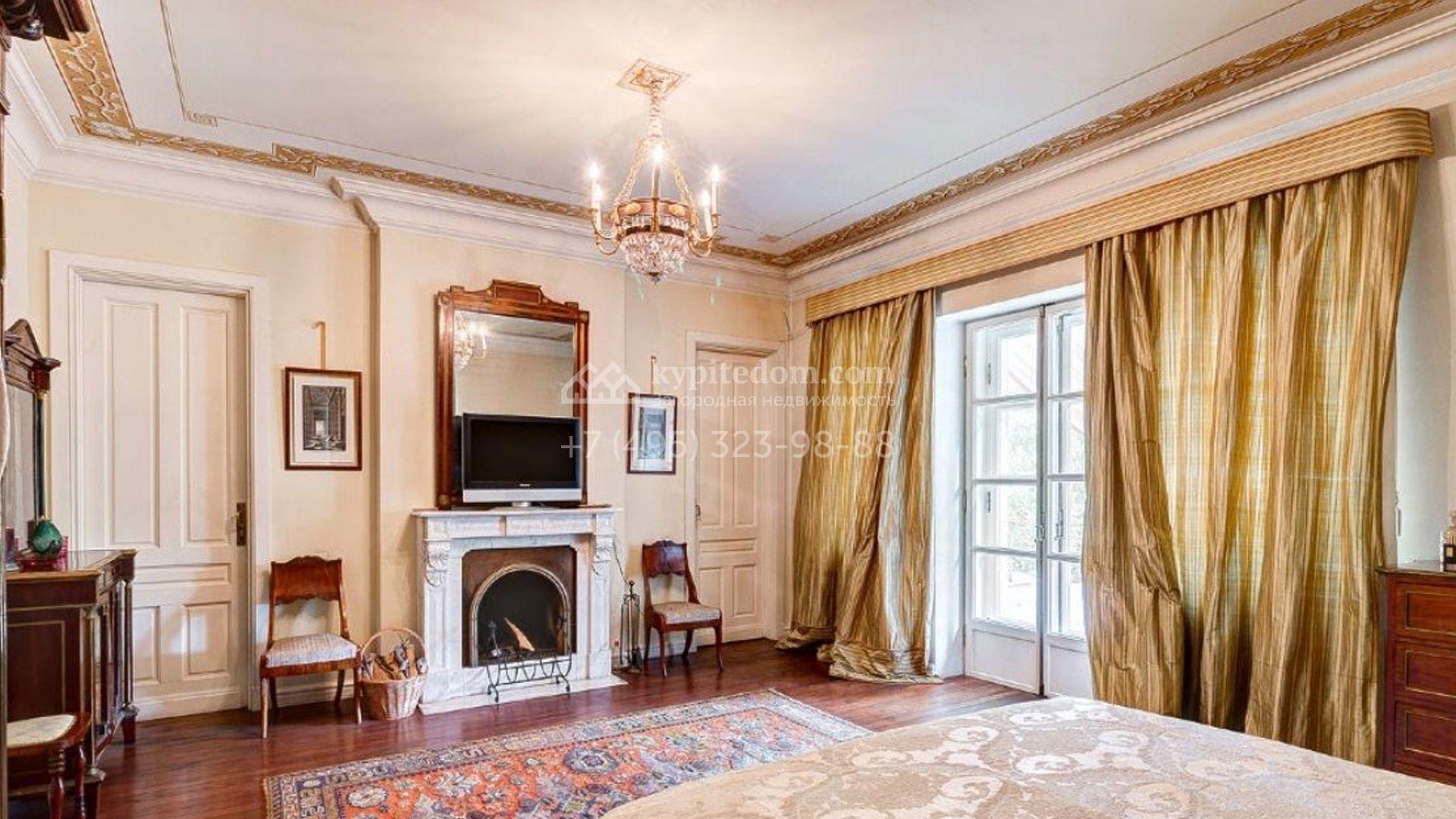 Загородный особняк площадью 800 м² построен на просторном лесном участке 25 соток возле реки. Фасад выполнен в стиле классической русской усадьбы, облицован бежевой штукатуркой с красно-коричневой вставкой. В отделке использованы теплые оттенки, создающие домашний уют. Дом полностью меблирован. Планировка резиденции включает 7 спален, гостиную, каминную, кухню, кабинет, комнату отдыха и сауну. Предусмотрен блок для персонала с 4-мя спальнями. На участке с ландшафтным дизайном расположены беседка в виде ротонды и паркинг на 2 машины.