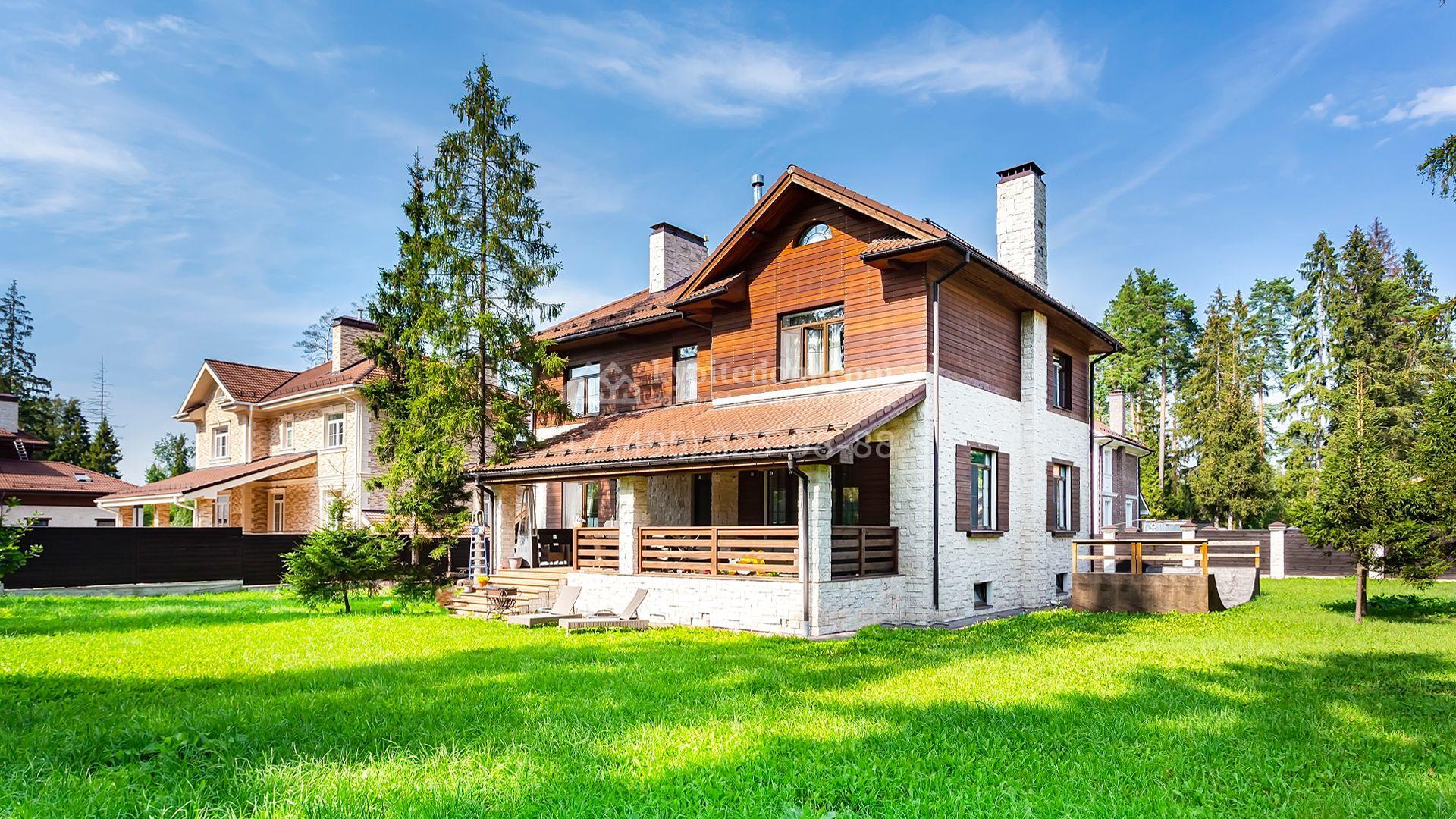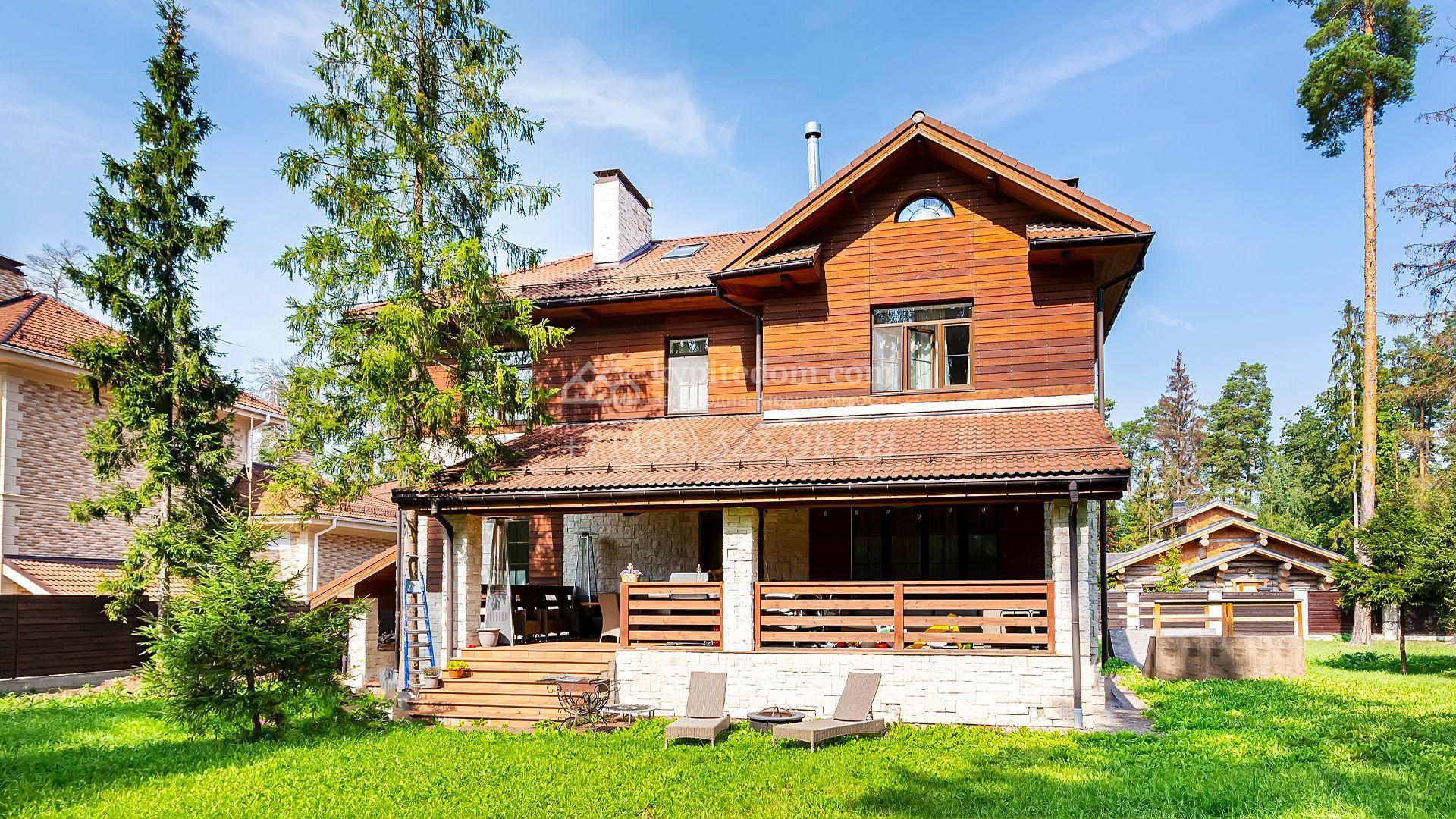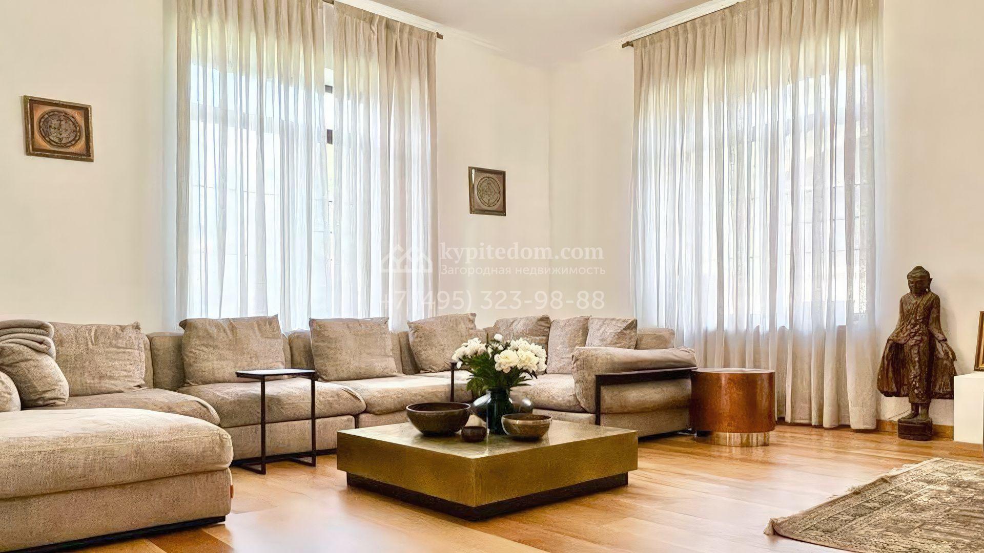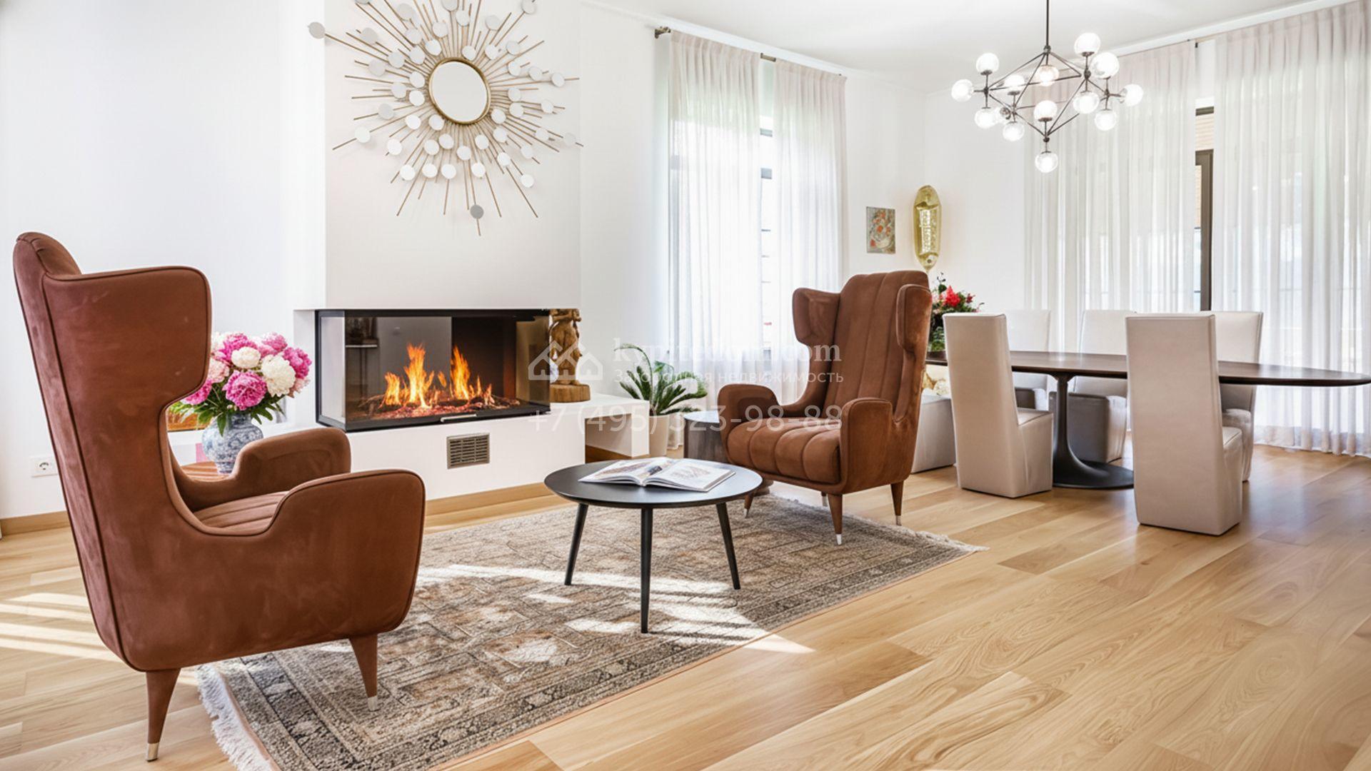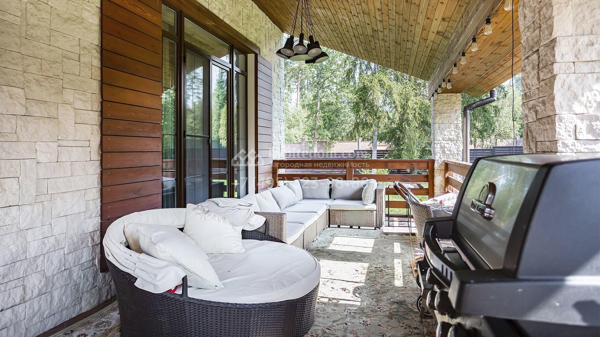 Загородный дом площадью 500 м² построен на полевом участке 18 соток с вековыми деревьями. Фасад облицован светло-бежевой плиткой под камень и деревом. В оформлении интерьера использованы молочные оттенки, установлены дизайнерская мягкая мебель, кухонный гарнитур класса люкс итальянской марки Pedini, столовая зона Baxter и бытовая техника. В коттедже разместили две спальни с ванными комнатами и гардеробными, гостиную с камином, кухню, столовую, кинотеатр, спортзал и винную комнату. Предусмотрены гараж на одну машину, спальня для персонала и комната свободного назначения на мансарде. На участке засеян газон, на террасе обустроена зона барбекю.