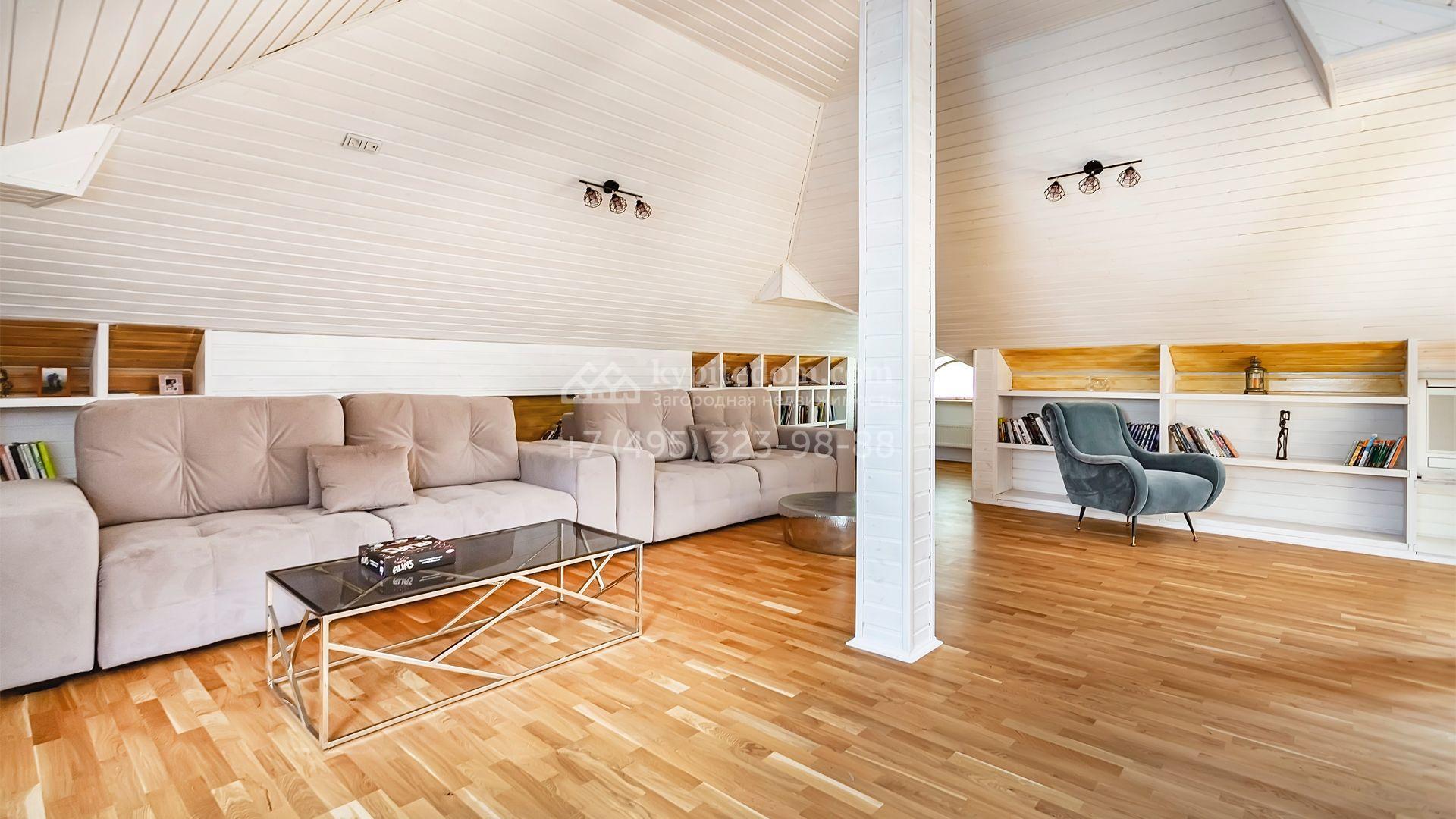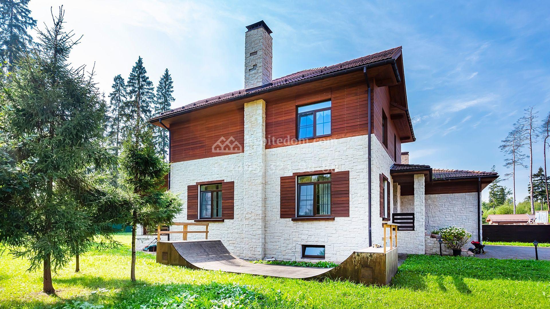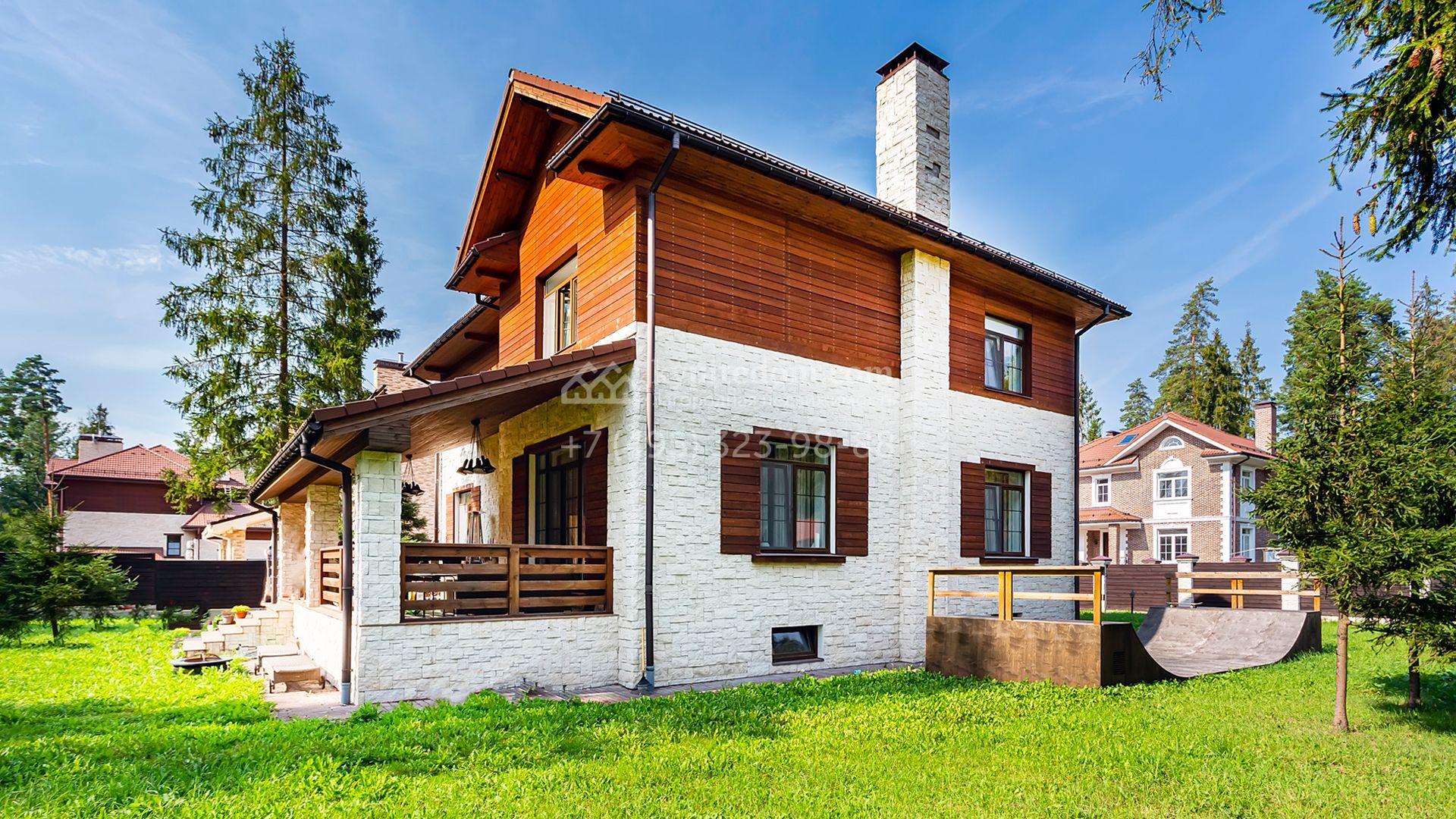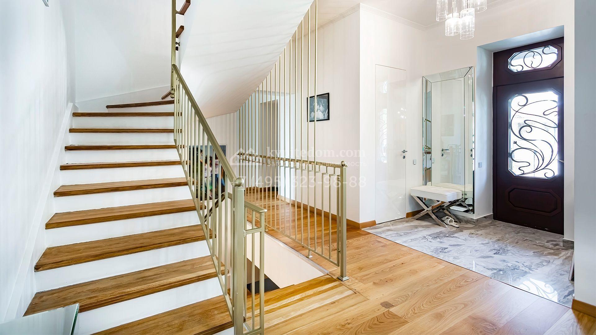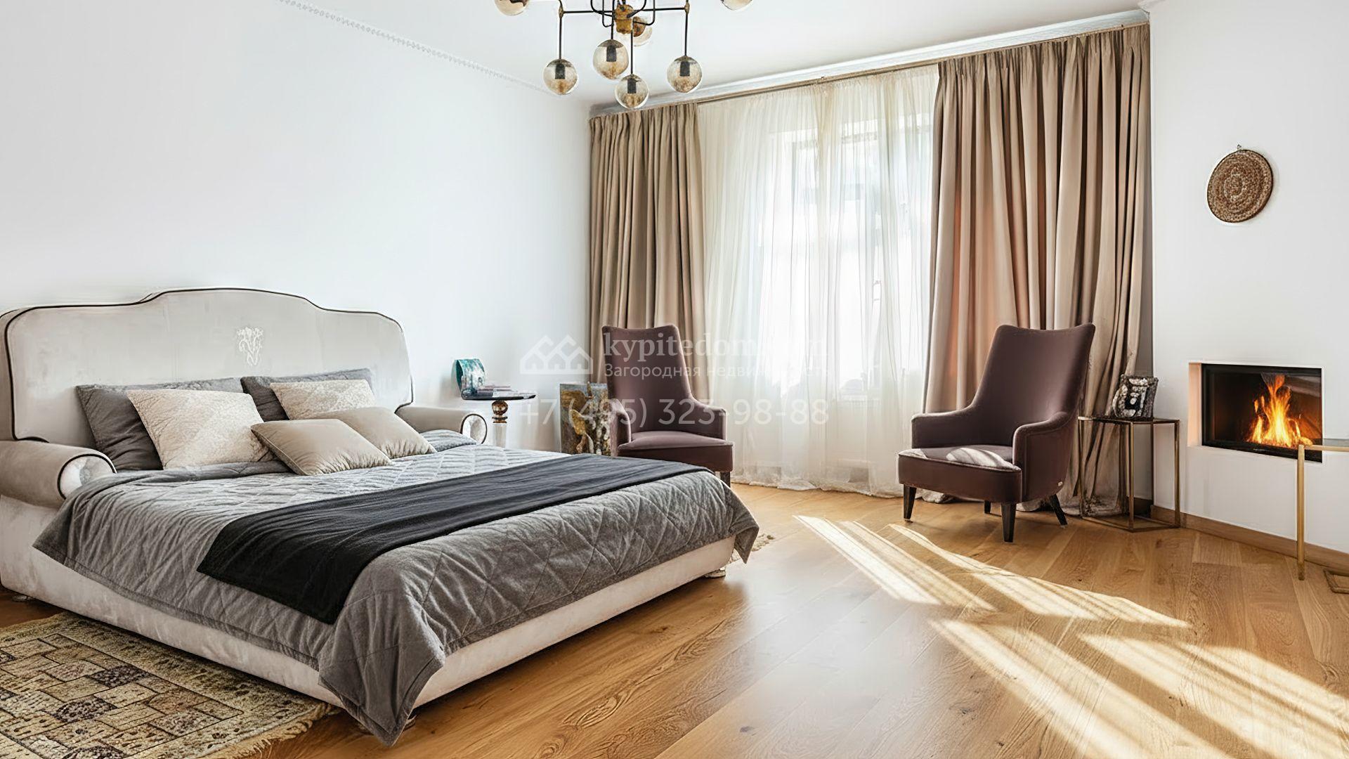 Загородный дом площадью 500 м² построен на полевом участке 18 соток с вековыми деревьями. Фасад облицован светло-бежевой плиткой под камень и деревом. В оформлении интерьера использованы молочные оттенки, установлены дизайнерская мягкая мебель, кухонный гарнитур класса люкс итальянской марки Pedini, столовая зона Baxter и бытовая техника. В коттедже разместили две спальни с ванными комнатами и гардеробными, гостиную с камином, кухню, столовую, кинотеатр, спортзал и винную комнату. Предусмотрены гараж на одну машину, спальня для персонала и комната свободного назначения на мансарде. На участке засеян газон, на террасе обустроена зона барбекю.