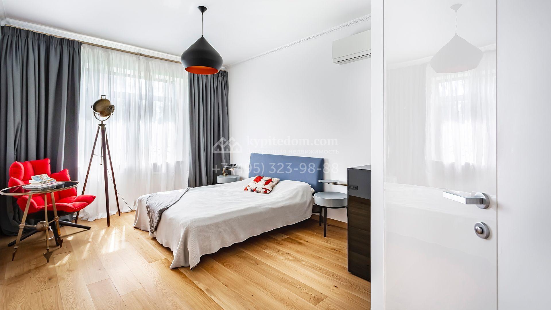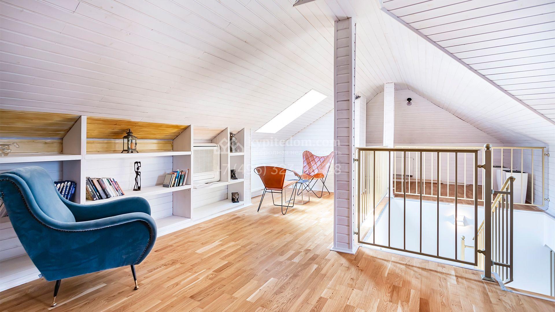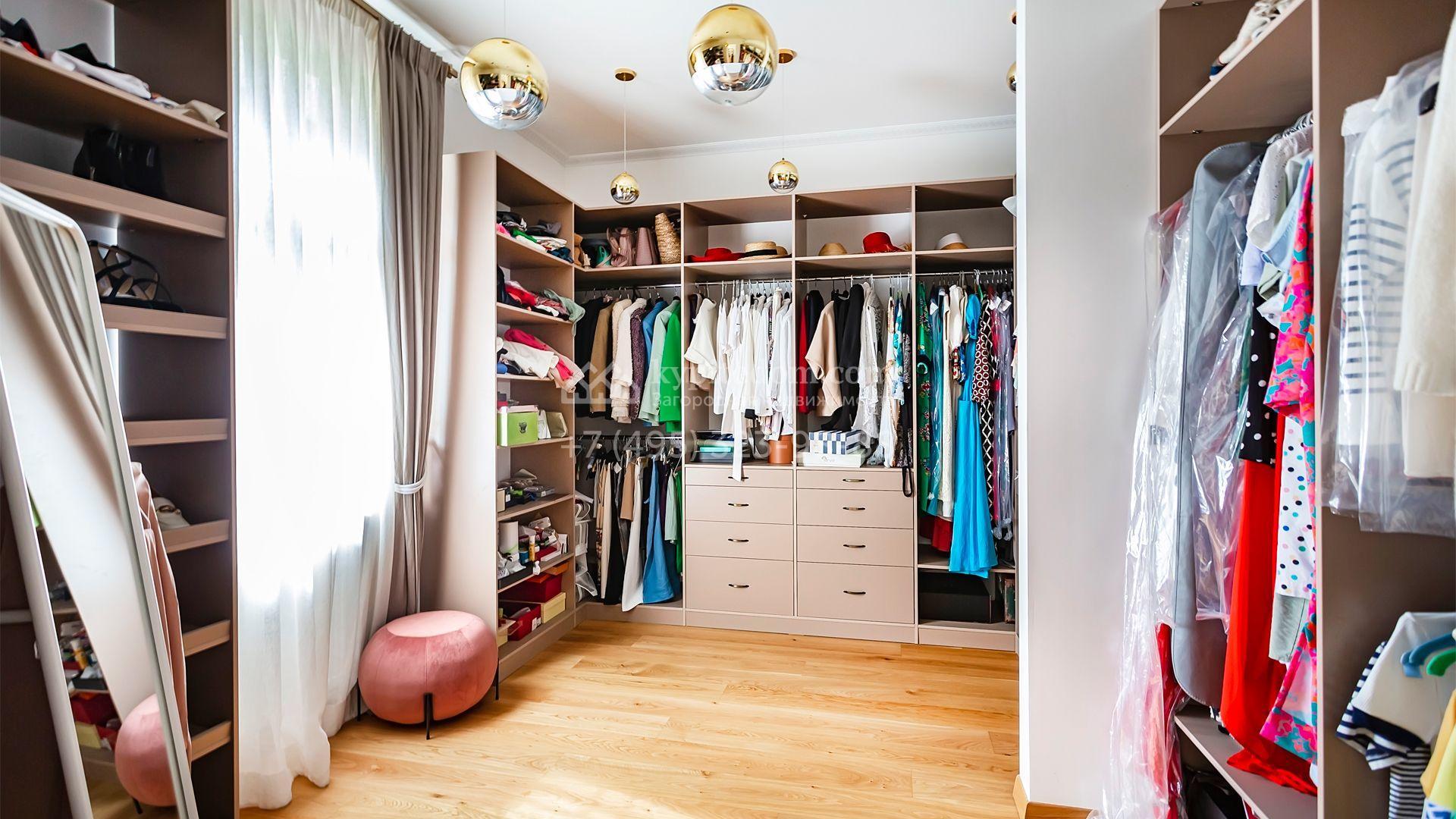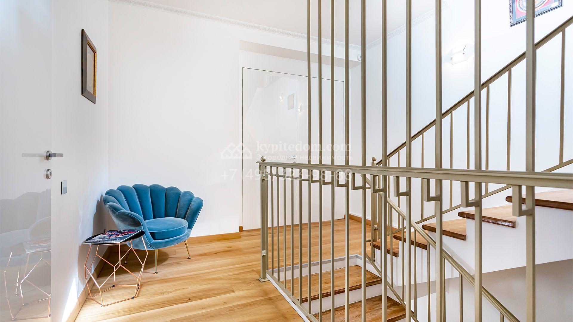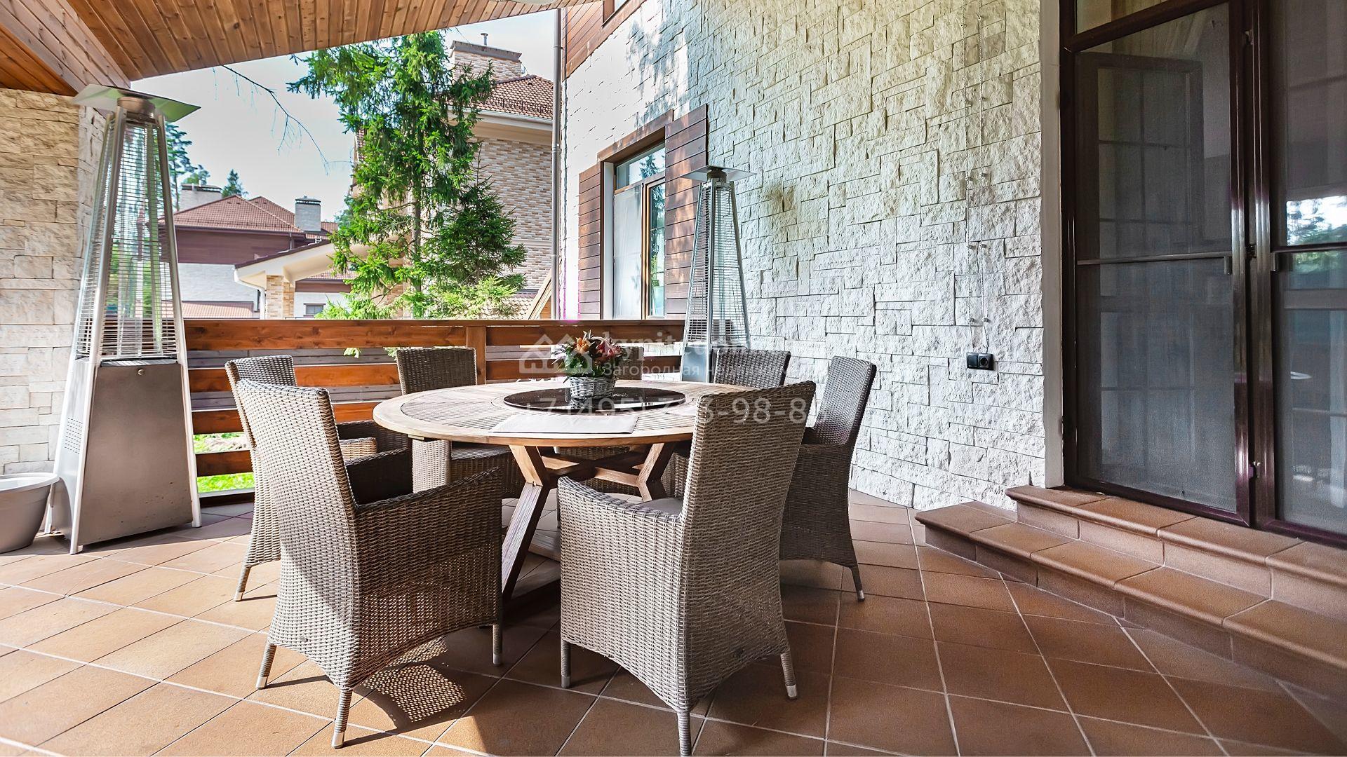 Загородный дом площадью 500 м² построен на полевом участке 18 соток с вековыми деревьями. Фасад облицован светло-бежевой плиткой под камень и деревом. В оформлении интерьера использованы молочные оттенки, установлены дизайнерская мягкая мебель, кухонный гарнитур класса люкс итальянской марки Pedini, столовая зона Baxter и бытовая техника. В коттедже разместили две спальни с ванными комнатами и гардеробными, гостиную с камином, кухню, столовую, кинотеатр, спортзал и винную комнату. Предусмотрены гараж на одну машину, спальня для персонала и комната свободного назначения на мансарде. На участке засеян газон, на террасе обустроена зона барбекю.