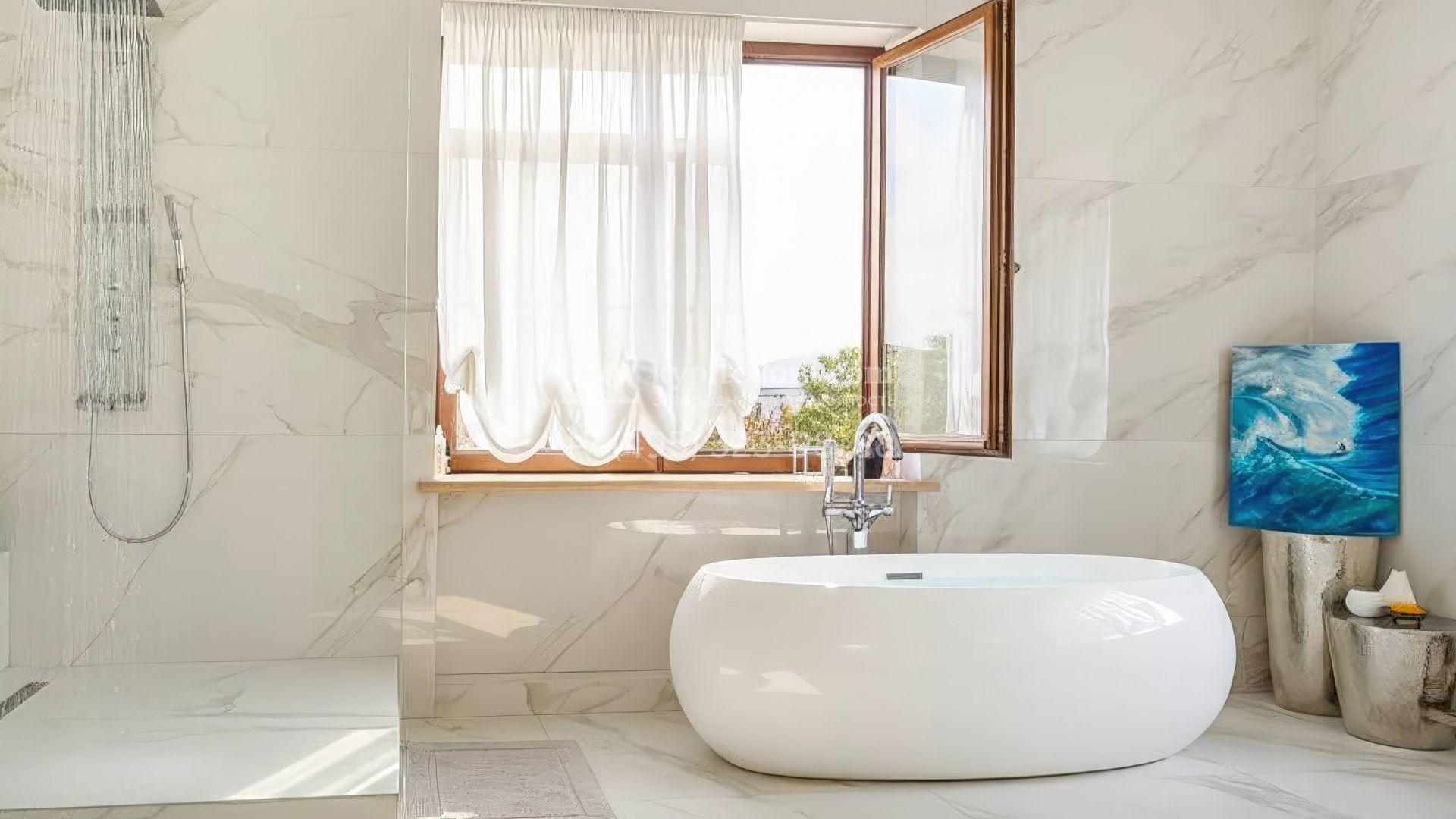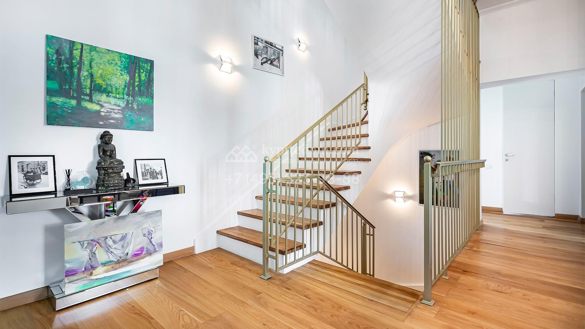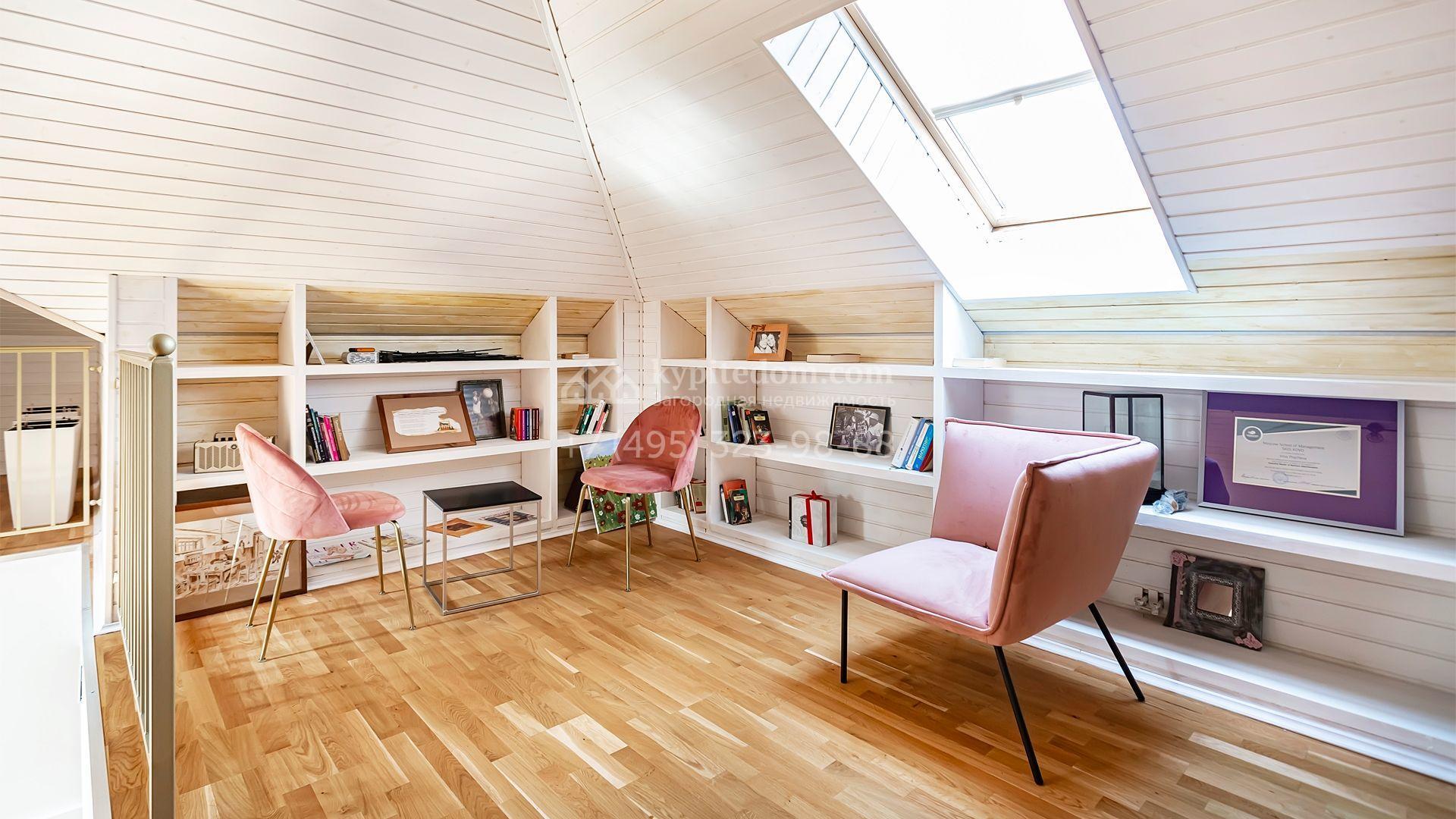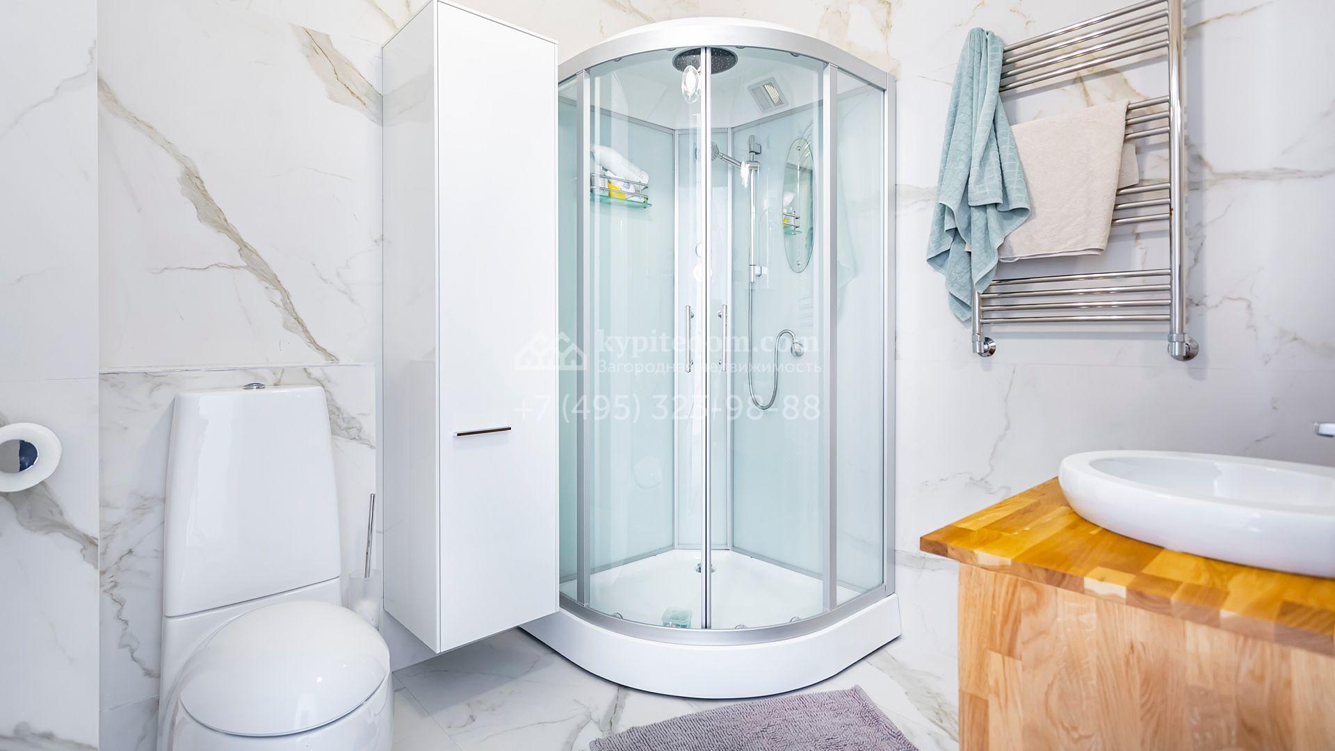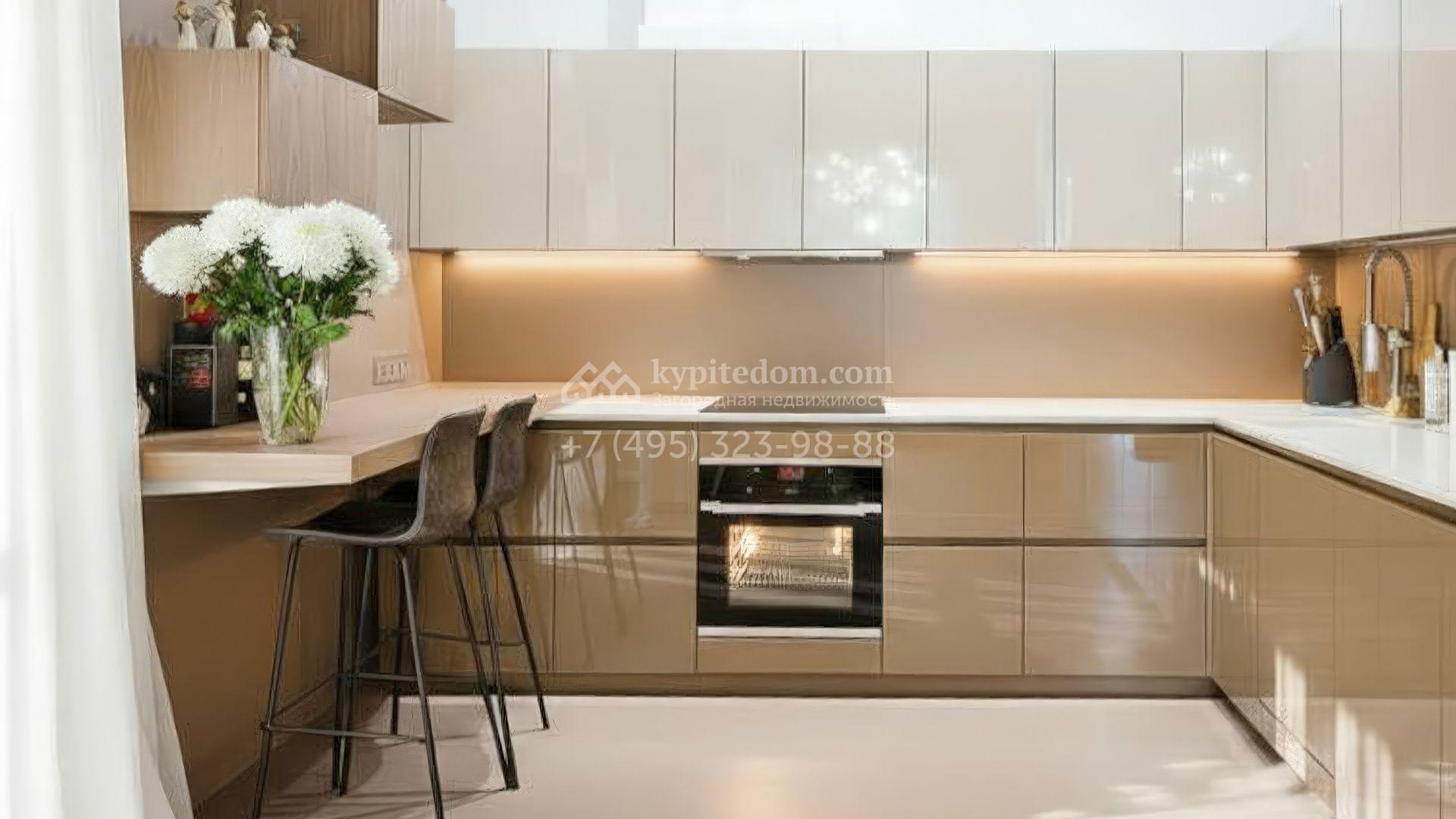 Загородный дом площадью 500 м² построен на полевом участке 18 соток с вековыми деревьями. Фасад облицован светло-бежевой плиткой под камень и деревом. В оформлении интерьера использованы молочные оттенки, установлены дизайнерская мягкая мебель, кухонный гарнитур класса люкс итальянской марки Pedini, столовая зона Baxter и бытовая техника. В коттедже разместили две спальни с ванными комнатами и гардеробными, гостиную с камином, кухню, столовую, кинотеатр, спортзал и винную комнату. Предусмотрены гараж на одну машину, спальня для персонала и комната свободного назначения на мансарде. На участке засеян газон, на террасе обустроена зона барбекю.