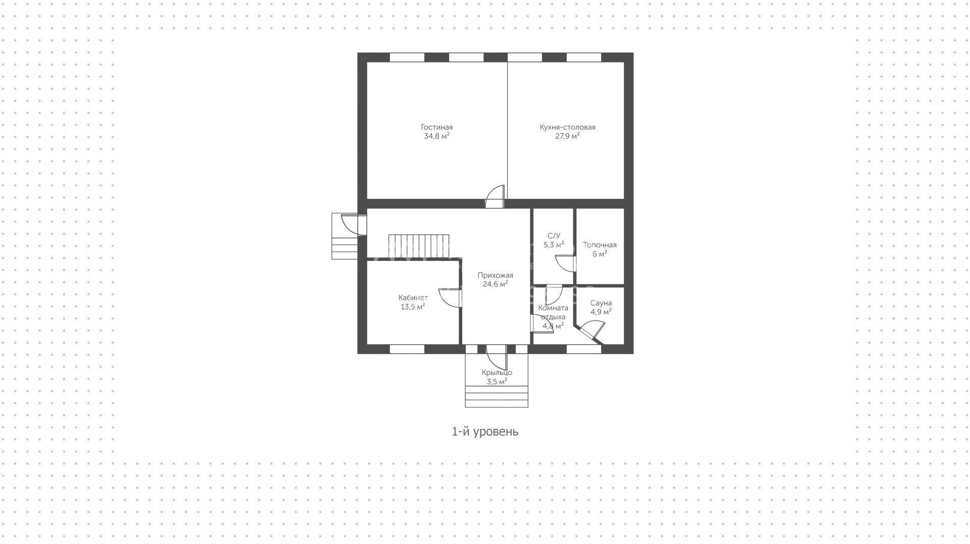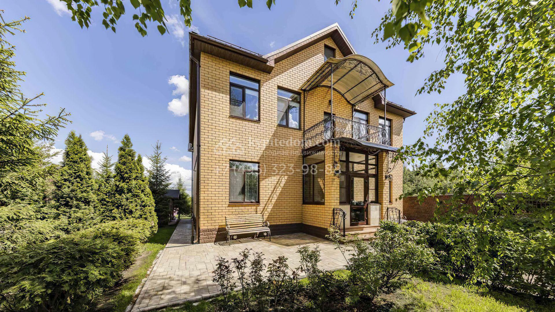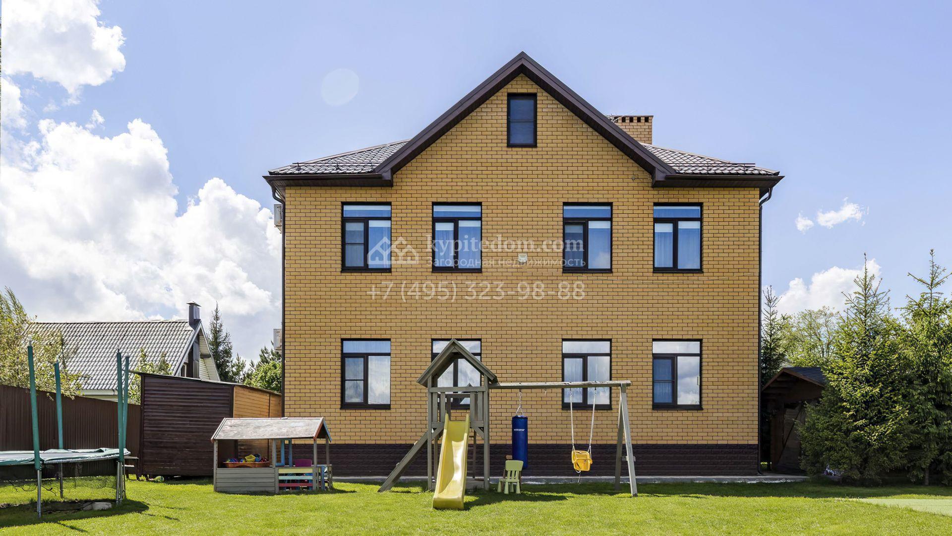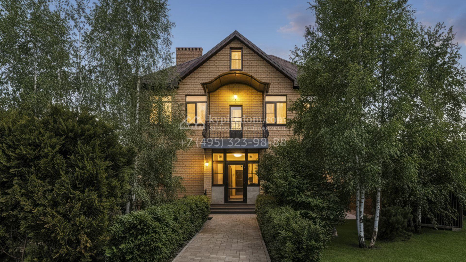 Коттедж площадью 360 м² возведен на прилесном участке 22 сотки. Фасад облицован светло-жёлтым кирпичом, который подчёркивает строгий стиль дома, а тёмные оконные рамы и кровля дополняют выбранную цветовую гамму. Коричневый цоколь выделяет архитектурные линии и вносит выразительность, делая основной тон стен ярче. Сдержанный и статусный облик экстерьера формируется за счёт навеса и балкона с изящными металлическими элементами у входа.