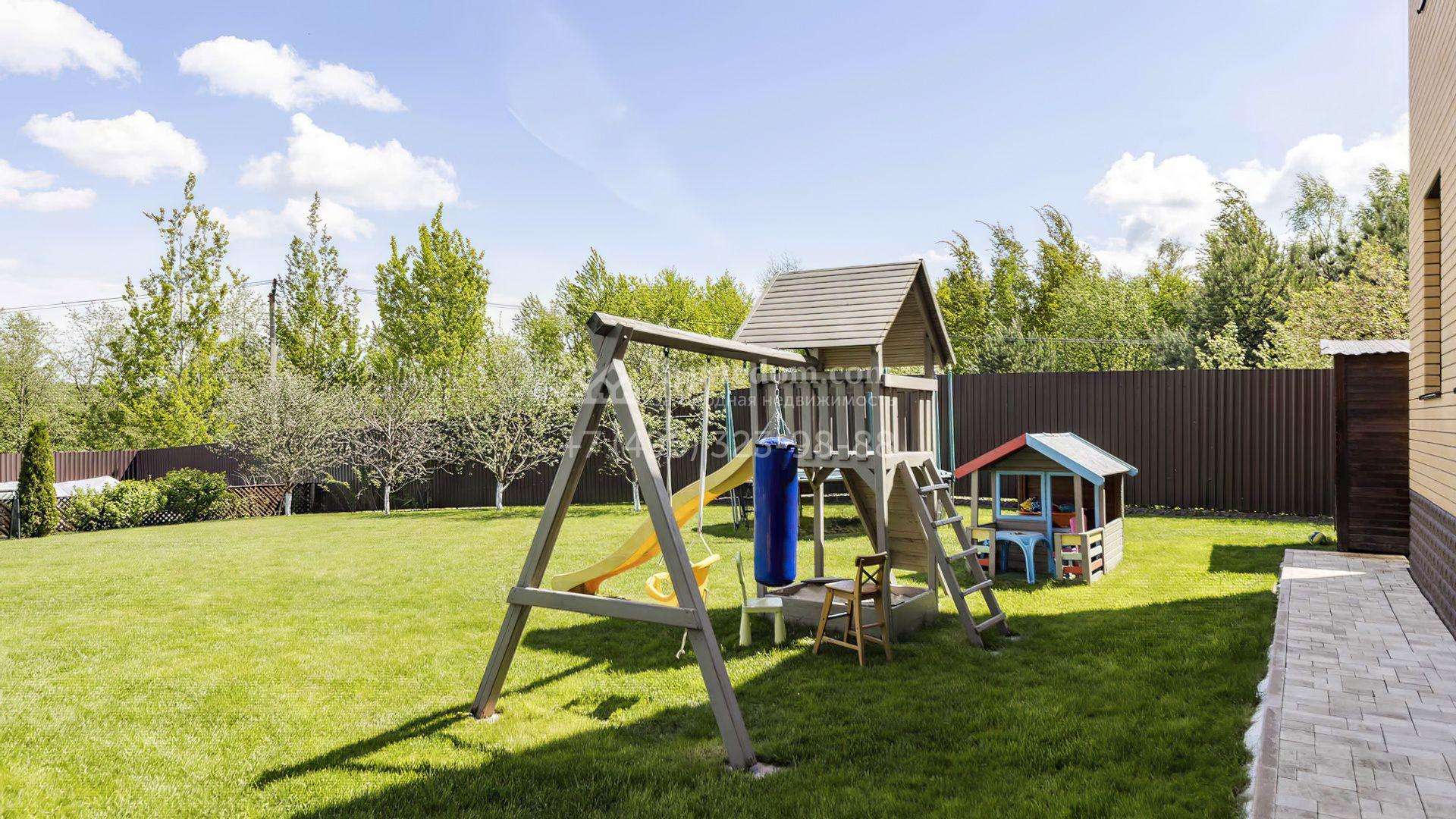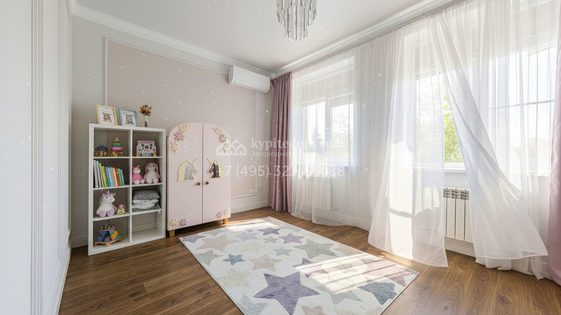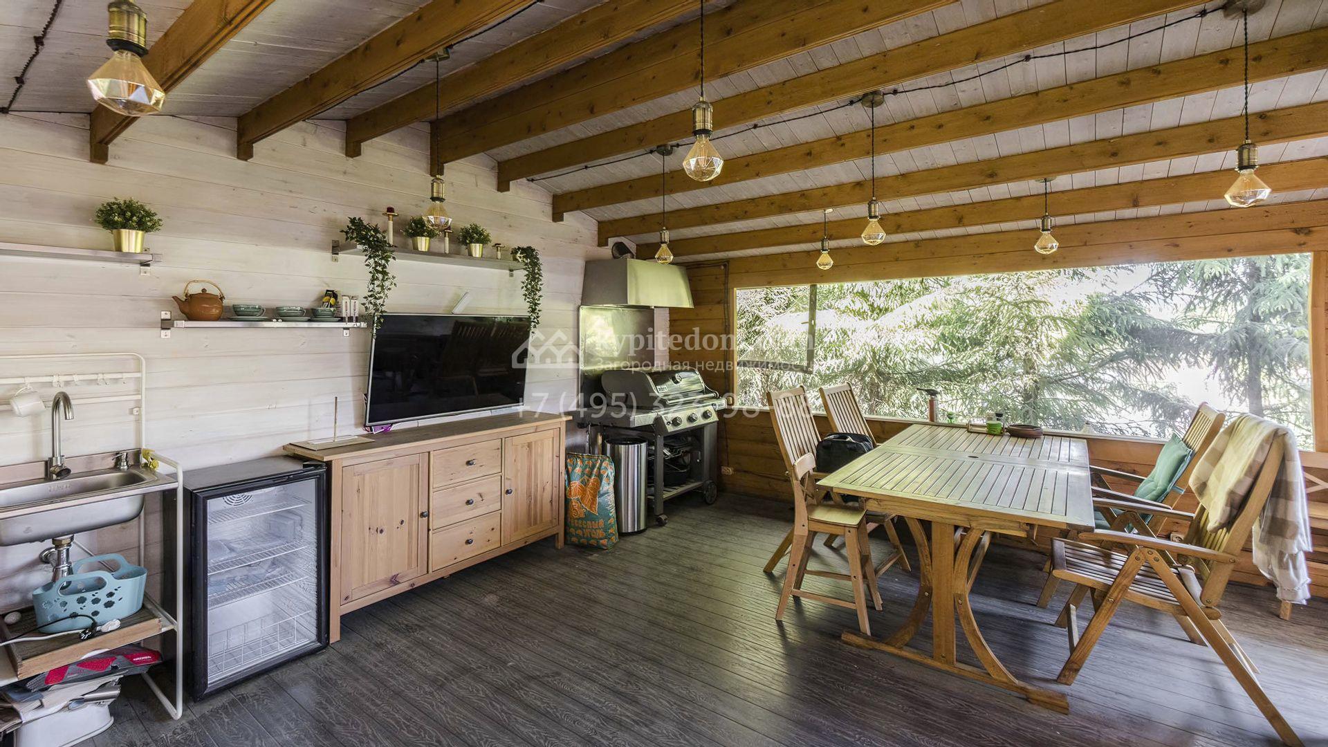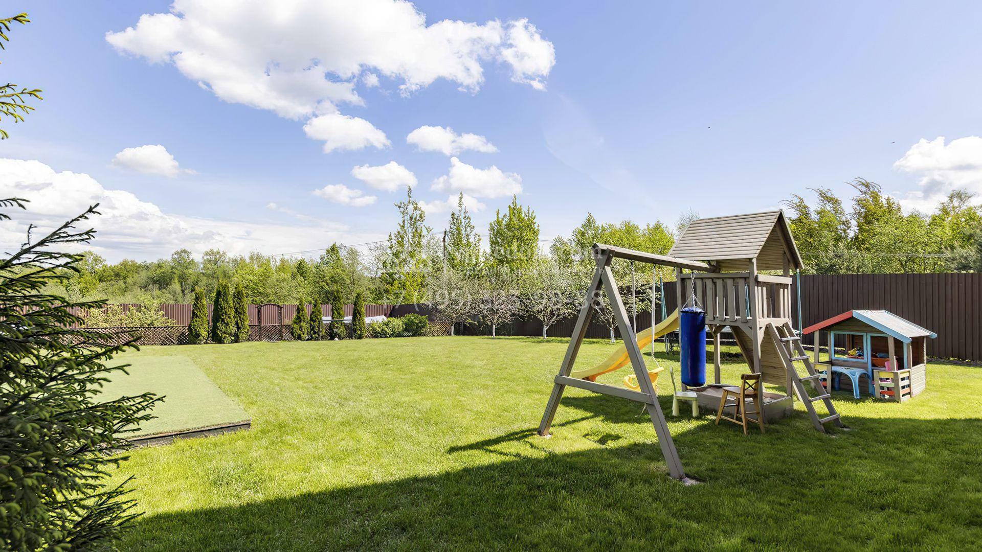 Функциональная планировка включает просторную кухню-гостиную, 5 спален и универсальную игровую комнату, объединённую с тренажёрным залом. На благоустроенном участке растут берёзы, хвойные деревья и декоративные кустарники. Для комфортного отдыха оборудована крытая беседка с зоной барбекю, современная детская площадка и удобный навес для трёх автомобилей.